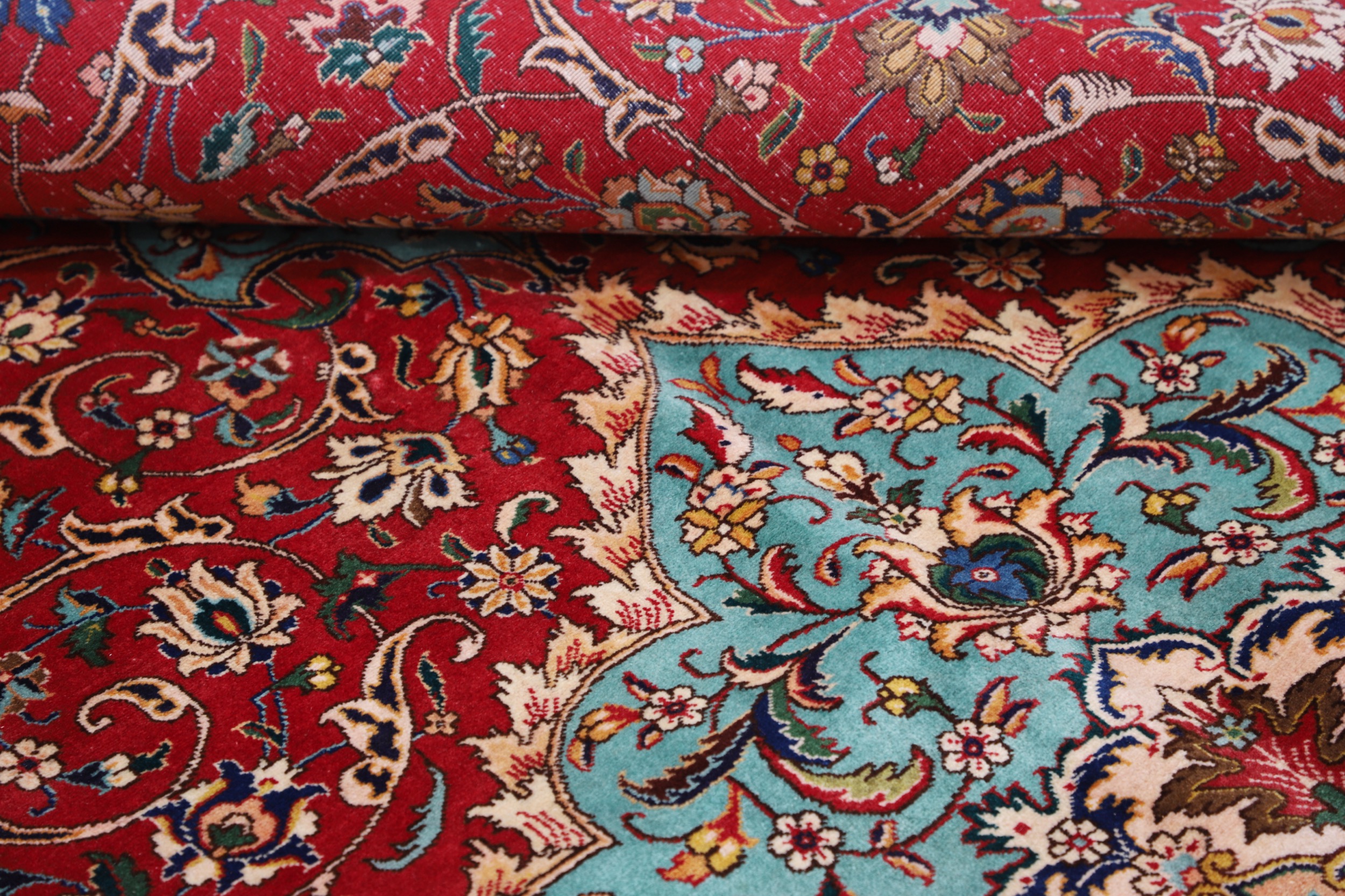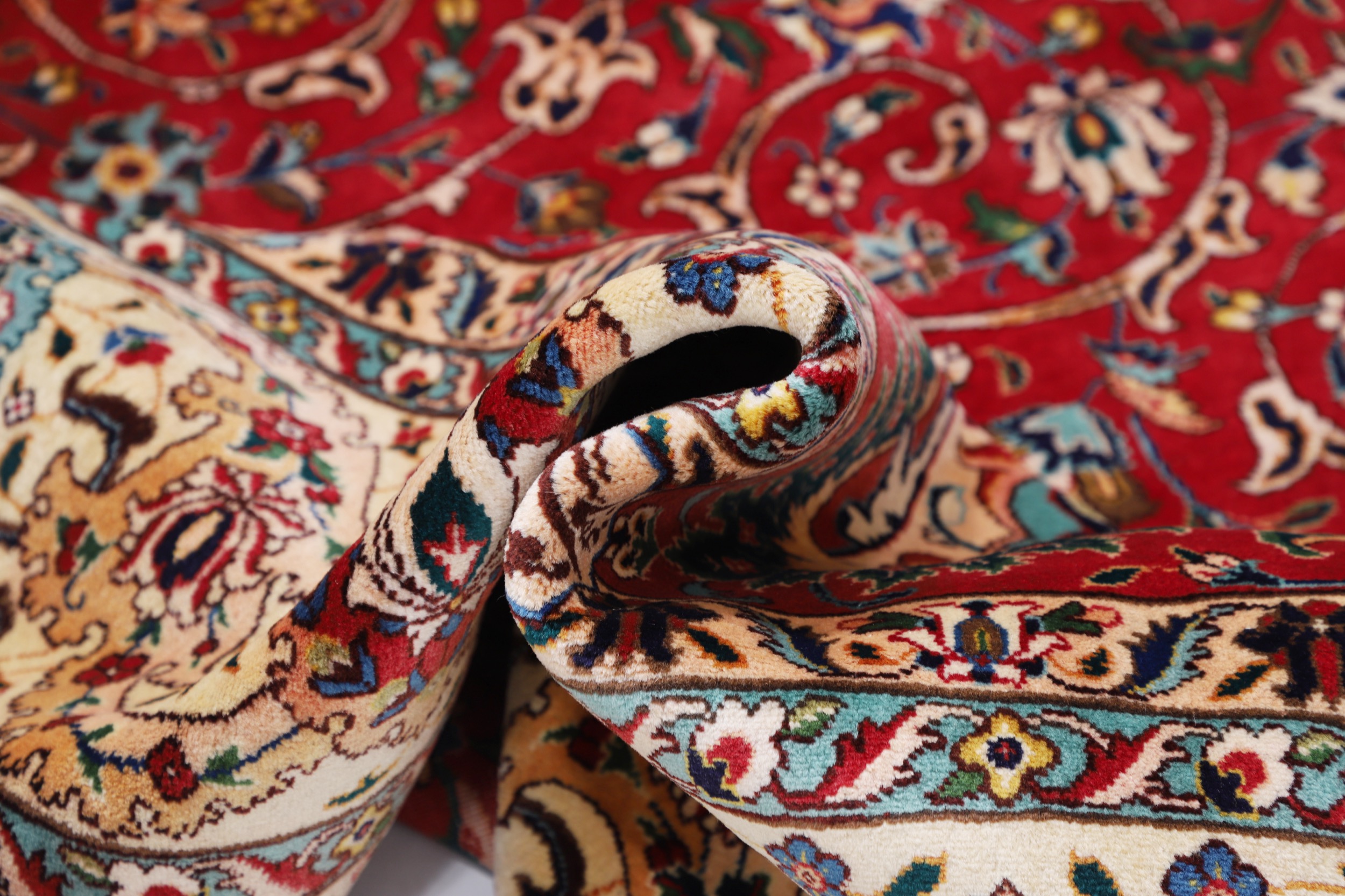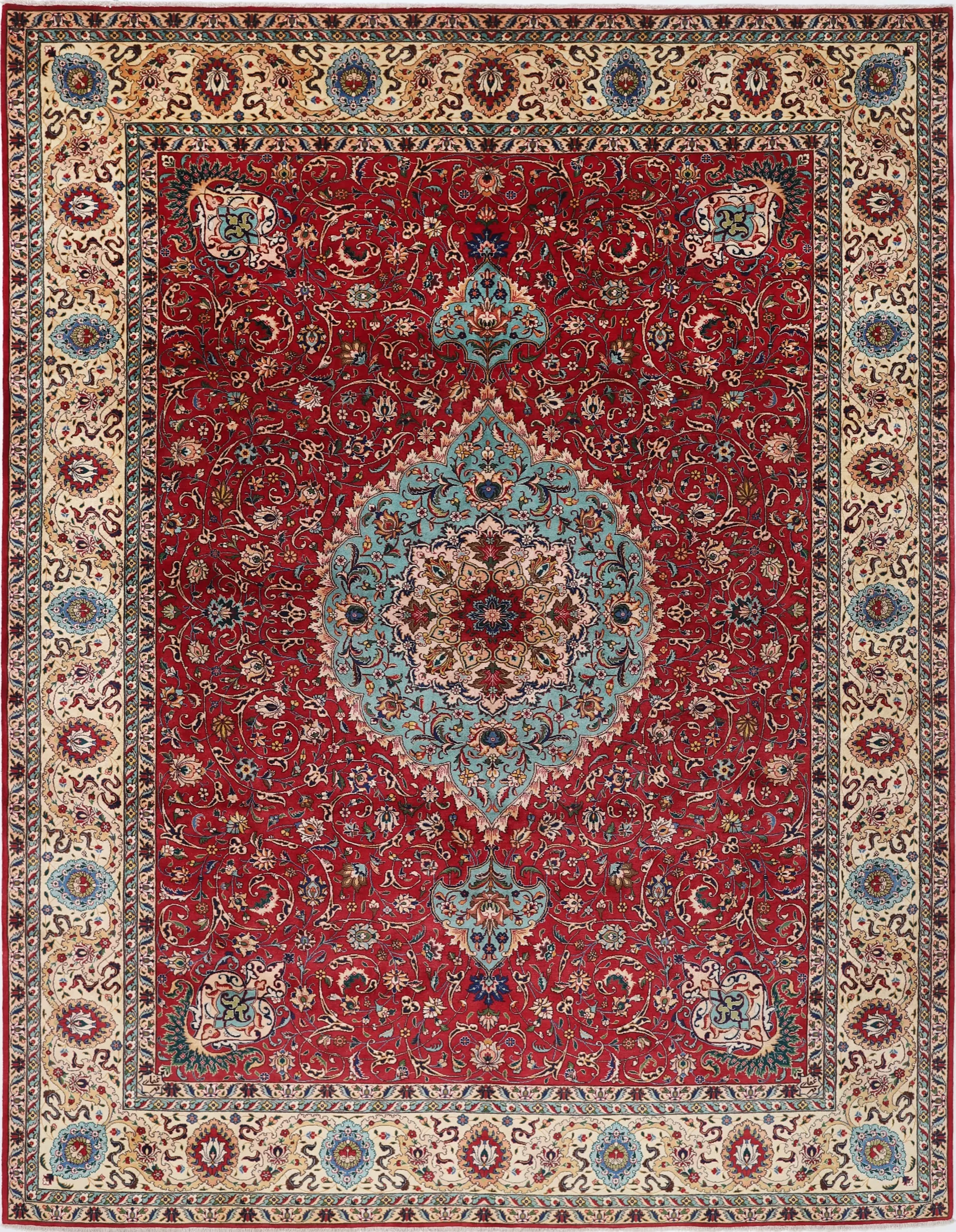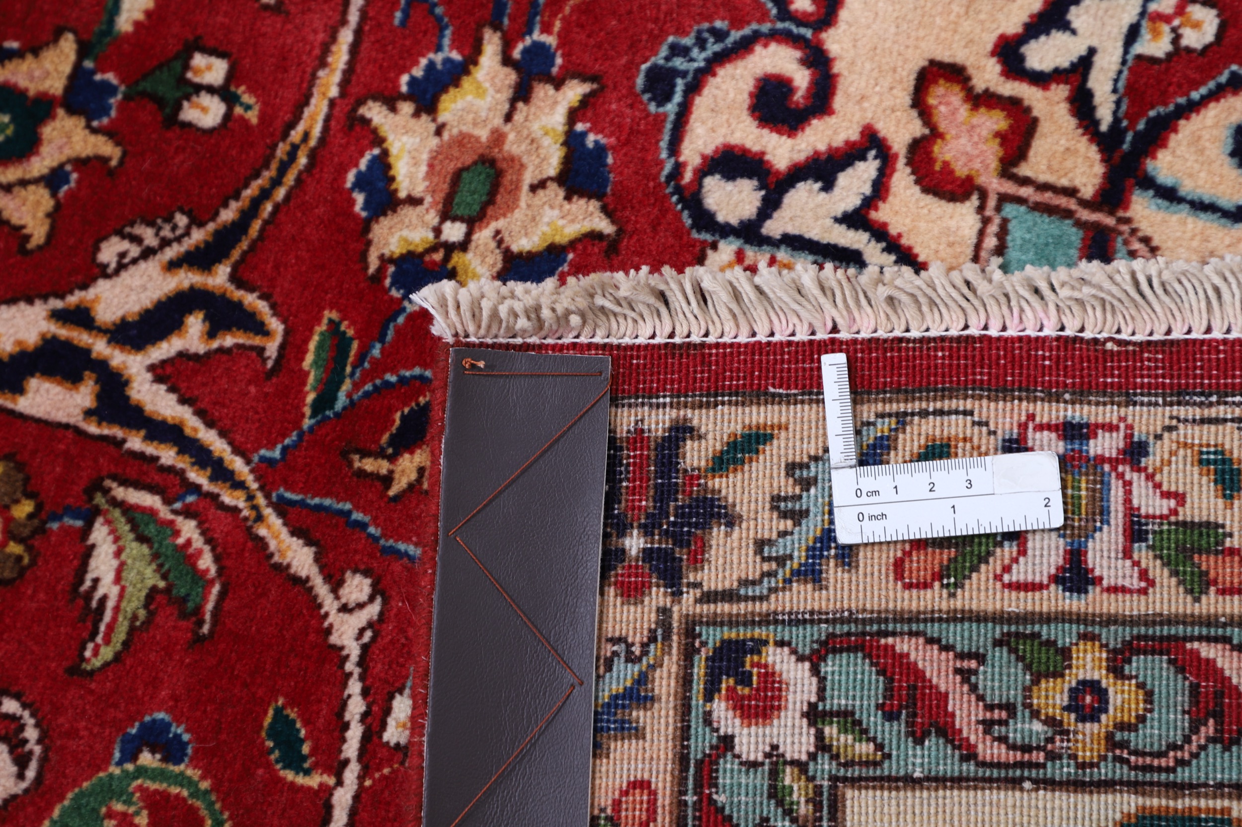 Hand Knotted Tabriz Persian Rug: This beautiful rug measures 10′ x 13’3″ and has an aged appearance of 30-40 years. Featuring a stunning red and beige floral design, it is meticulously crafted with a density of approximately 225 knots per square inch. Made from 100% wool and cotton, this rug has a medium pile height ranging from 1/3″ to 3/8″. Perfect for adding warmth and elegance to any space.