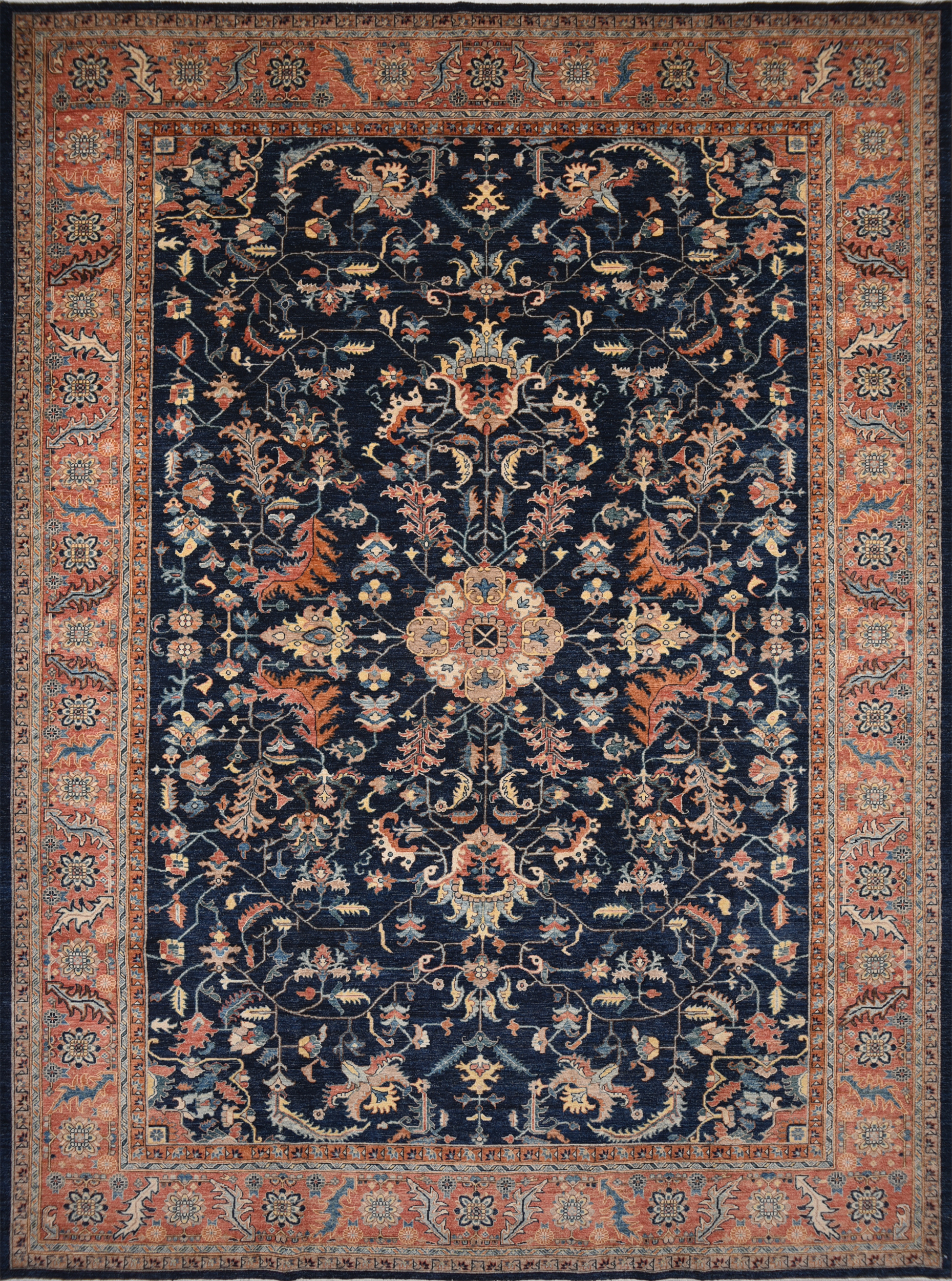This 10’0″ x 13’5″ Oushak rug, hand-knotted in Afghan / Pakistan, features a allover design. It is woven with Approx.169 KPSI, showcasing a field in Blue and a Orange border. The rug has a Low Medium Pile and a 100% Wool pile, and is in excellent condition.
