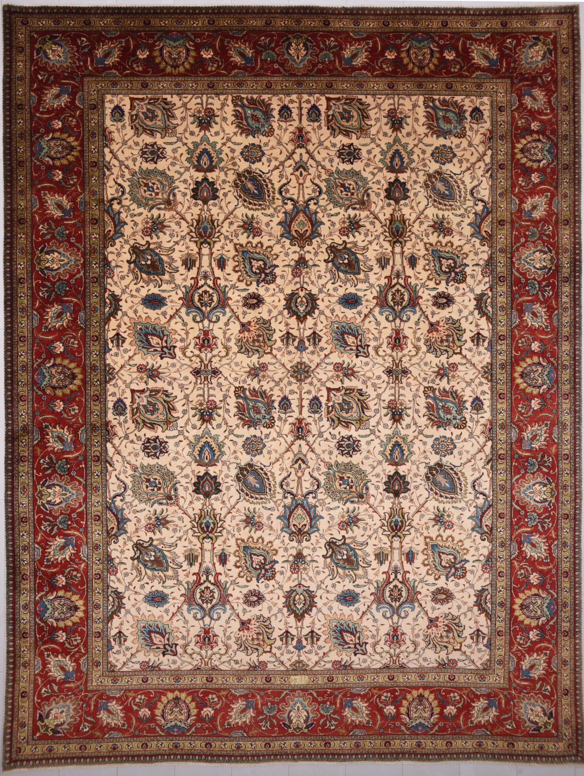 This exquisite Hand Knotted Tabriz Persian rug features a timeless floral design in beautiful shades of beige and red. Aged between 40-50 years, this rug has been crafted using 100% wool and cotton with a medium pile height of 1/3″-3/8″. With an impressive knot count of approximately 196 KPSI, this rug is a true work of art that will add elegance and sophistication to any space.