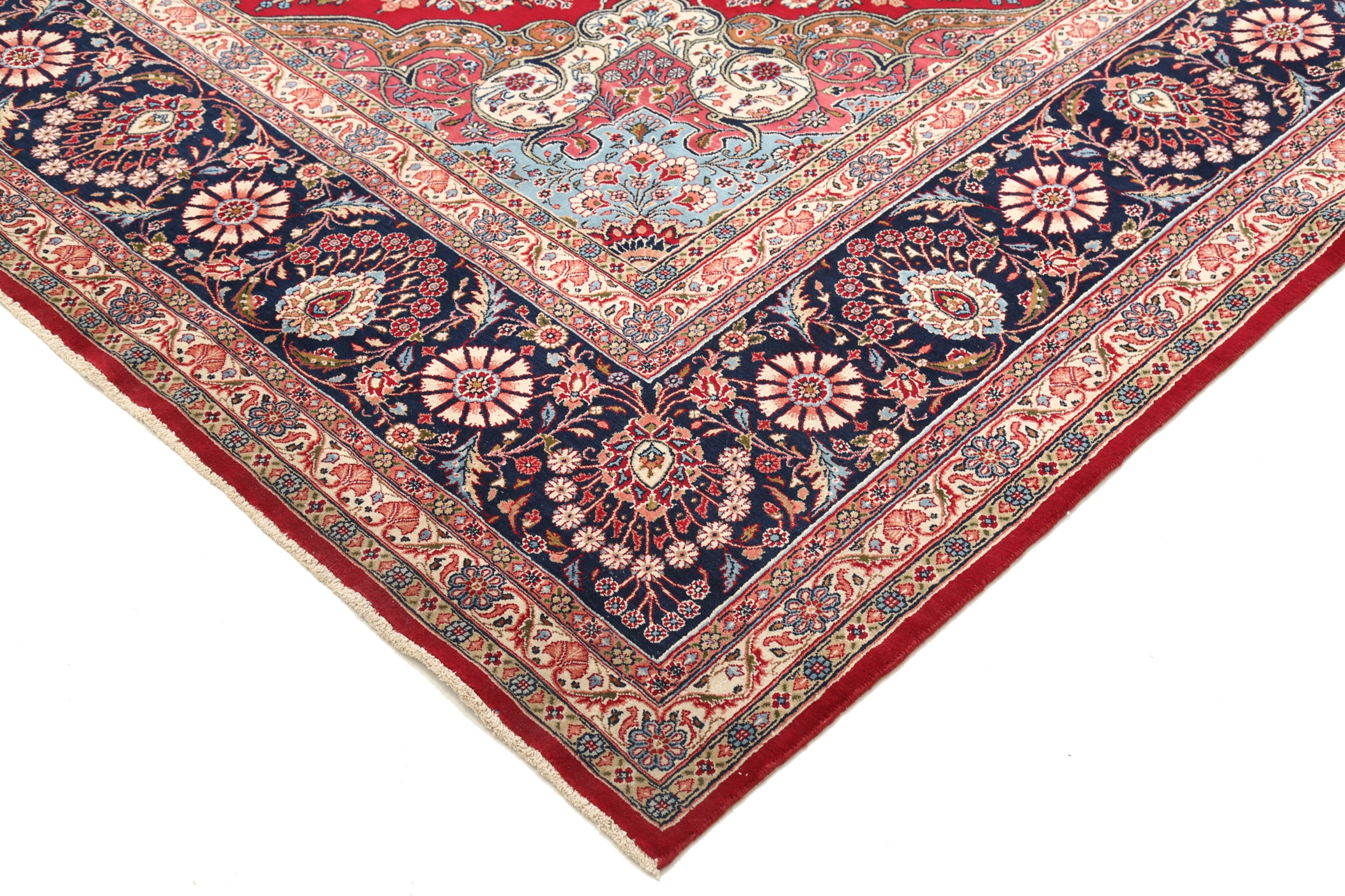 This Persian Rug is hand-knot with 100% Wool Pile and Cotton Foundation. This Rug has a Medallion design and its Main Colors are Blue, Beige, Red, and Brown.