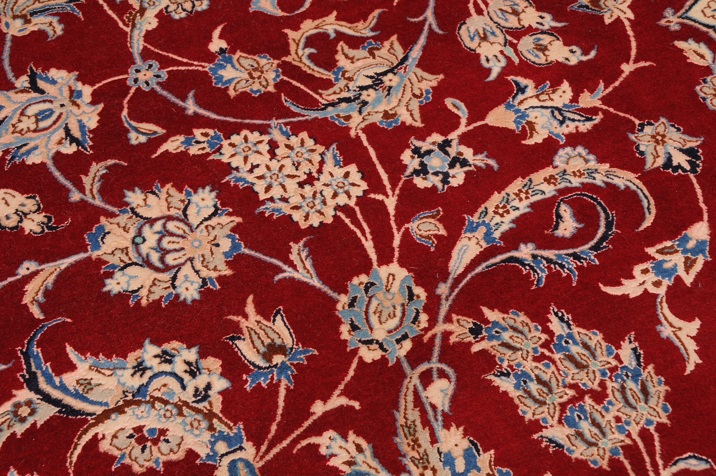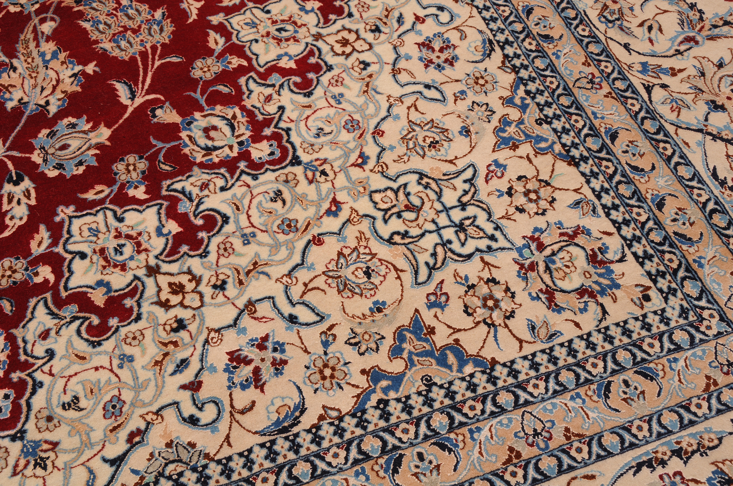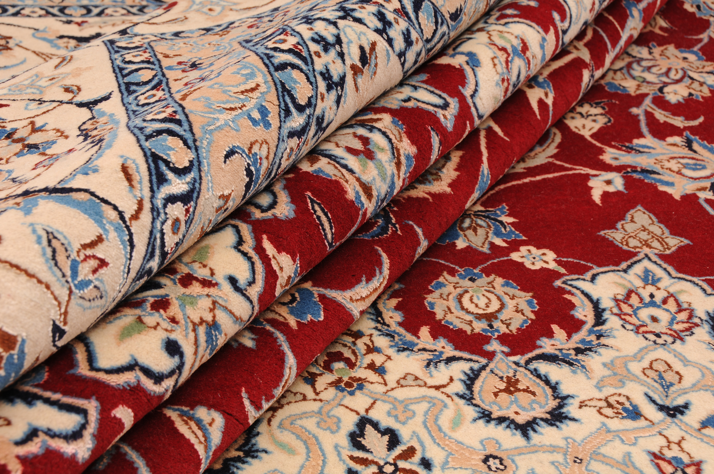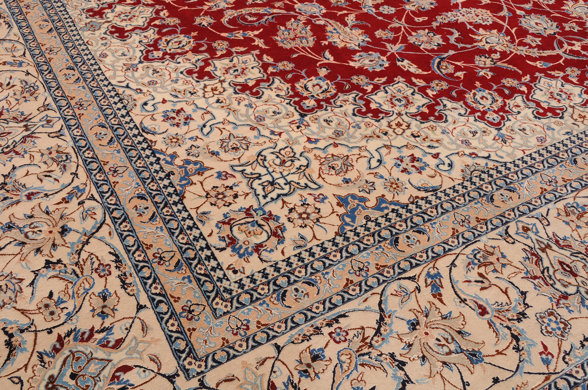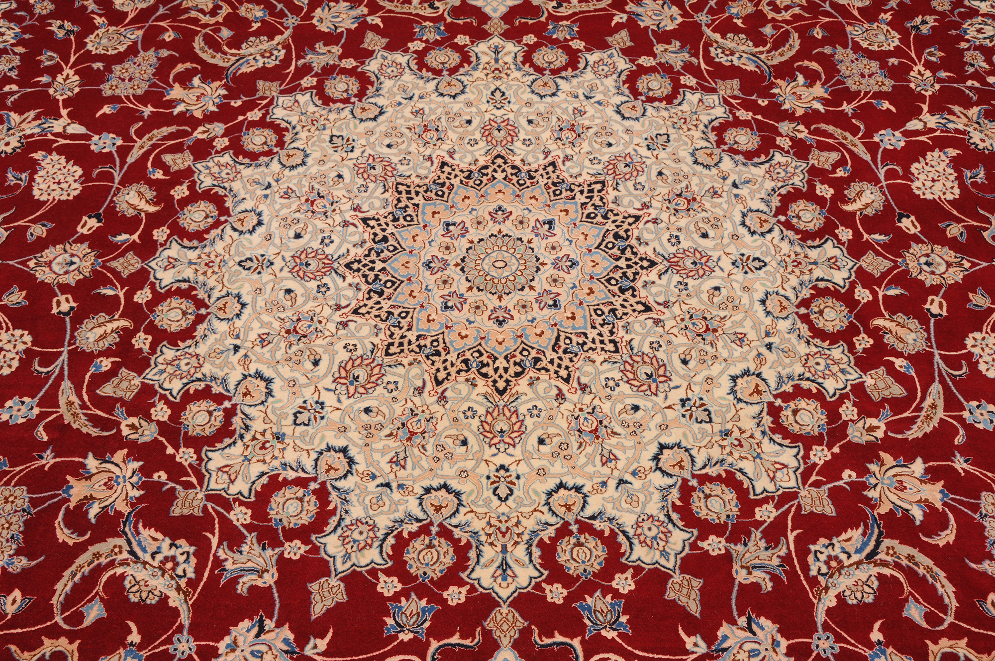This 10’3″ x 13’9″ Nain rug, hand-knotted in Persian, features a medallion design. It is woven with Approx. 625 KPSI, showcasing a field in Red and a Beige border. The rug has a Medium Pile and a Silk & Wool pile, and is in excellent condition.