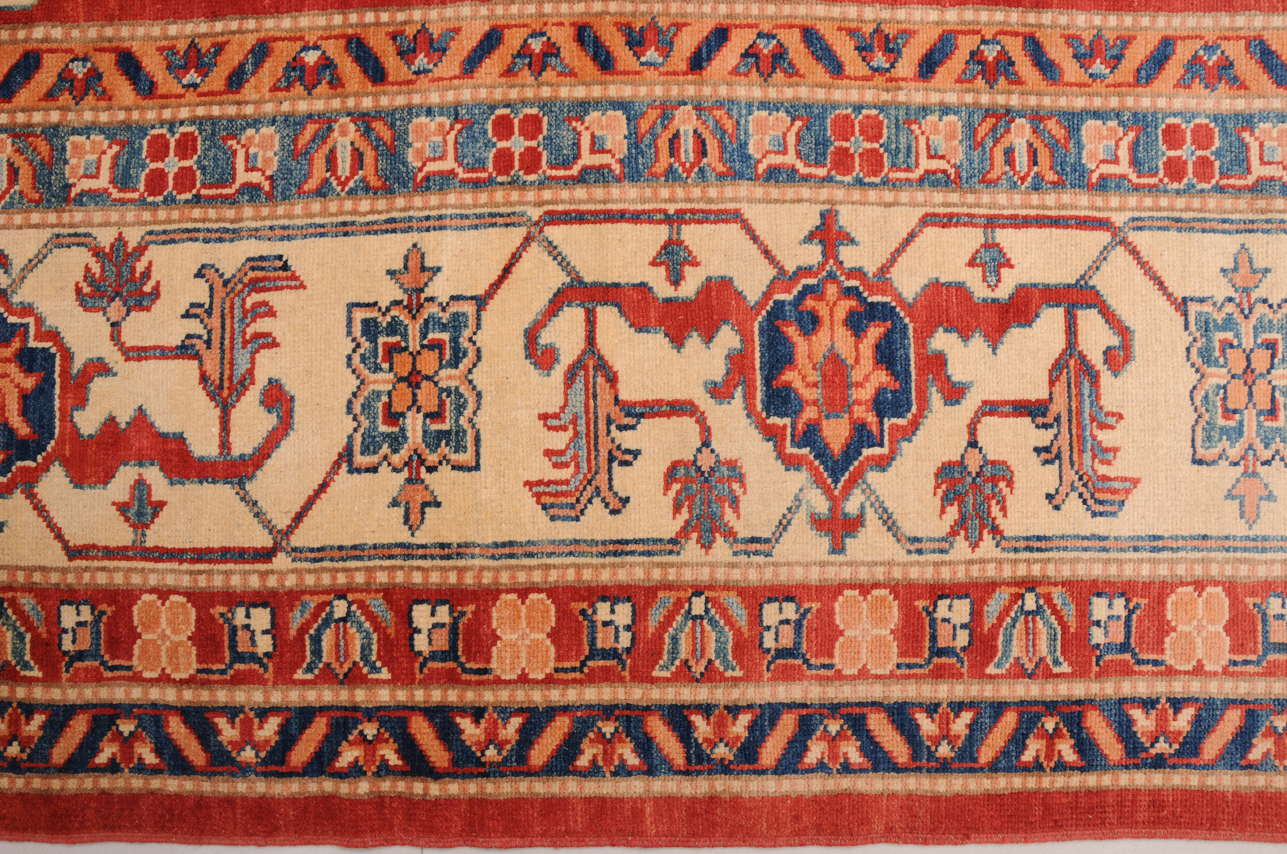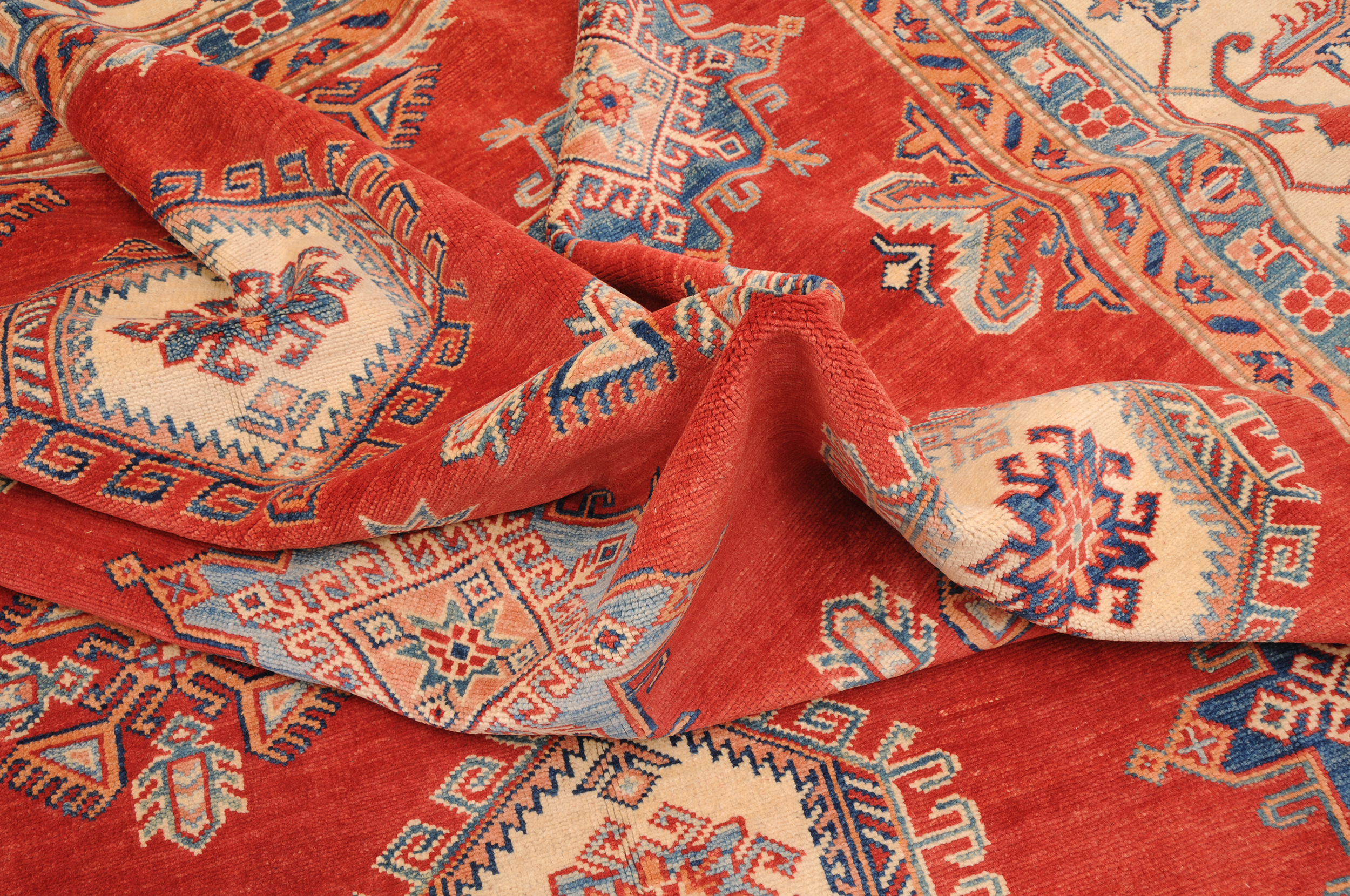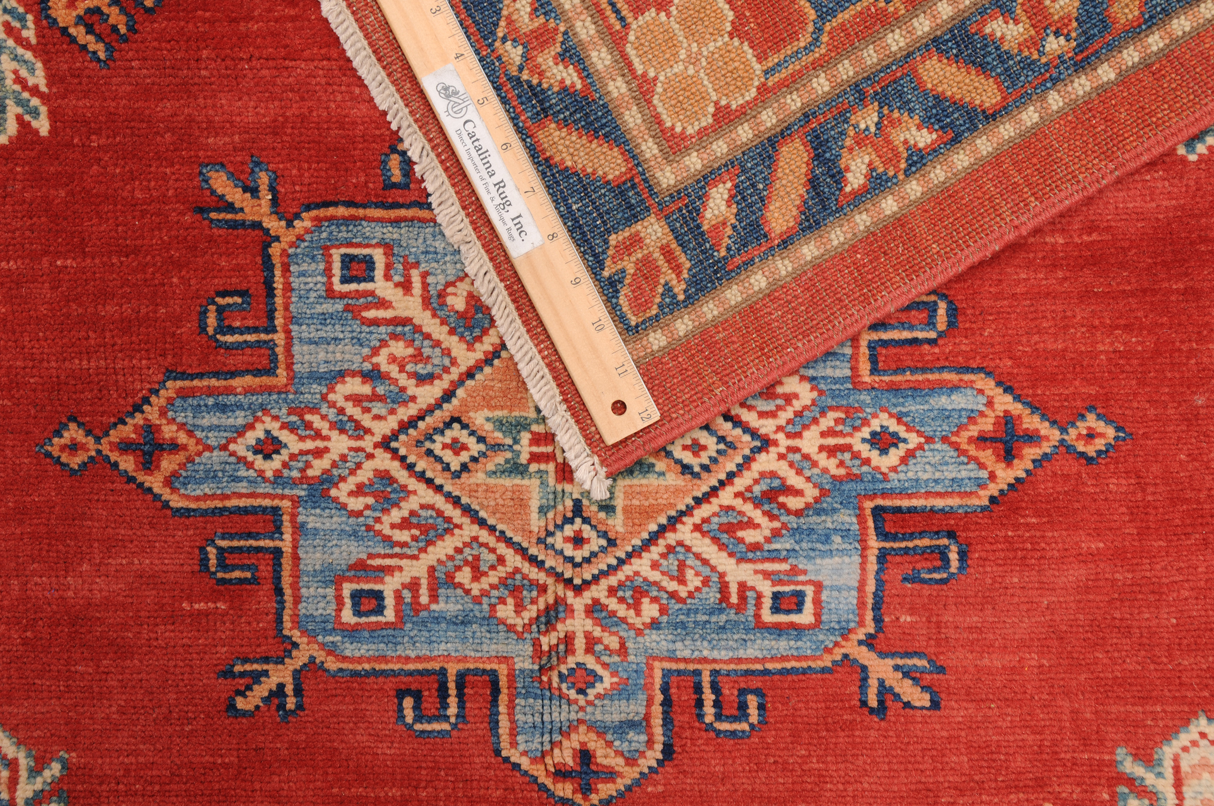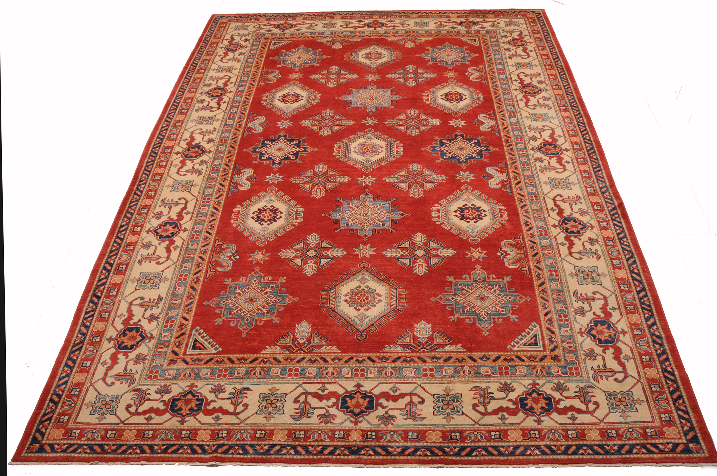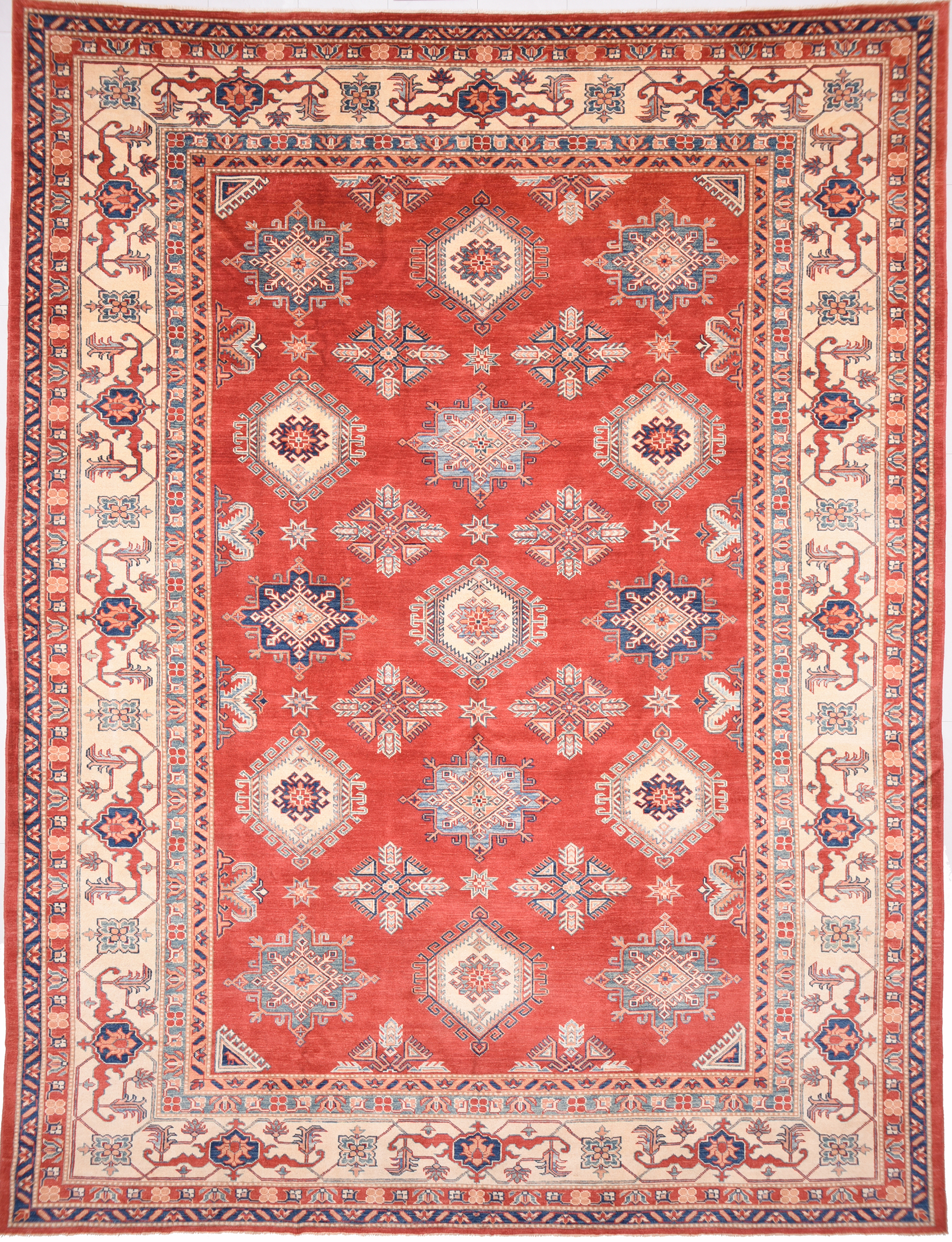 Introducing the Kazak Oriental Rug,  craftsmanship. Hand-knotted with precision, this 10’5″ x 13’8″‘ rug features a stunning Red and beige geometric design. With approximately 120 knots per square inch (KPSI), it showcases the intricate detailing in every thread. Made from 100% wool and cotton, this rug has a low to medium pile height of 1/4″ to 1/3″, providing a comfortable feel underfoot. Excellent in quality and washed to perfection, this Kazak Oriental Rug is a timeless addition to any space.