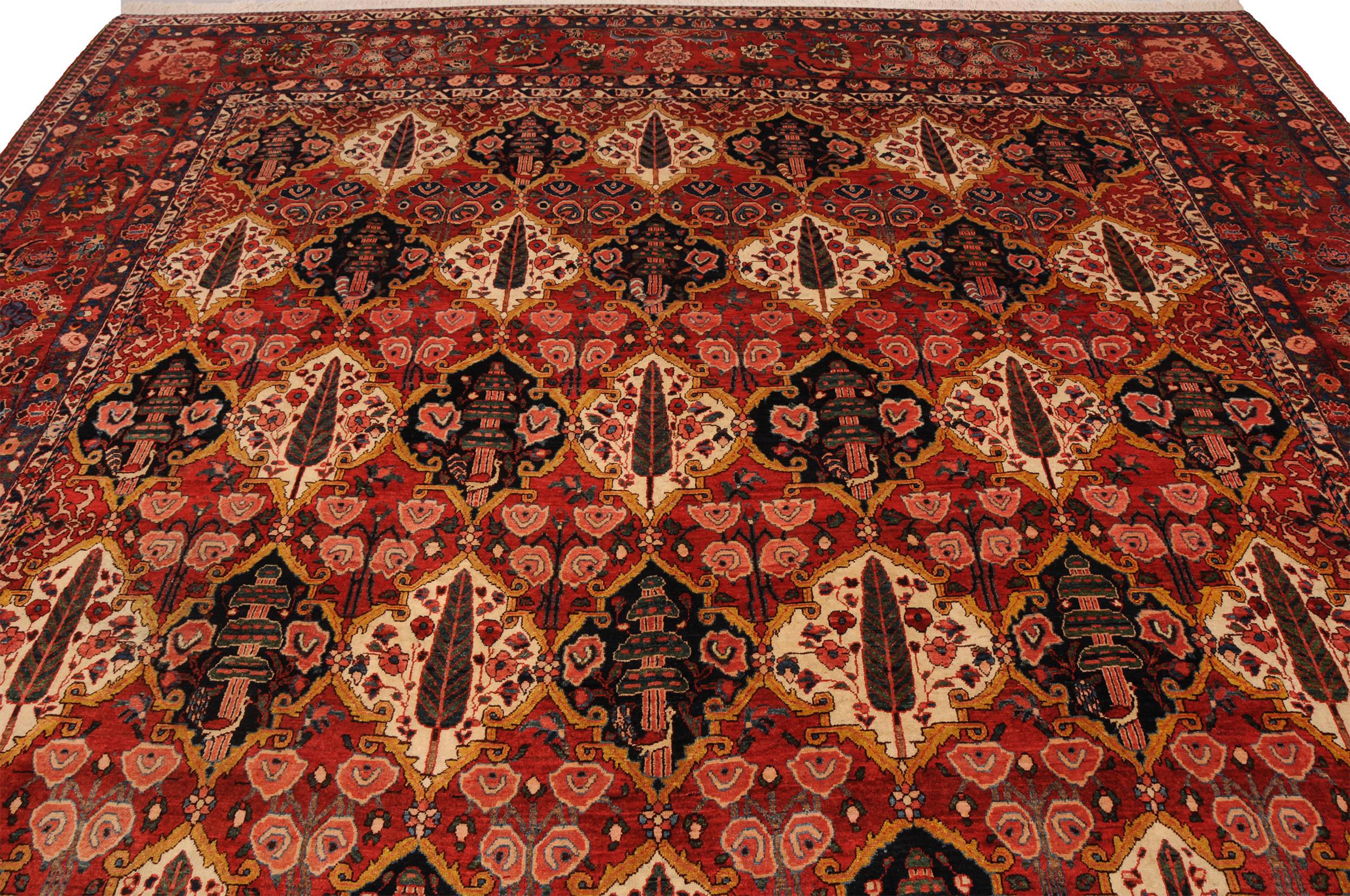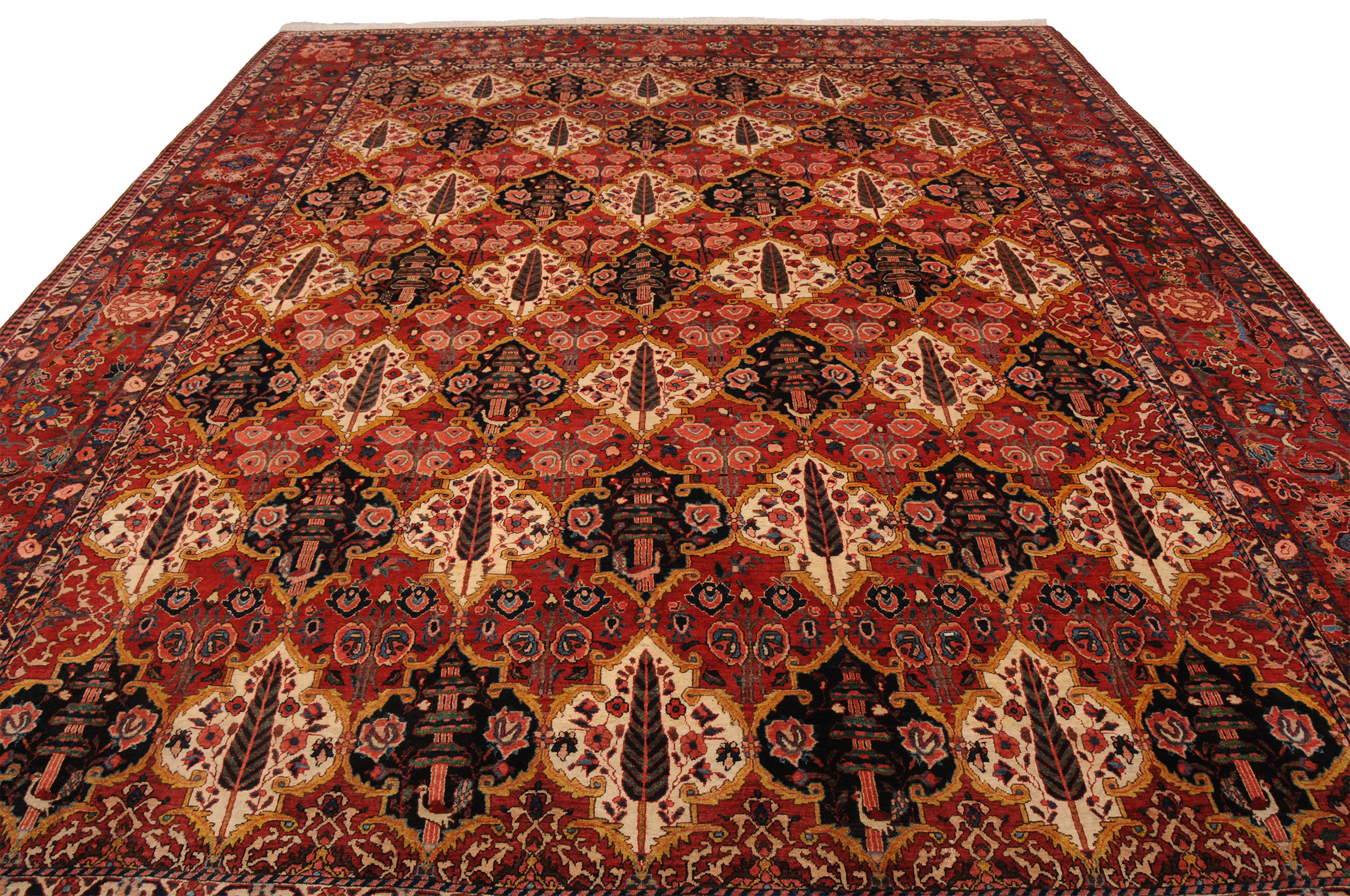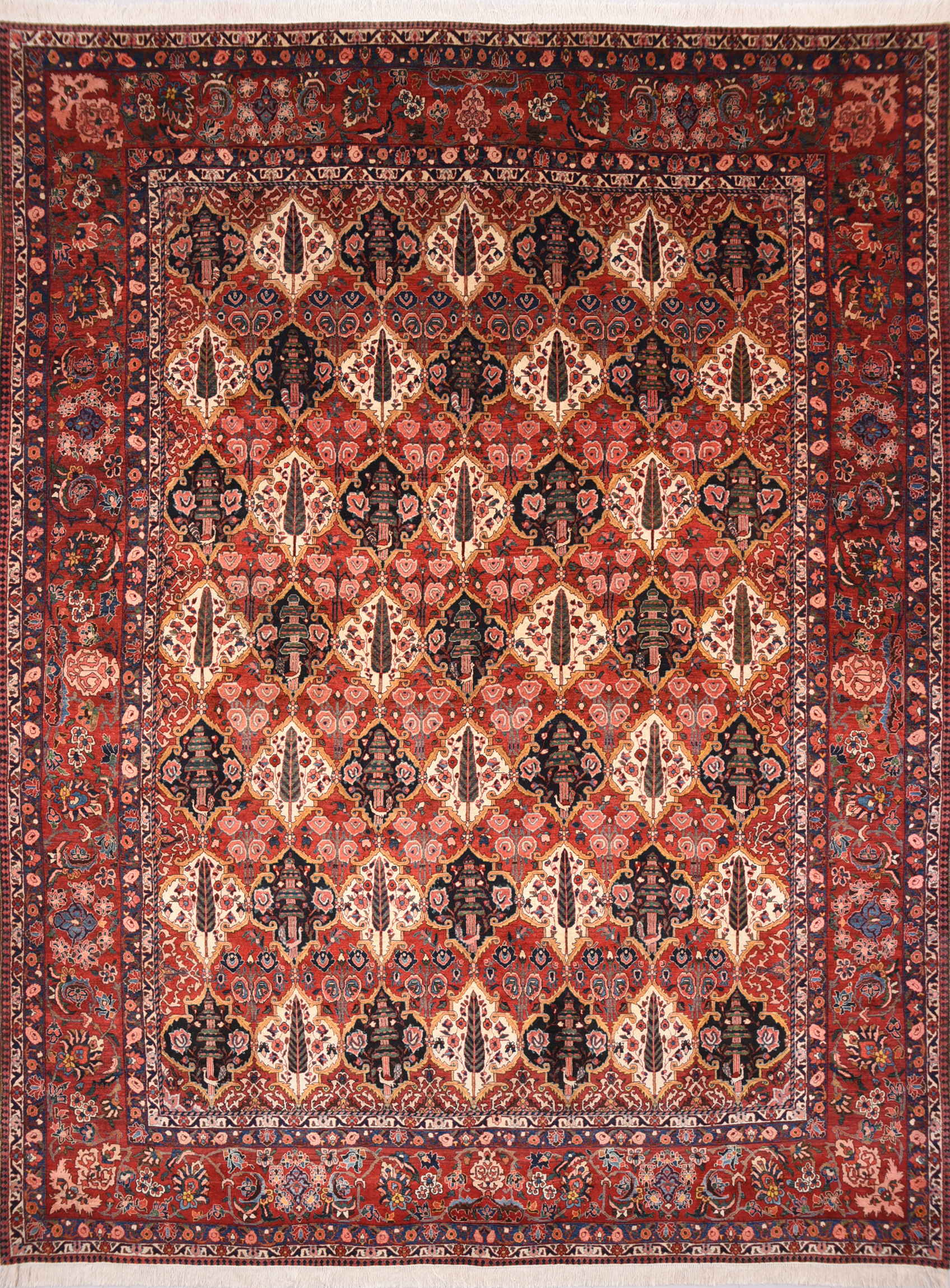 This Persian Rug is hand-knotted with 100% Wool Pile and Cotton Foundation. This Rug has a Garden Design and its Main colors are Orange, Brown, and Peach.