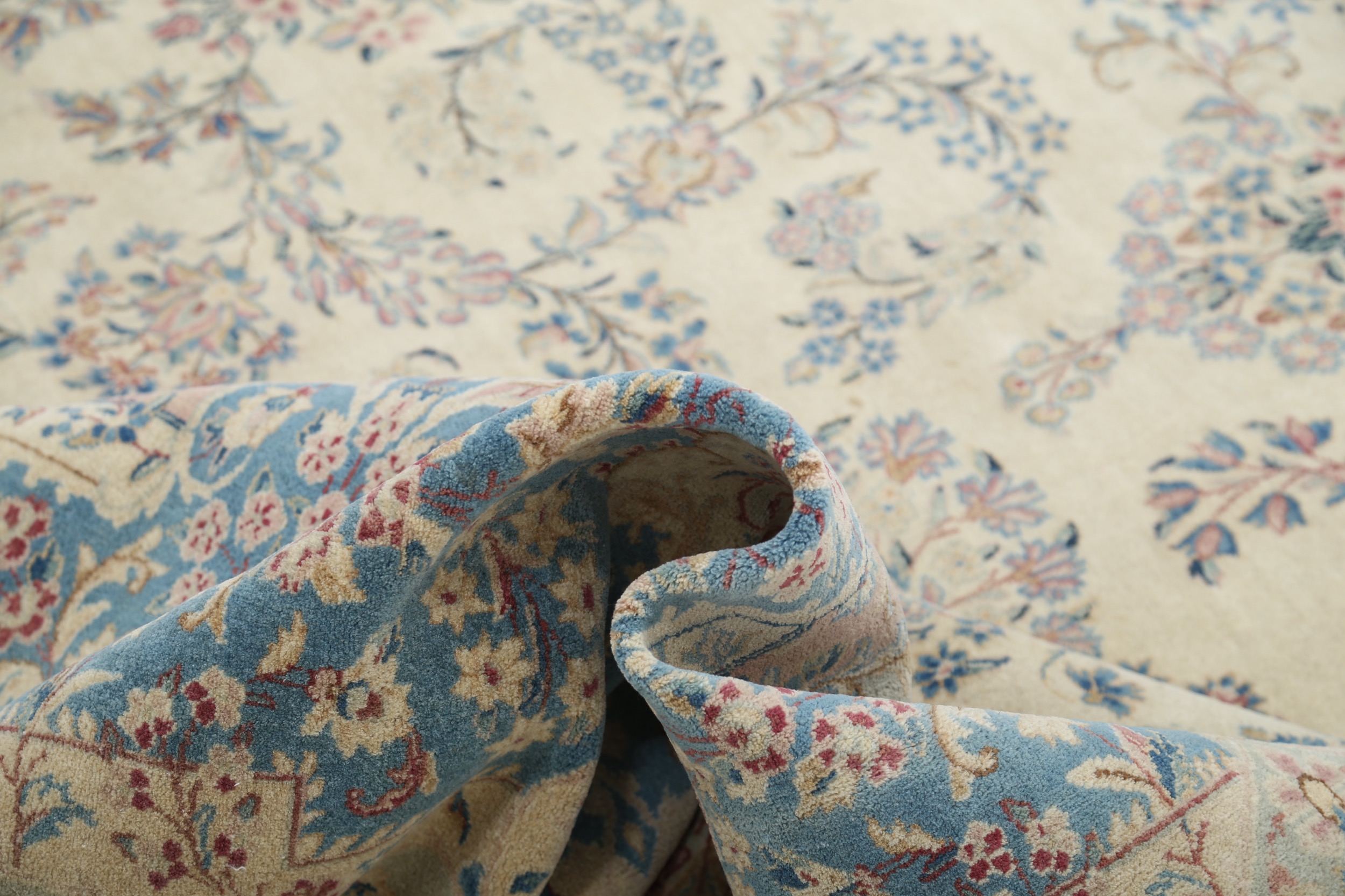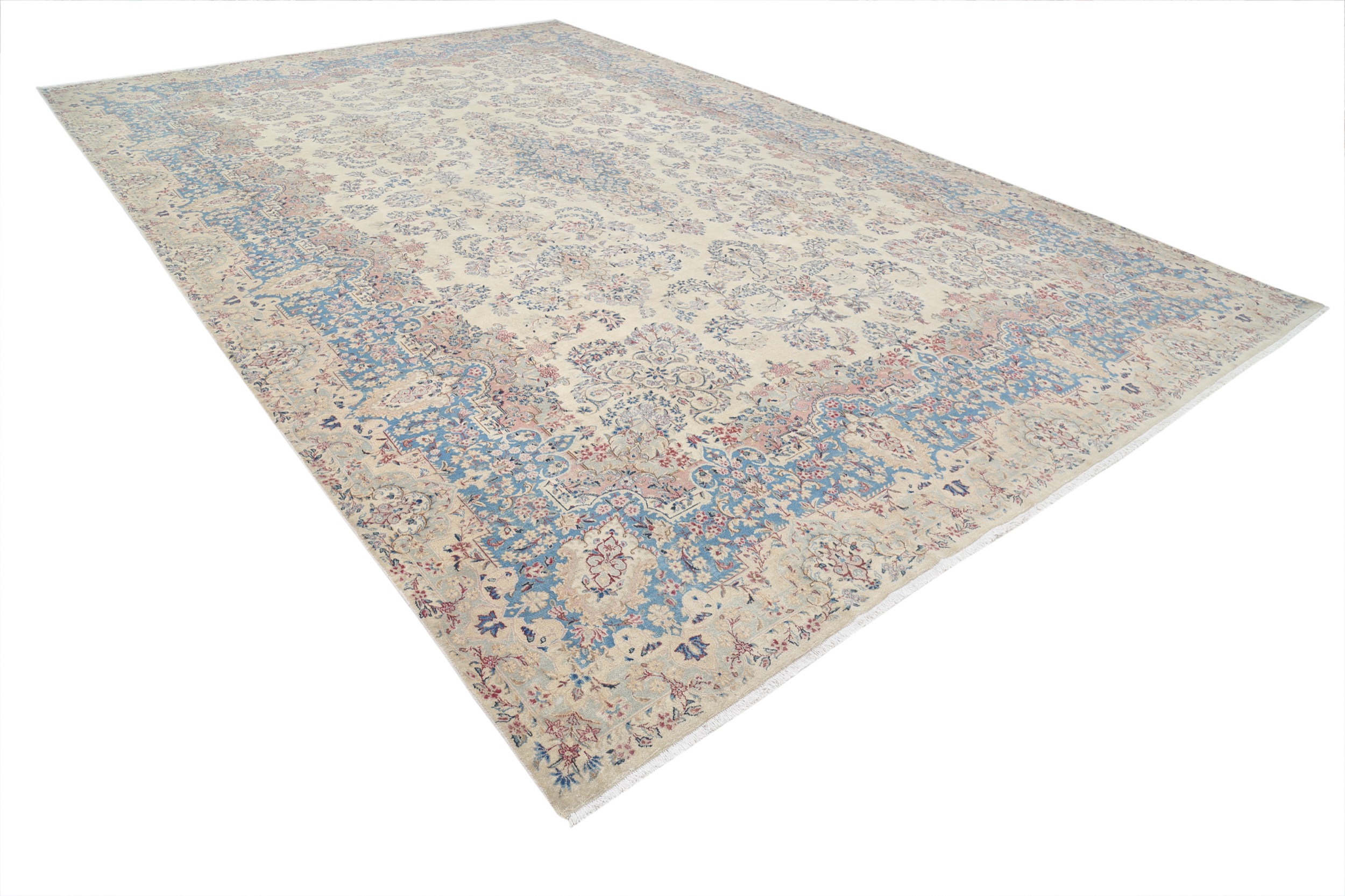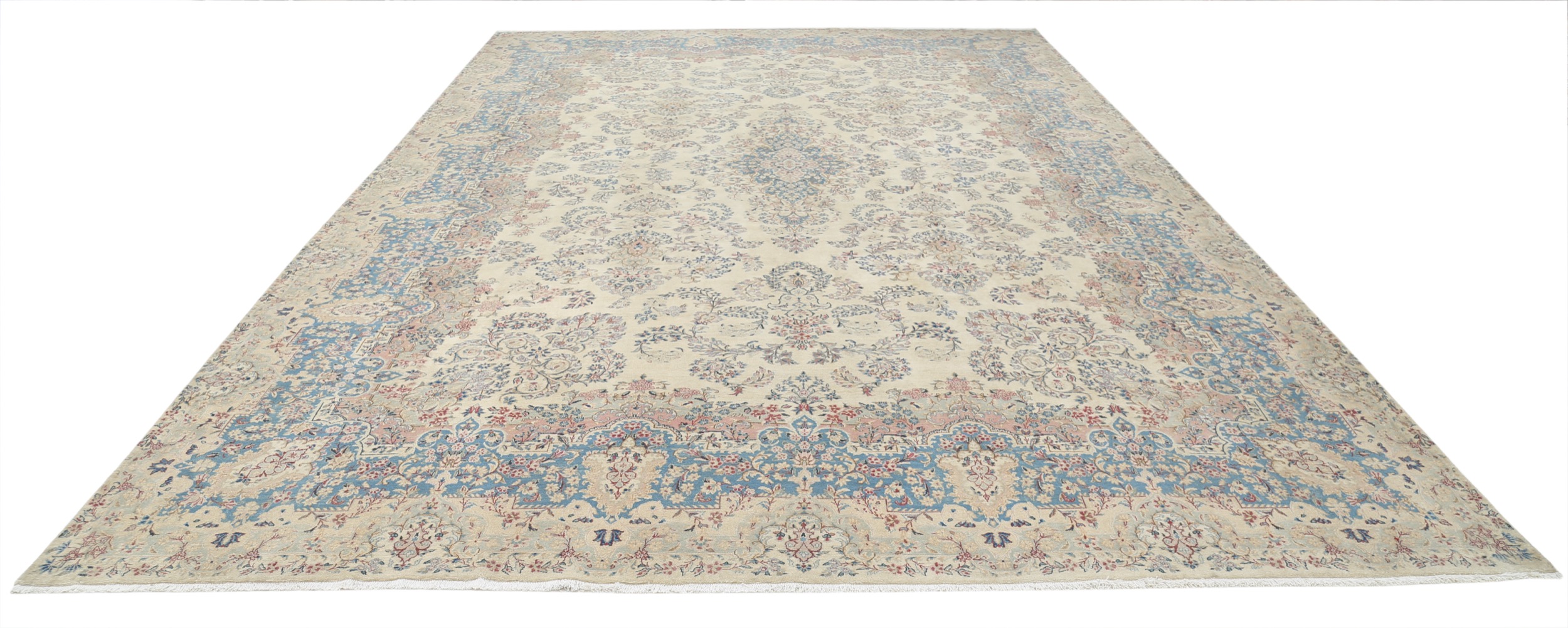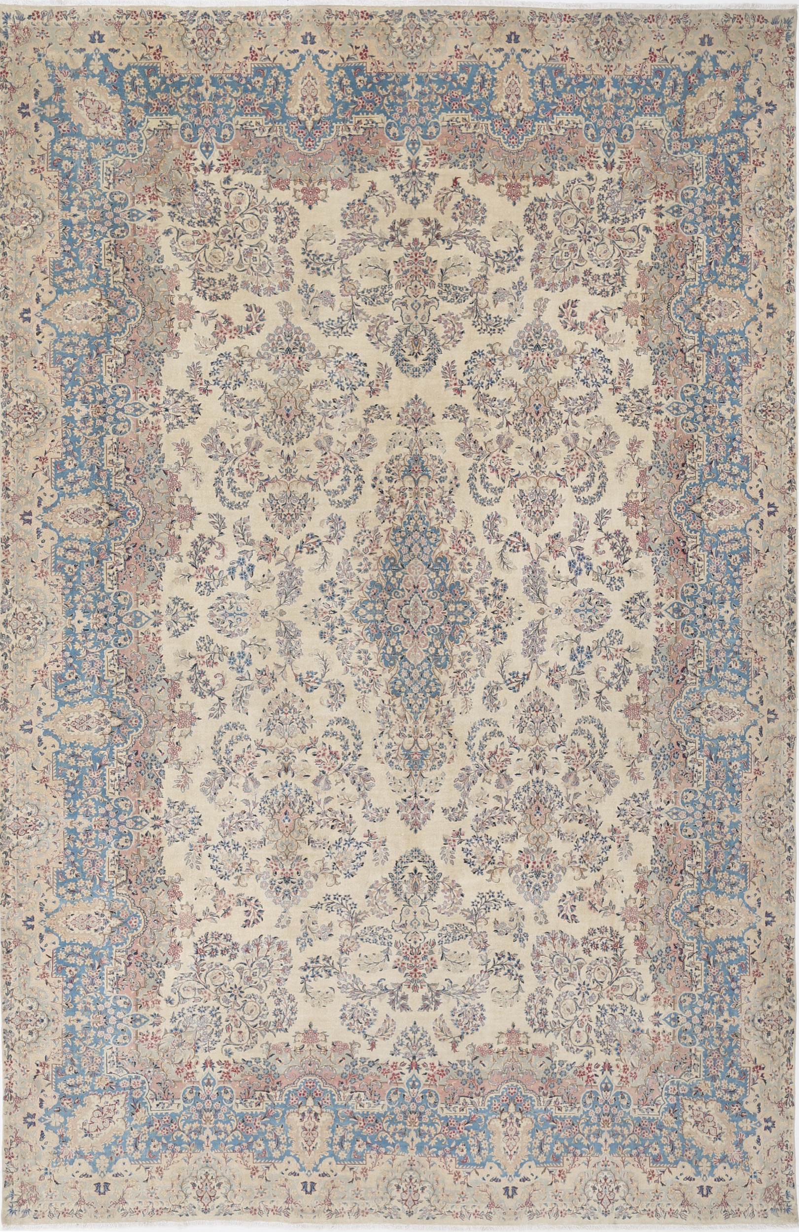 This 10’8″ x 16’9″ Kerman rug, hand-knotted in Persian, features a allover design. It is woven with Approx. 225KPSI, showcasing a field in Beige and a Blue border. The rug has a Medium Pile and a 100% Wool pile, and is in excellent condition.