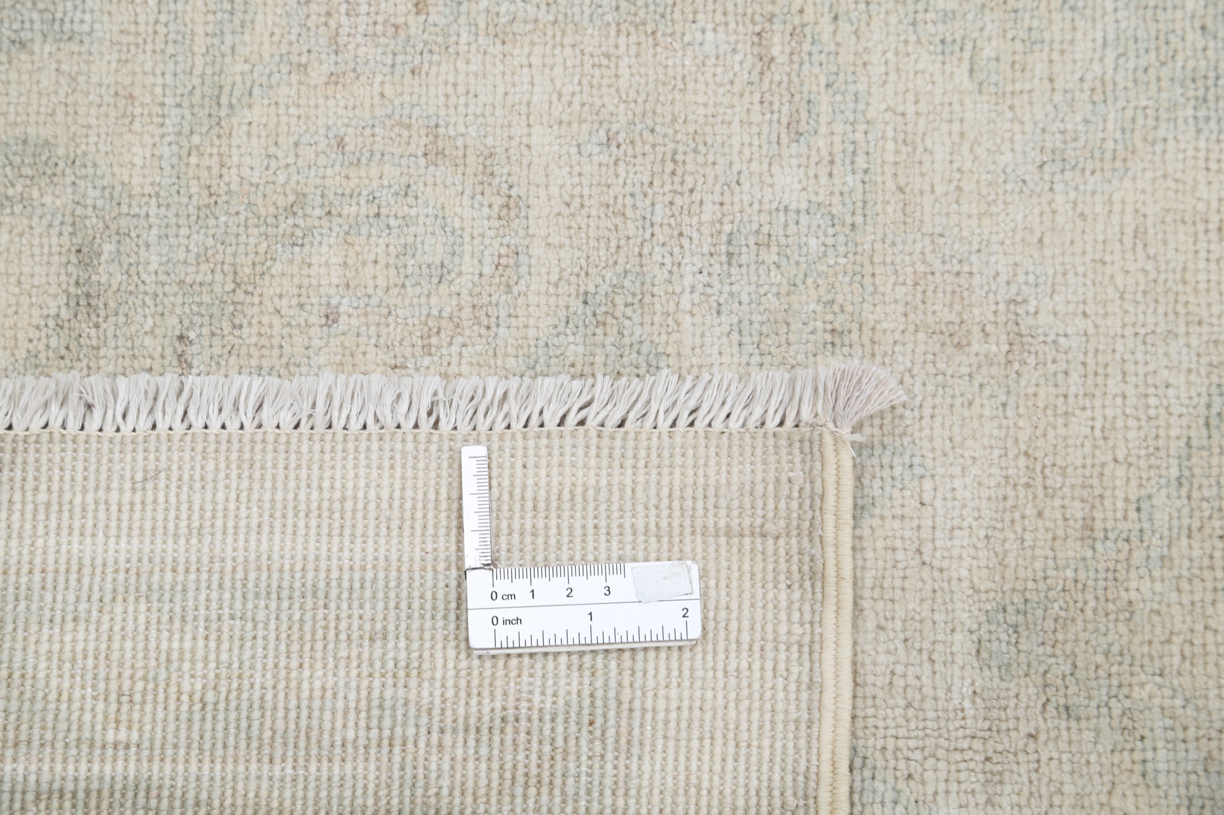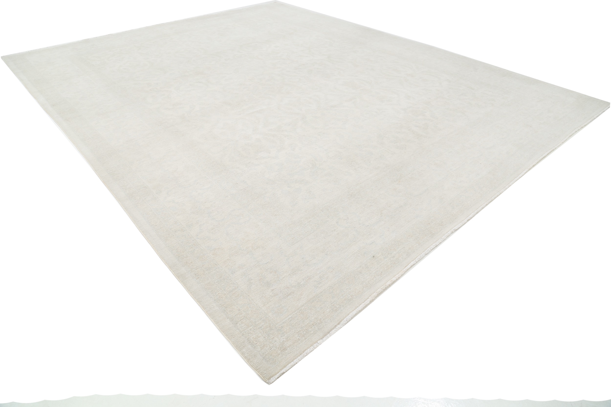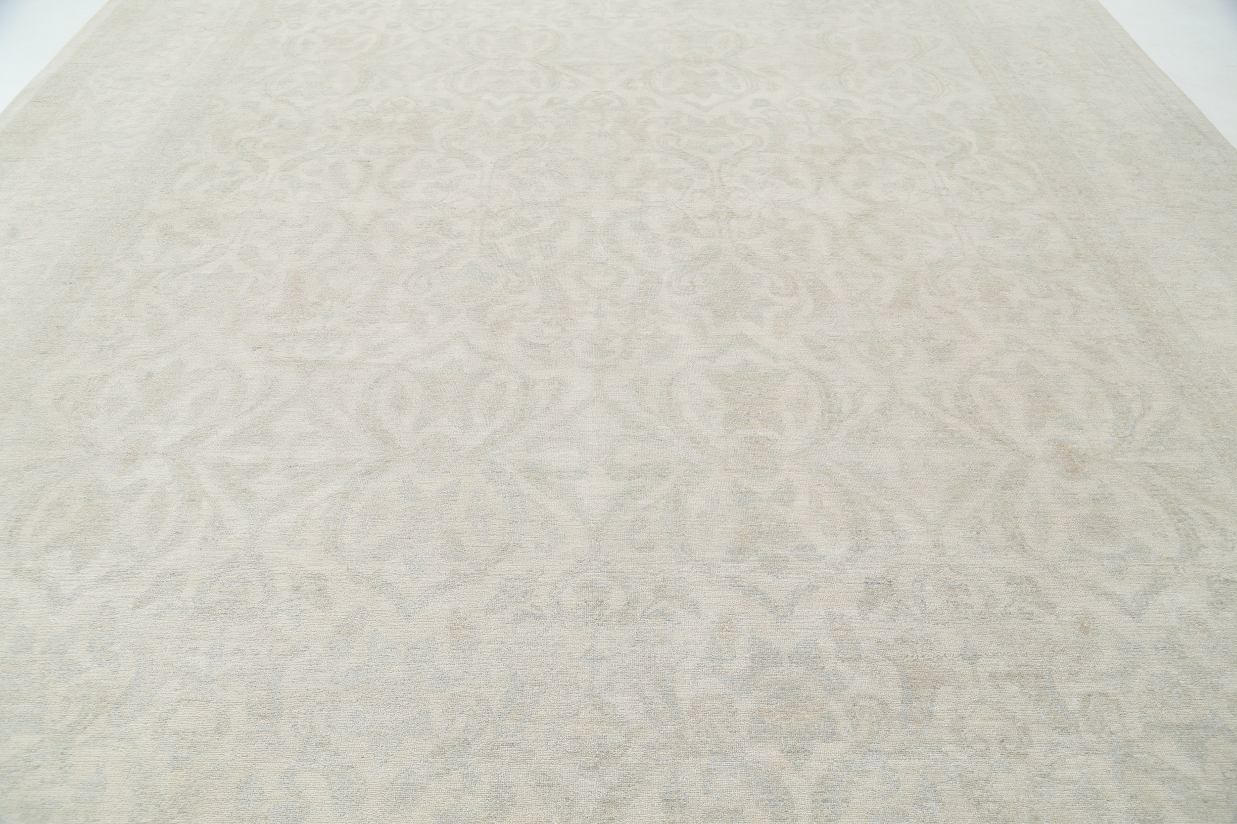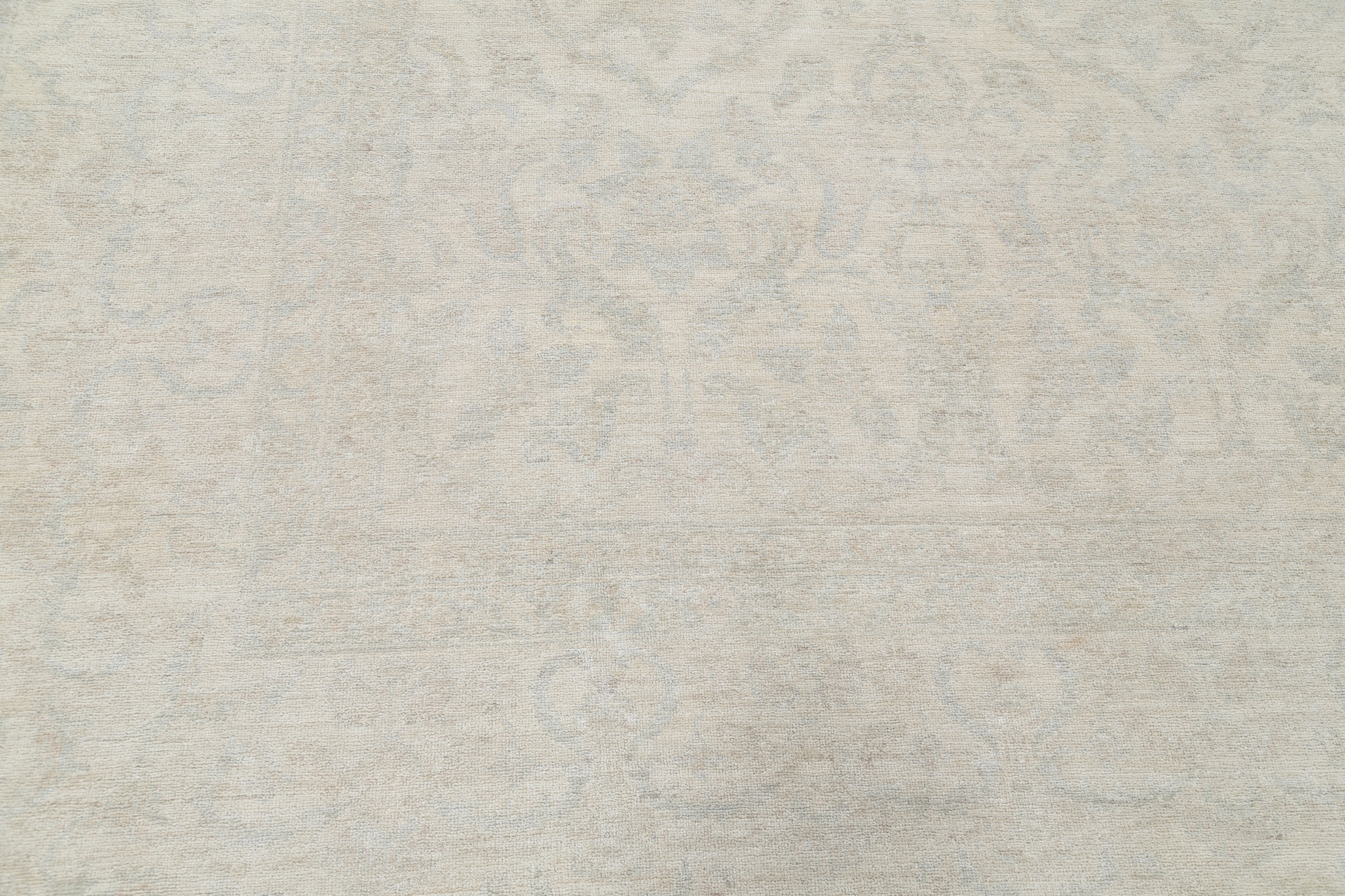 This 11’10” x 14’10” Oushak rug, hand-knotted in Afghan / Pakistan, features a allover design. It is woven with Approx. 156KPSI, showcasing a field in Beige and a Blue border. The rug has a Medium Pile and a 100% Wool pile, and is in excellent condition.