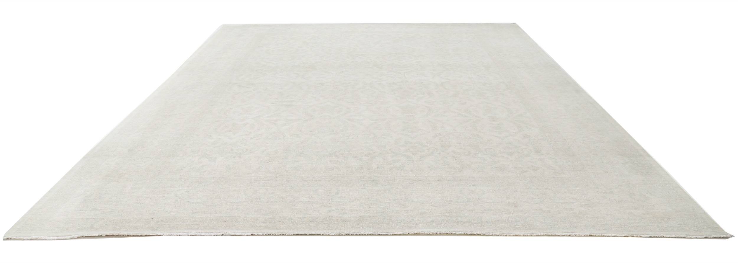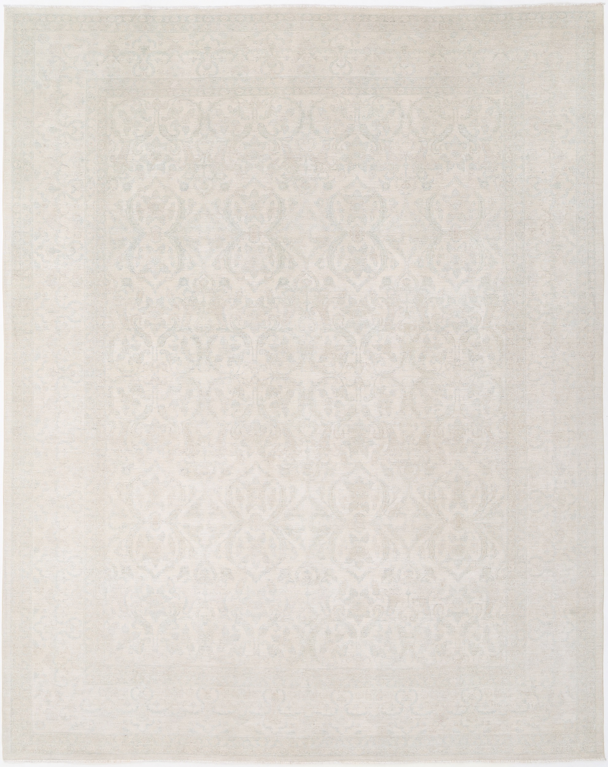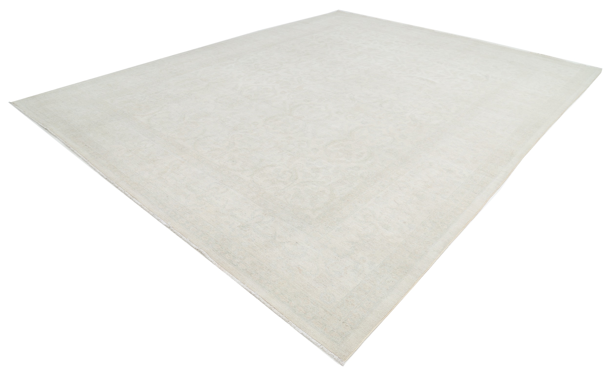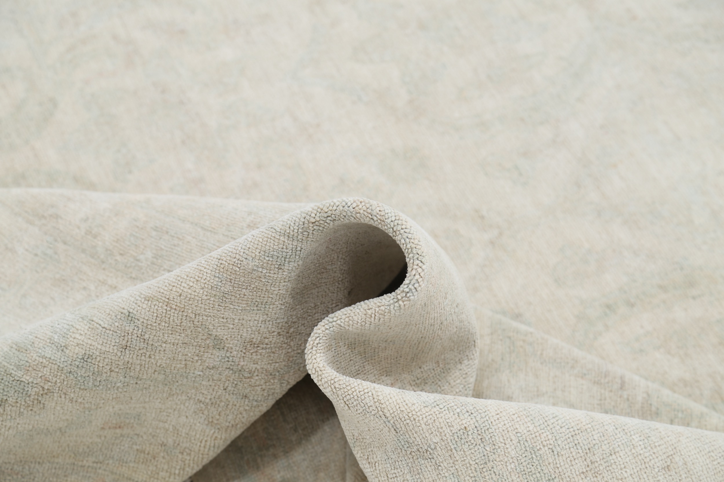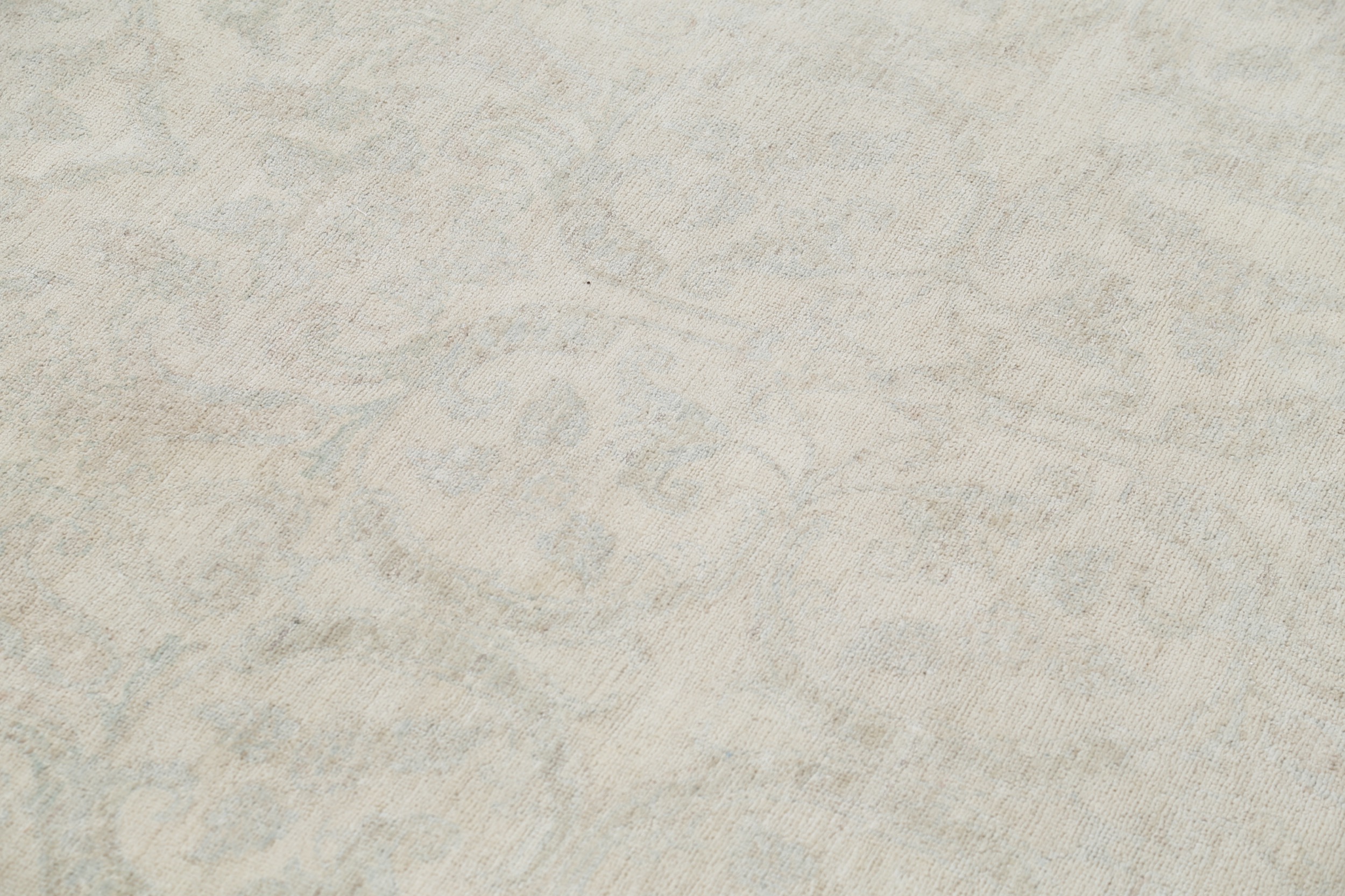 This 11’10” x 14’10” Oushak rug, hand-knotted in Afghan / Pakistan, features a allover design. It is woven with Approx. 156KPSI, showcasing a field in Beige and a Blue border. The rug has a Medium Pile and a 100% Wool pile, and is in excellent condition.