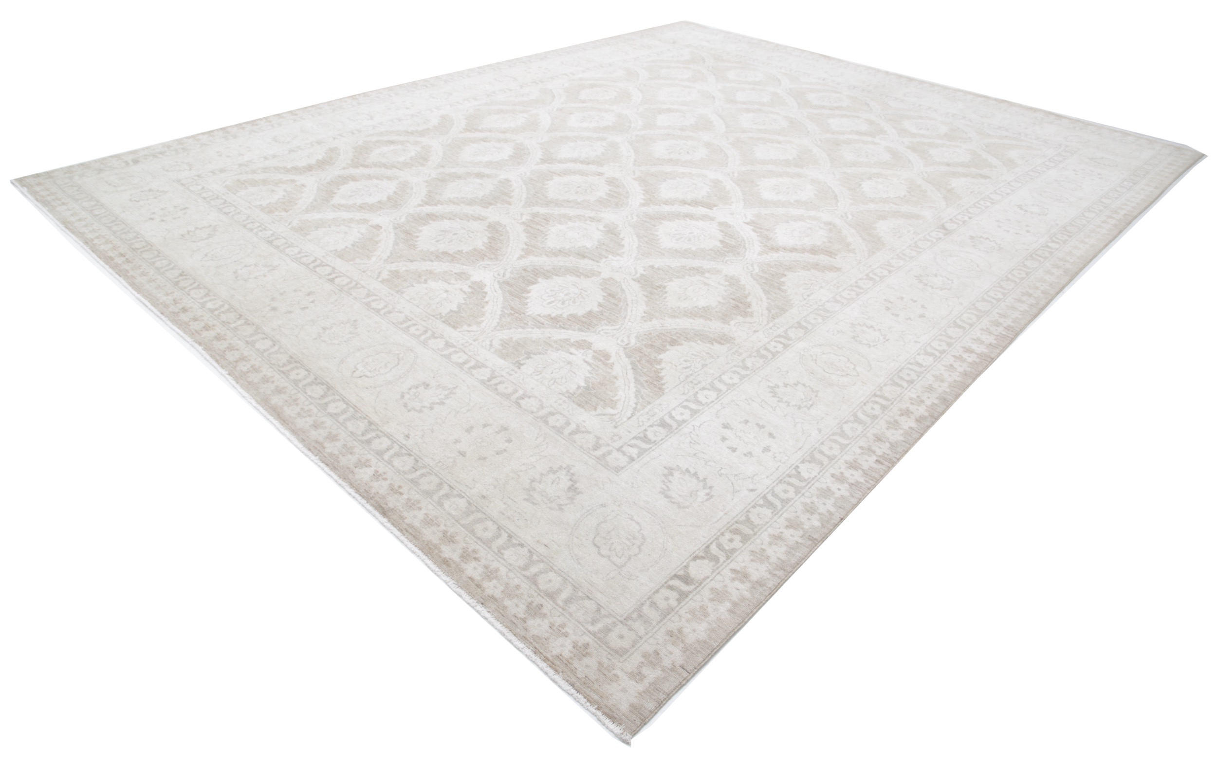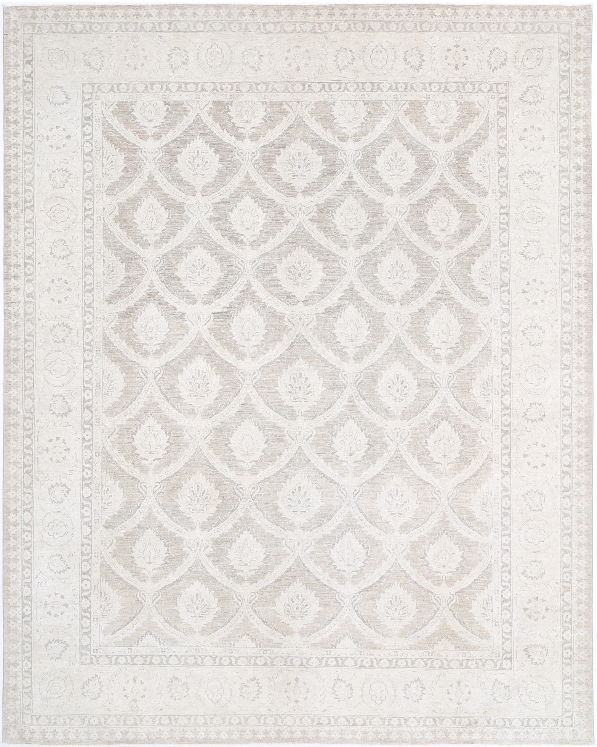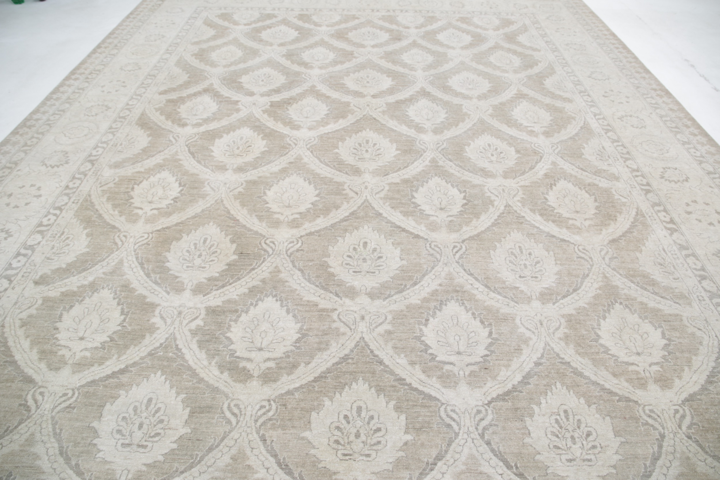 This 11’11” x 15’2″ Oushak rug, hand-knotted in Afghan / Pakistan, features a allover design. It is woven with Approx. 156KPSI, showcasing a field in Taupe and a Beige border. The rug has a Medium Pile and a 100% Wool pile, and is in excellent condition.