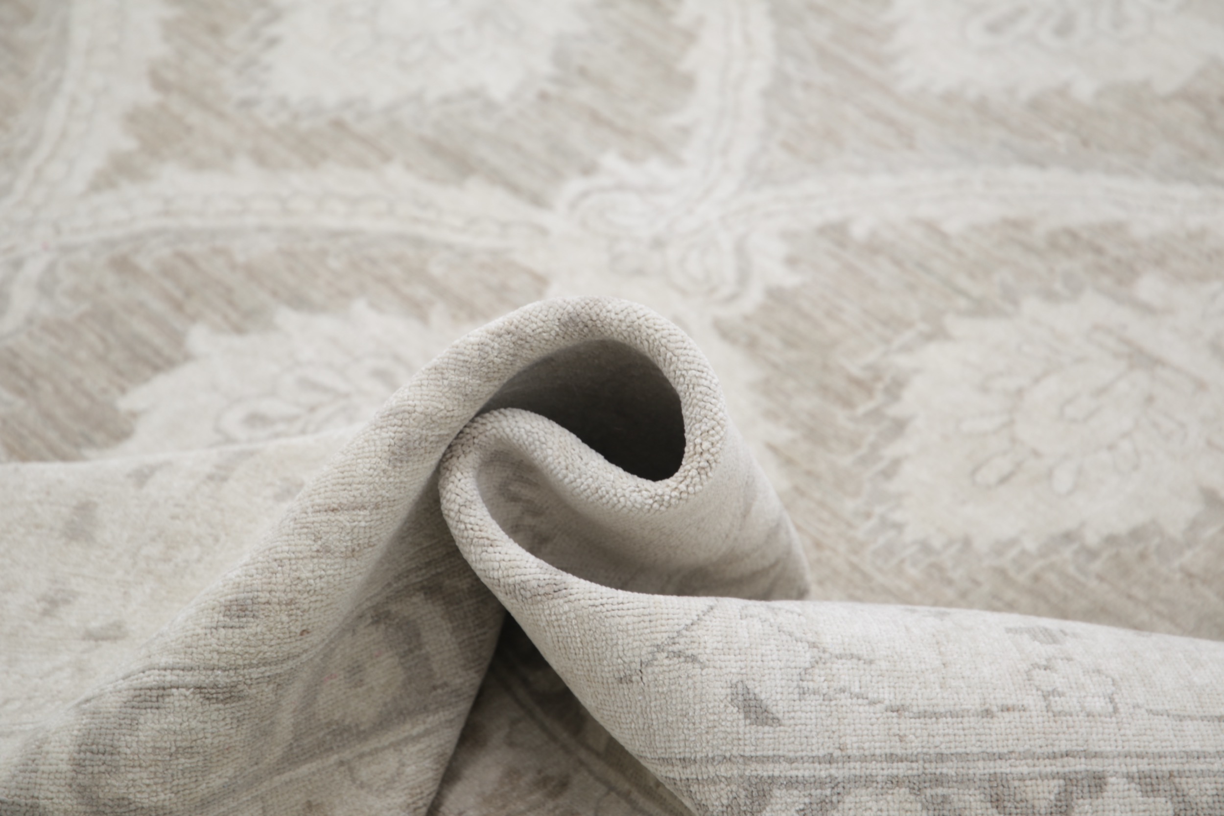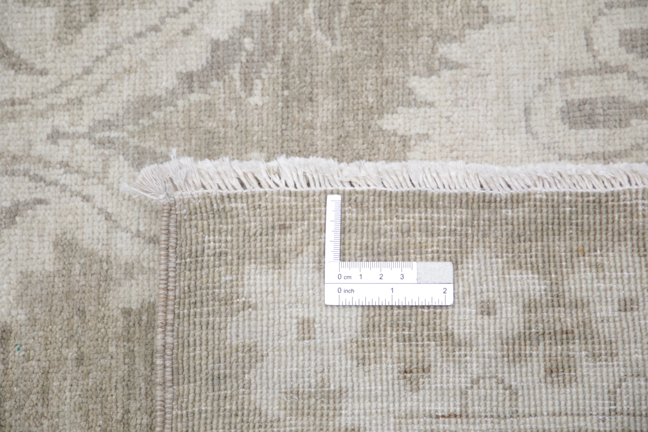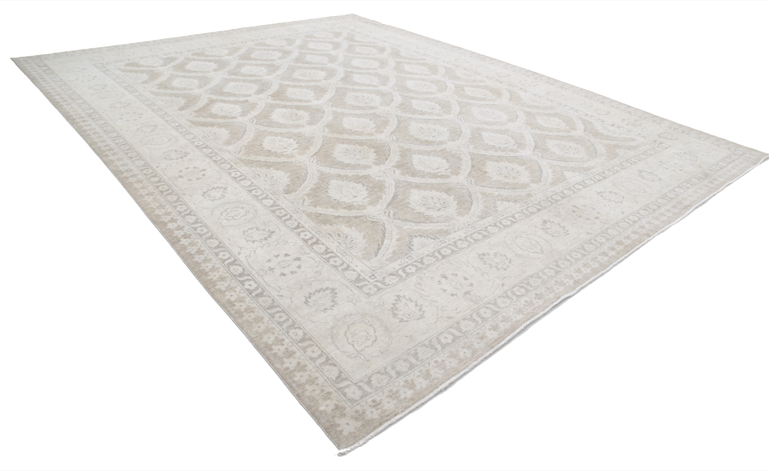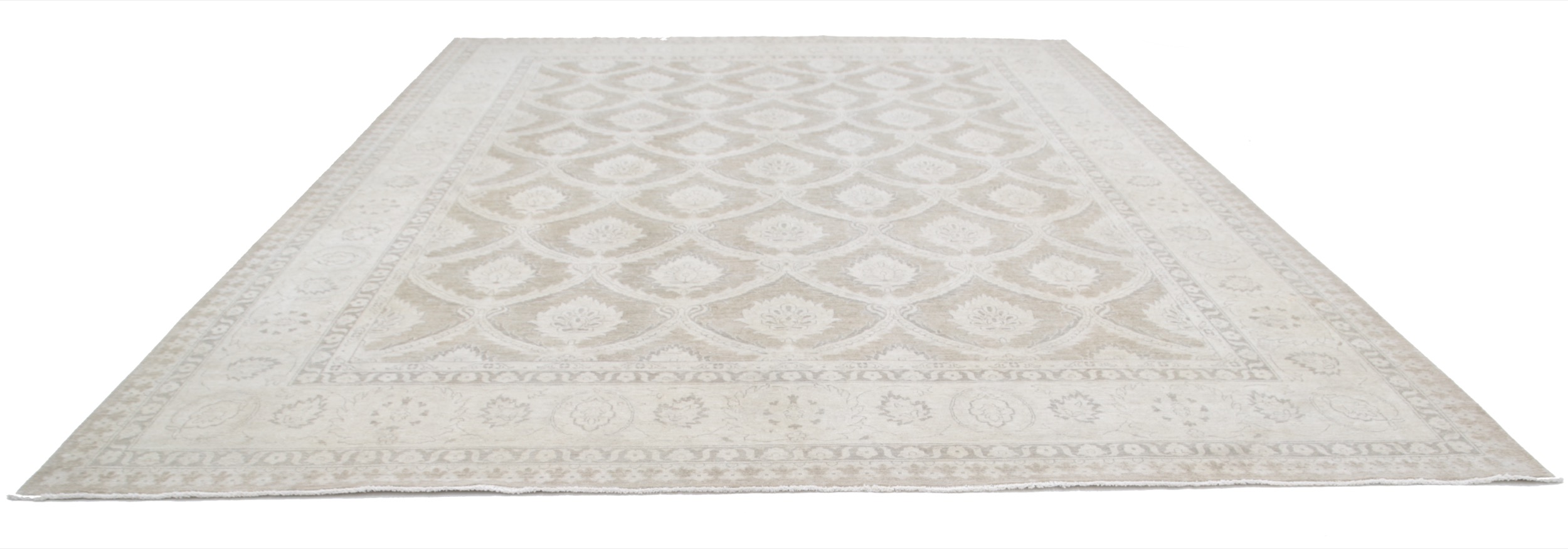 This 11’11” x 15’2″ Oushak rug, hand-knotted in Afghan / Pakistan, features a allover design. It is woven with Approx. 156KPSI, showcasing a field in Taupe and a Beige border. The rug has a Medium Pile and a 100% Wool pile, and is in excellent condition.