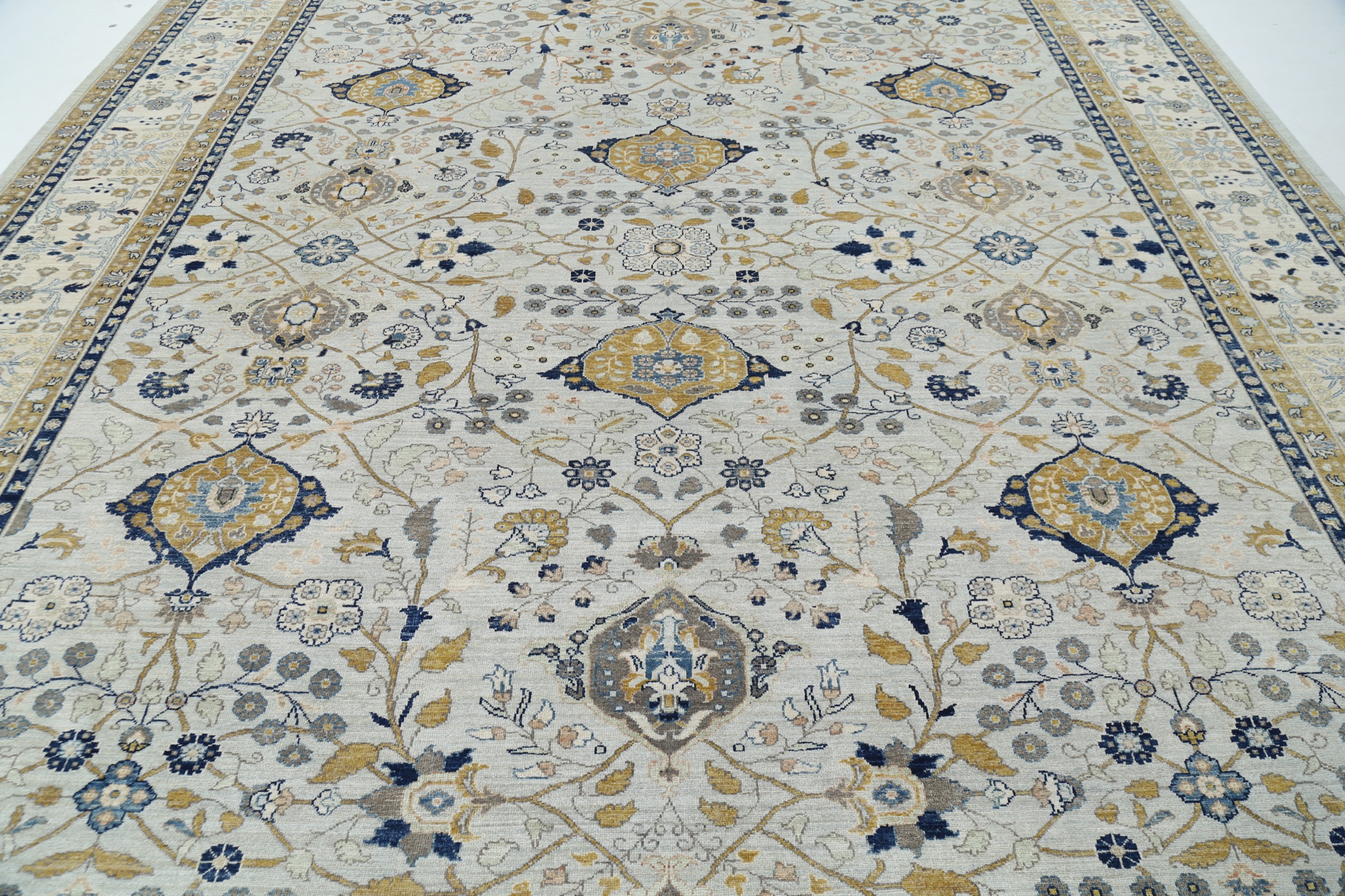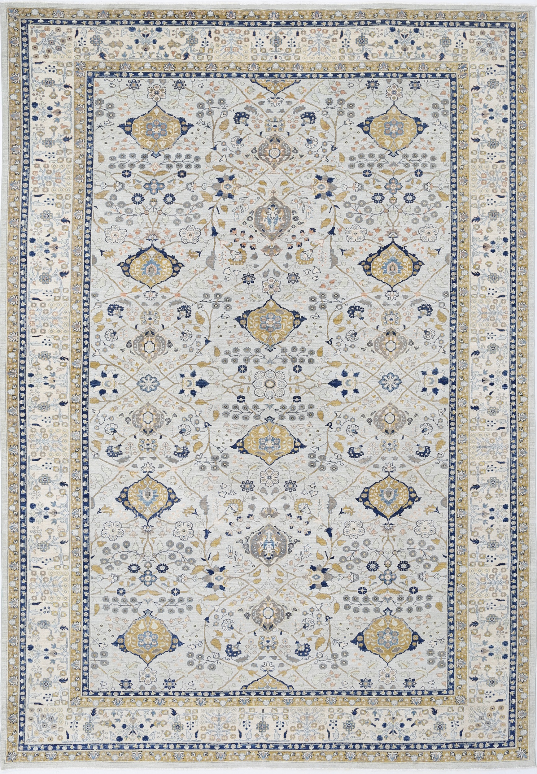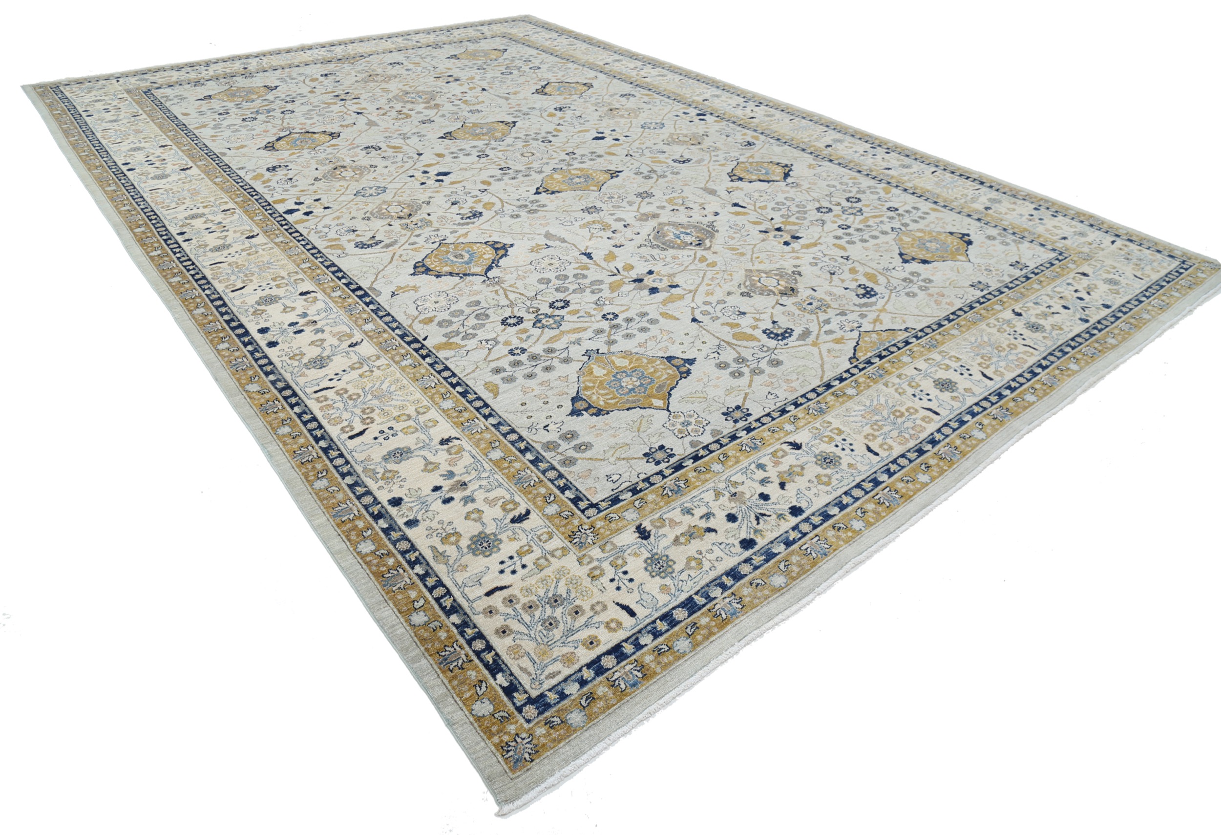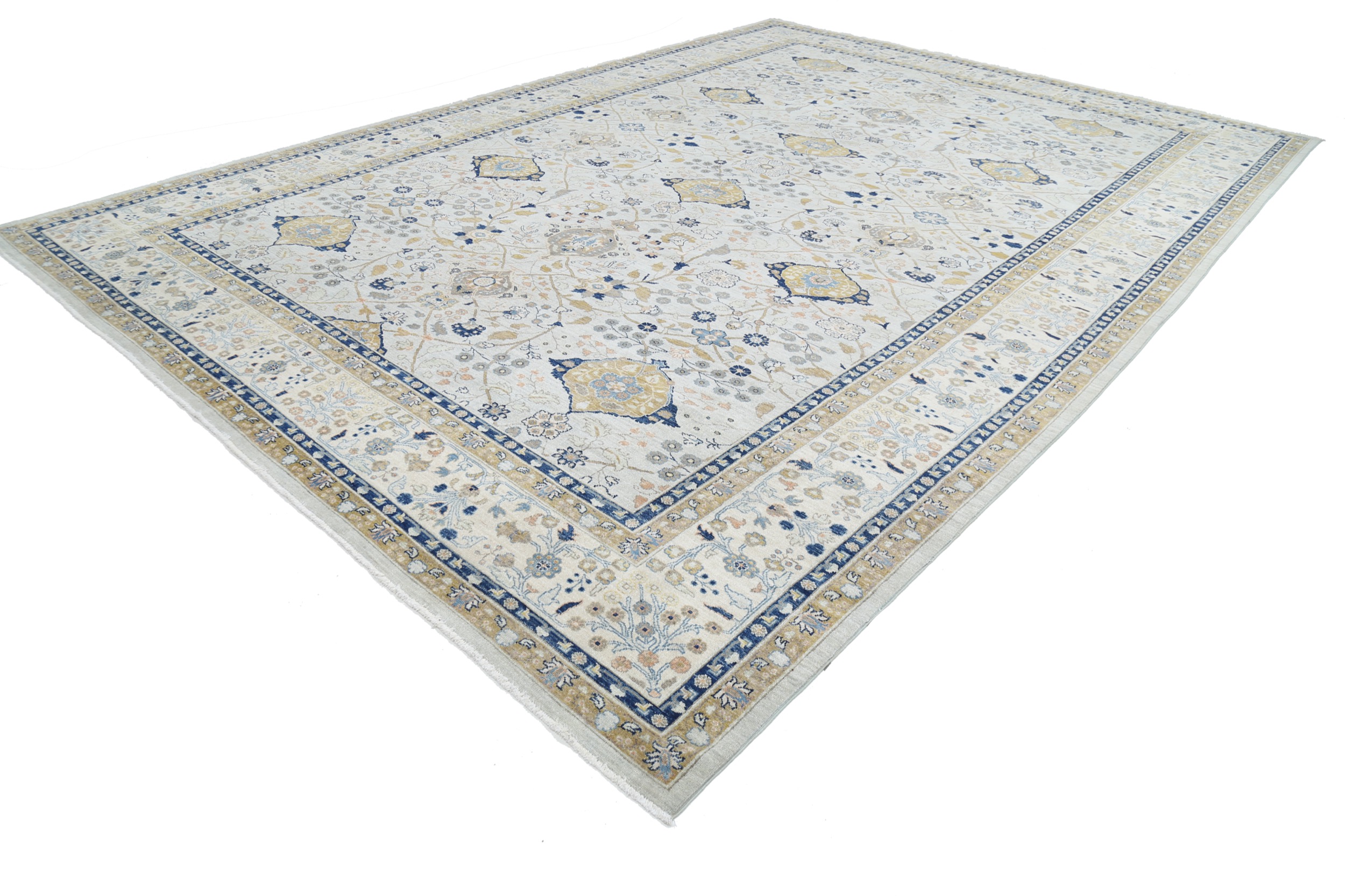 This 11’6″ x 16’5″ Oushak rug, hand-knotted in Afghan / Pakistan, features a allover design. It is woven with Approx. 156KPSI, showcasing a field in Blue and a Beige border. The rug has a Medium Pile and a 100% Wool pile, and is in excellent condition.