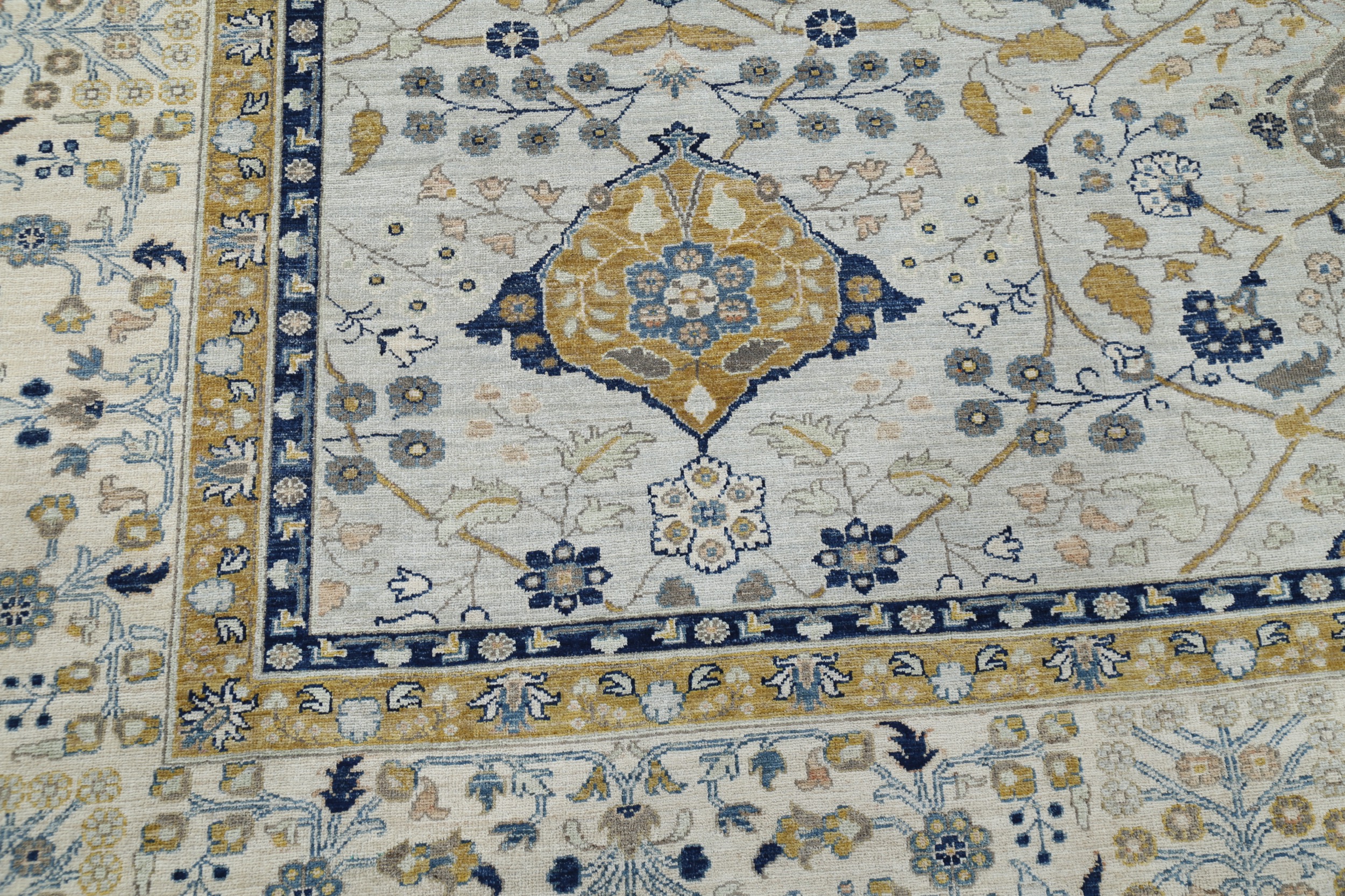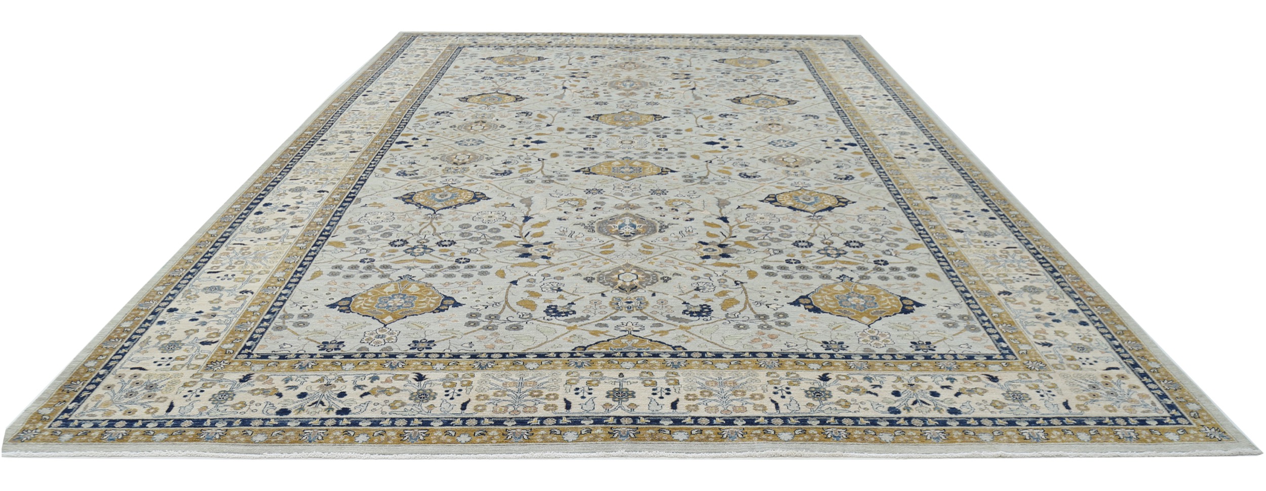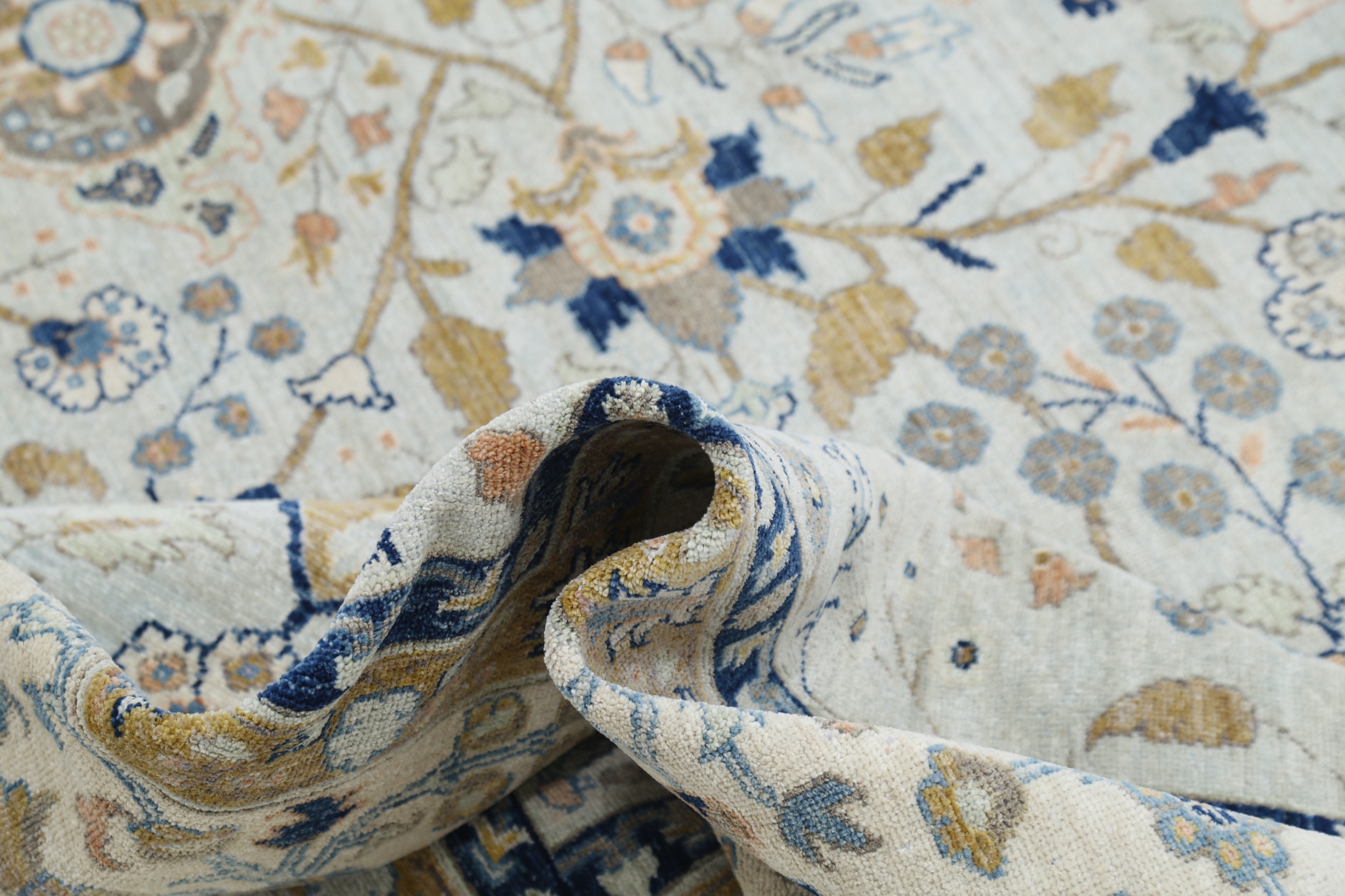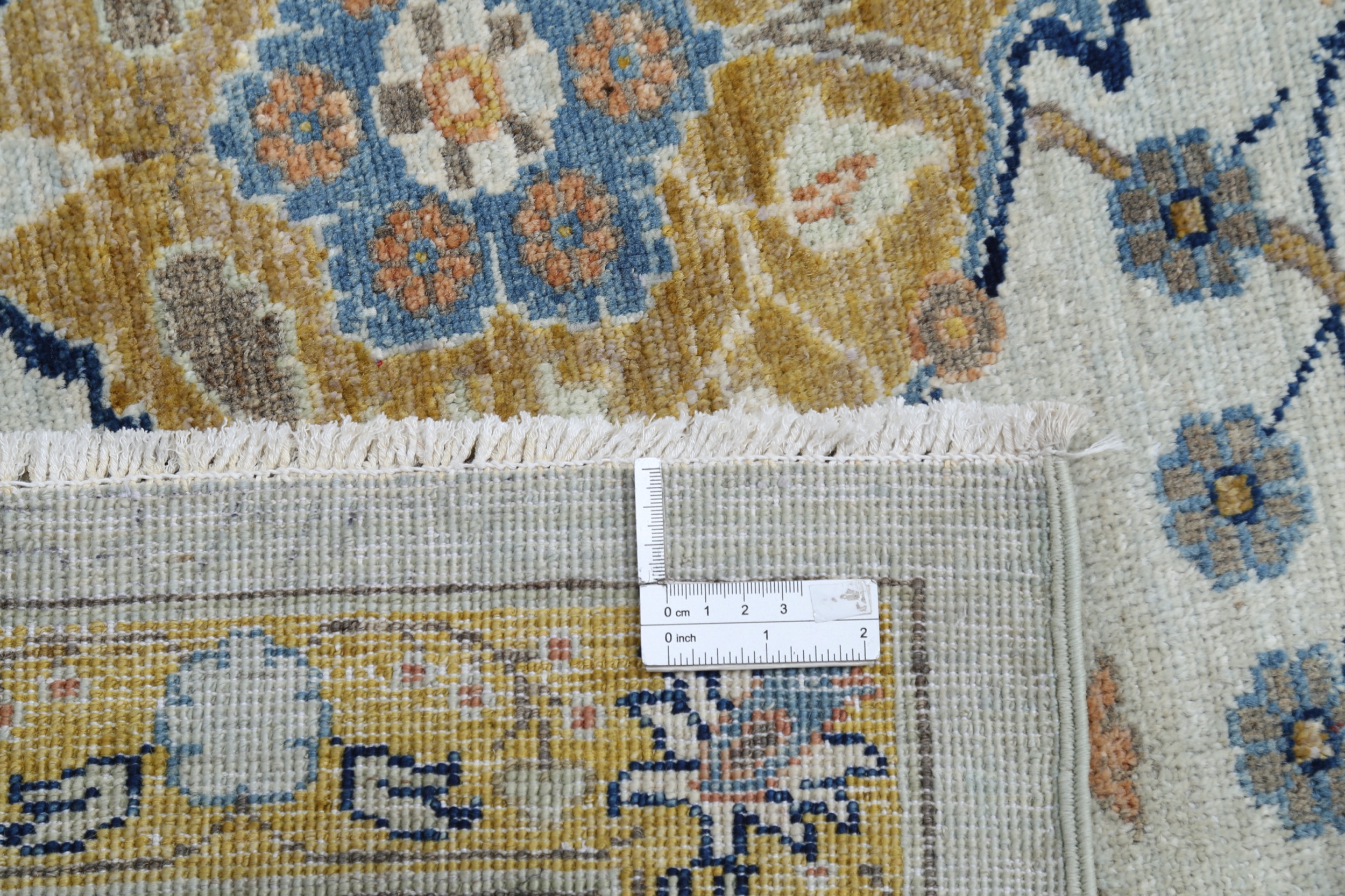 This 11’6″ x 16’5″ Oushak rug, hand-knotted in Afghan / Pakistan, features a allover design. It is woven with Approx. 156KPSI, showcasing a field in Blue and a Beige border. The rug has a Medium Pile and a 100% Wool pile, and is in excellent condition.