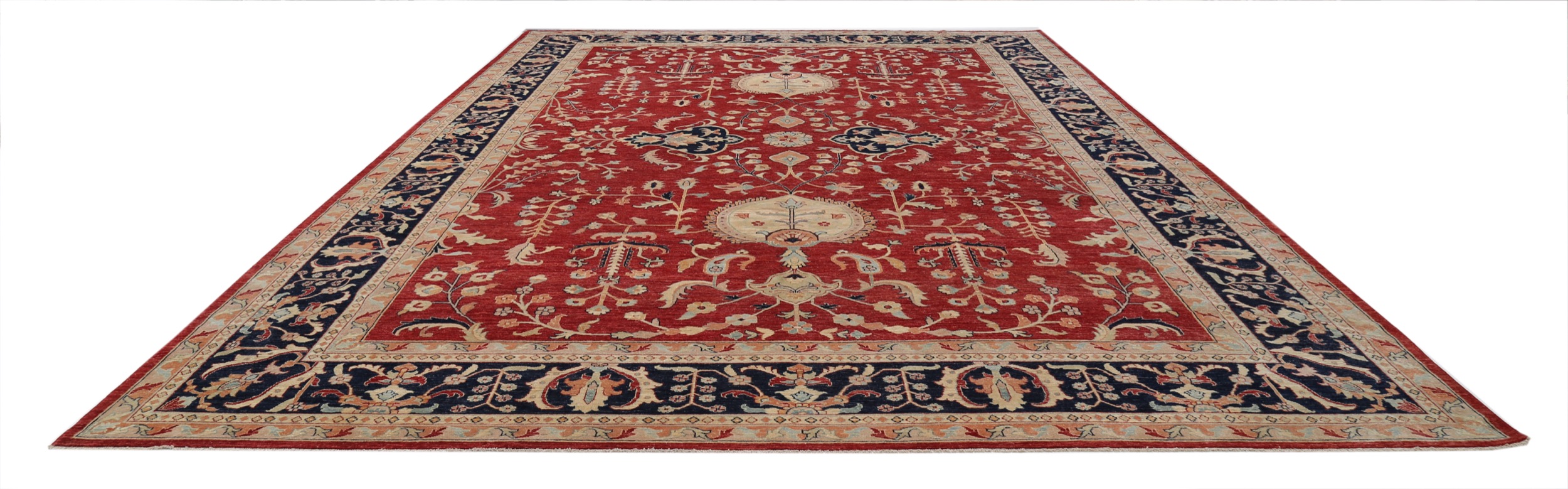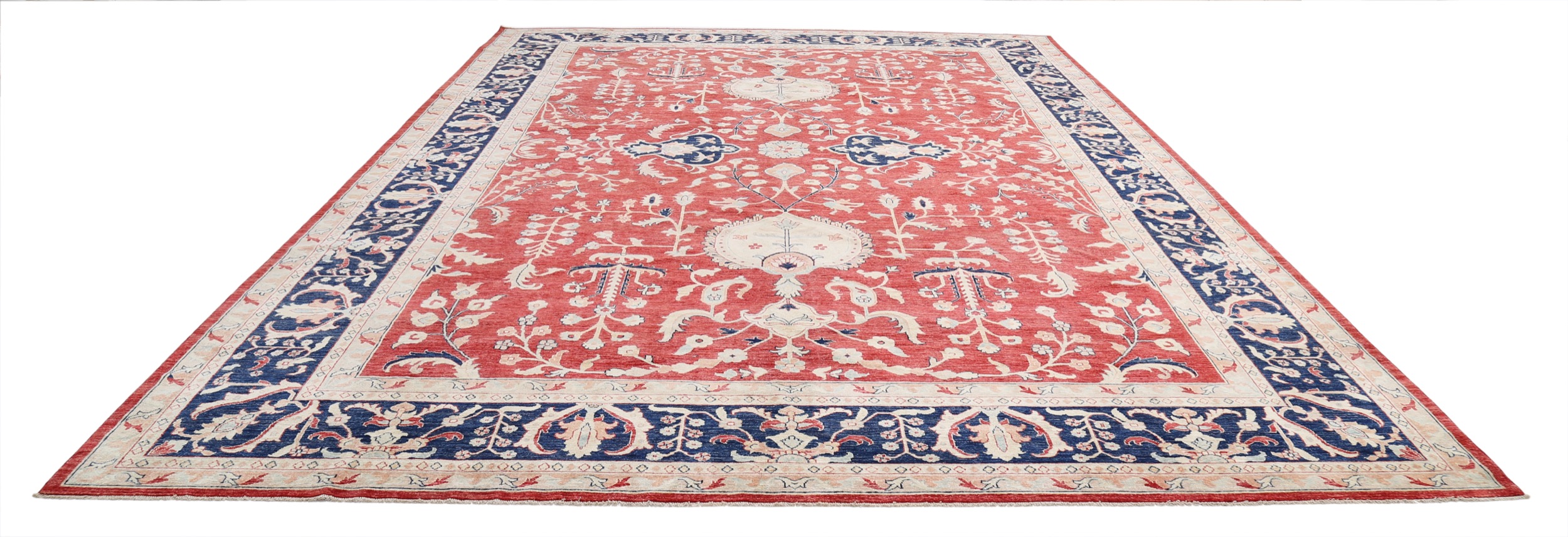 This 11’6″ x 16’9″ Oushak rug, hand-knotted in Afghan / Pakistan, features a allover design. It is woven with Approx. 156KPSI, showcasing a field in Red and a Blue border. The rug has a Medium Pile and a 100% Wool pile, and is in excellent condition.