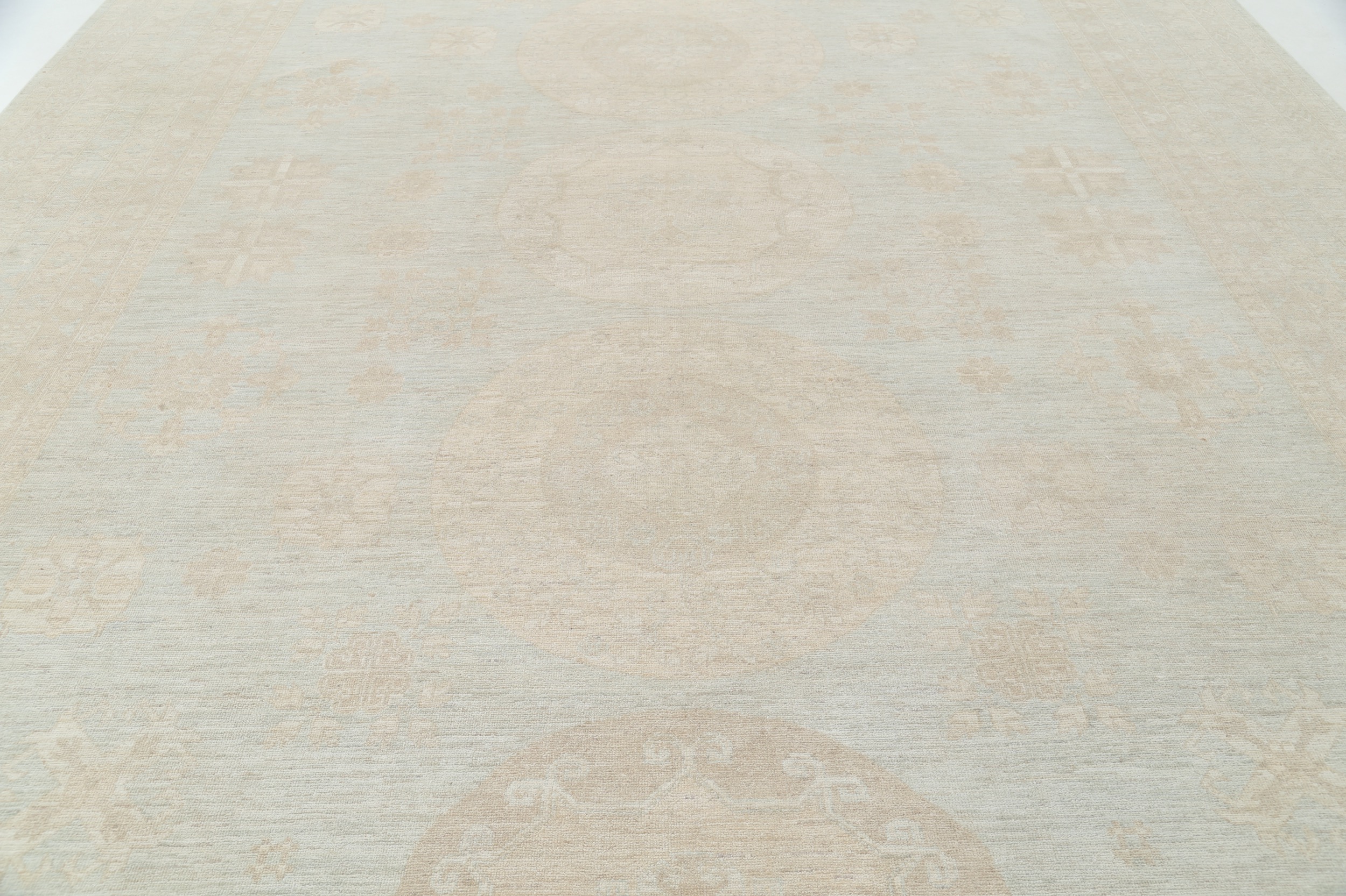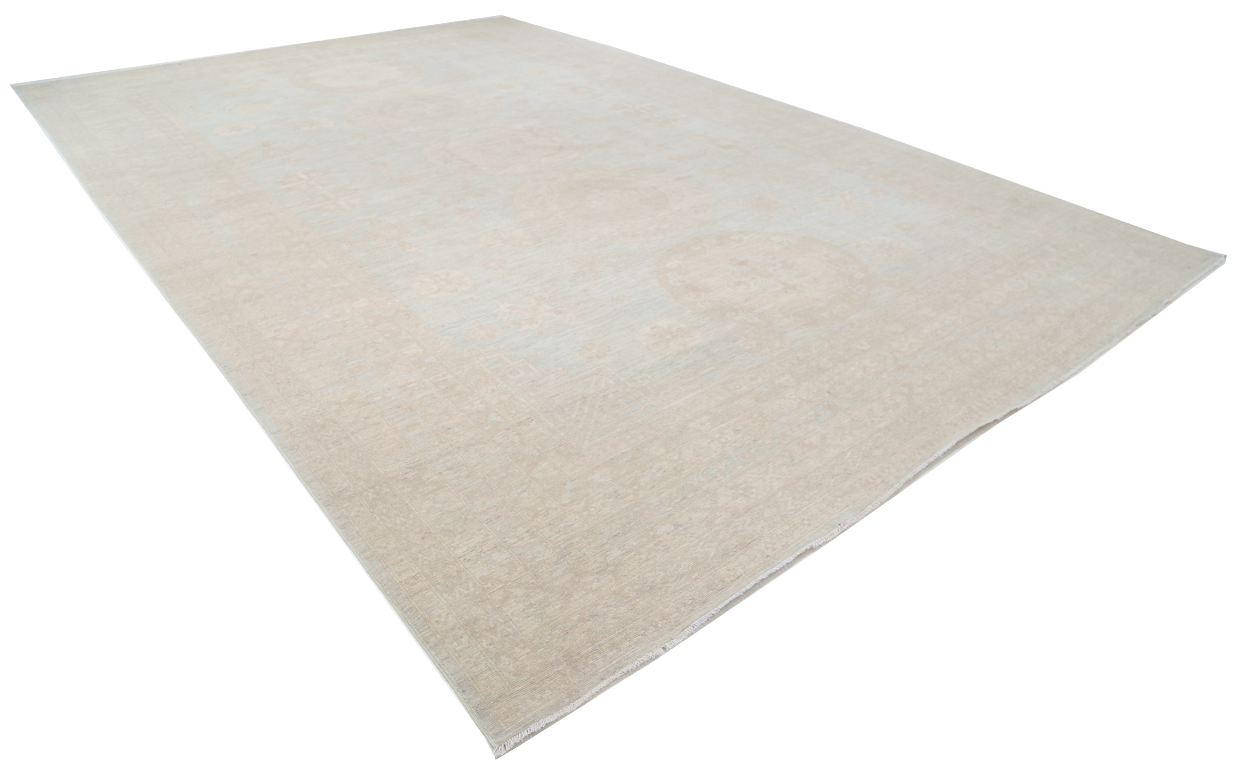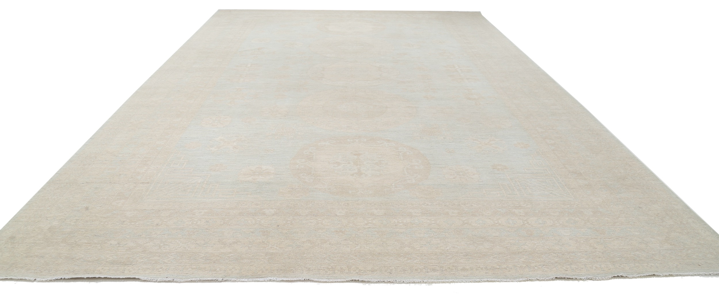 This 11’8″ x 17’11” Oushak rug, hand-knotted in Afghan / Pakistan, features a allover design. It is woven with Approx. 144KPSI, showcasing a field in Blue and a Beige border. The rug has a Medium Pile and a 100% Wool pile, and is in excellent condition.