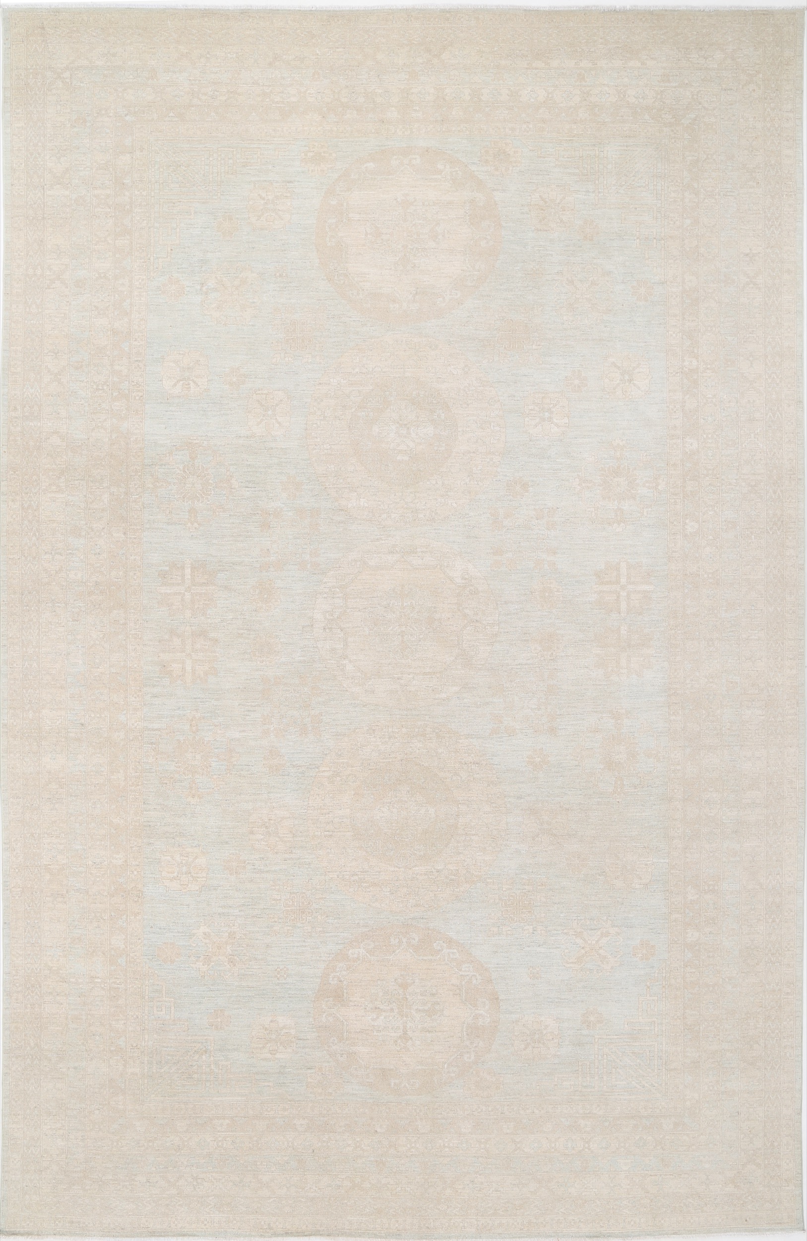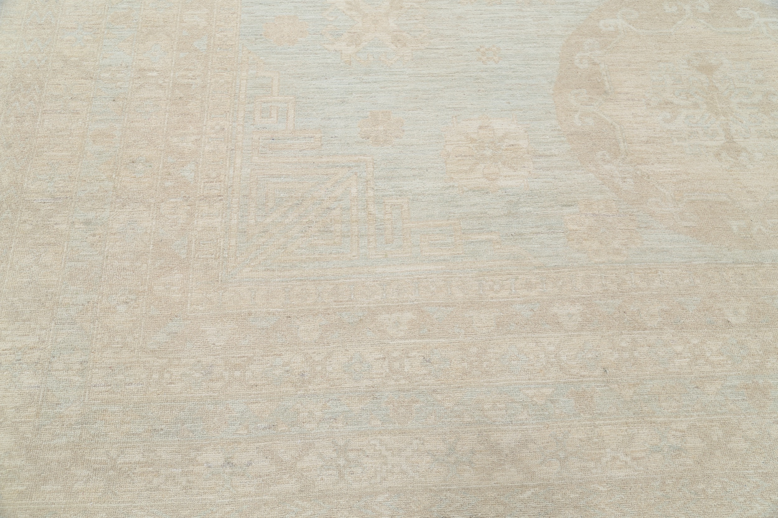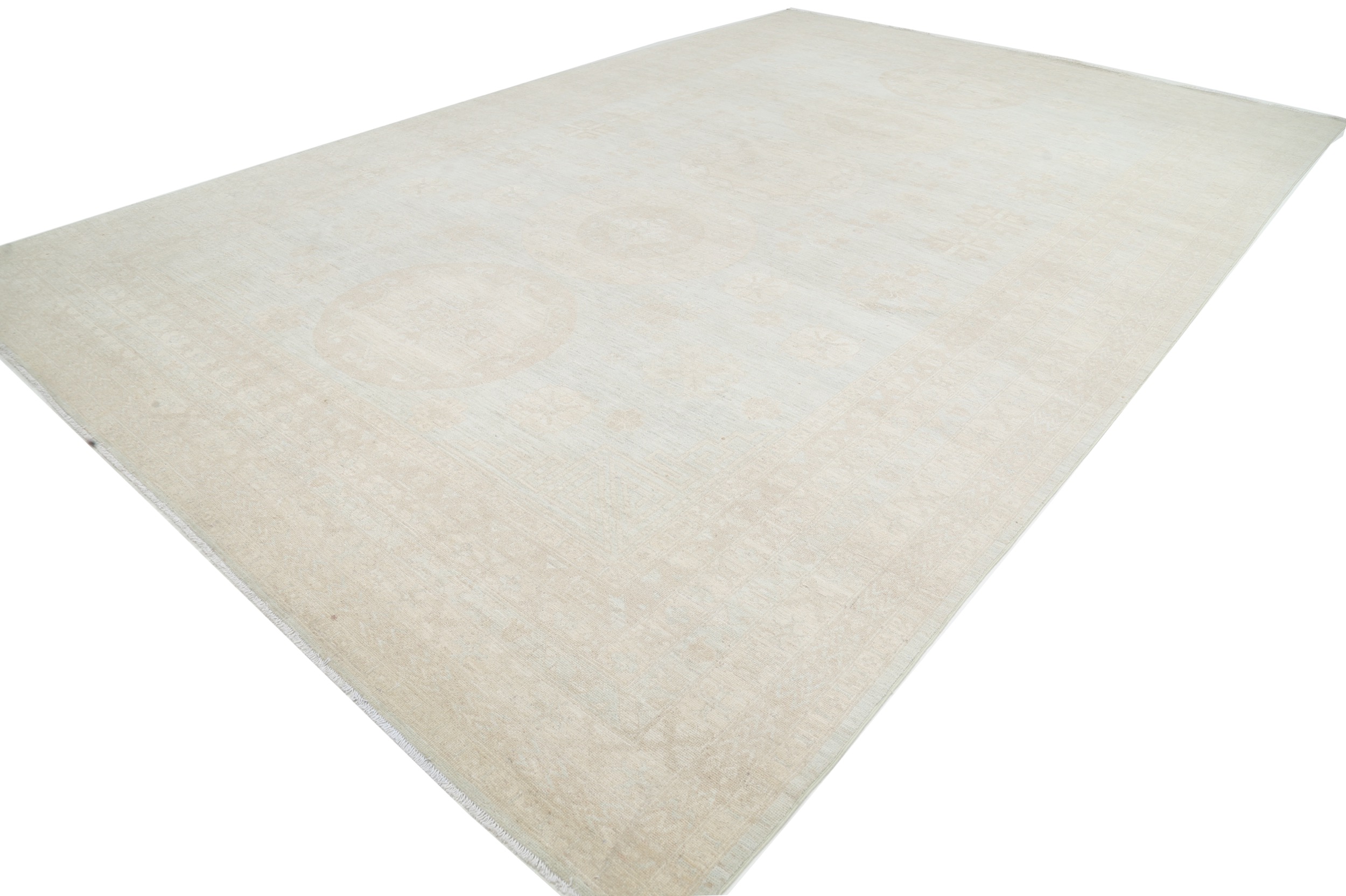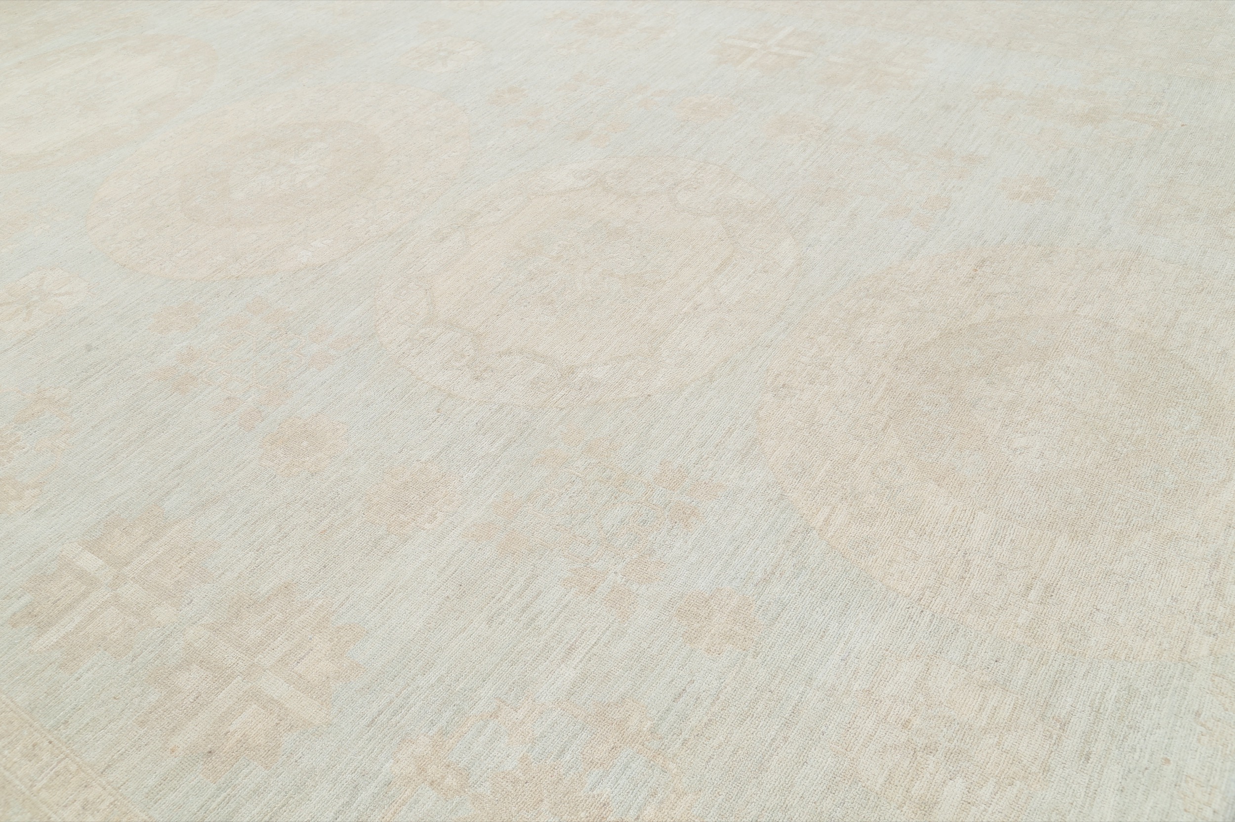 This 11’8″ x 17’11” Oushak rug, hand-knotted in Afghan / Pakistan, features a allover design. It is woven with Approx. 144KPSI, showcasing a field in Blue and a Beige border. The rug has a Medium Pile and a 100% Wool pile, and is in excellent condition.