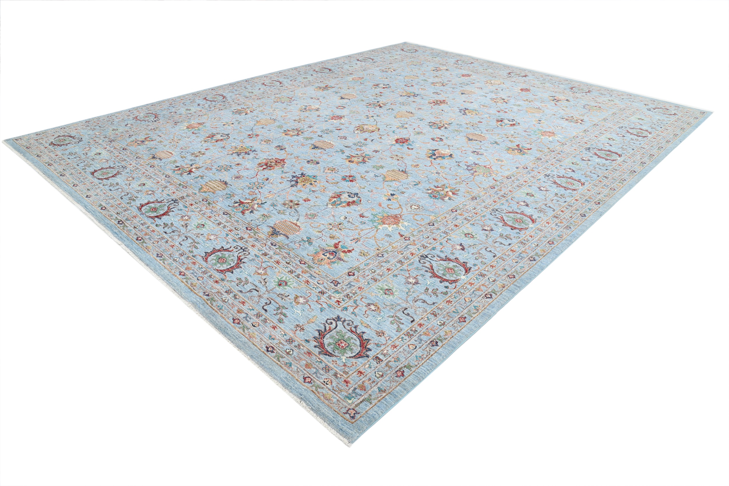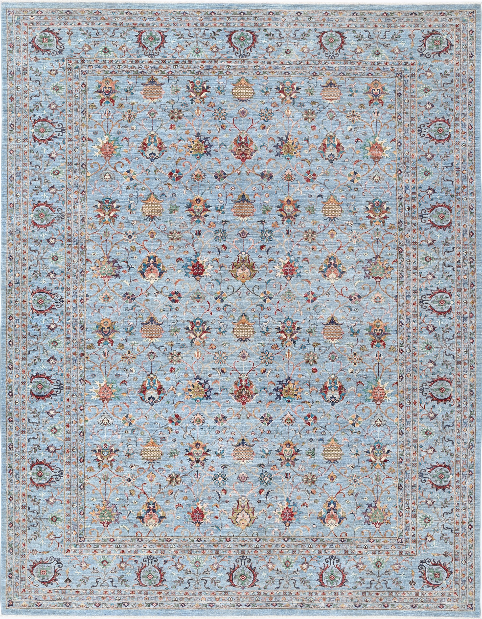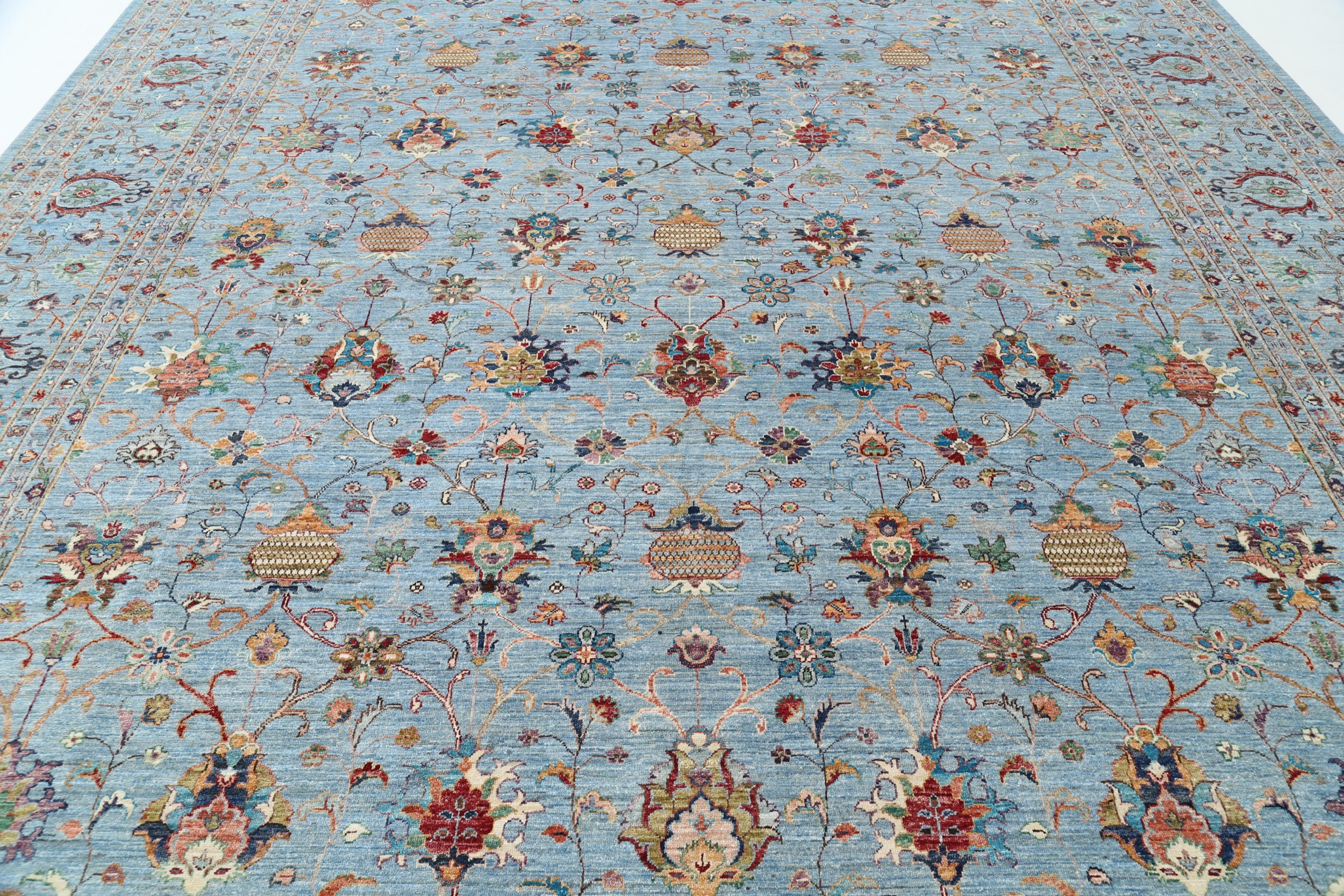 This 11’9″ x 14’10” Oushak rug, hand-knotted in Afghan / Pakistan, features a allover design. It is woven with Approx. 156KPSI, showcasing a field in Blue and a Blue border. The rug has a Medium Pile and a 100% Wool pile, and is in excellent condition.