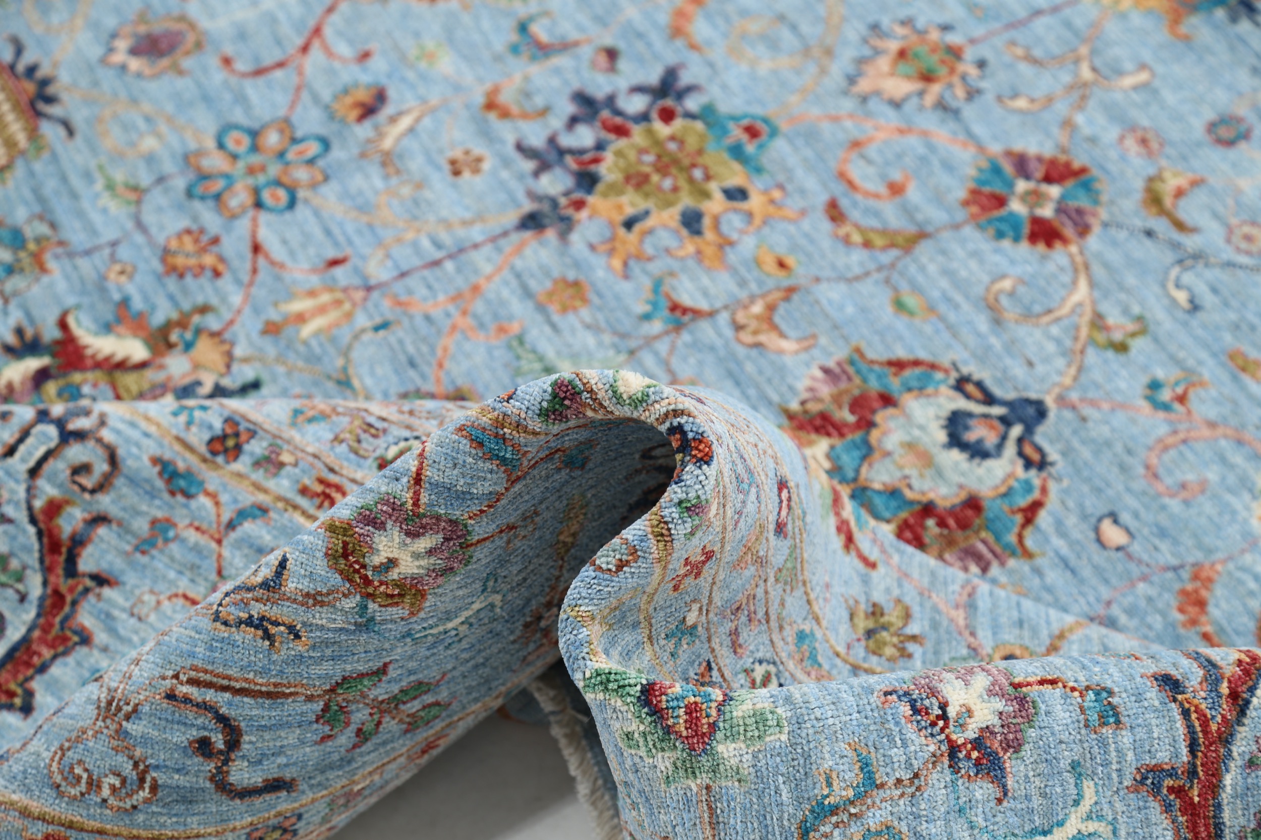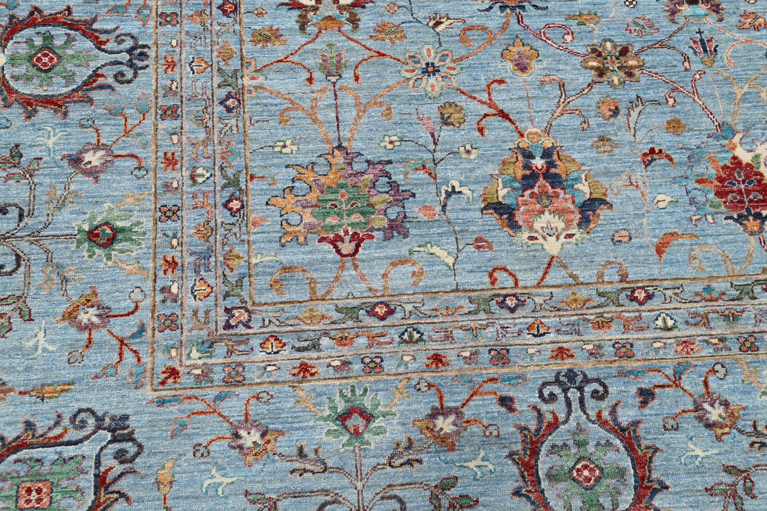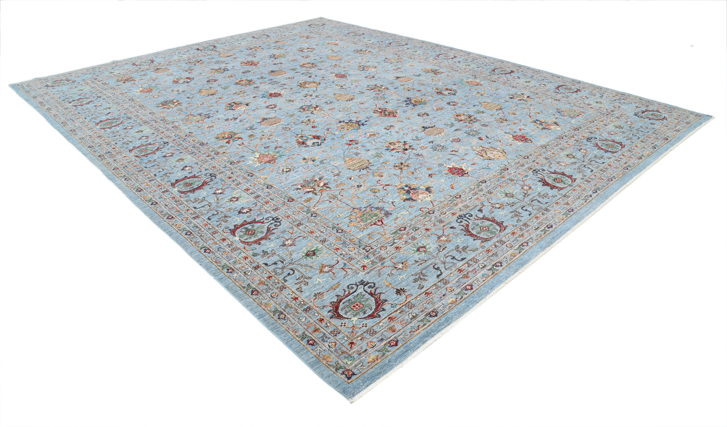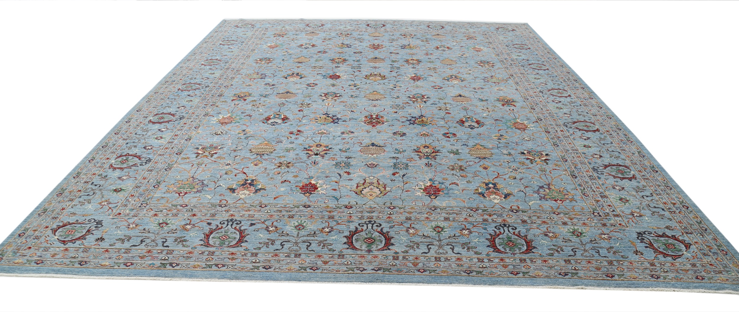 This 11’9″ x 14’10” Oushak rug, hand-knotted in Afghan / Pakistan, features a allover design. It is woven with Approx. 156KPSI, showcasing a field in Blue and a Blue border. The rug has a Medium Pile and a 100% Wool pile, and is in excellent condition.