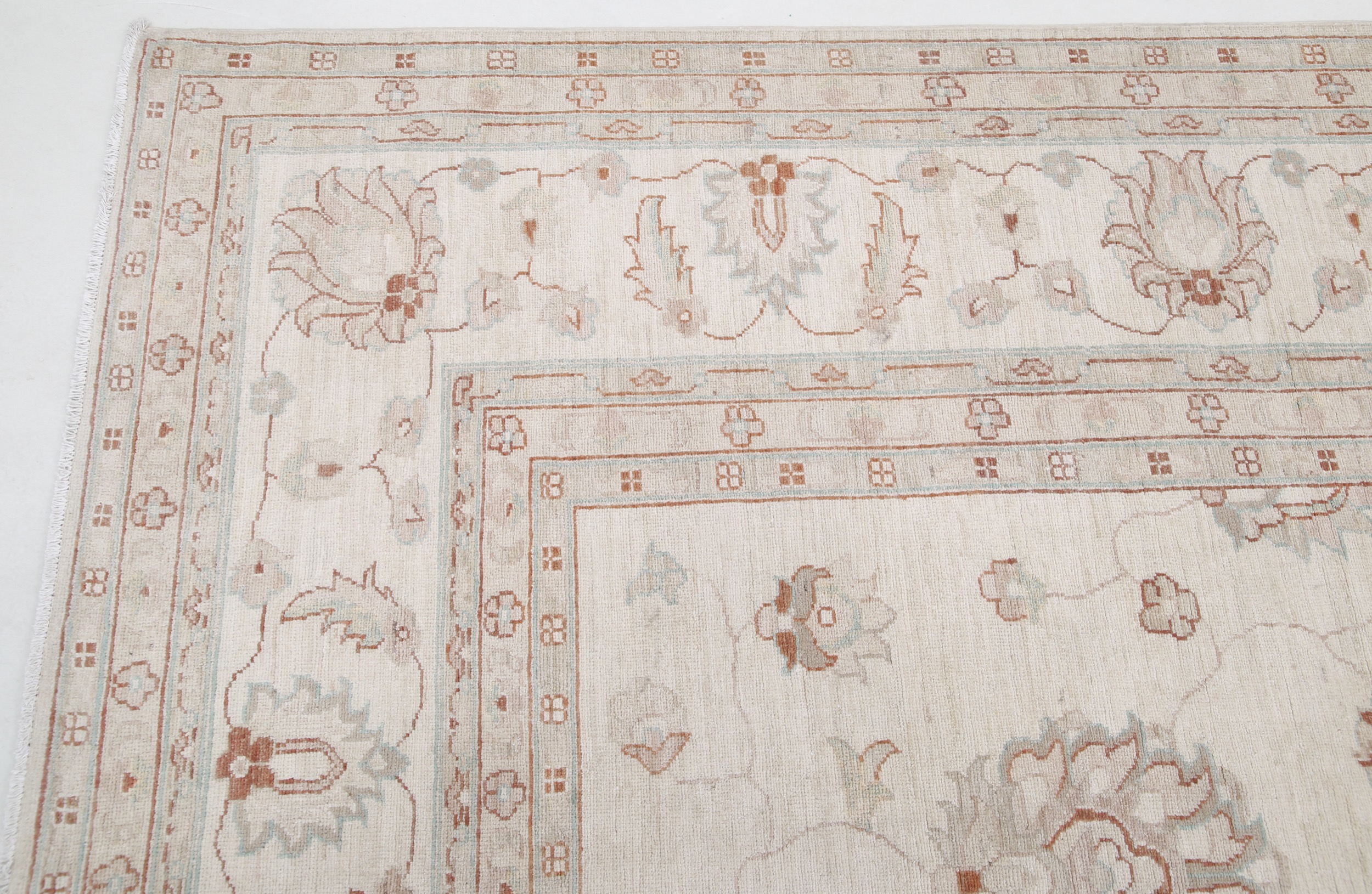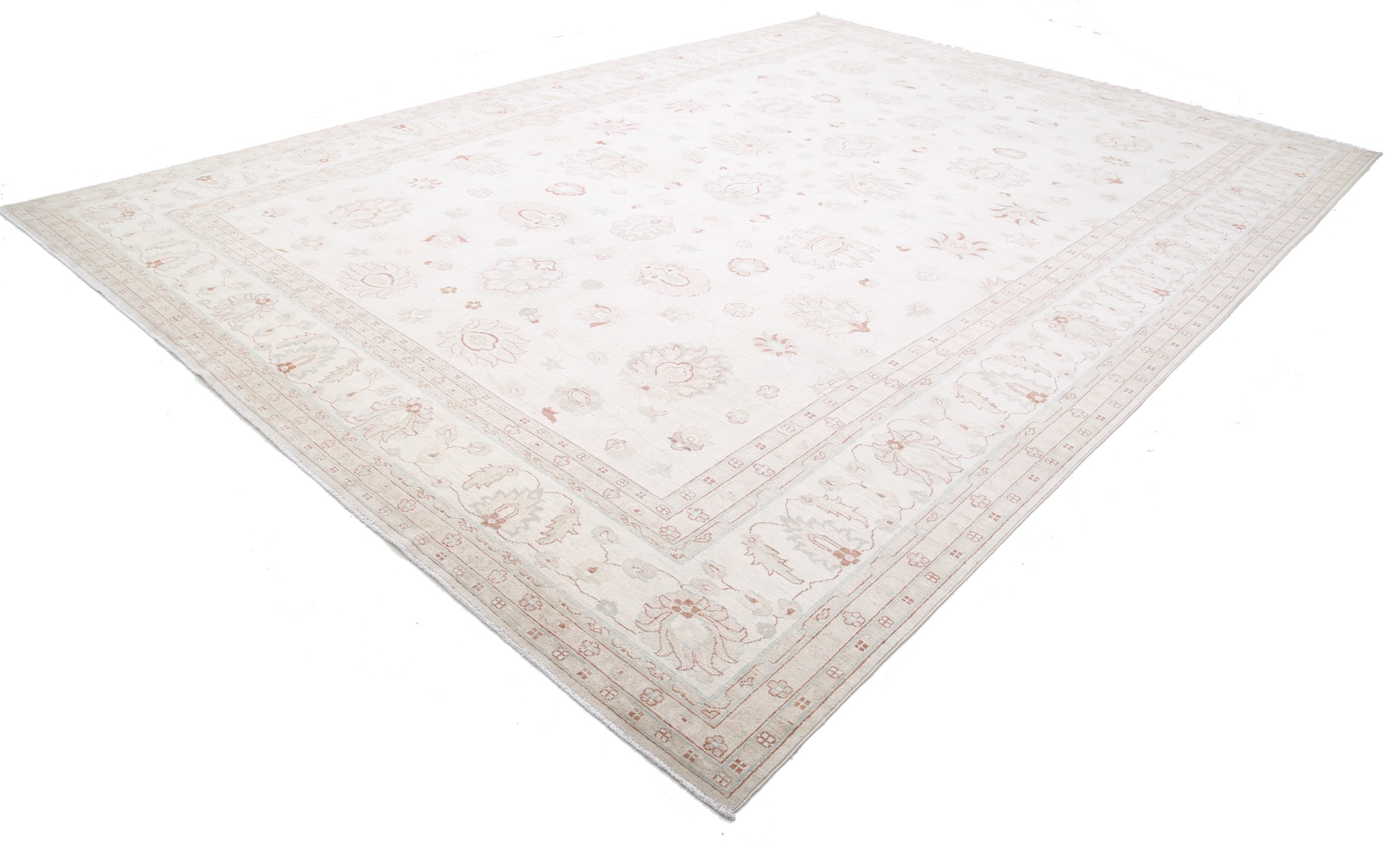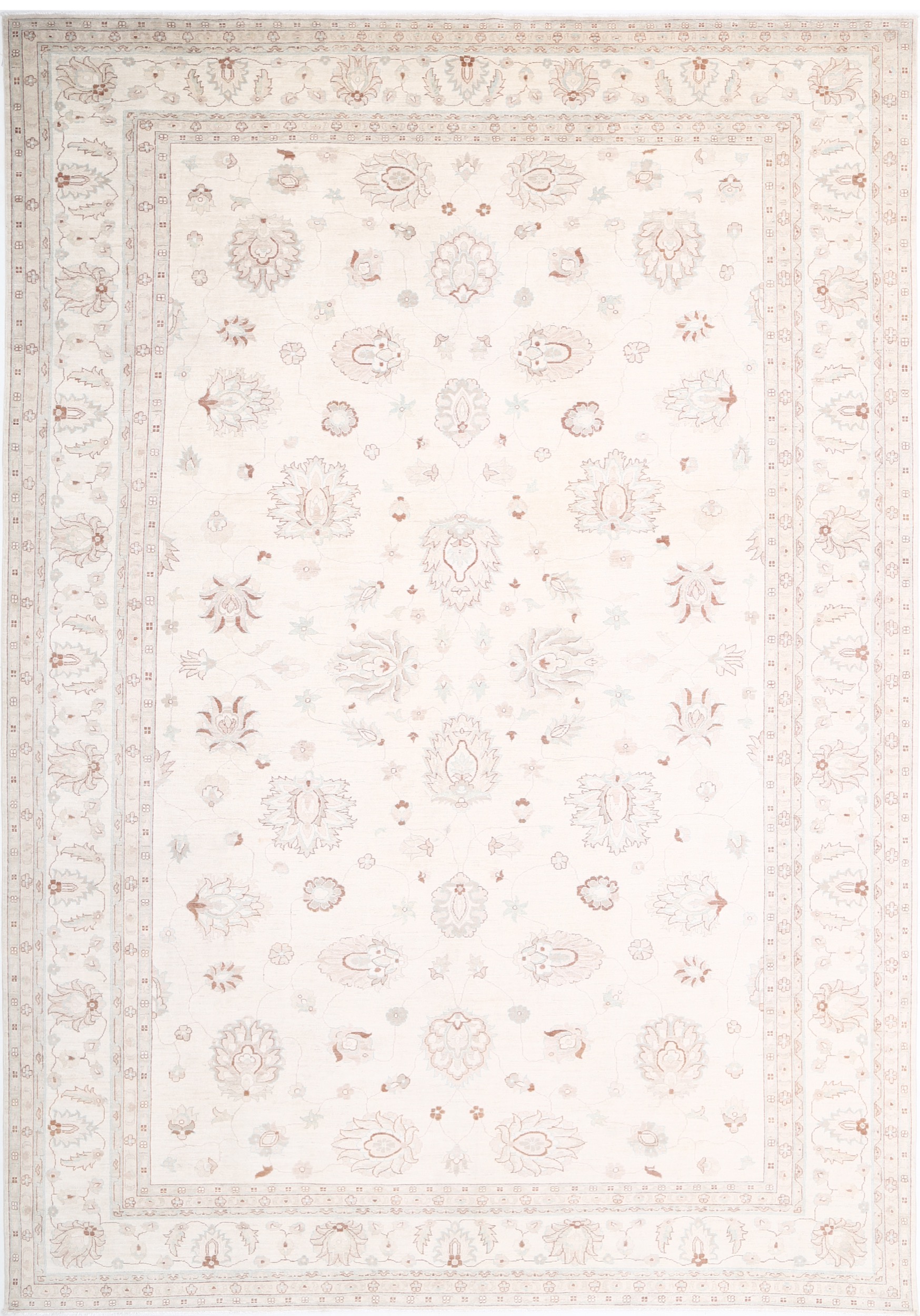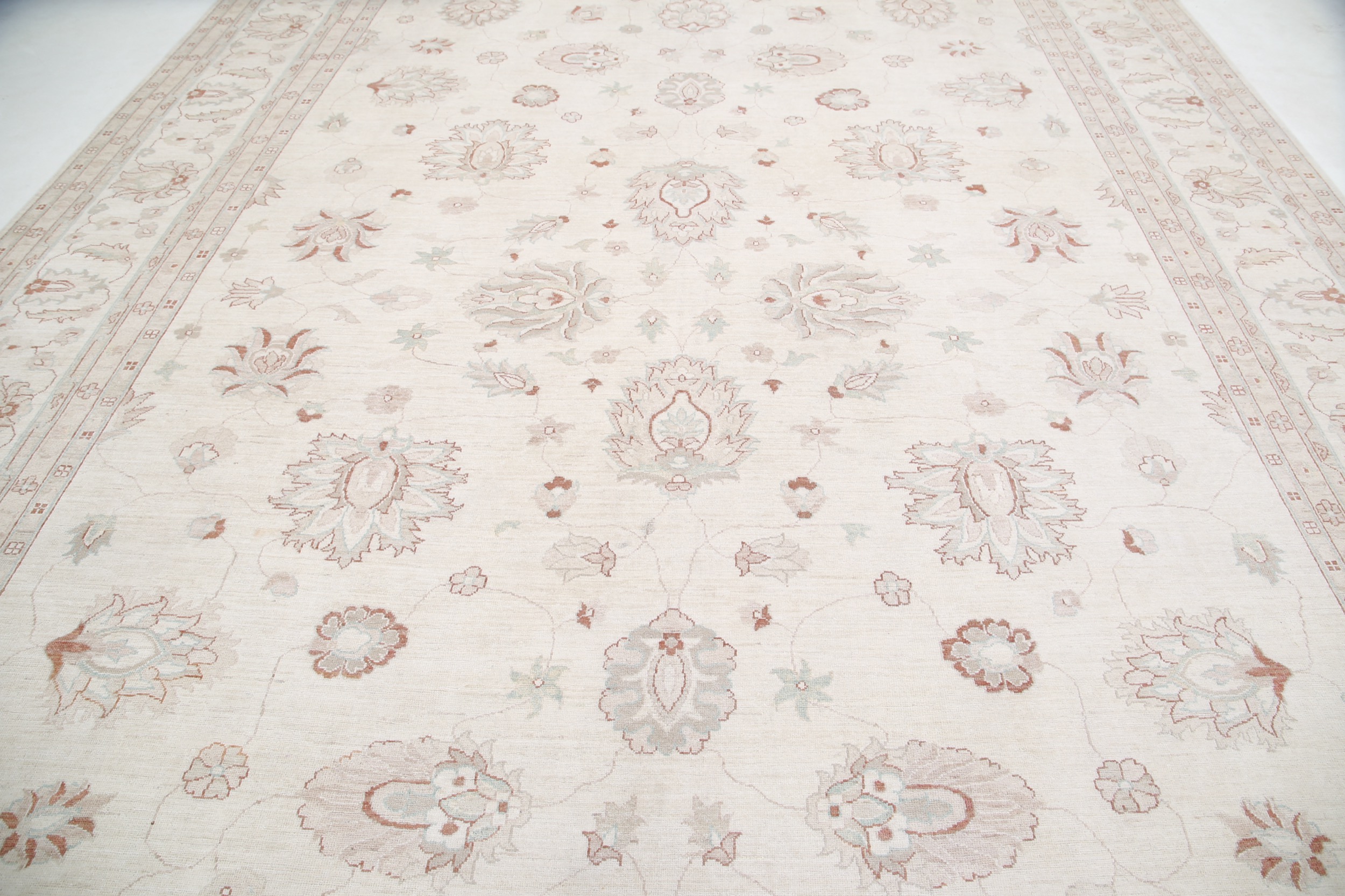 This 11’9″ x 16’10” Oushak rug, hand-knotted in Afghan / Pakistan, features a allover design. It is woven with Approx. 156KPSI, showcasing a field in Beige and a Beige border. The rug has a Medium Pile and a 100% Wool pile, and is in excellent condition.