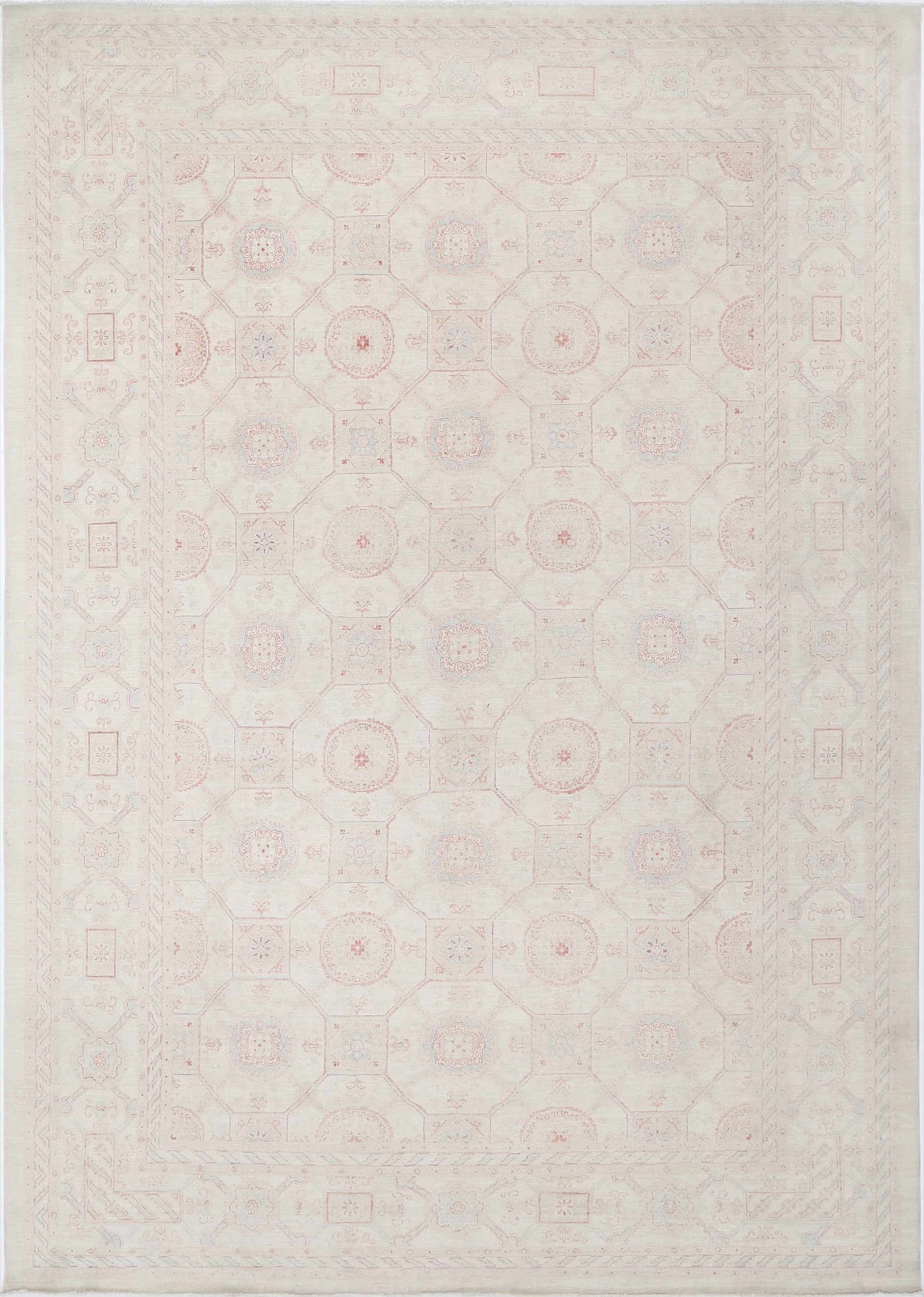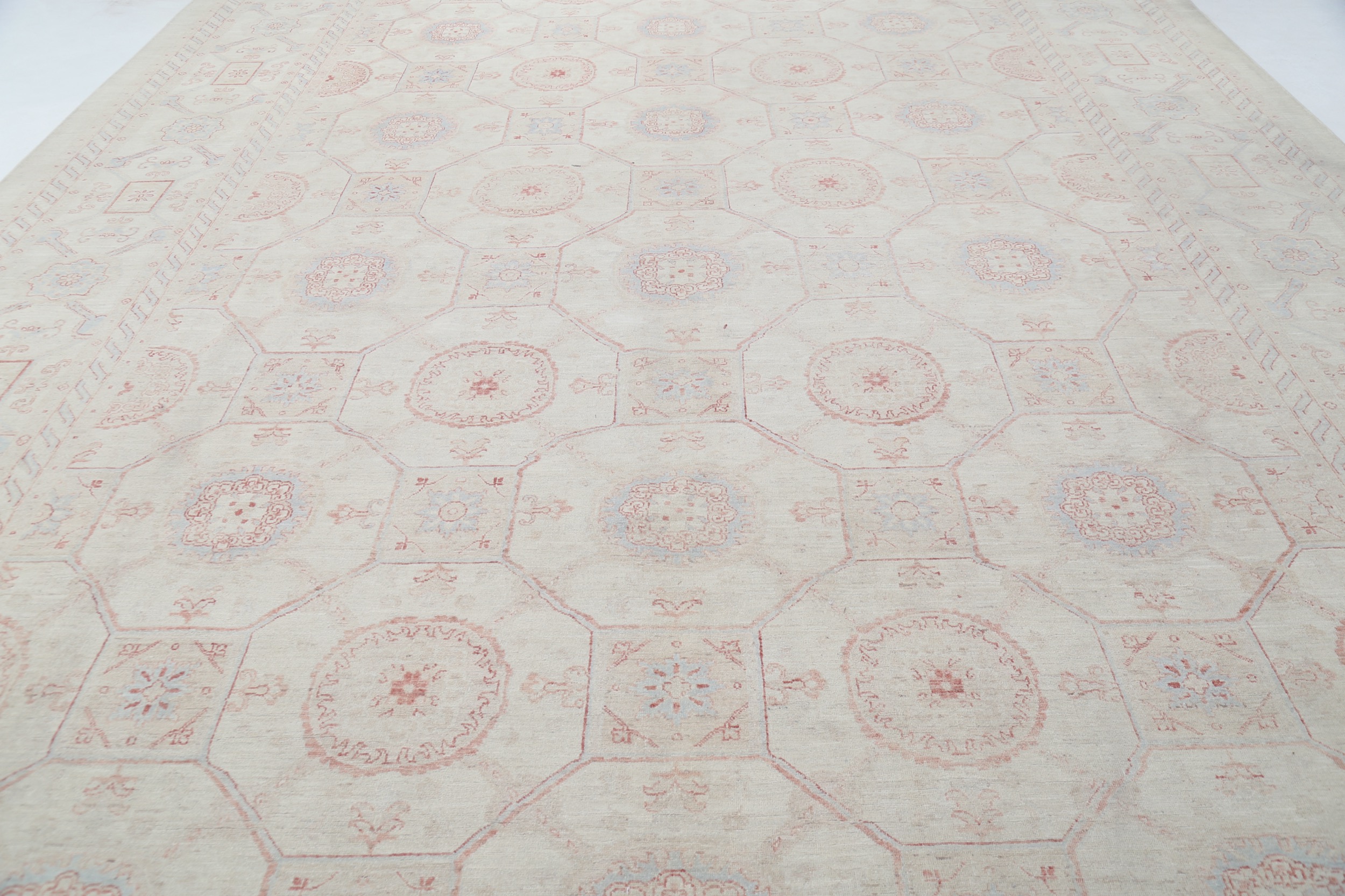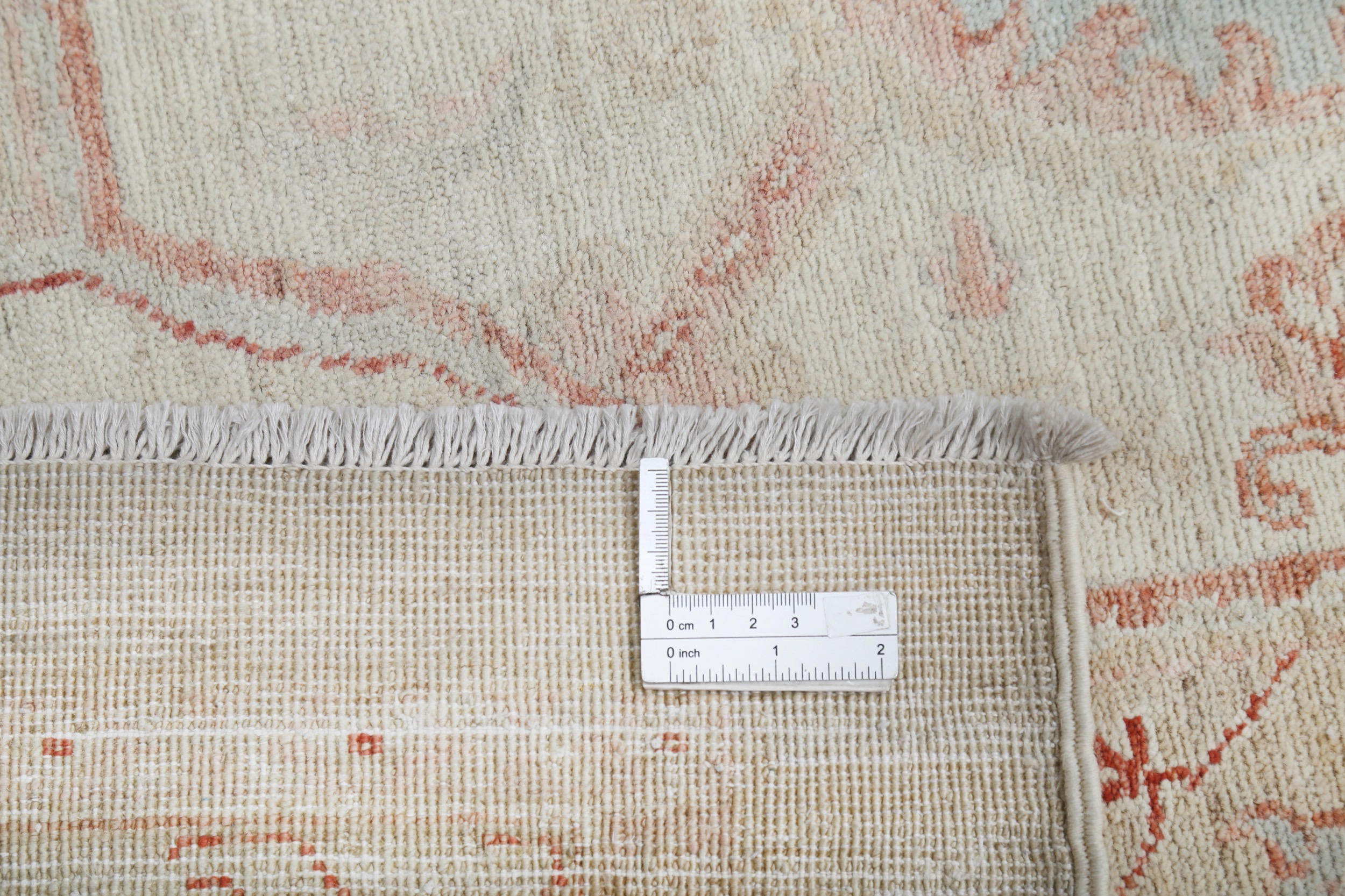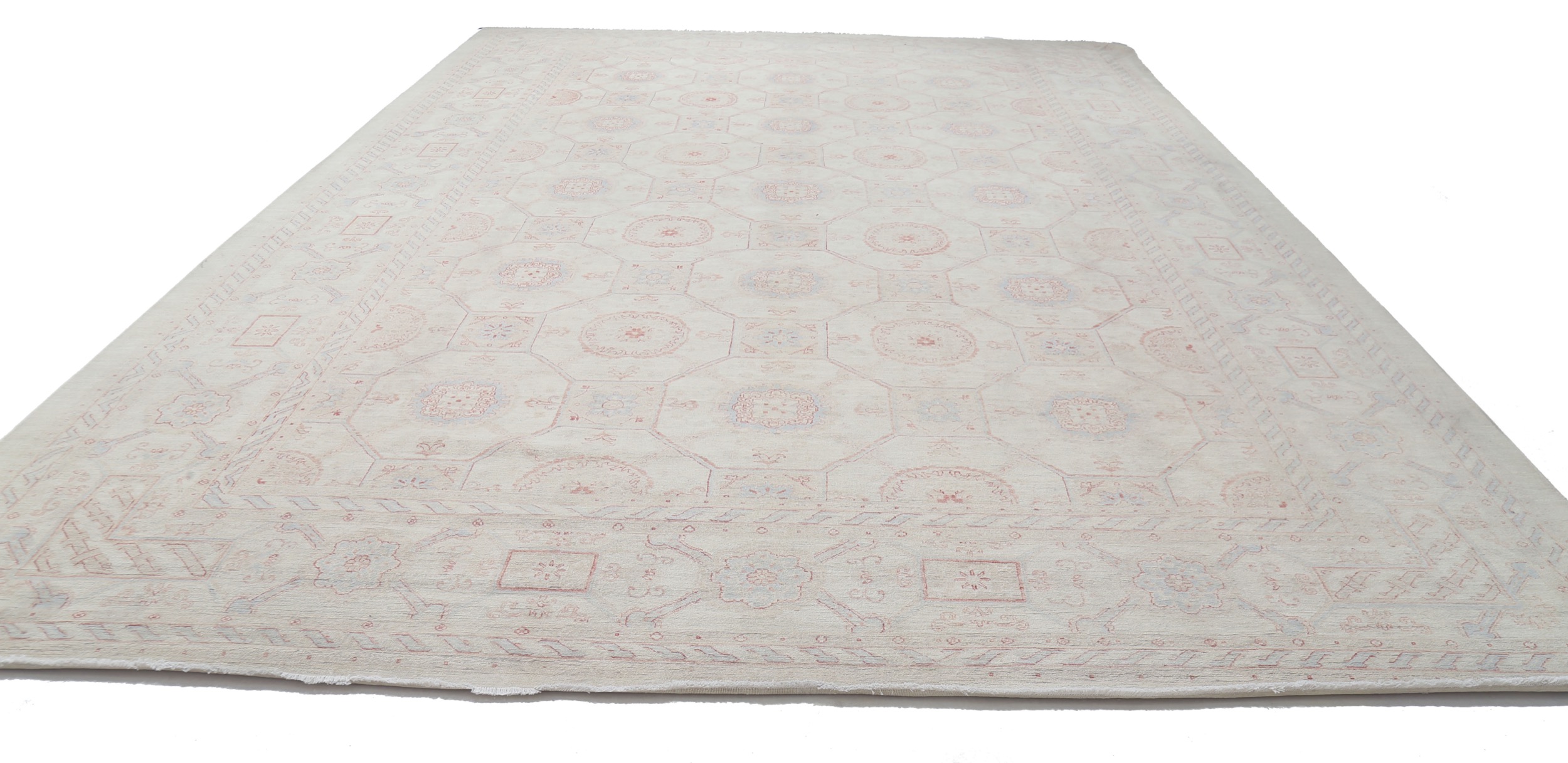 This 12’0″ x 17’3″ Oushak rug, hand-knotted in Afghan / Pakistan, features a allover design. It is woven with Approx. 169KPSI, showcasing a field in Beige and a Blue border. The rug has a Medium Pile and a 100% Wool pile, and is in excellent condition.