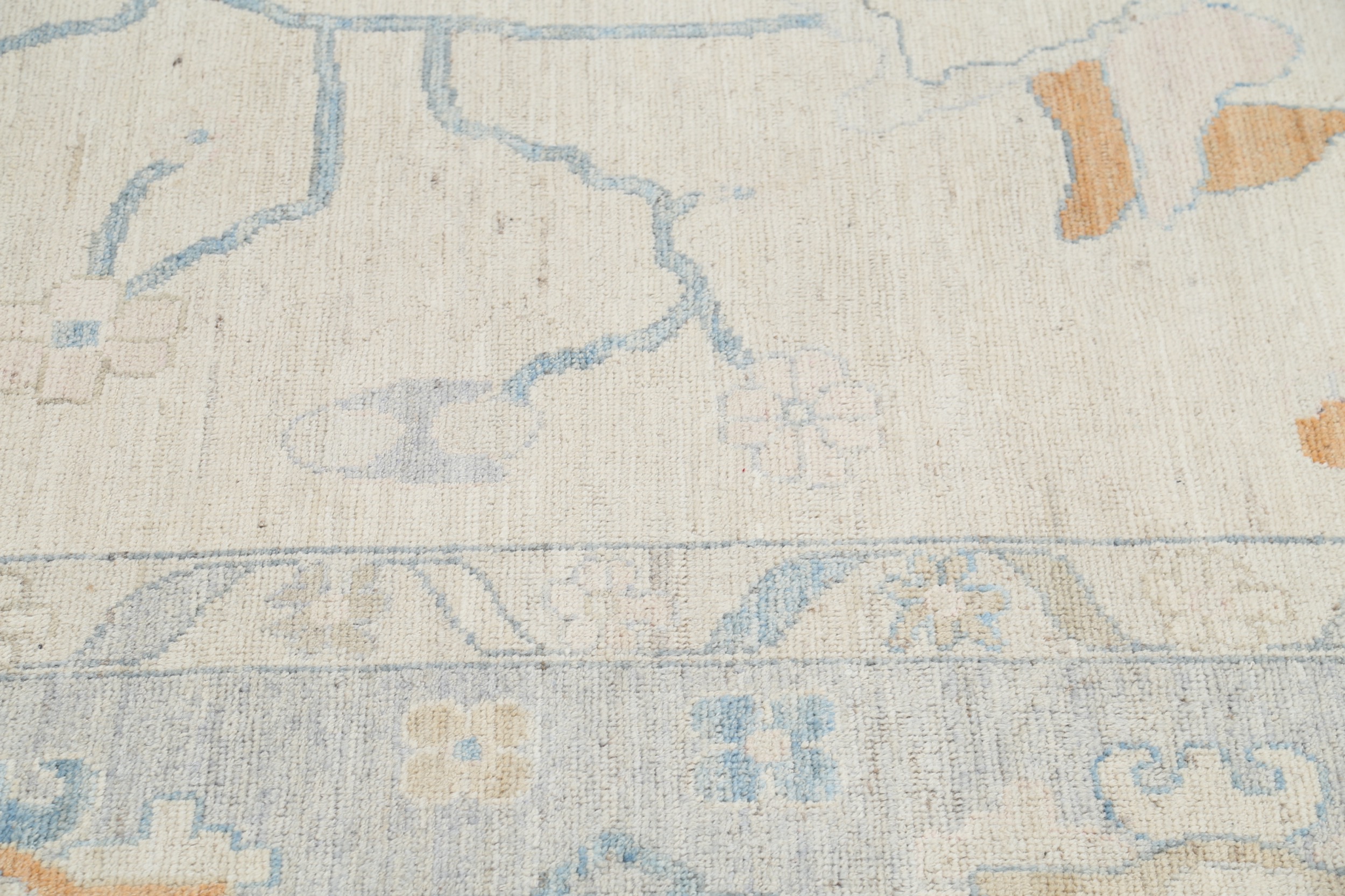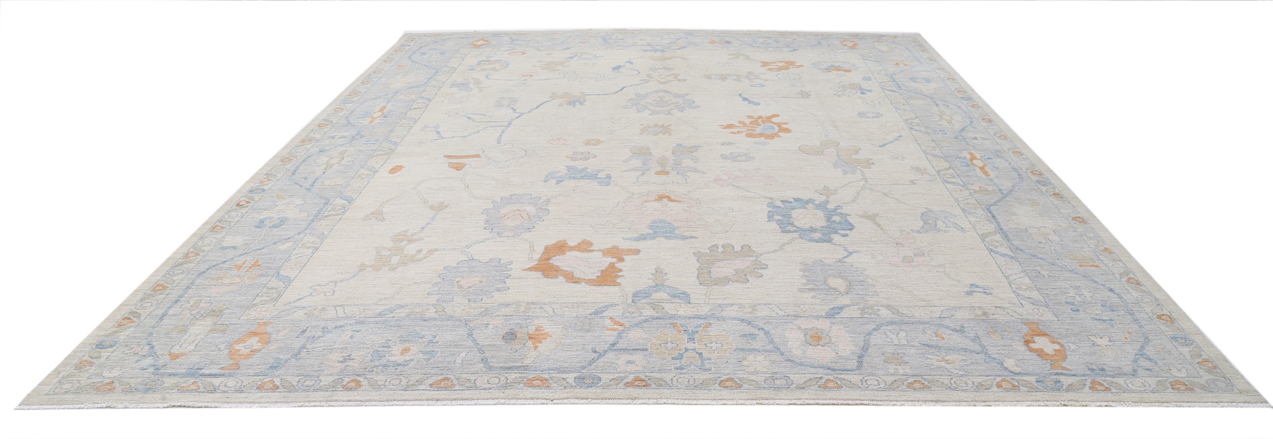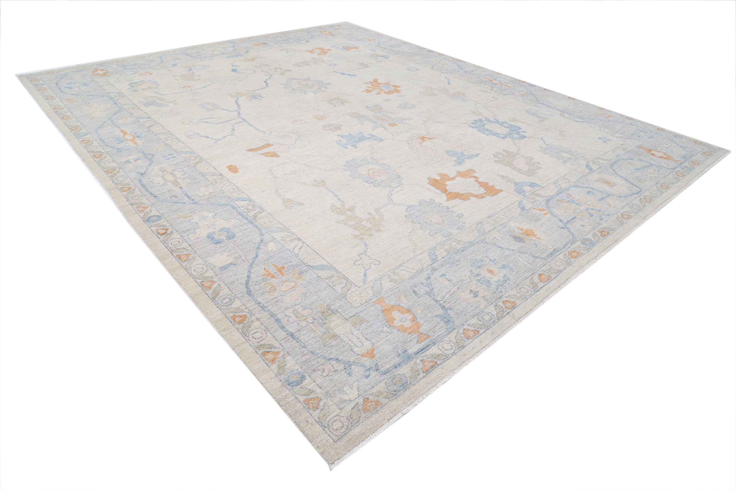 This 12’1″ x 14’6″ Oushak rug, hand-knotted in Afghan / Pakistan, features a allover design. It is woven with Approx. 144KPSI, showcasing a field in Beige and a Grey border. The rug has a Medium Pile and a 100% Wool pile, and is in excellent condition.