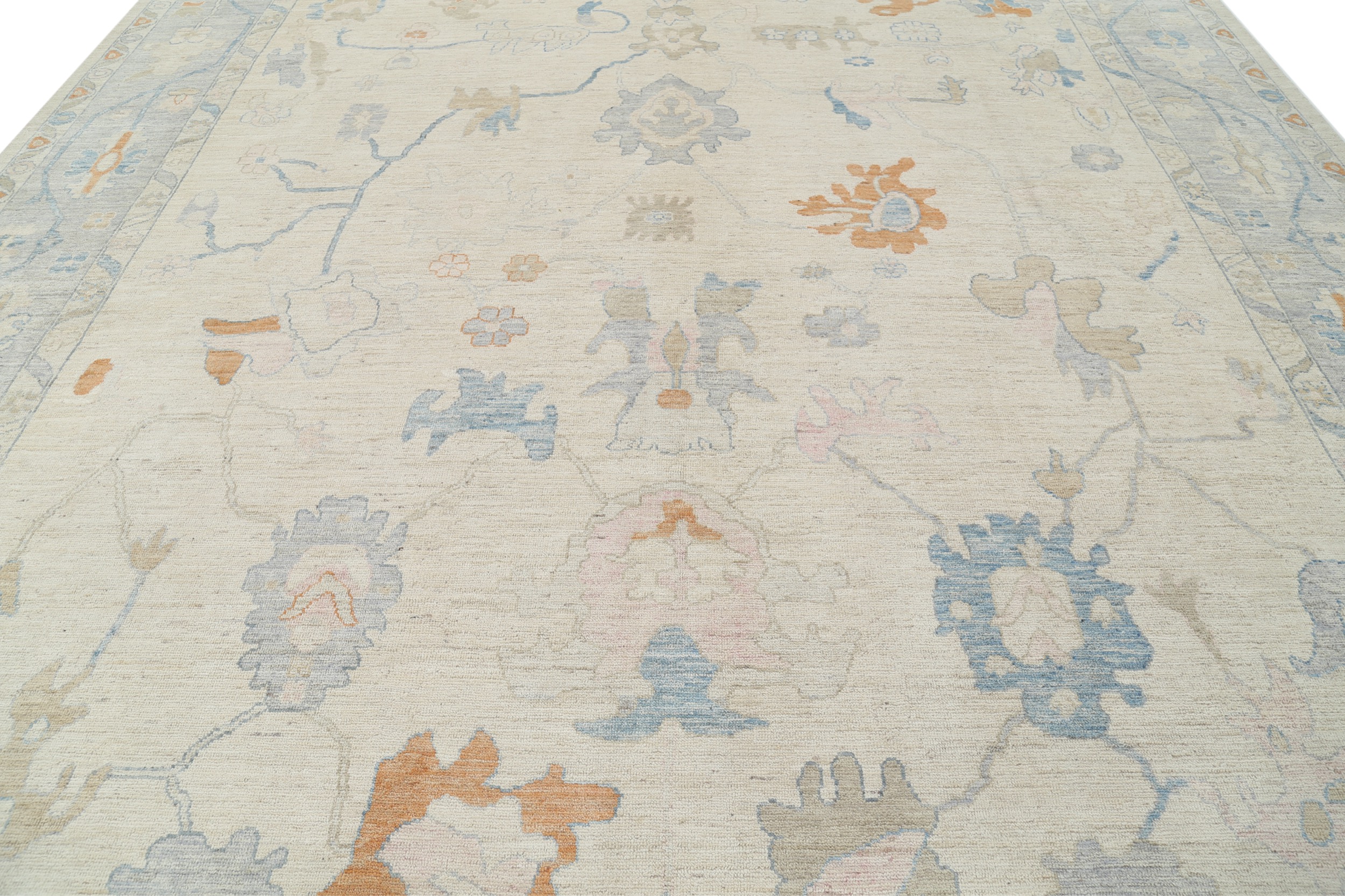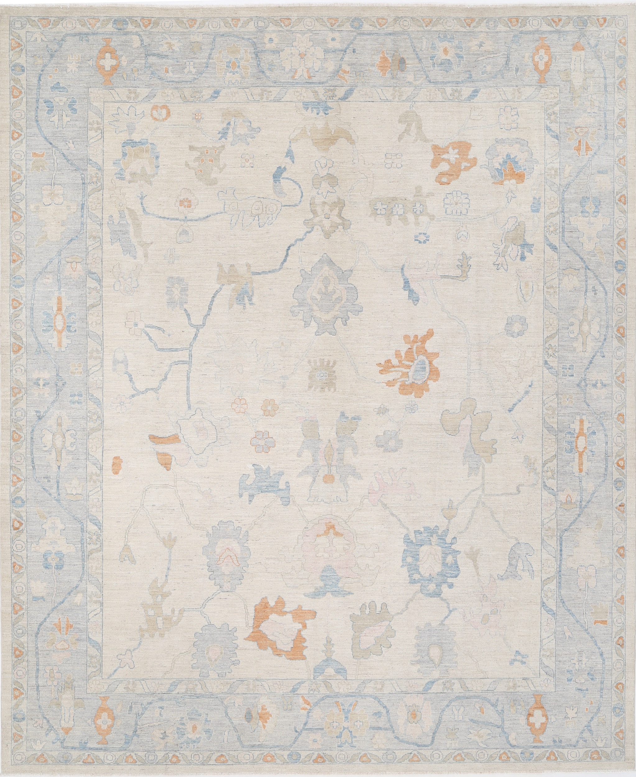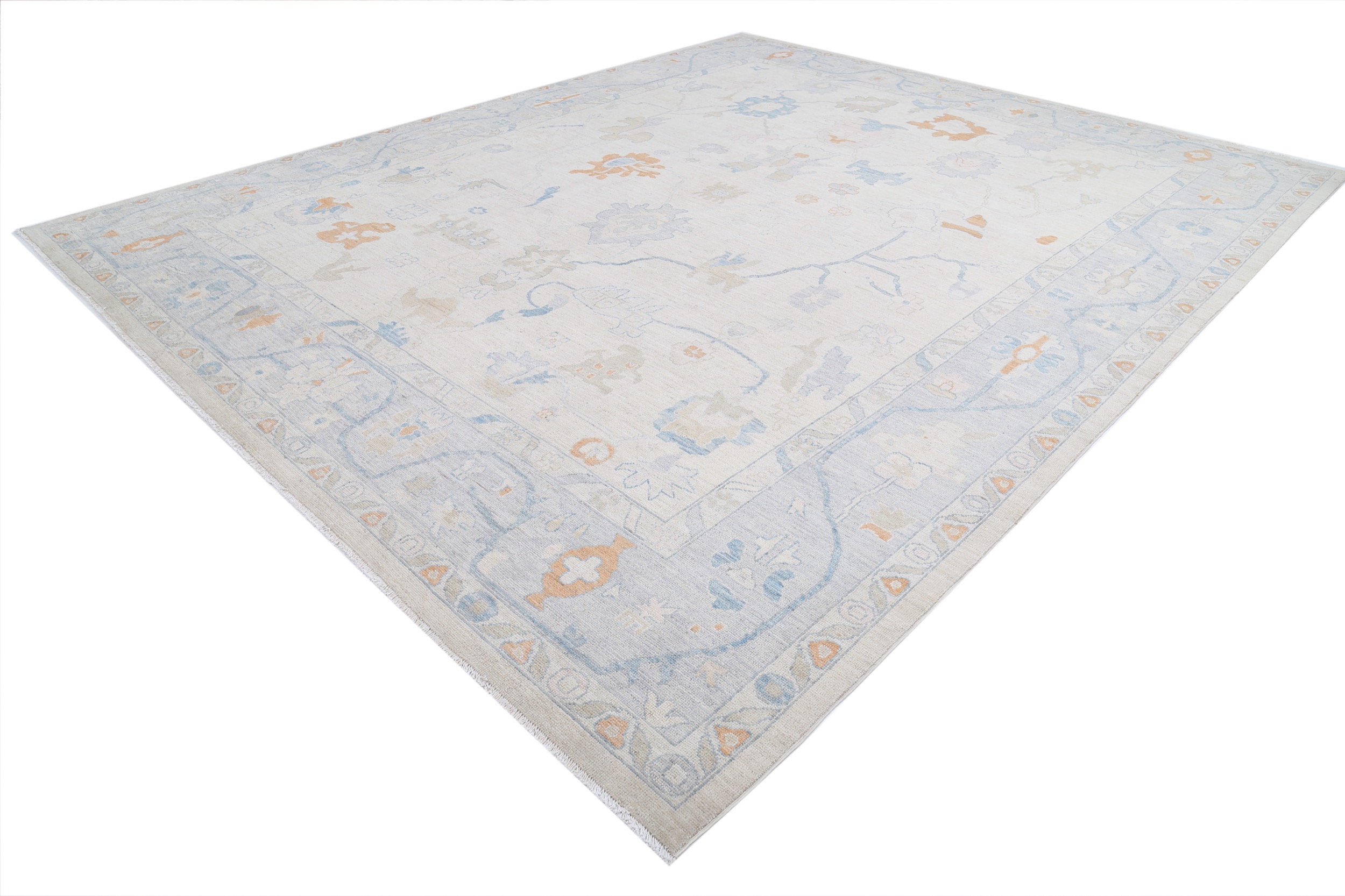This 12’1″ x 14’6″ Oushak rug, hand-knotted in Afghan / Pakistan, features a allover design. It is woven with Approx. 144KPSI, showcasing a field in Beige and a Grey border. The rug has a Medium Pile and a 100% Wool pile, and is in excellent condition.