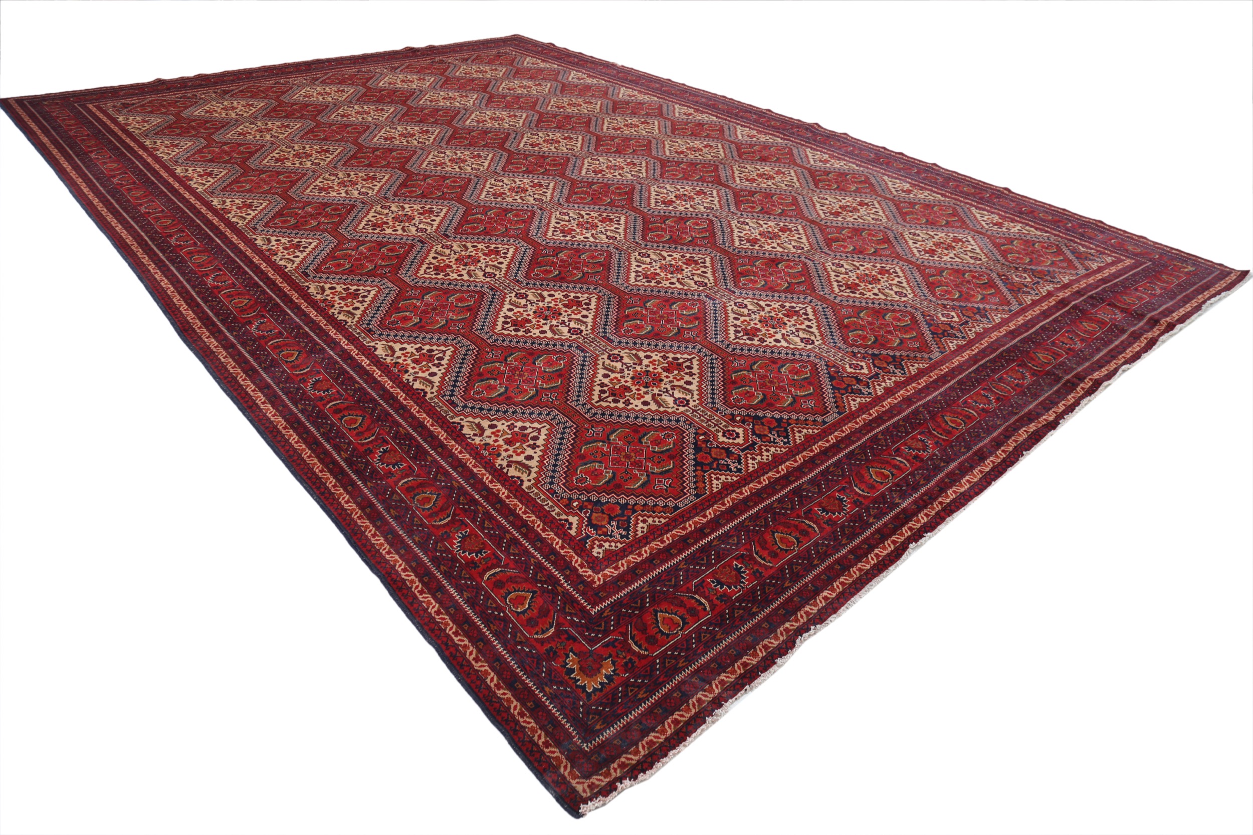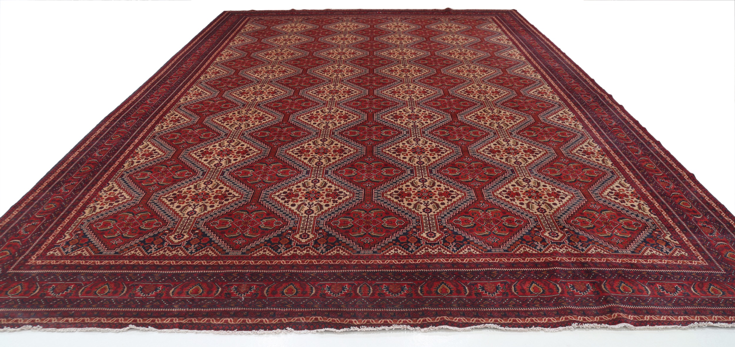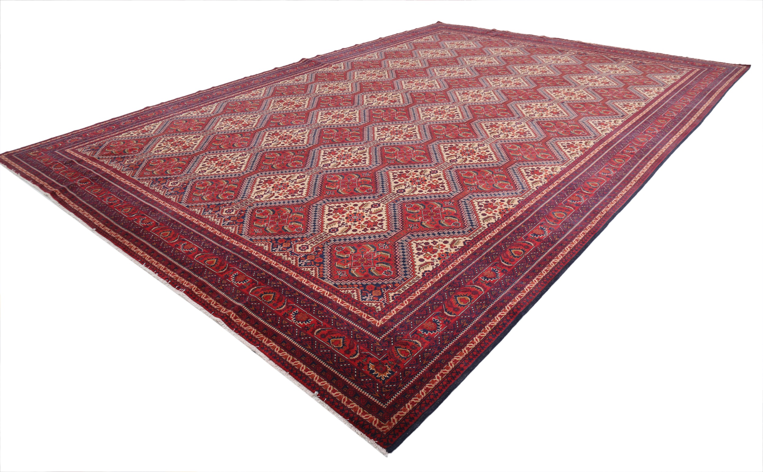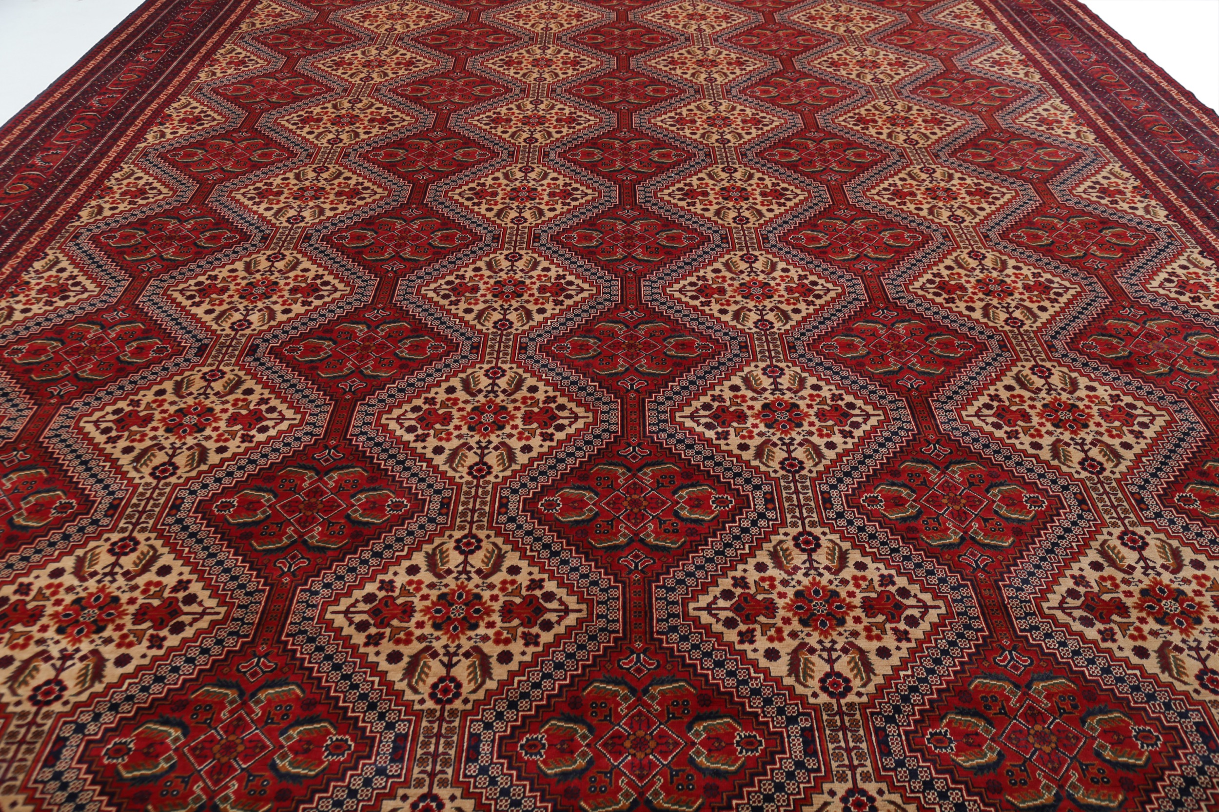 This 12’10” x 18’8″ Khal Mohammadi rug, hand-knotted in Afghan, features a allover design. It is woven with Approx. 156KPSI, showcasing a field in Red and a Beige border. The rug has a Medium Pile and a 100% Wool pile, and is in excellent condition.
