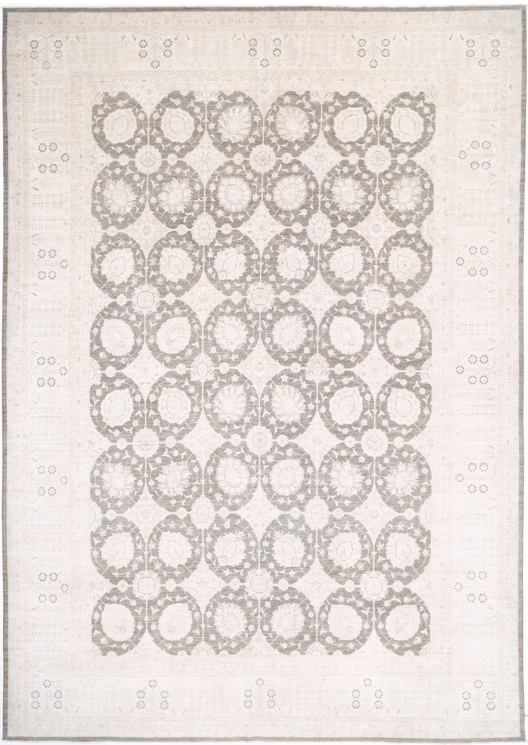 This 12’3″ x 17’8″ Oushak rug, hand-knotted in Afghan / Pakistan, features a allover design. It is woven with Approx. 156KPSI, showcasing a field in Brown and a Beige border. The rug has a Medium Pile and a 100% Wool pile, and is in excellent condition.