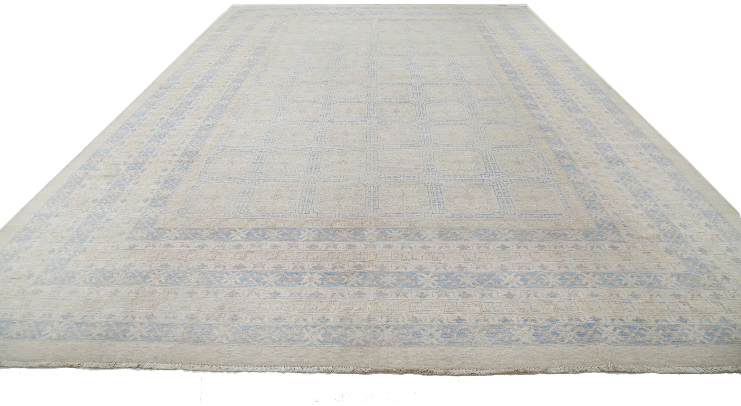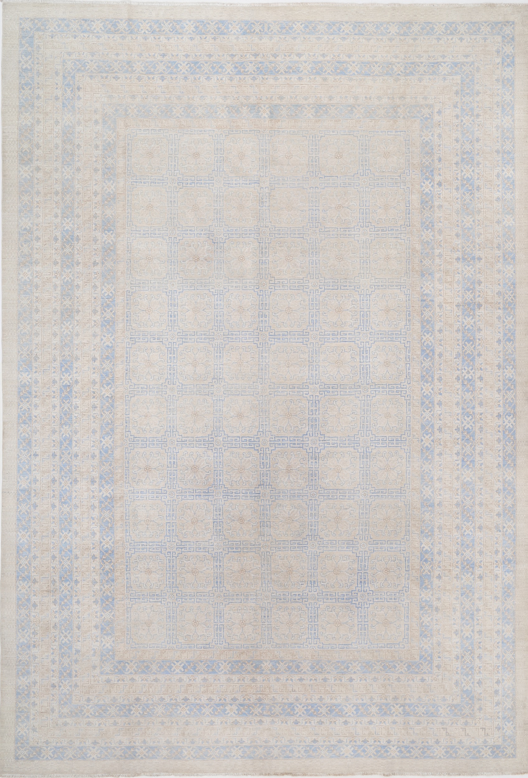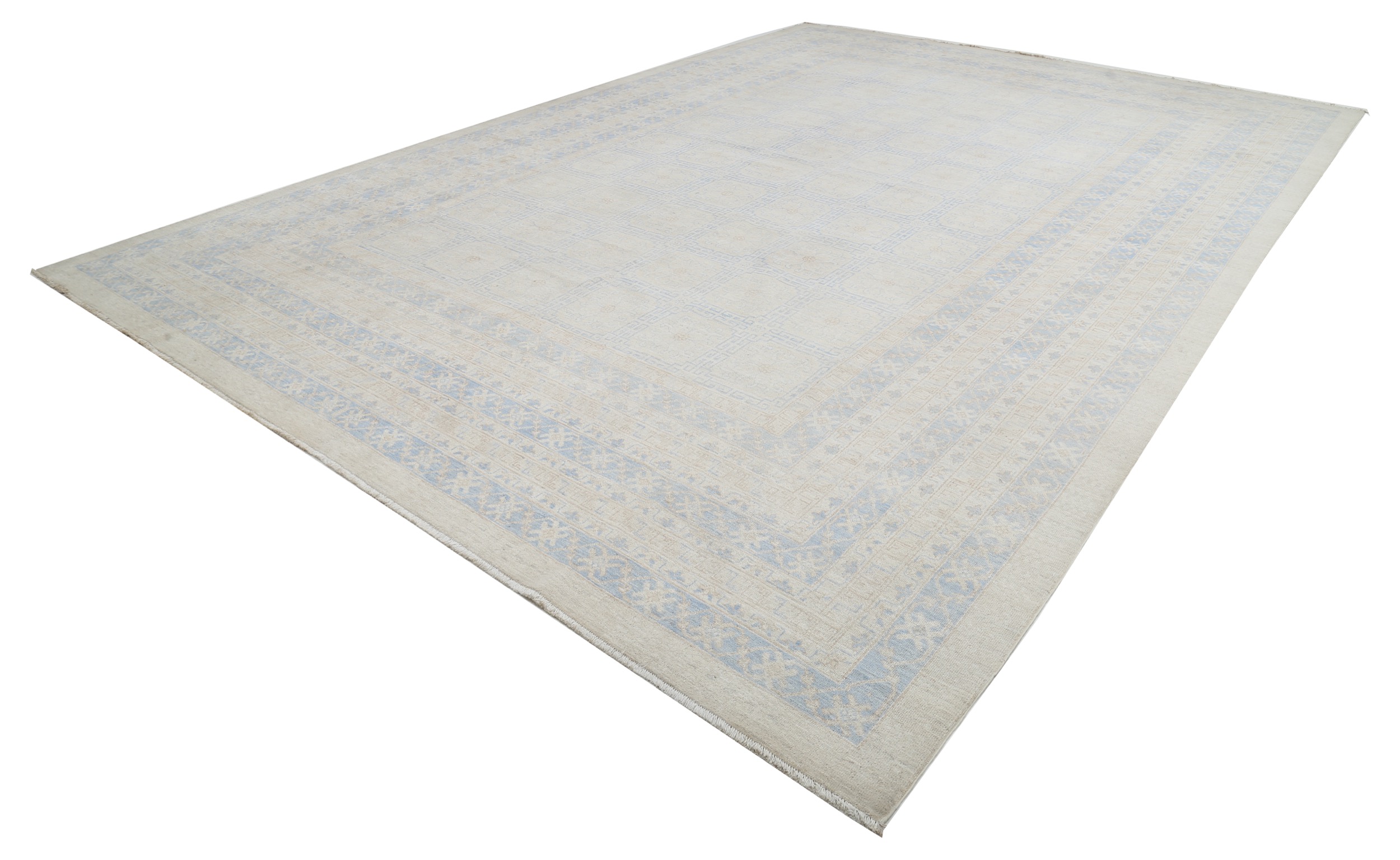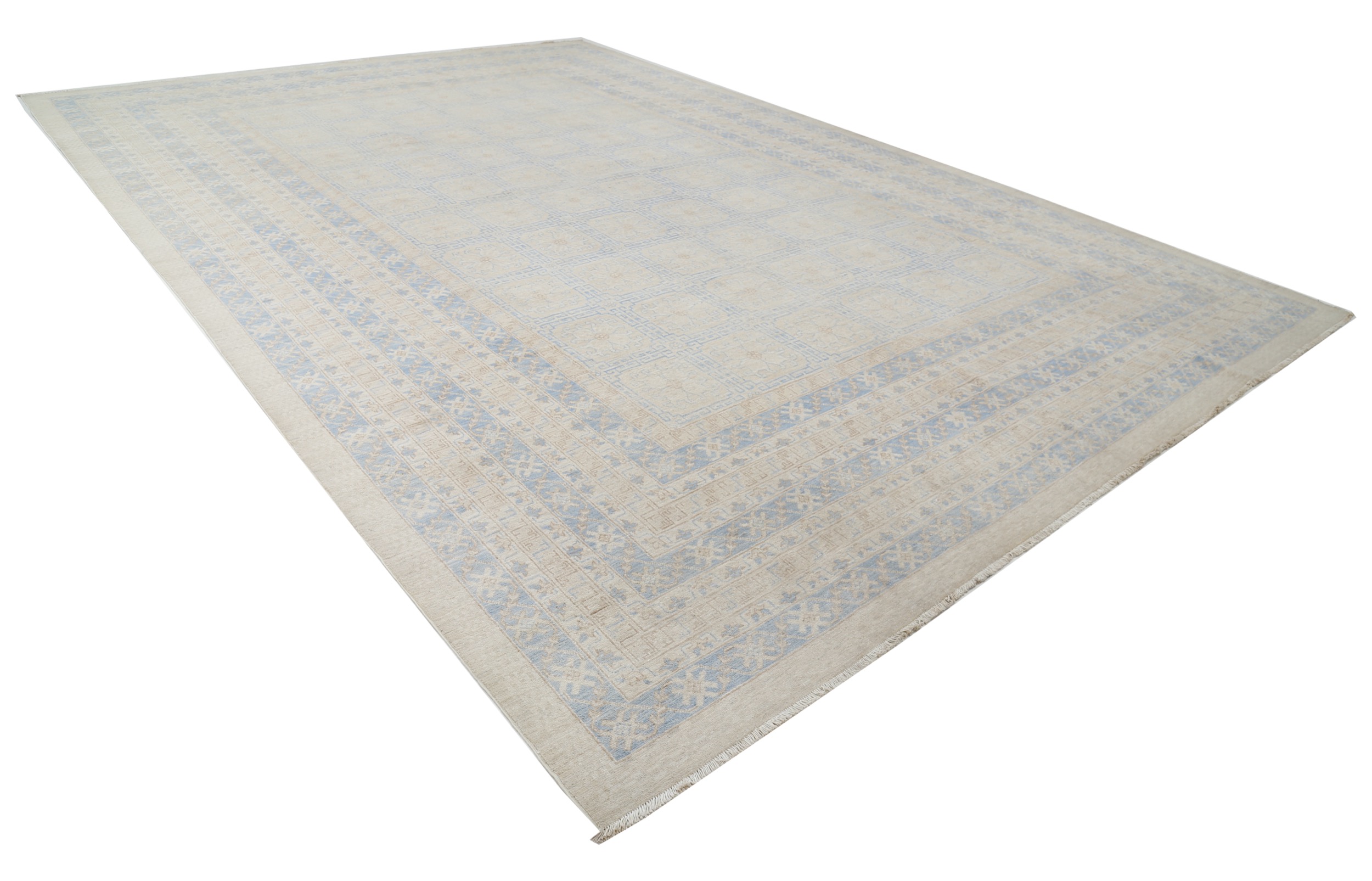 This 12’3″ x 17’9″ Oushak rug, hand-knotted in Afghan / Pakistan, features a allover design. It is woven with Approx. 144KPSI, showcasing a field in Silver and a Blue border. The rug has a Medium Pile and a 100% Wool pile, and is in excellent condition.