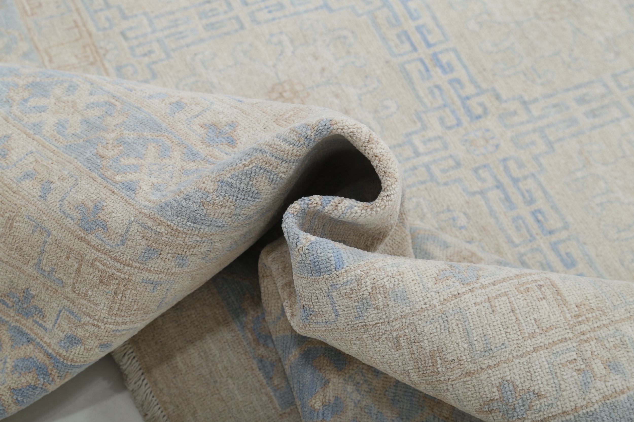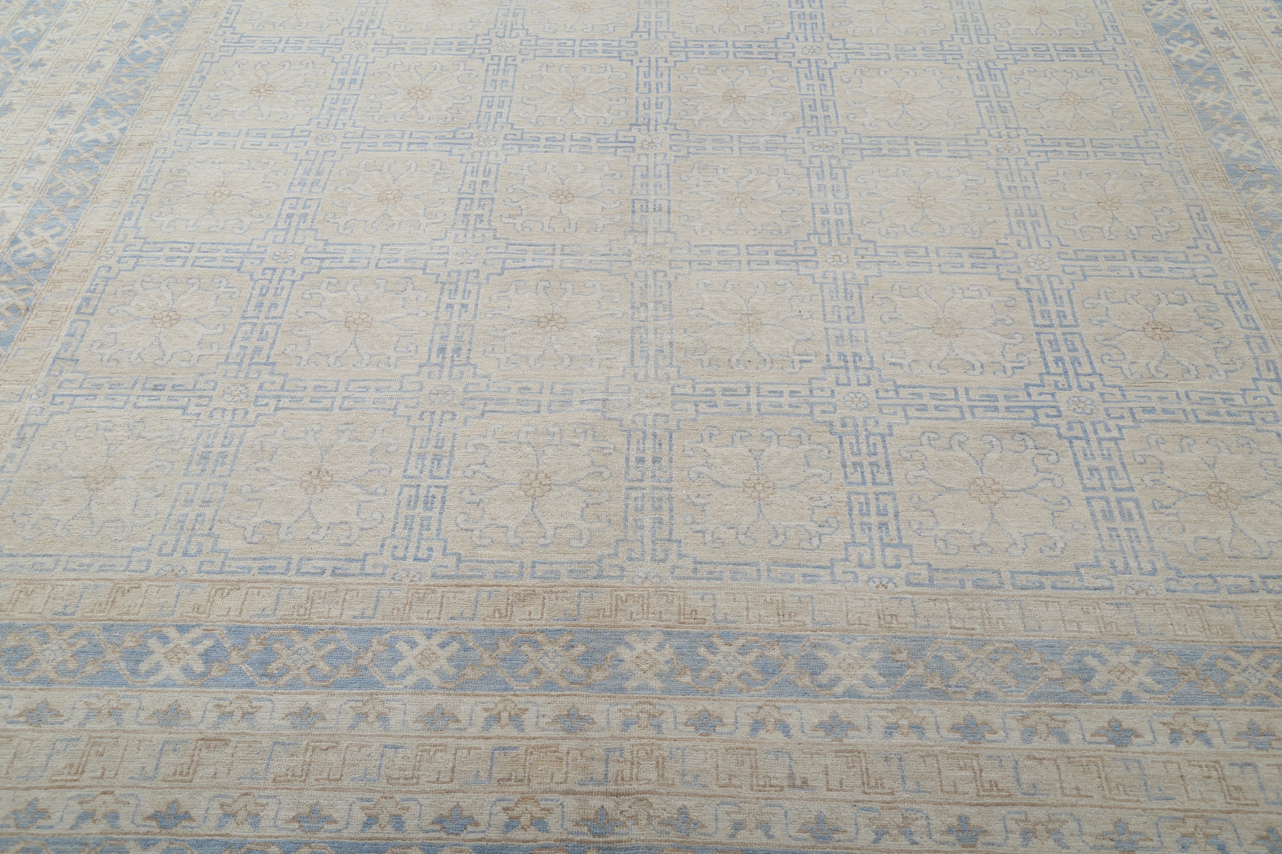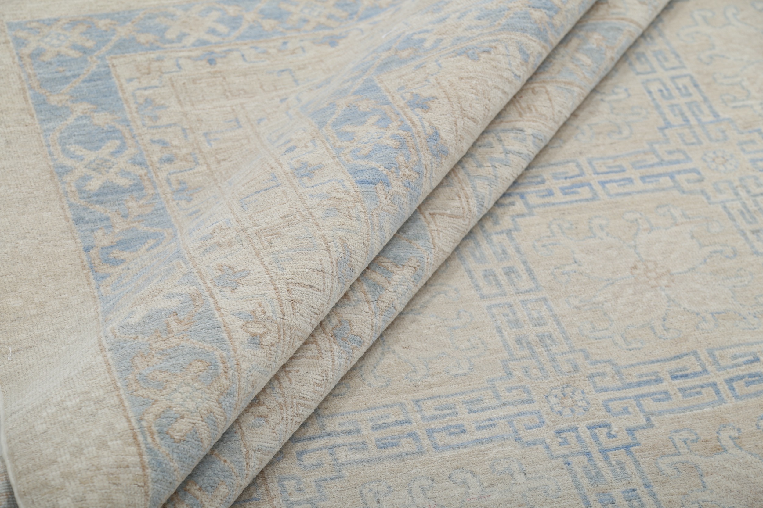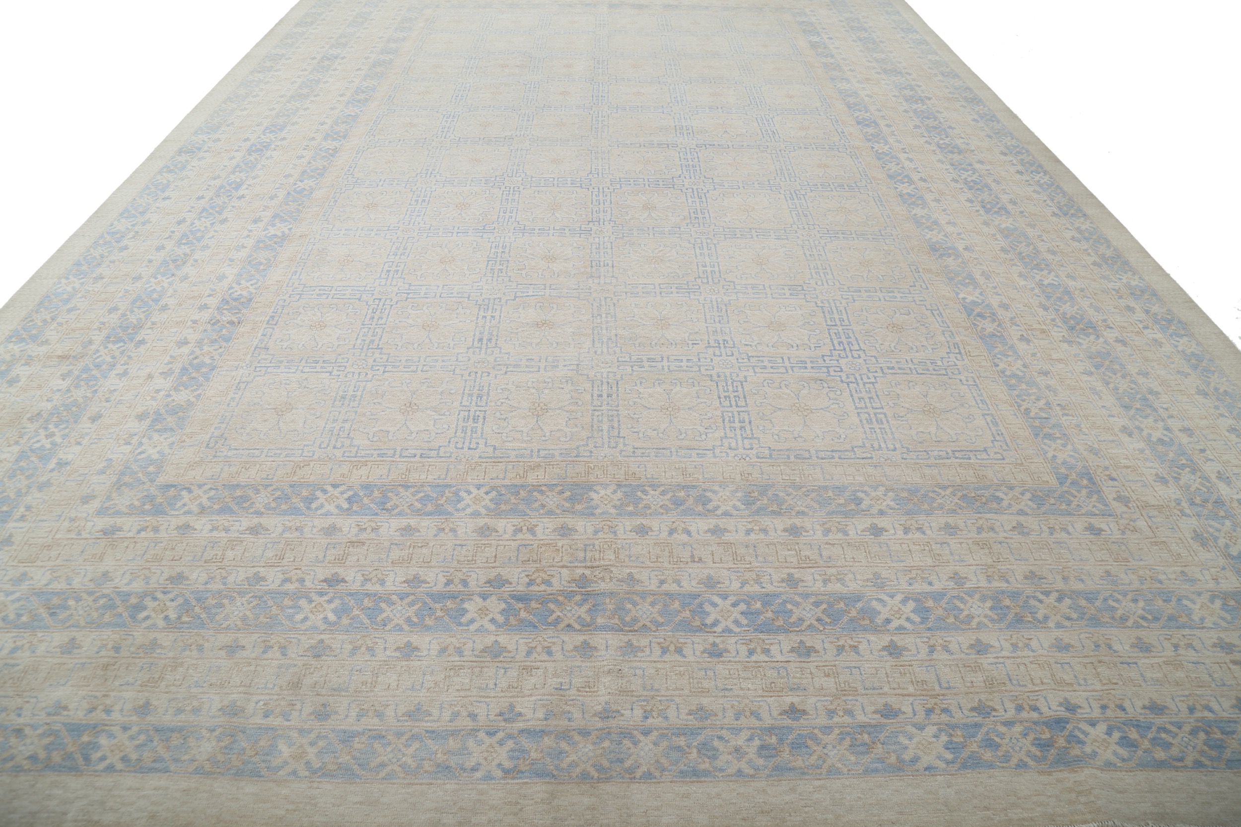 This 12’3″ x 17’9″ Oushak rug, hand-knotted in Afghan / Pakistan, features a allover design. It is woven with Approx. 144KPSI, showcasing a field in Silver and a Blue border. The rug has a Medium Pile and a 100% Wool pile, and is in excellent condition.