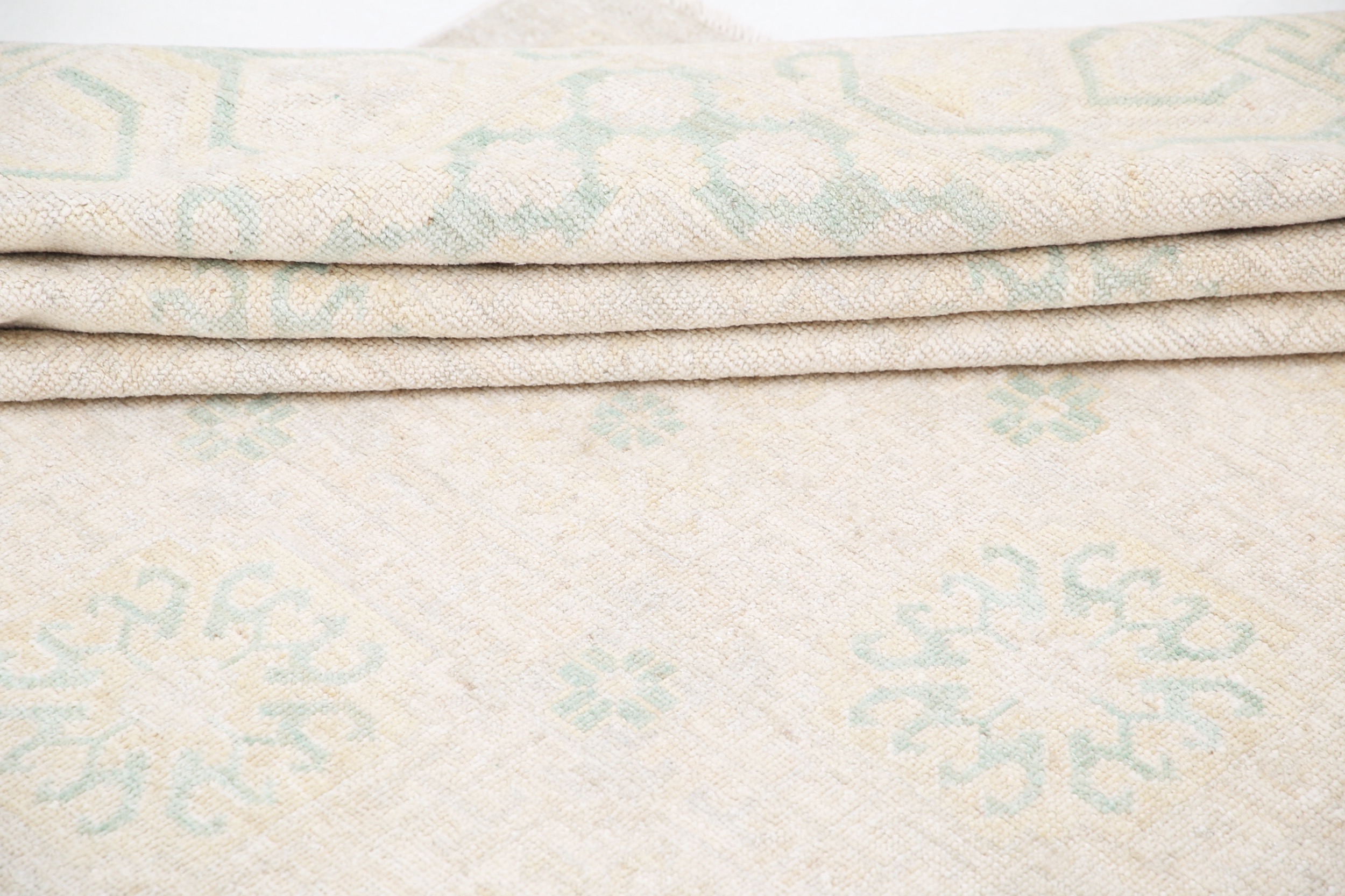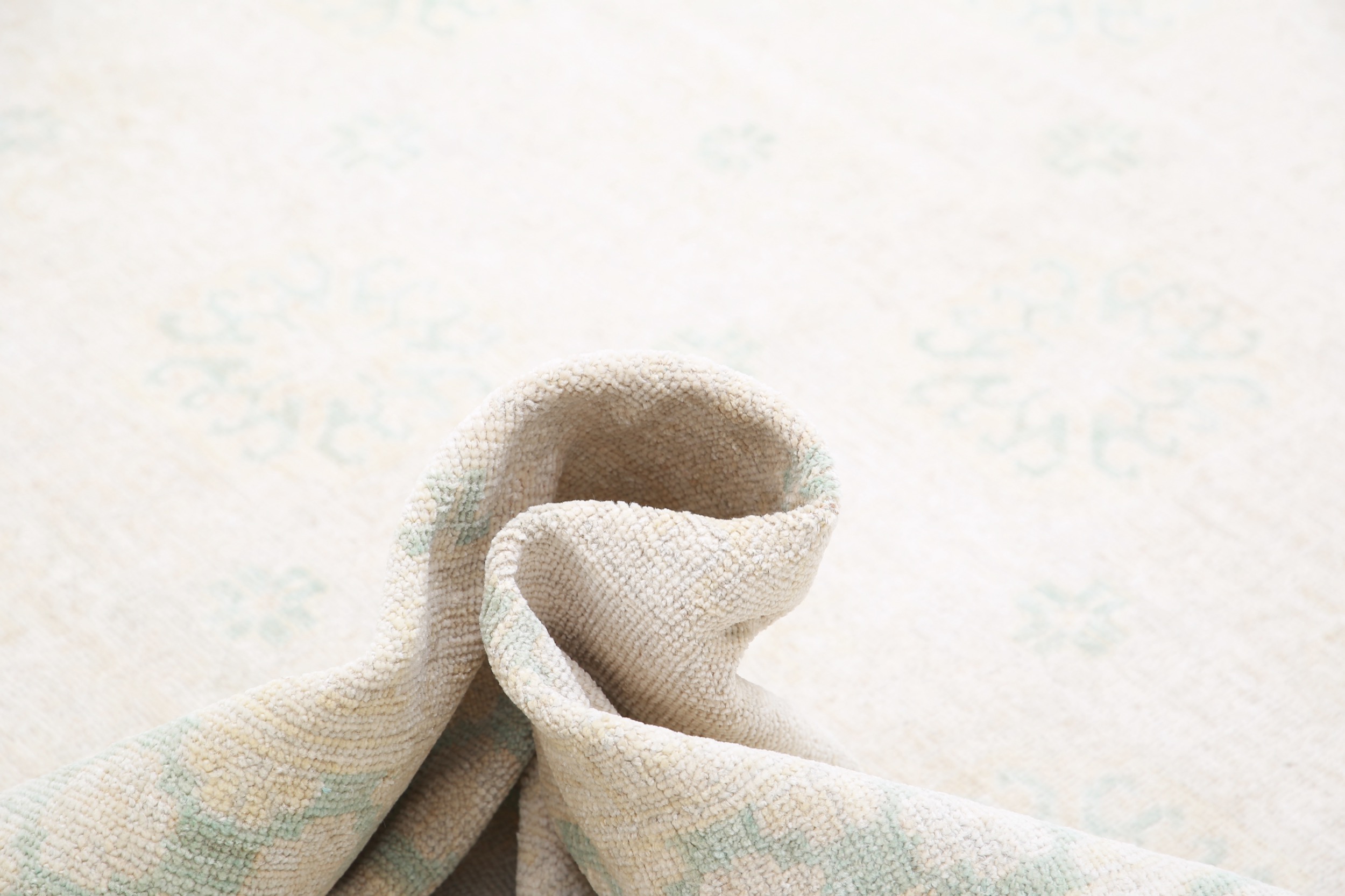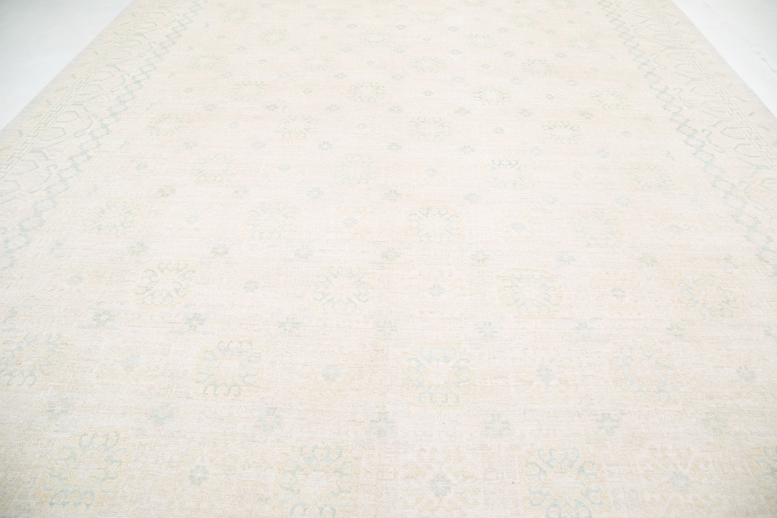 This 12’4″ x 17’8″ Oushak rug, hand-knotted in Afghan / Pakistan, features a allover design. It is woven with Approx.144 KPSI, showcasing a field in Beige and a Gray border. The rug has a Medium Pile and a 100% Wool pile, and is in excellent condition.