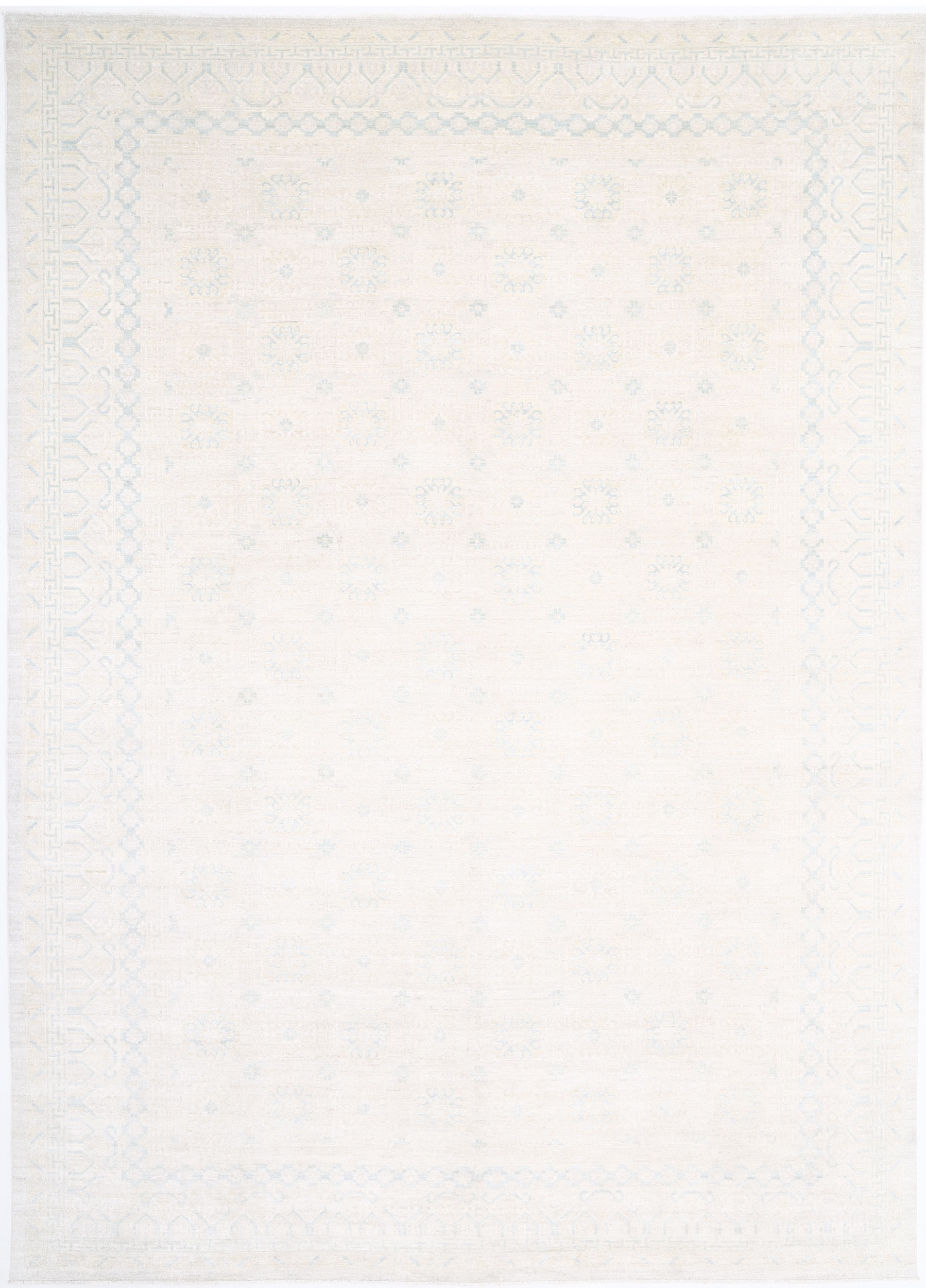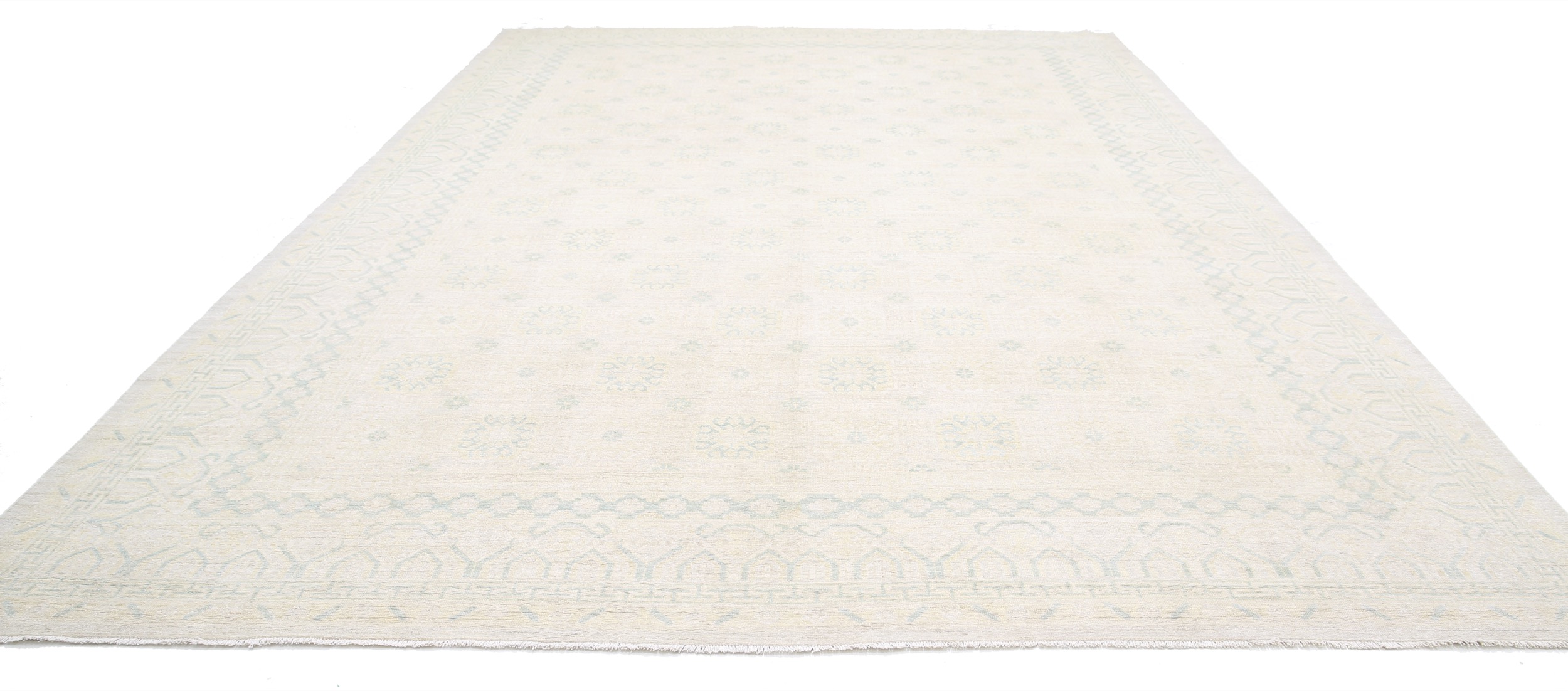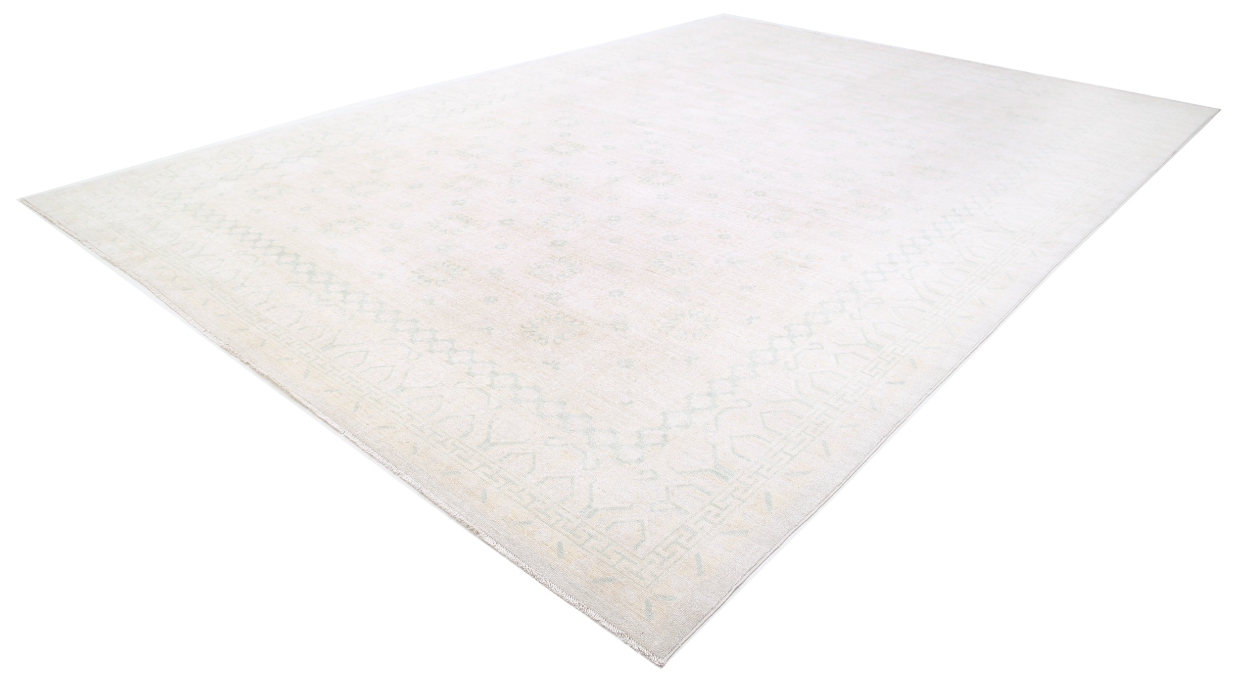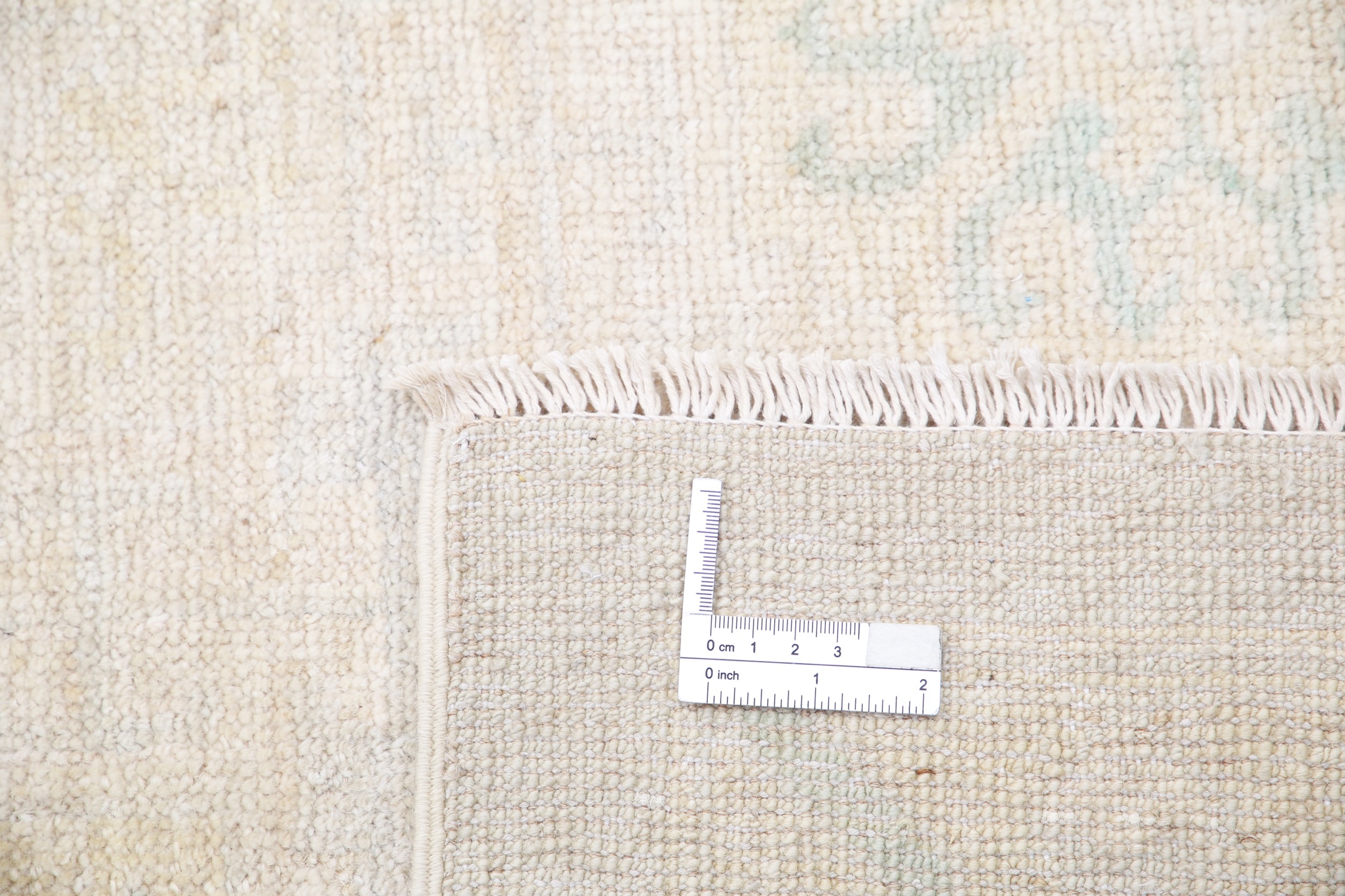 This 12’4″ x 17’8″ Oushak rug, hand-knotted in Afghan / Pakistan, features a allover design. It is woven with Approx.144 KPSI, showcasing a field in Beige and a Gray border. The rug has a Medium Pile and a 100% Wool pile, and is in excellent condition.