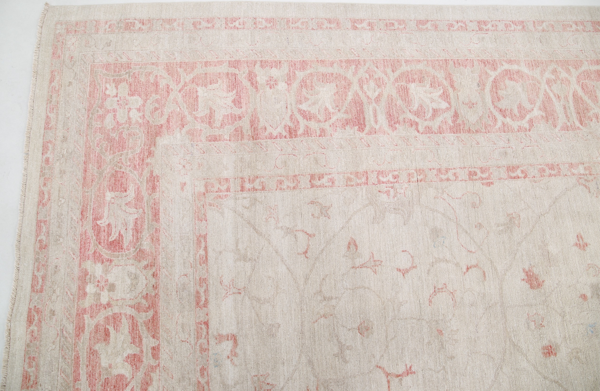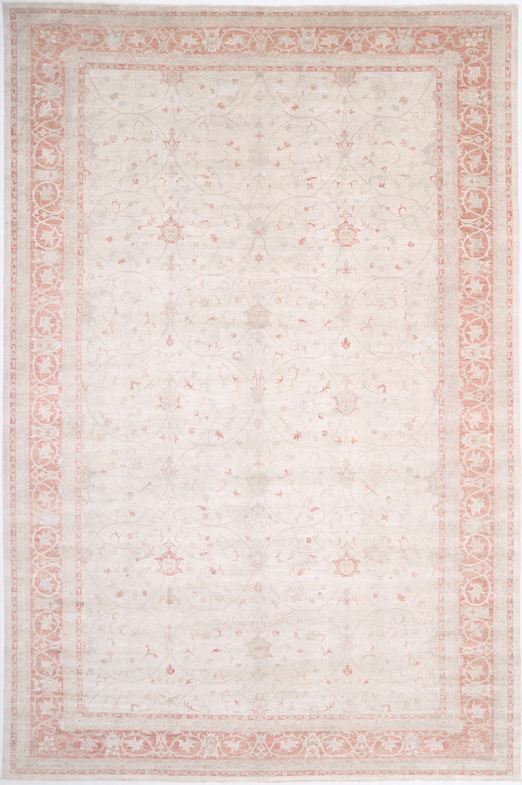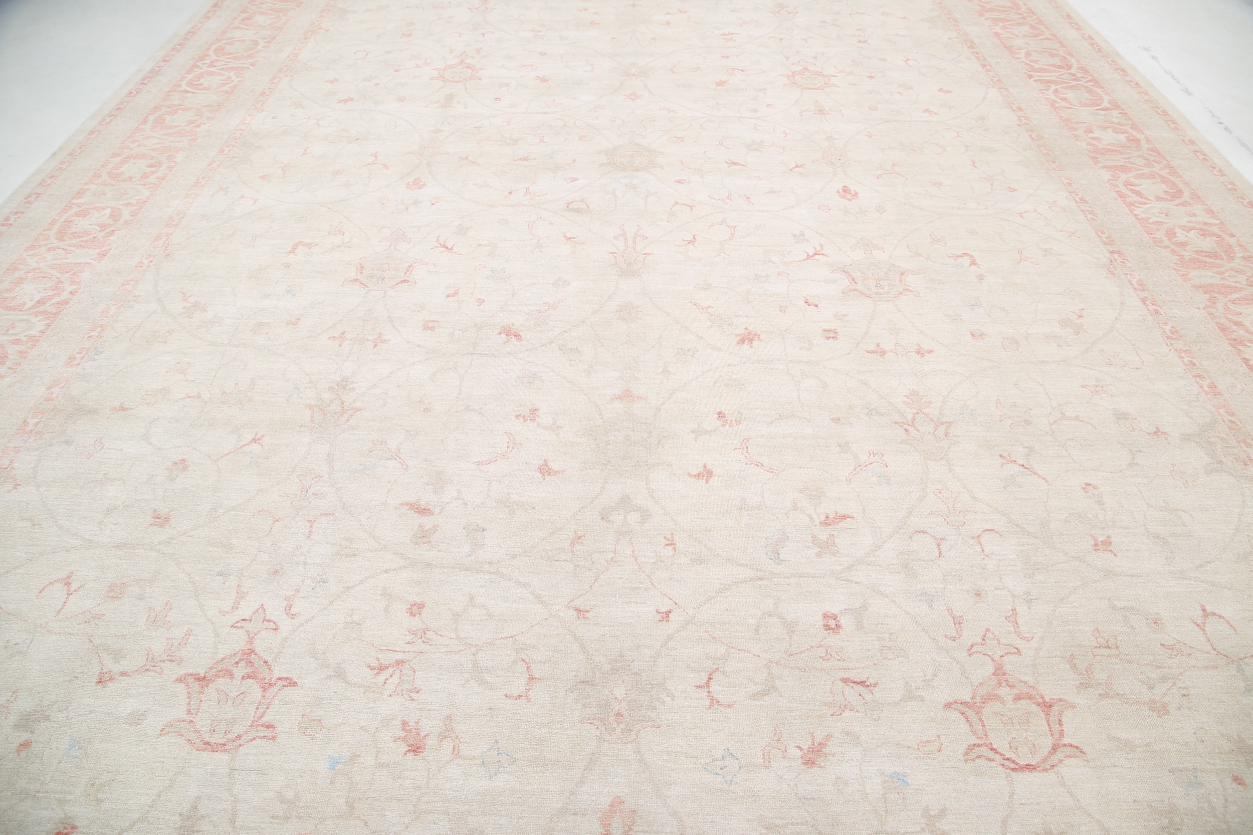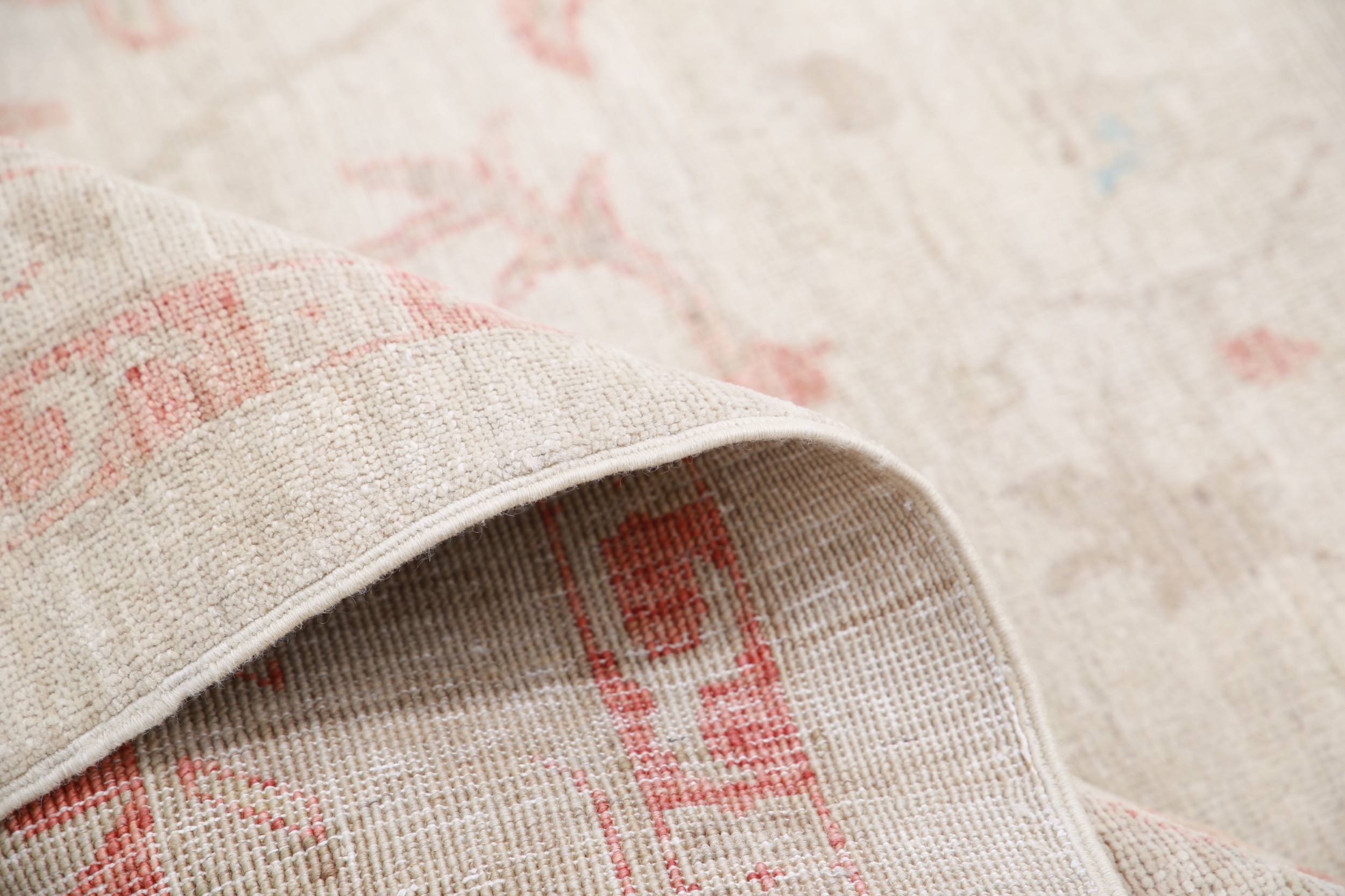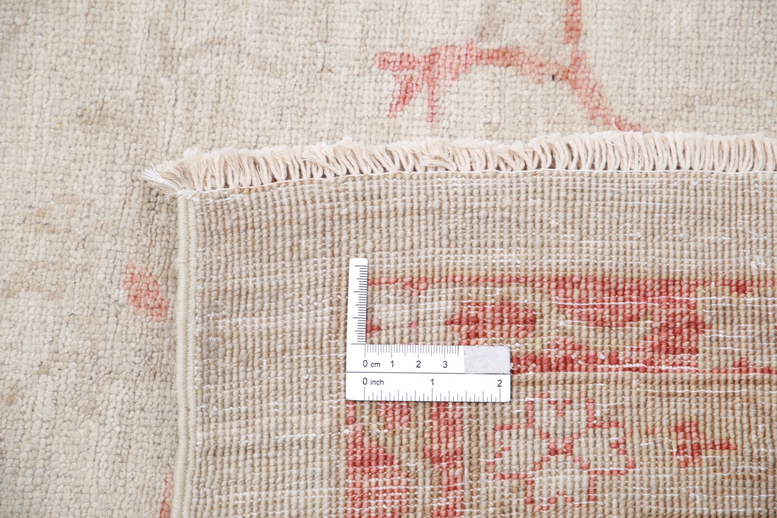 This 13’2″ x 19’7′ Oushak rug, hand-knotted in Afghan / Pakistan, features a allover design. It is woven with Approx. 156KPSI, showcasing a field in Beige and a Rust border. The rug has a Medium Pile and a 100% Wool pile, and is in excellent condition.