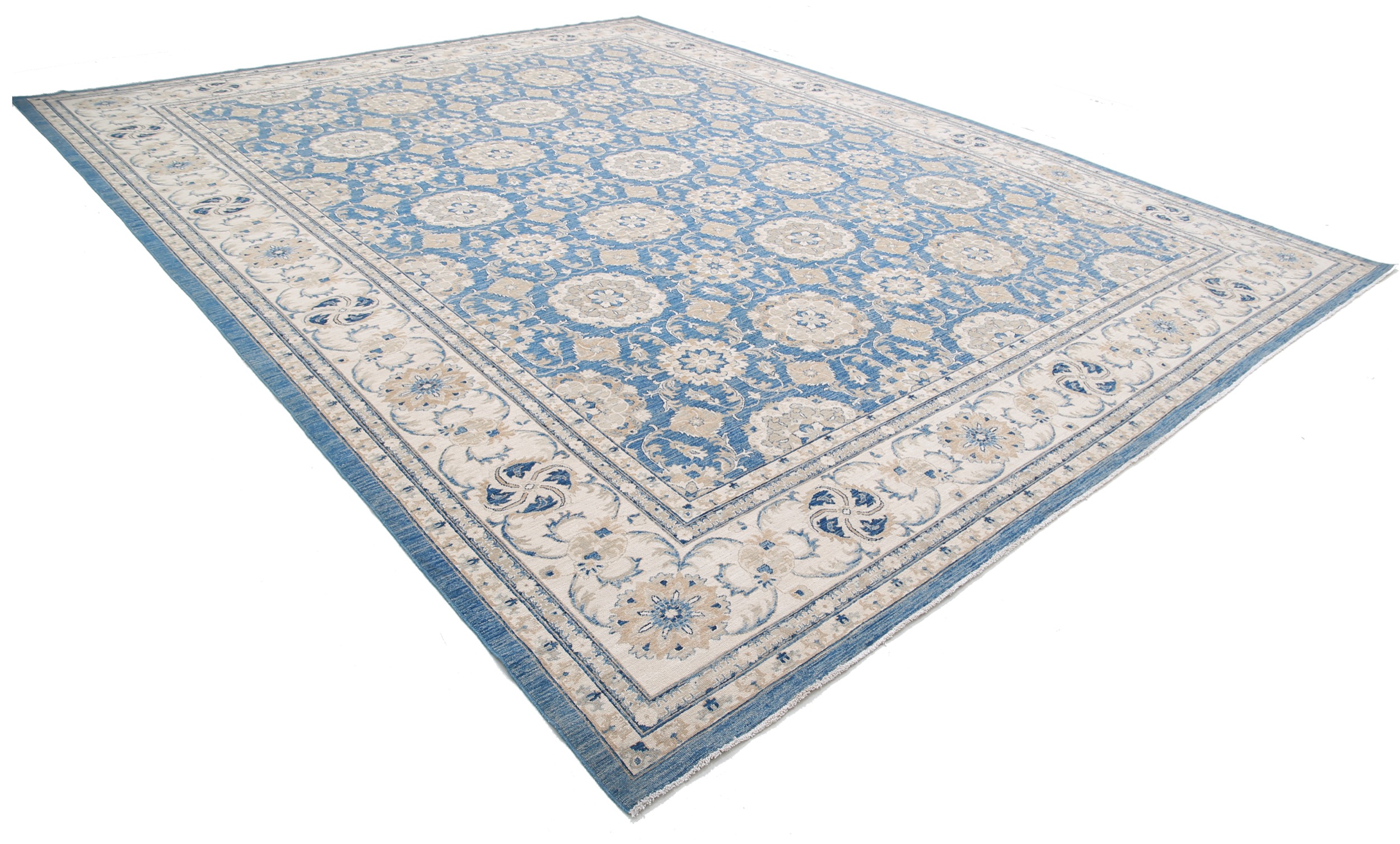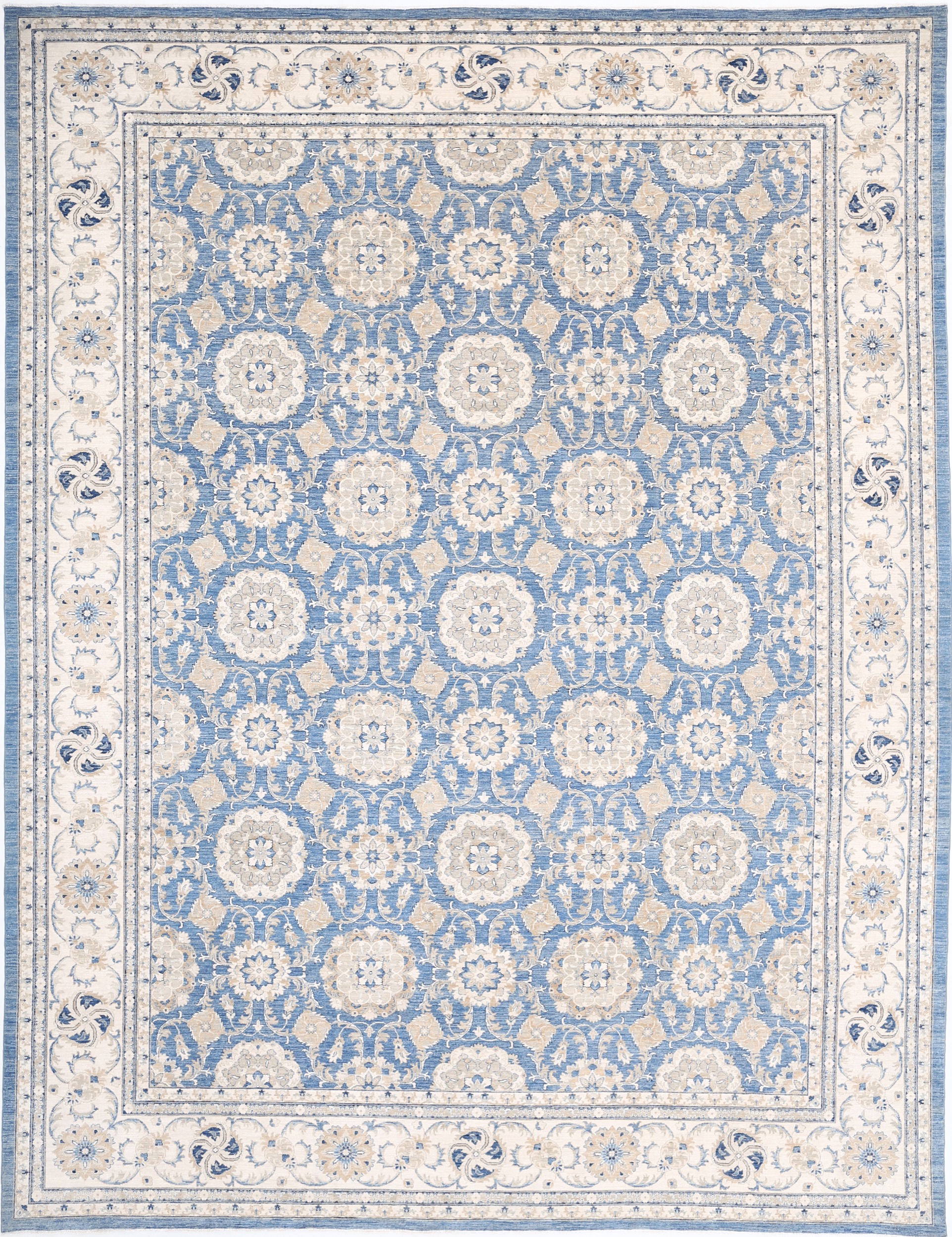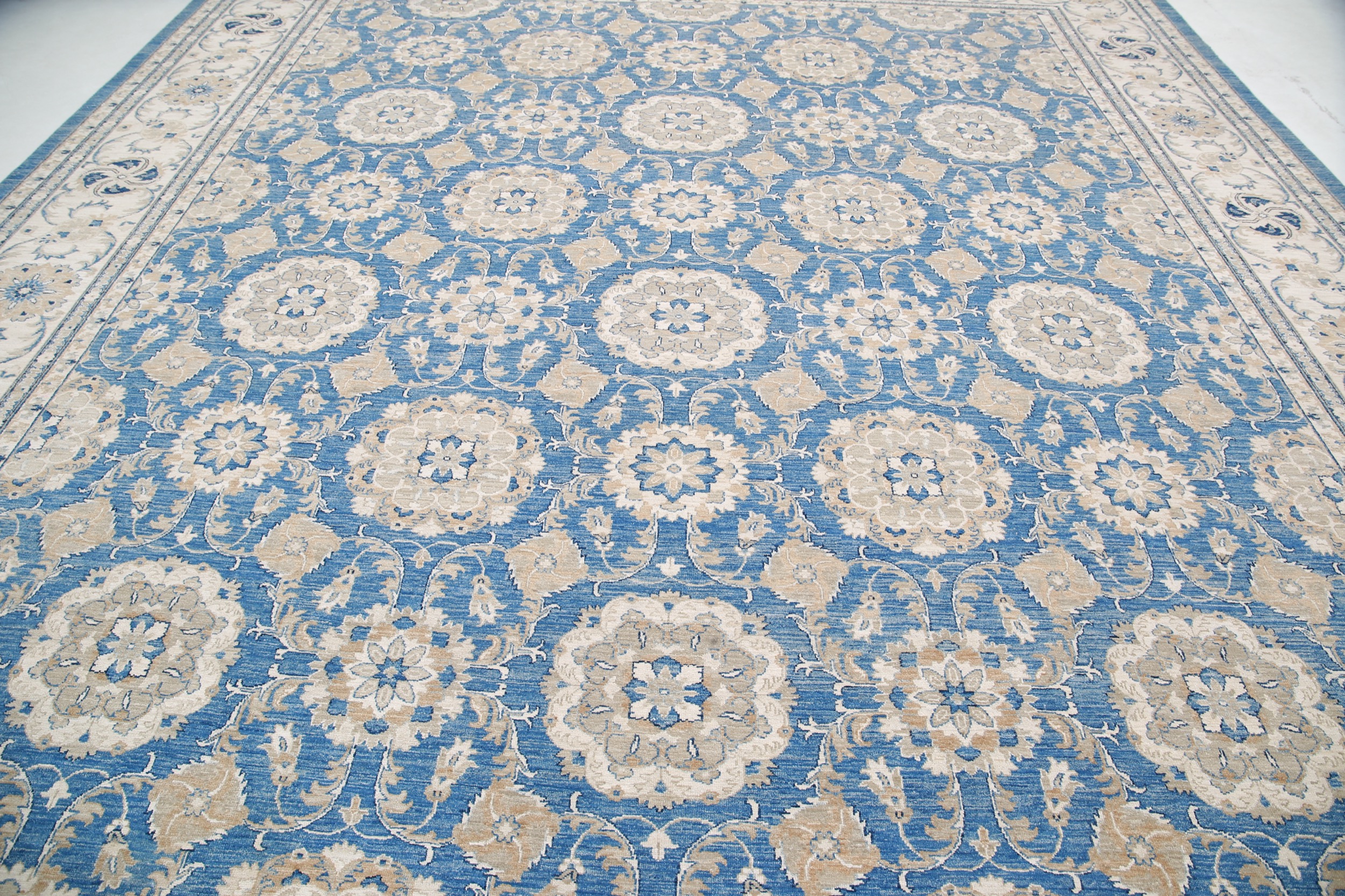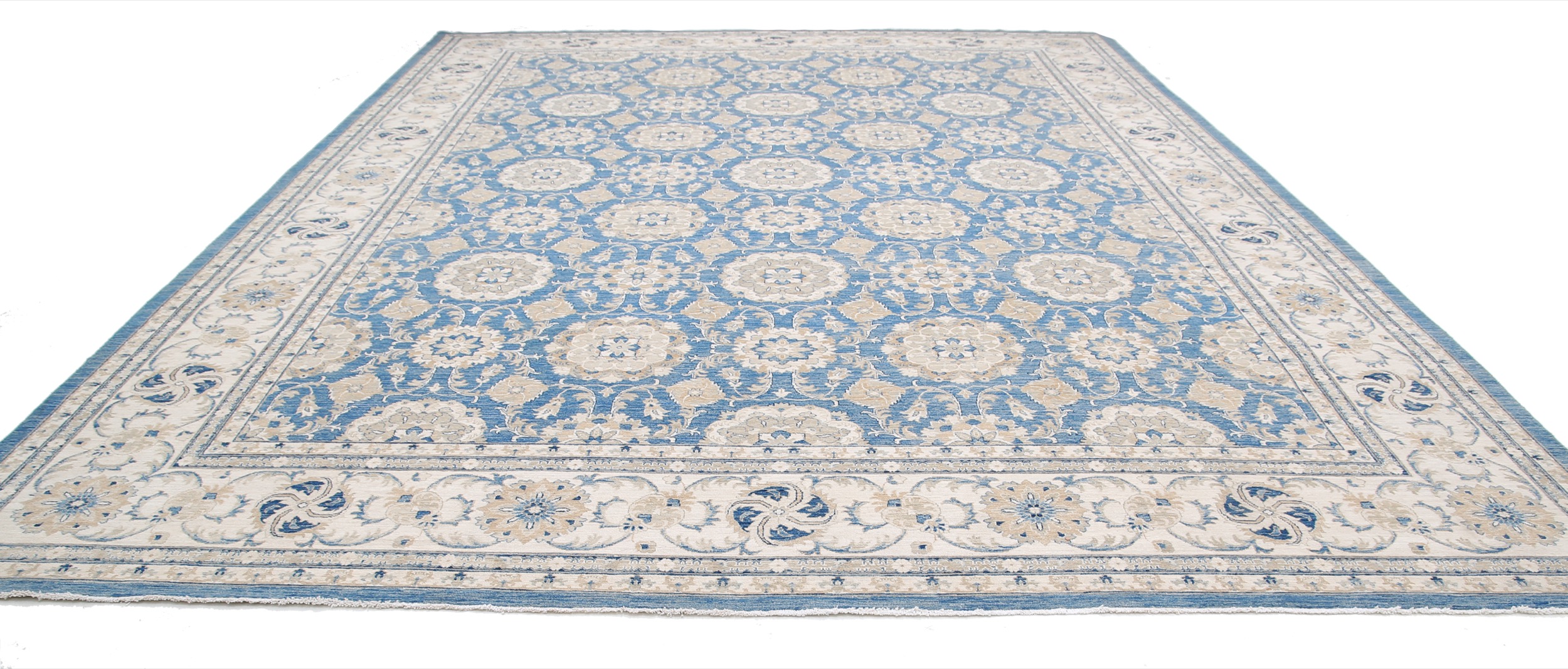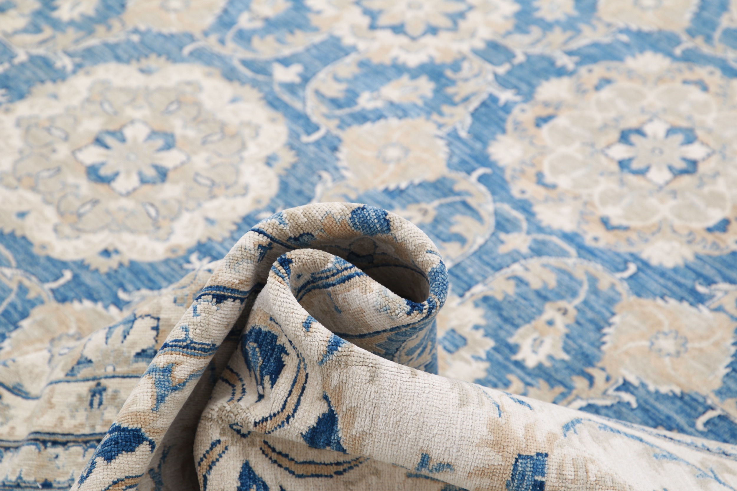 This 13’3″ x 16’9″ Oushak rug, hand-knotted in Afghan / Pakistan, features a allover design. It is woven with Approx. 156KPSI, showcasing a field in Blue and a Beige border. The rug has a Medium Pile and a 100% Wool pile, and is in excellent condition.