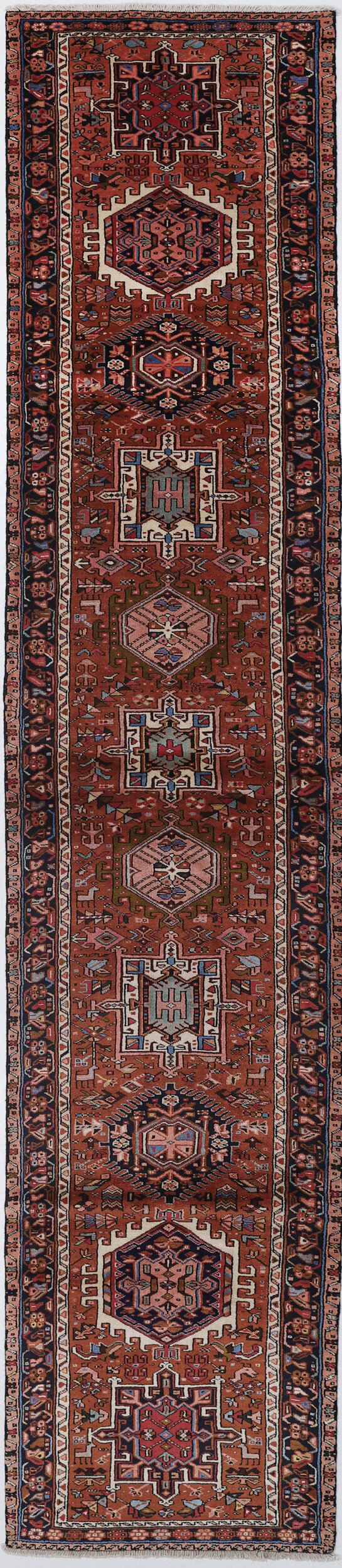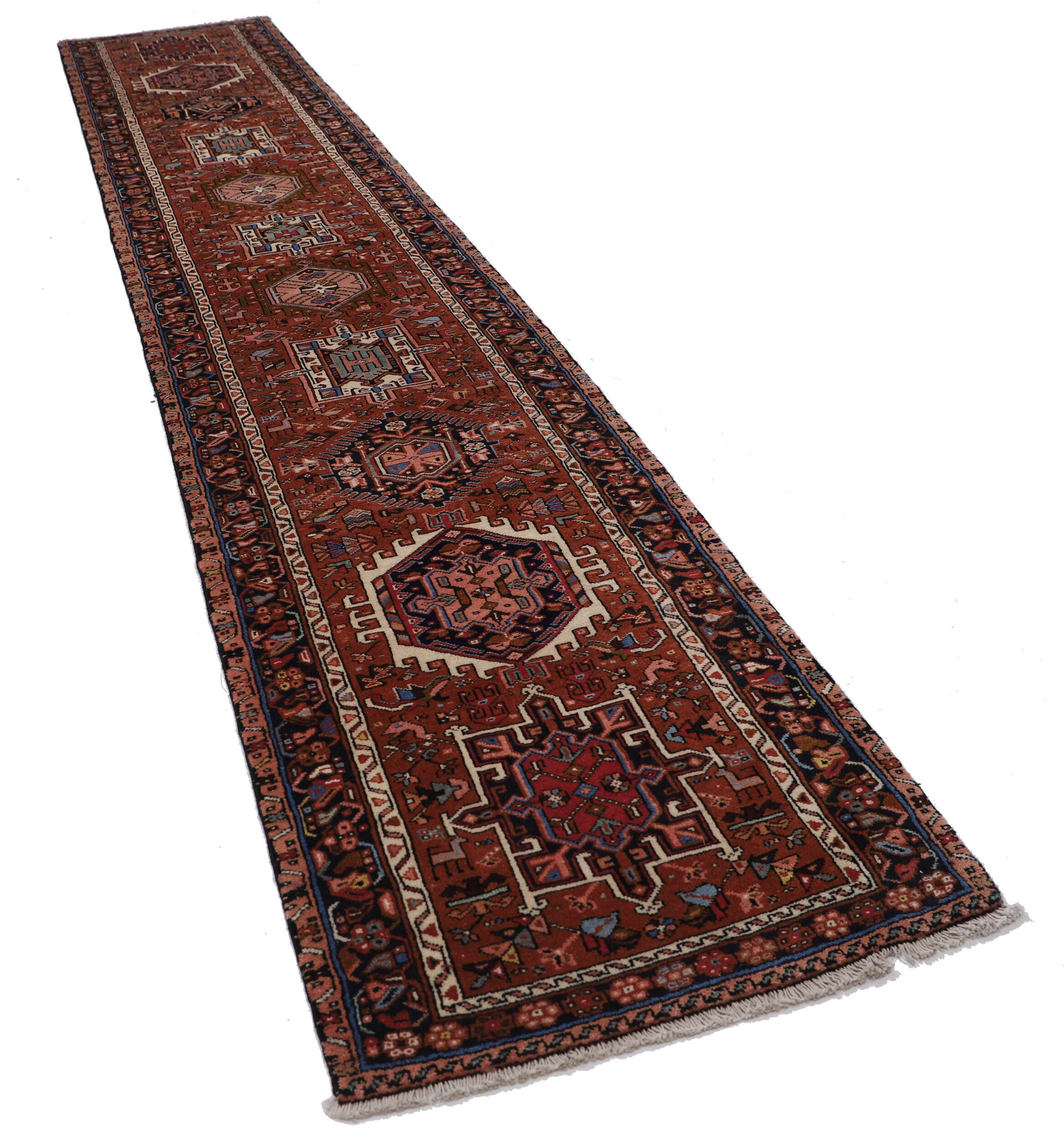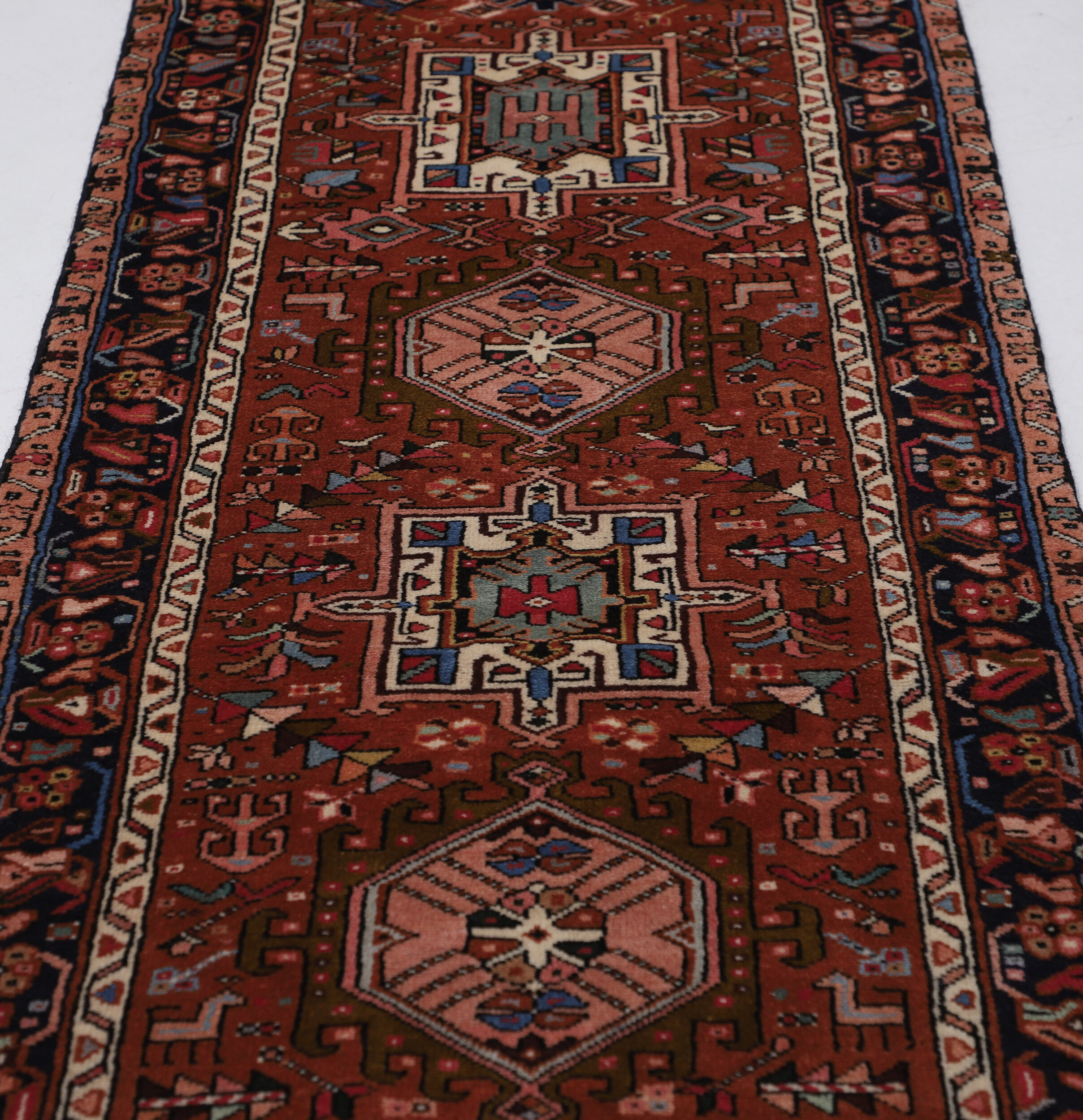 Hand Knotted Karaja Persian Rug: This exquisite rug measures 2’10” x 15’10” and has a charming aged appearance, between 10-20 years old. The vibrant color combination of red and blue creates a captivating all-over design. With an approximate knot count of 196 KPSI, this rug is meticulously crafted using 100% wool on a cotton foundation. It features a medium pile height, ranging from 1/3″ to 3/8″, ensuring both comfort and durability. Add a touch of elegance to any space with this timeless and beautifully handcrafted Persian rug.