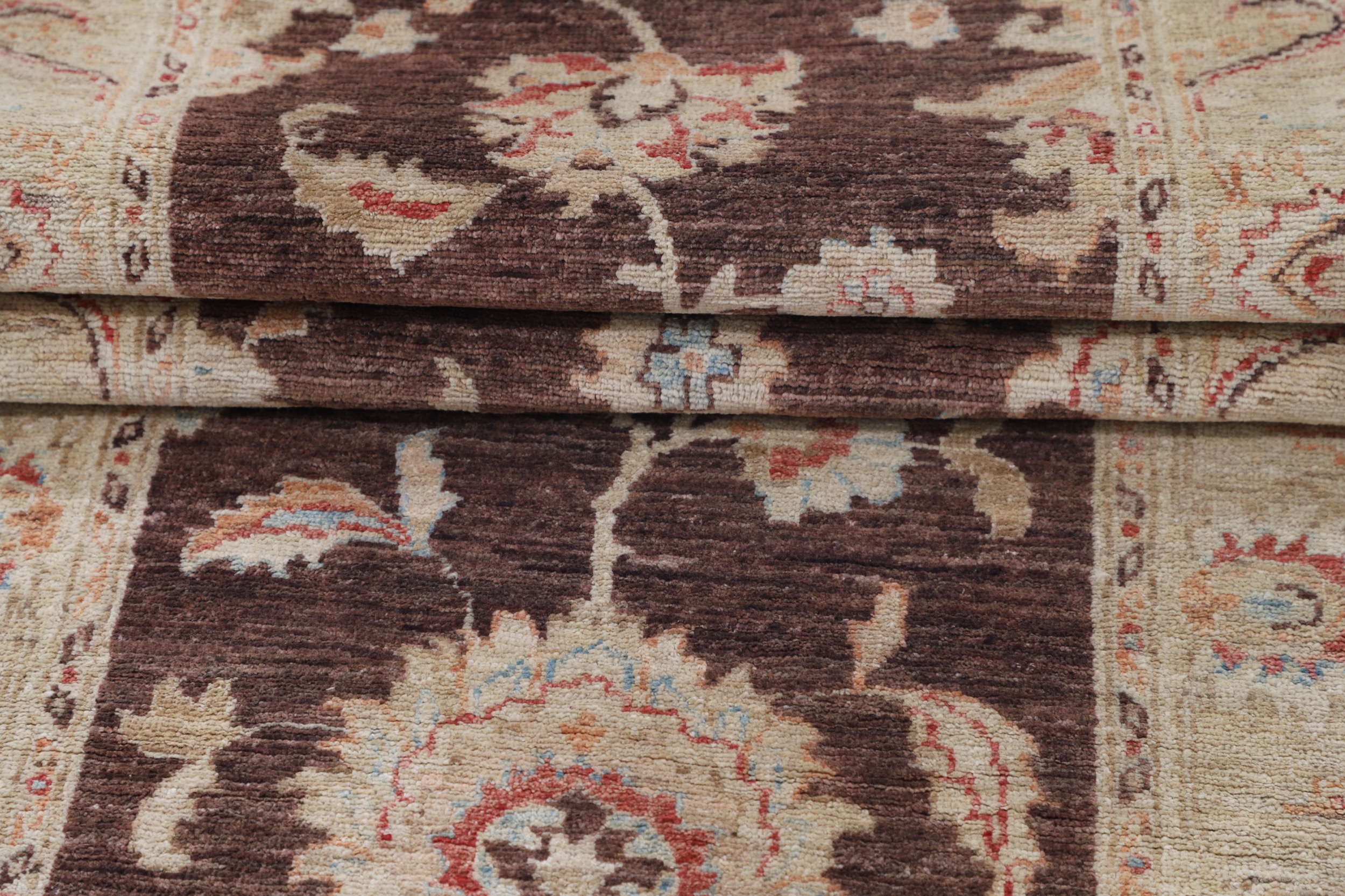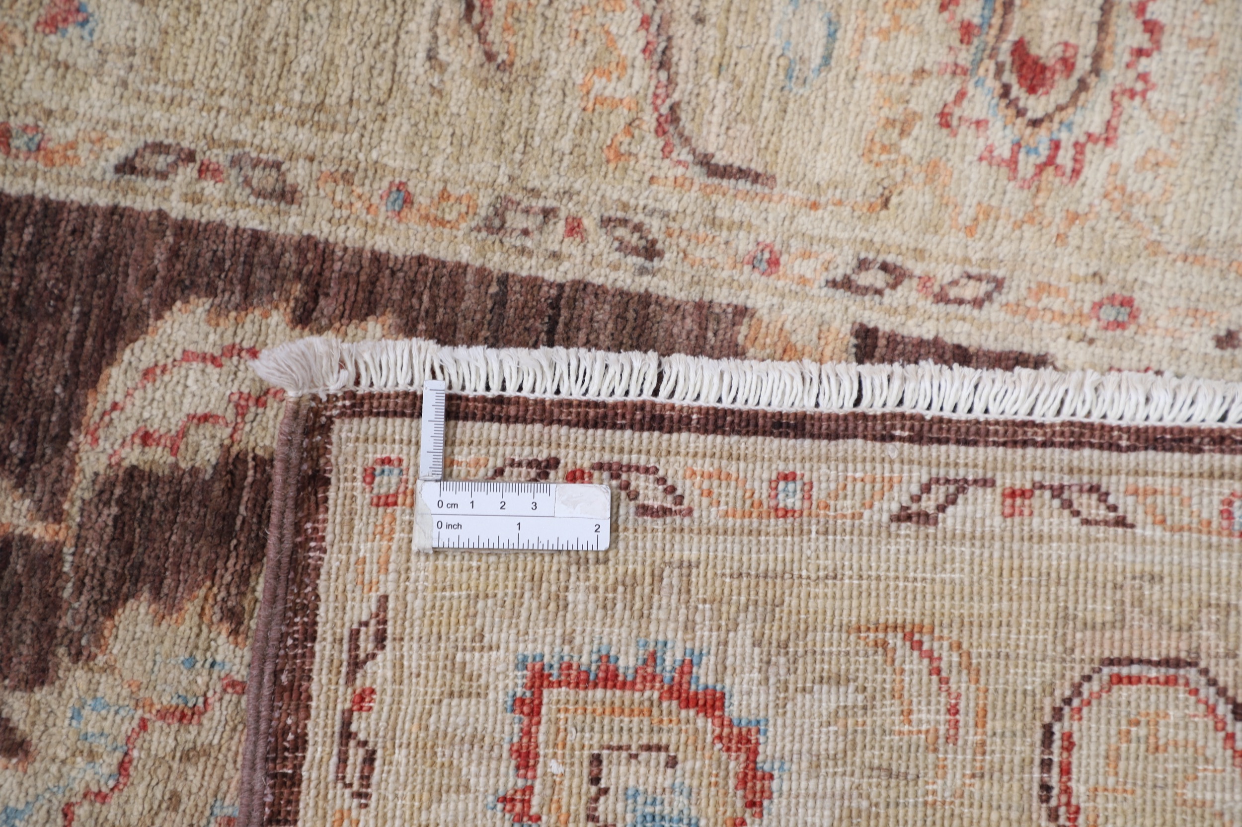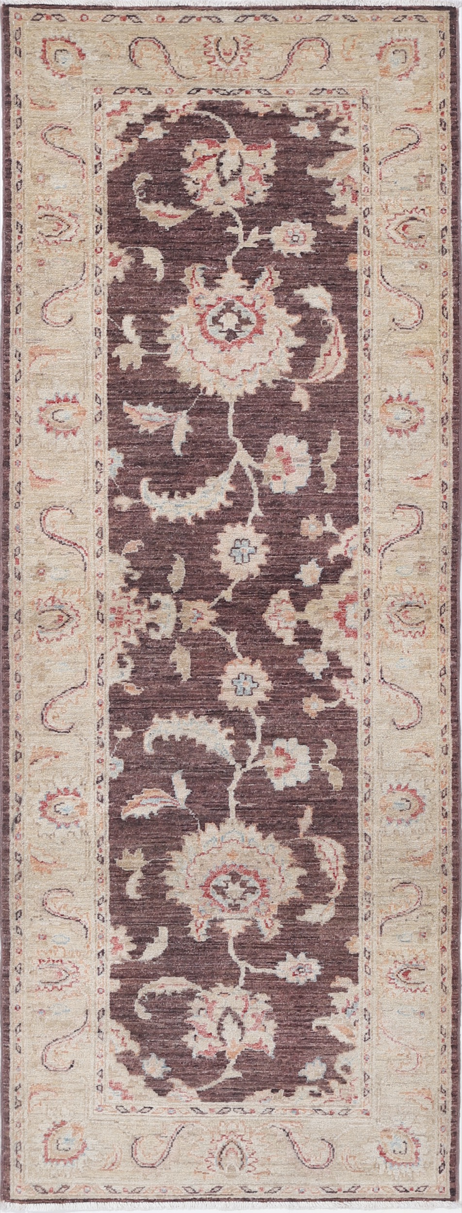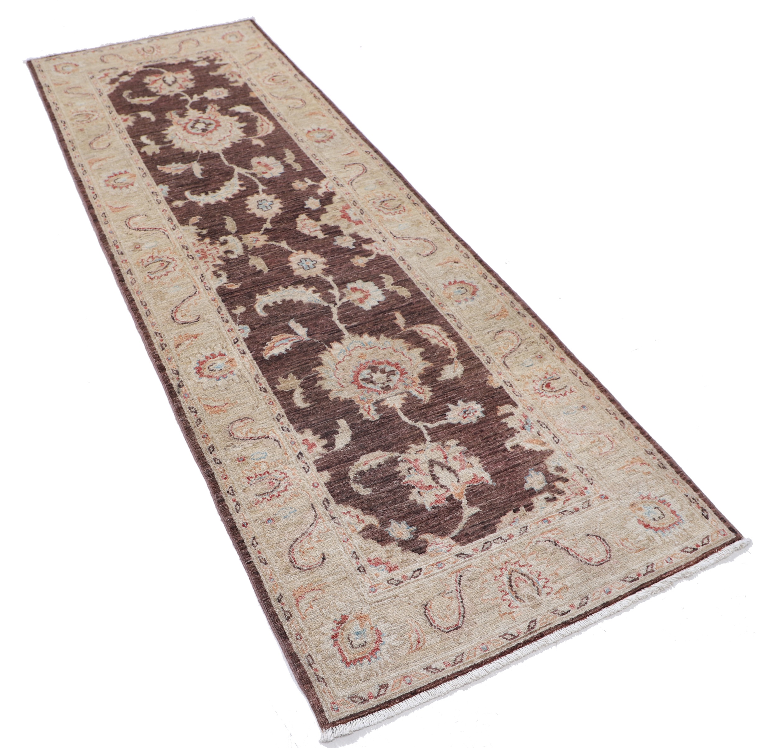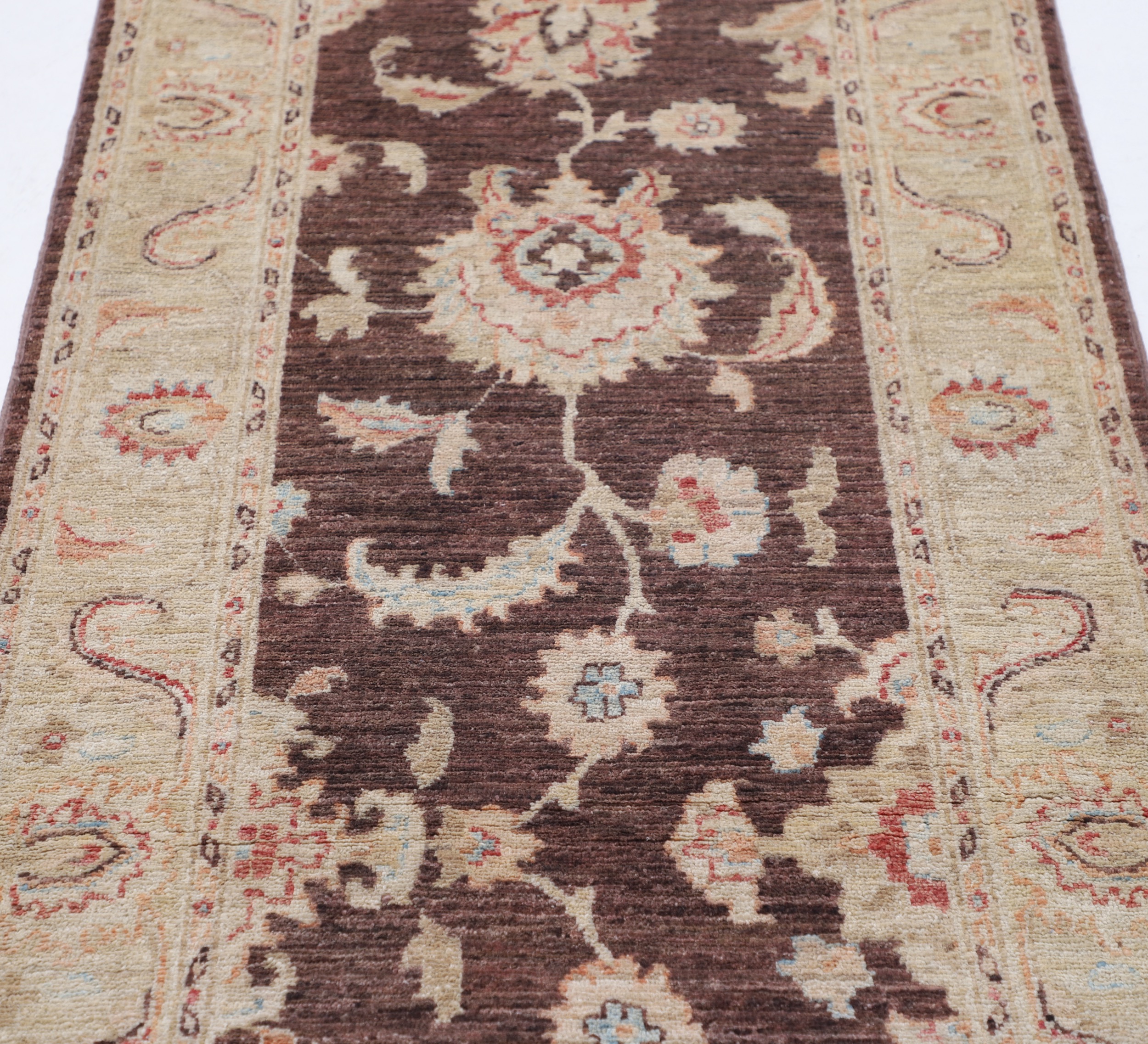 Authentic hand-knotted Oushak rug (Afghan/Pakistan origin), 2’11” x 8’2″ (approx. 3×8 ft). Features a beautiful floral design in brown, beige, blue, rust, and orange hues. Made of 100% wool with a low-medium pile (1/4″-1/3″). Approx. 156 KPSI. New condition.