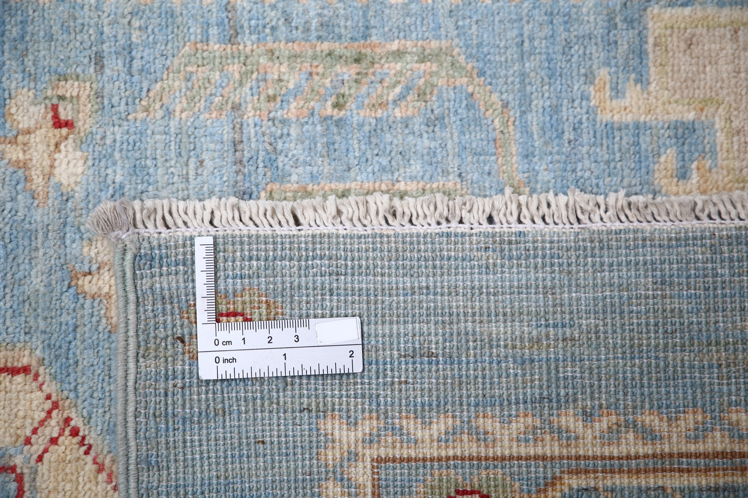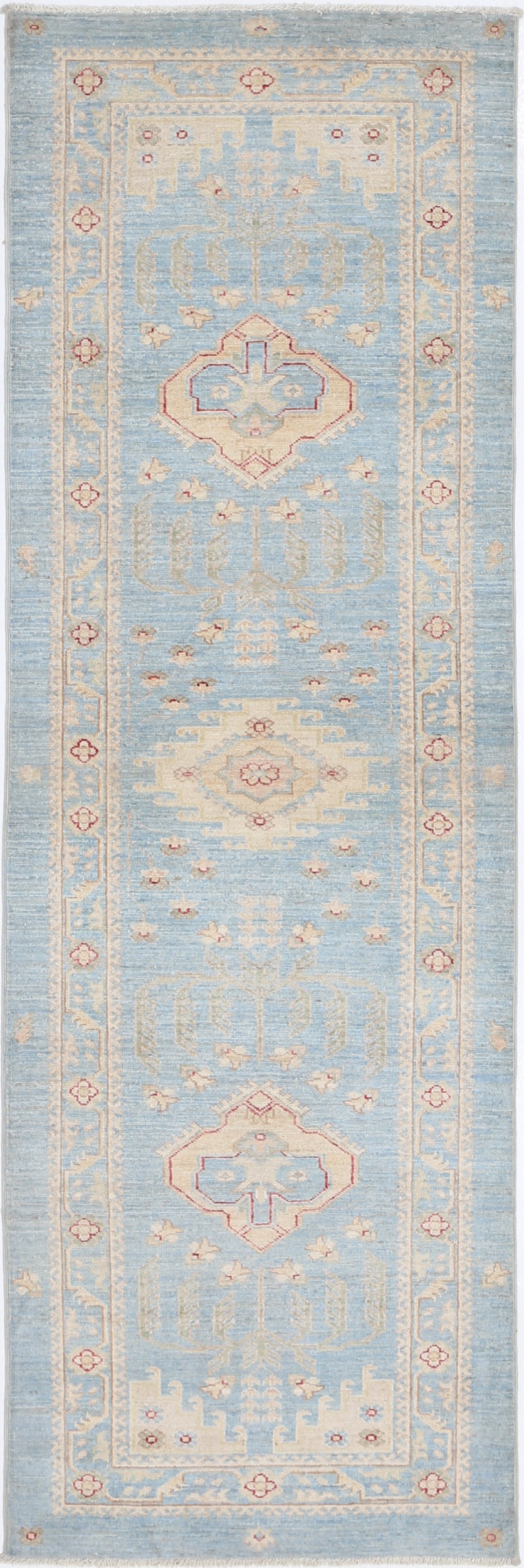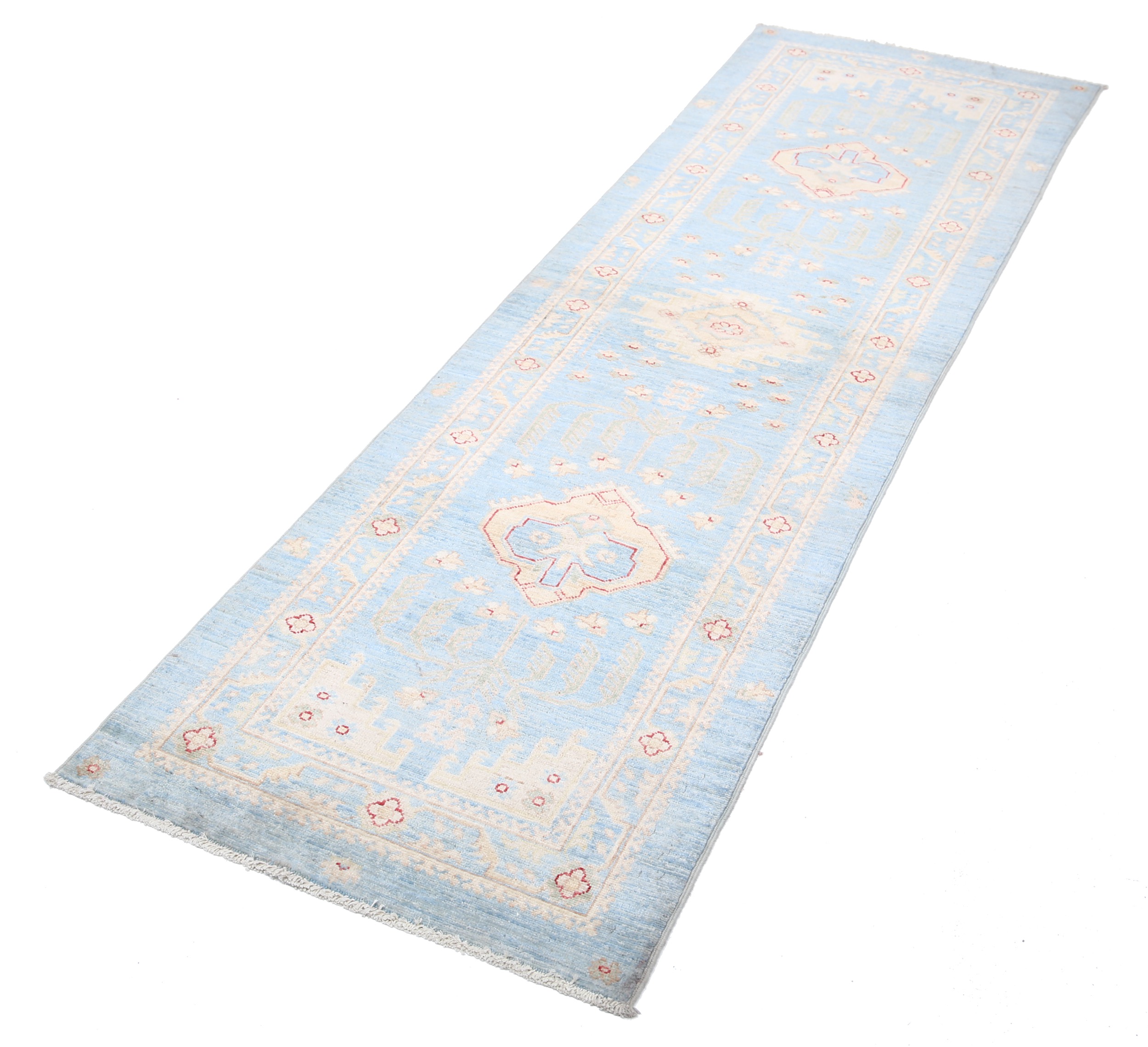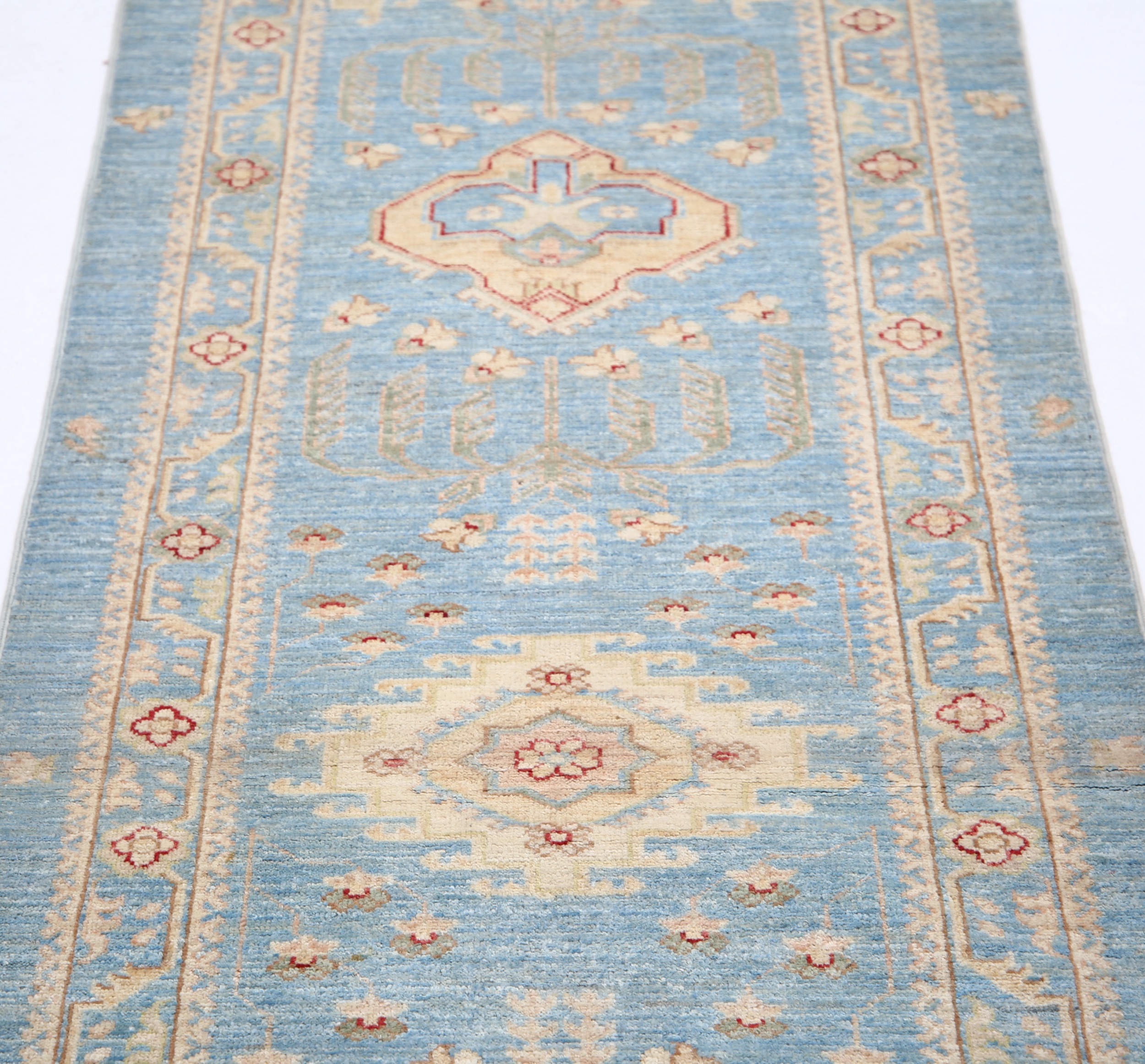 Authentic hand-knotted Oushak rug from Afghanistan/Pakistan. This stunning 2’6″ x 7’10” (approx. 3′ x 8′) rug boasts a vibrant blue color palette with green, yellow, and beige accents in an allover design. Made of 100% wool with a low-medium pile (1/4″-1/3″), it features approximately 156 knots per square inch. A beautiful addition to any room!