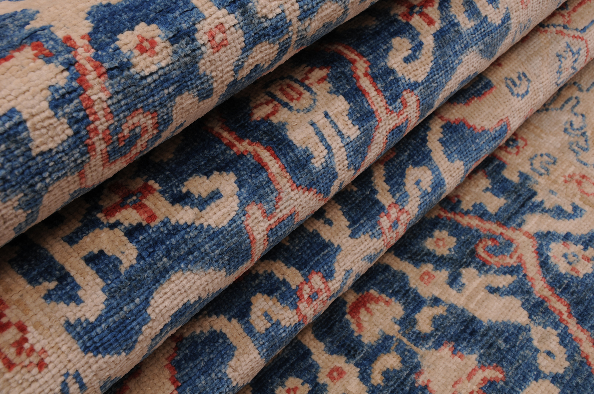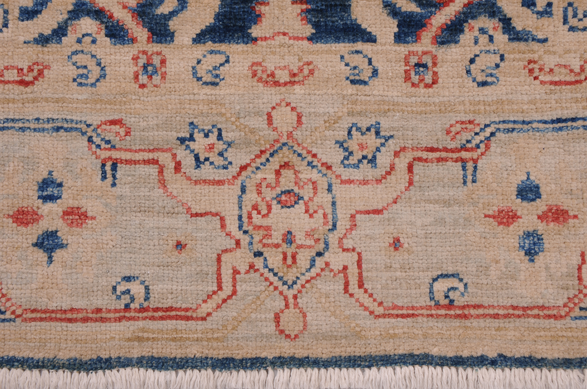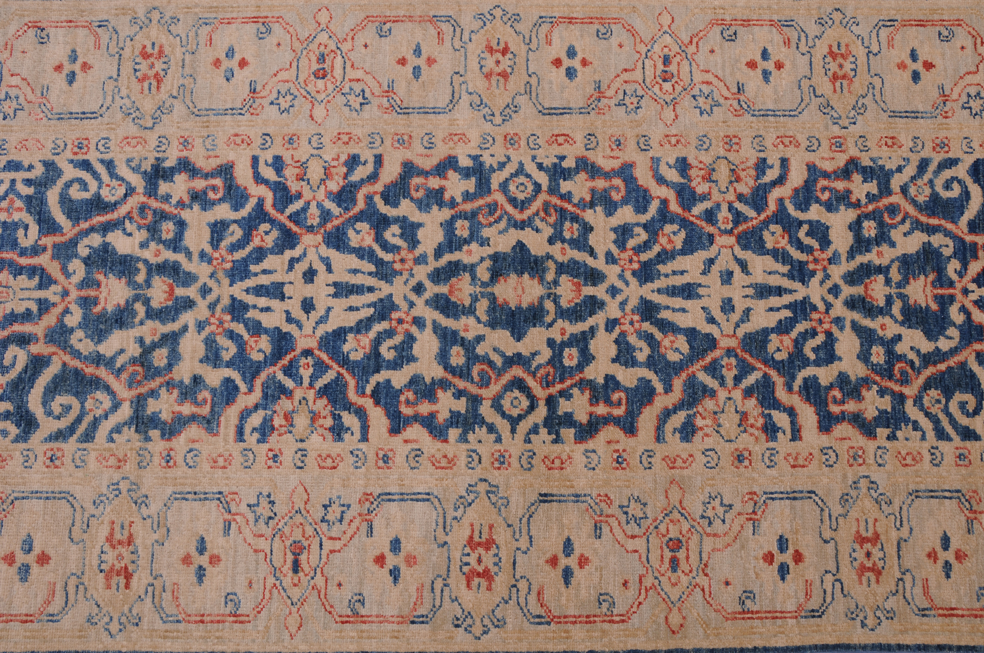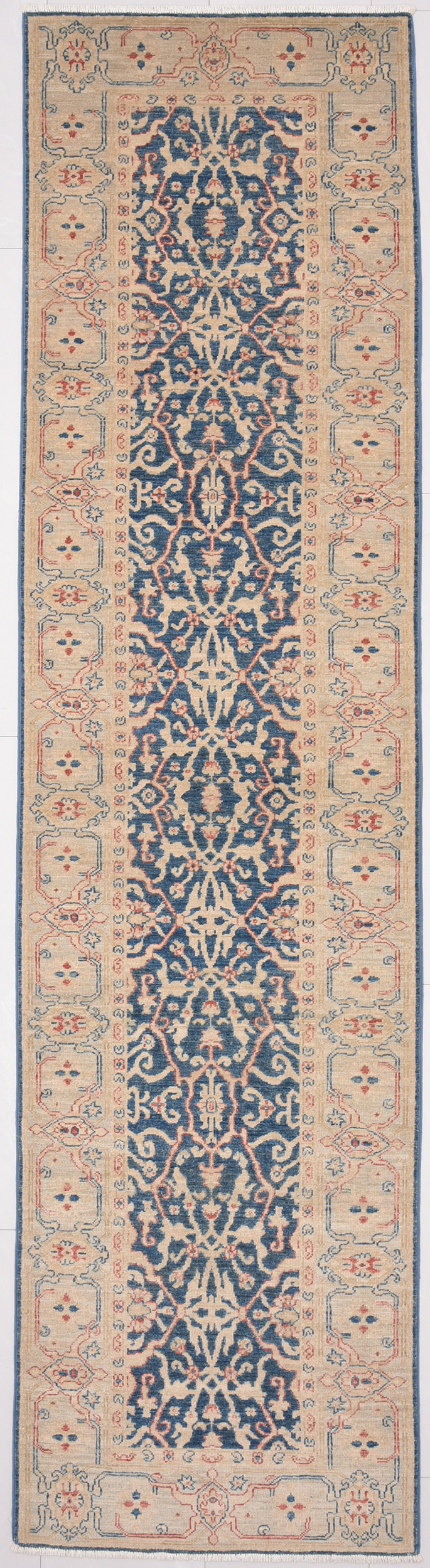 This 2’6″ x 9’5″ Oushak rug, hand-knotted in Afghan / Pakistan, features a floral design. Crafted with approx. 156 kpsi, its field color is Blue with a Beige border. The rug has a low medium pile 1/4″-1/3″ and a 100% wool pile, in excellent & washed condition.