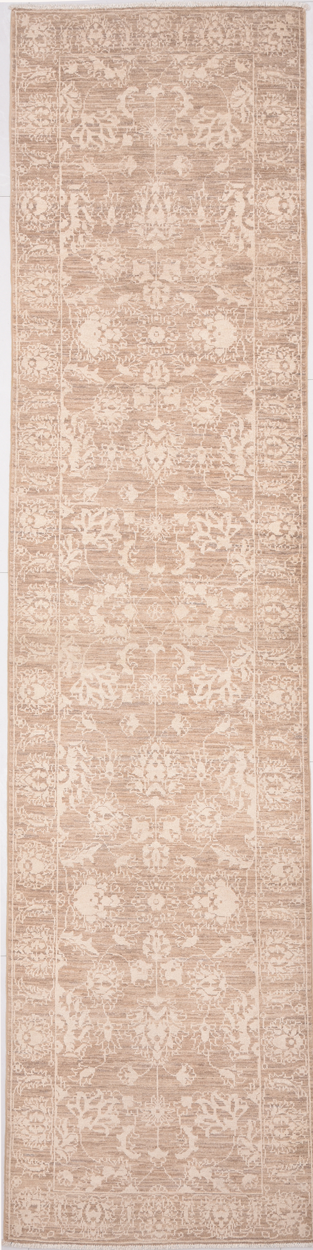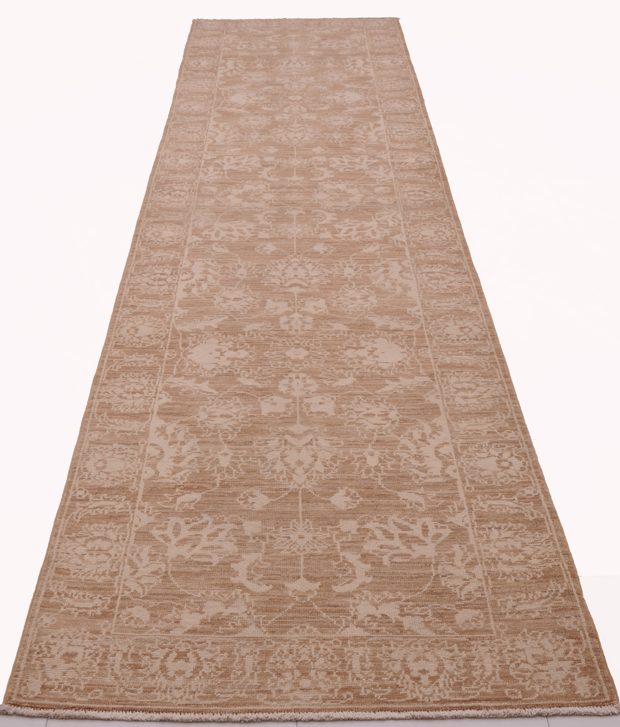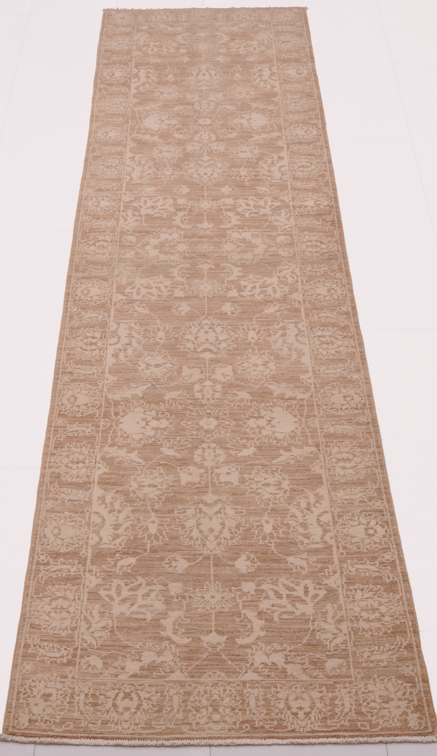 A stunning example of Oriental craftsmanship, this 2’6″ x 9’9″ Oushak rug is hand-knotted in Afghan / Pakistan. Its brown field and brown border frame a detailed floral design, known for its refined, traditional aesthetics. Durable and beautifully textured with a low medium pile 1/4″-1/3″ pile.