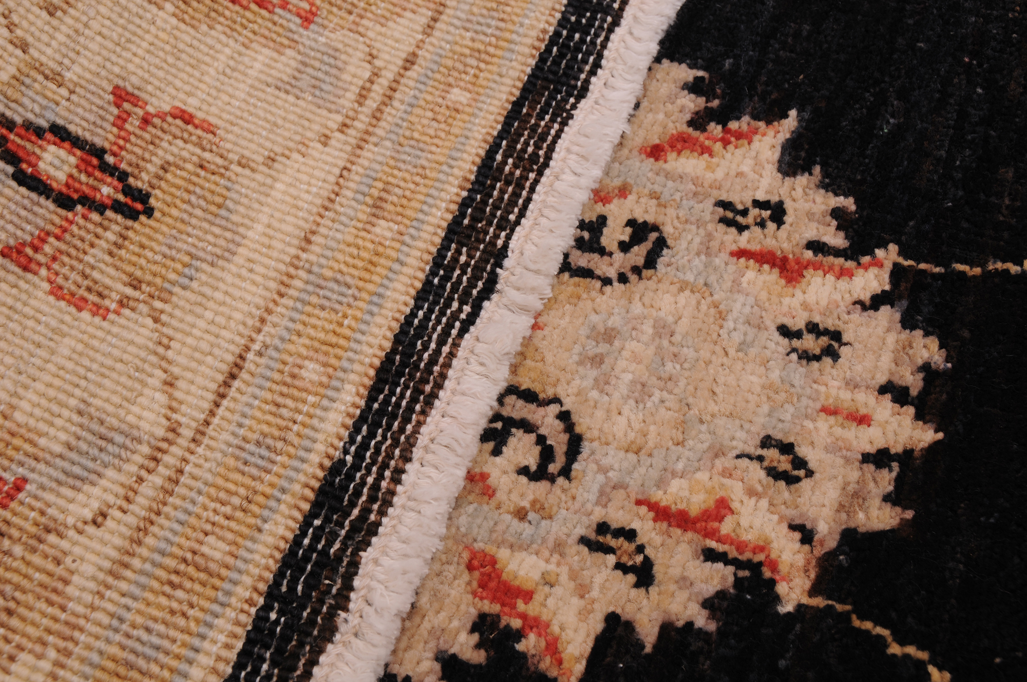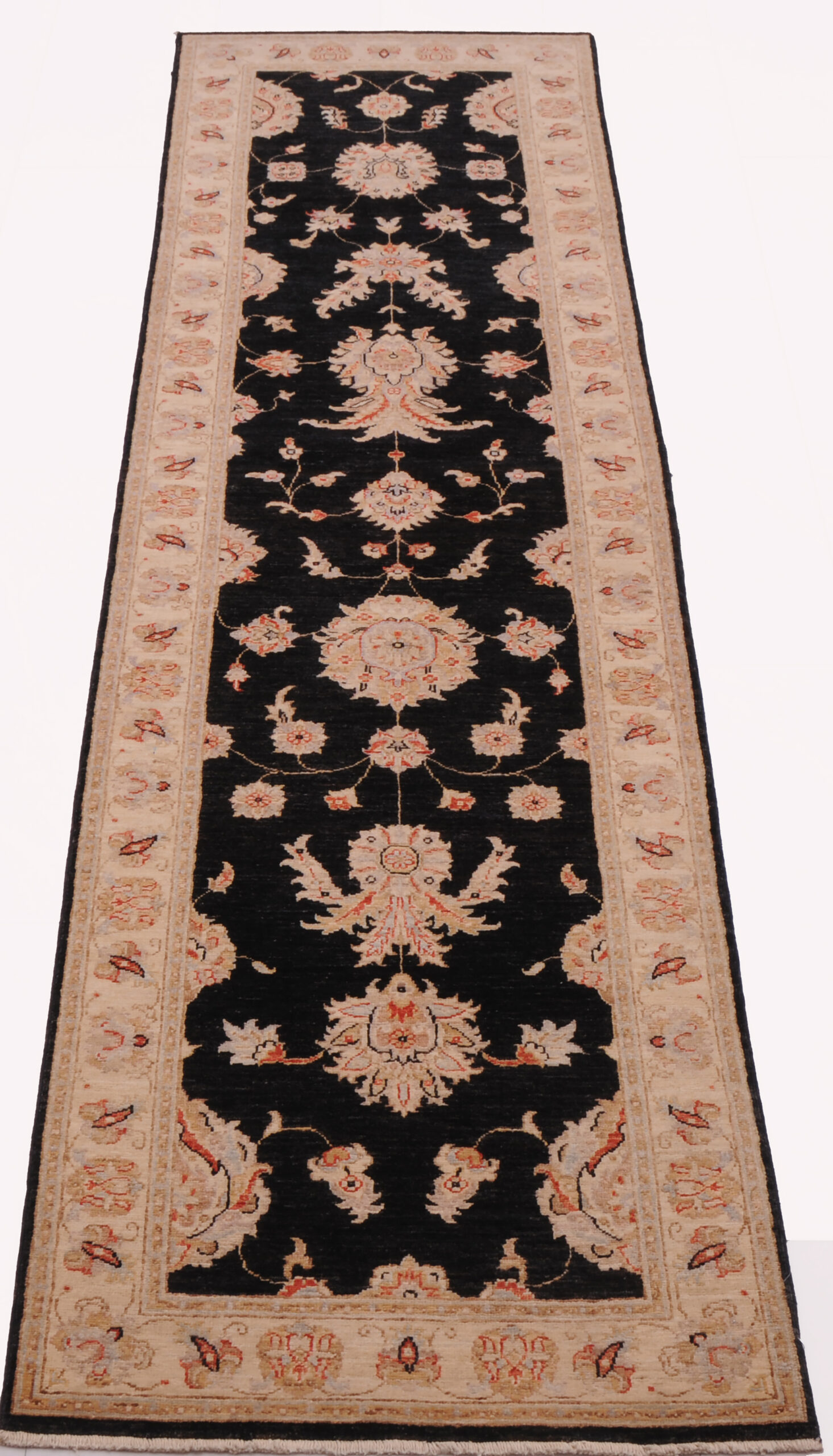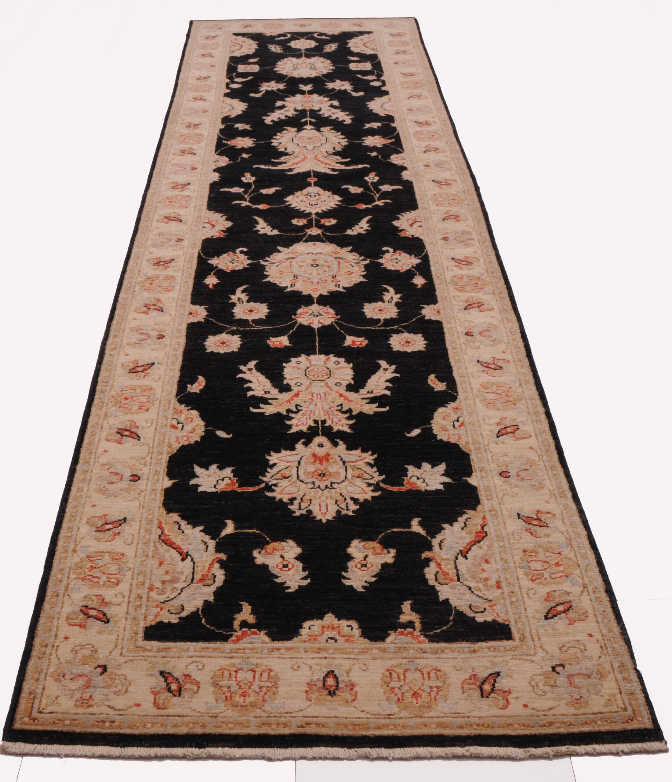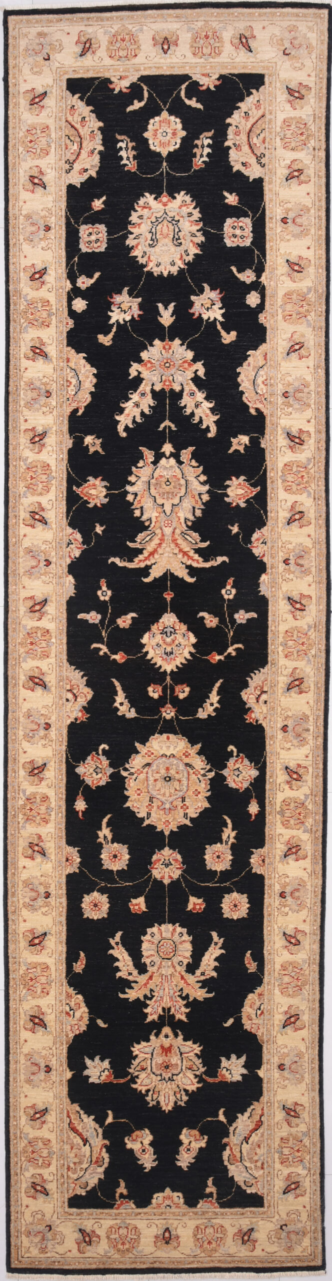 This 2’6″ x 10’0″ Oushak rug, hand-knotted in Afghan / Pakistan, features a allover design. It is woven with Approx. 156 KPSI, showcasing a field in Black and a Beige border. The rug has a Low Medium Pile and a 100% Wool pile, and is in excellent condition.