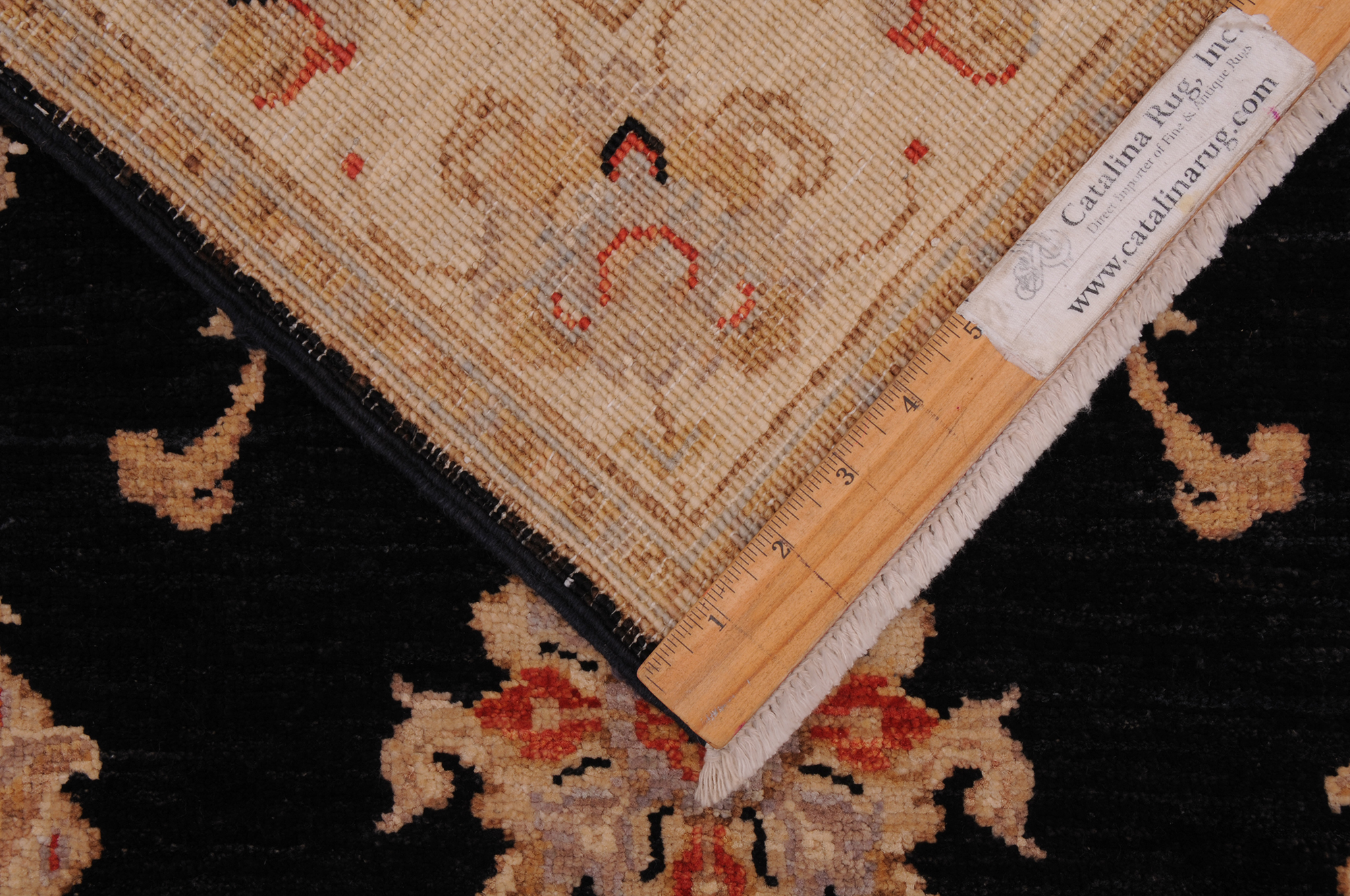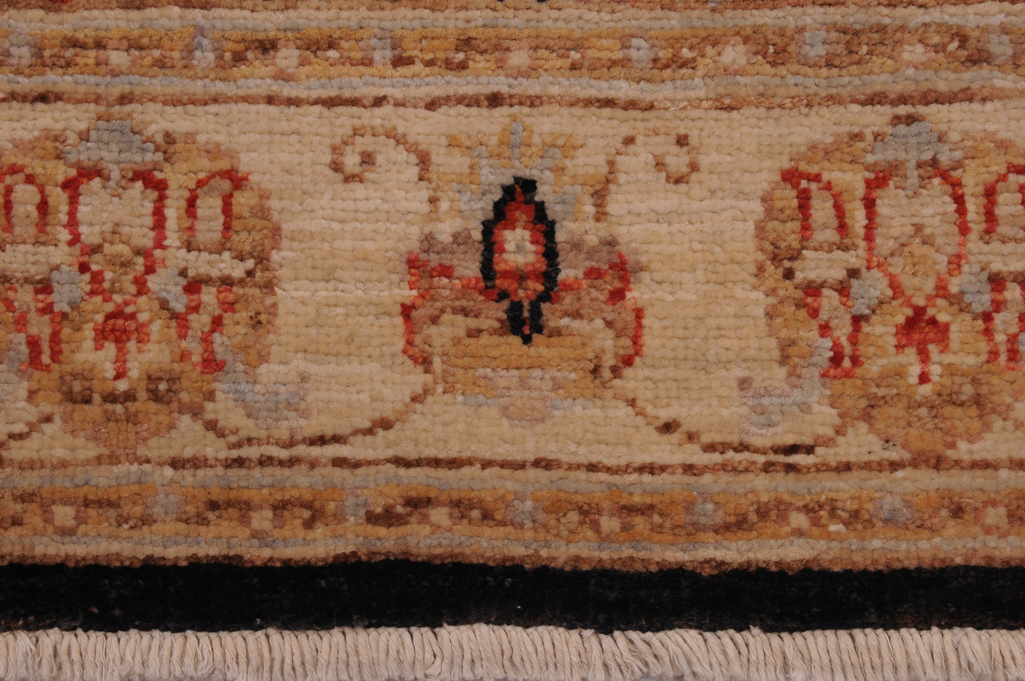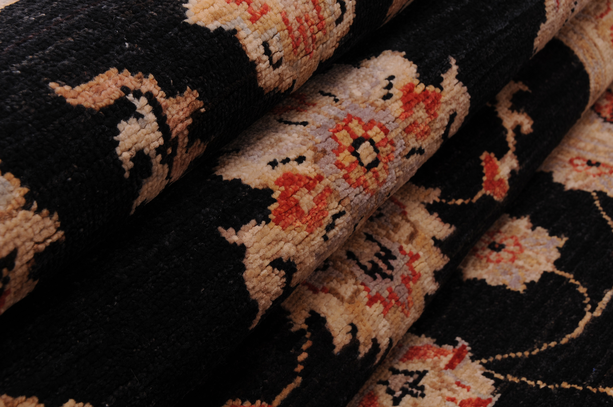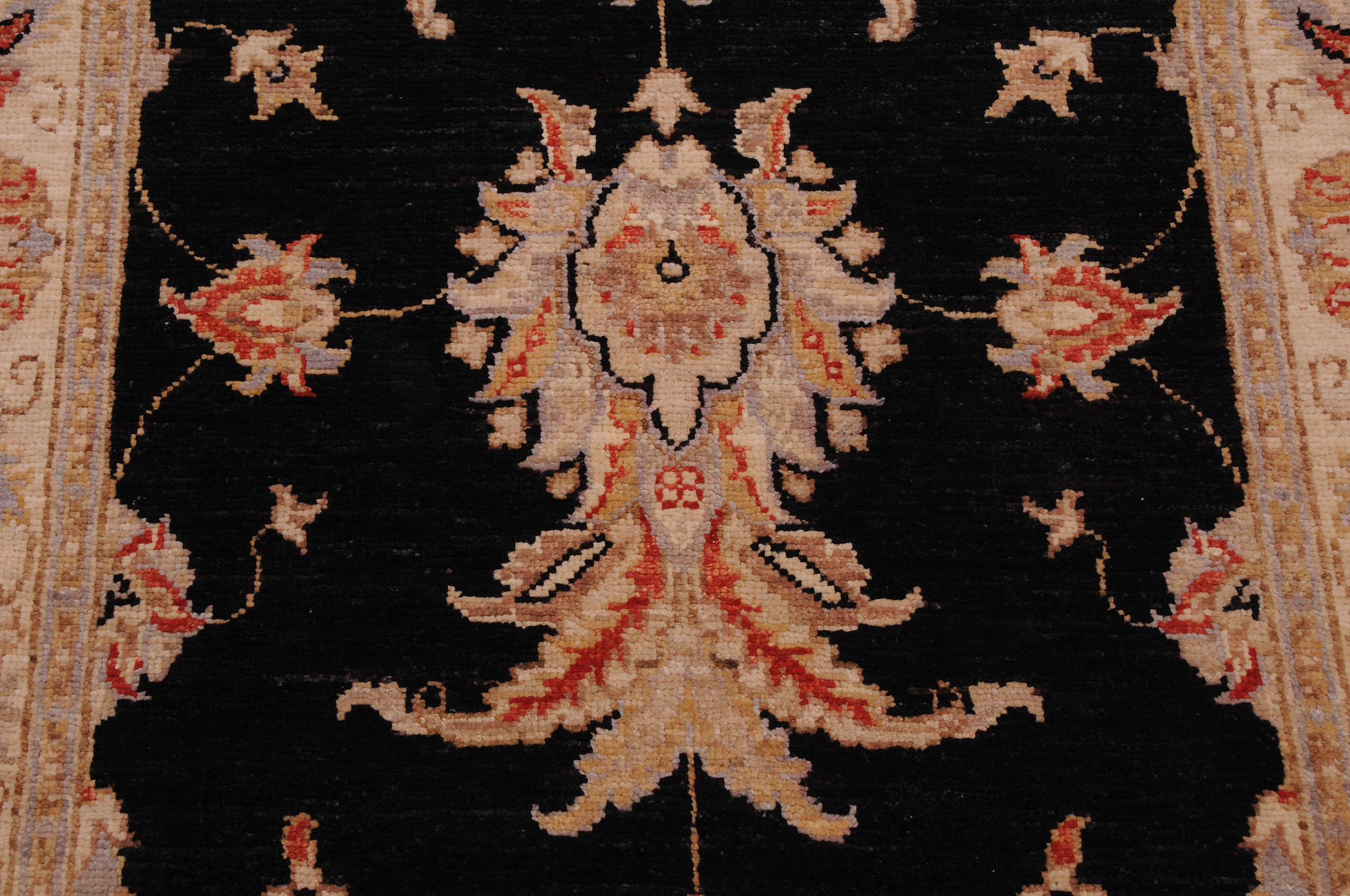 This 2’6″ x 10’0″ Oushak rug, hand-knotted in Afghan / Pakistan, features a allover design. It is woven with Approx. 156 KPSI, showcasing a field in Black and a Beige border. The rug has a Low Medium Pile and a 100% Wool pile, and is in excellent condition.