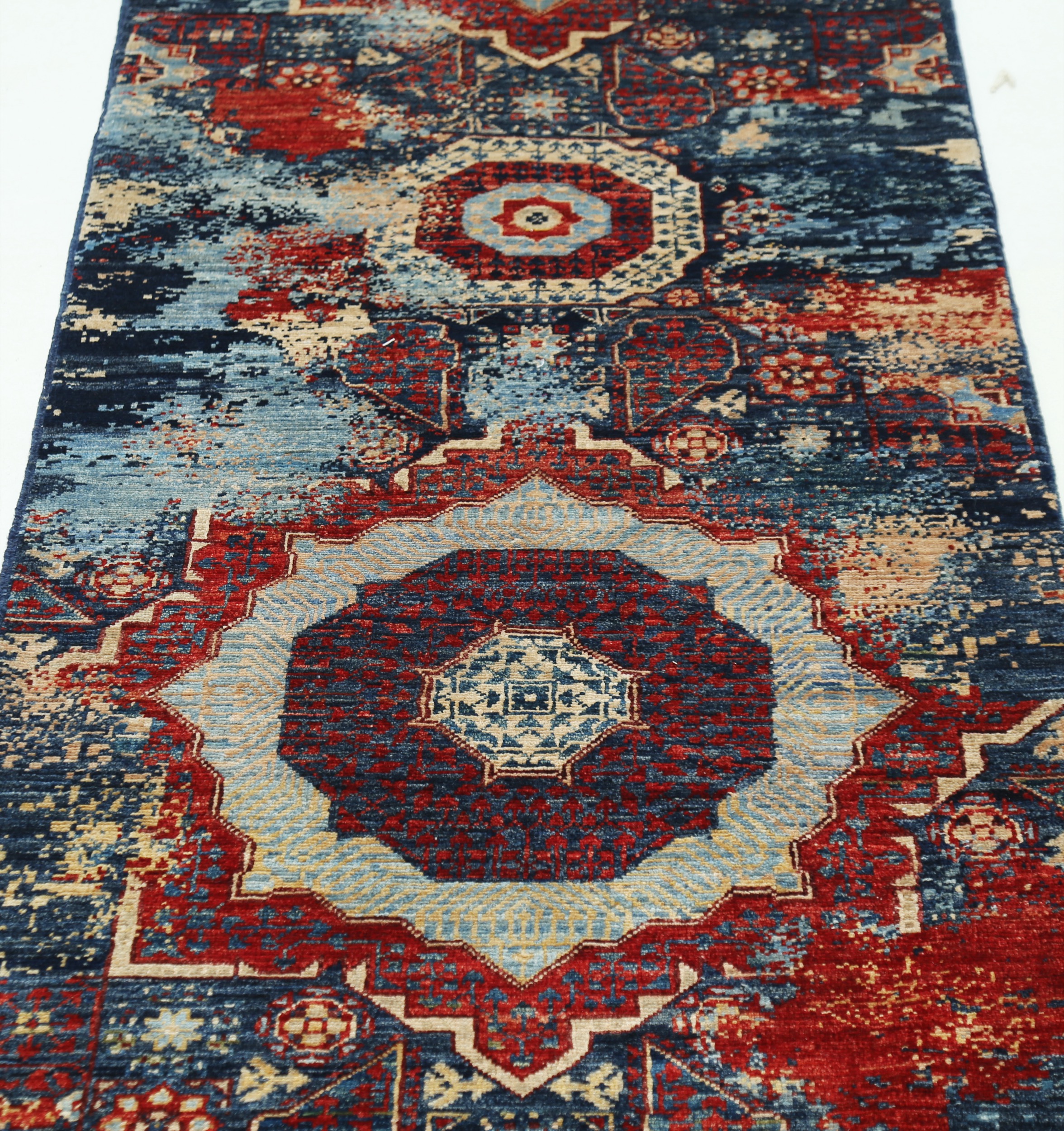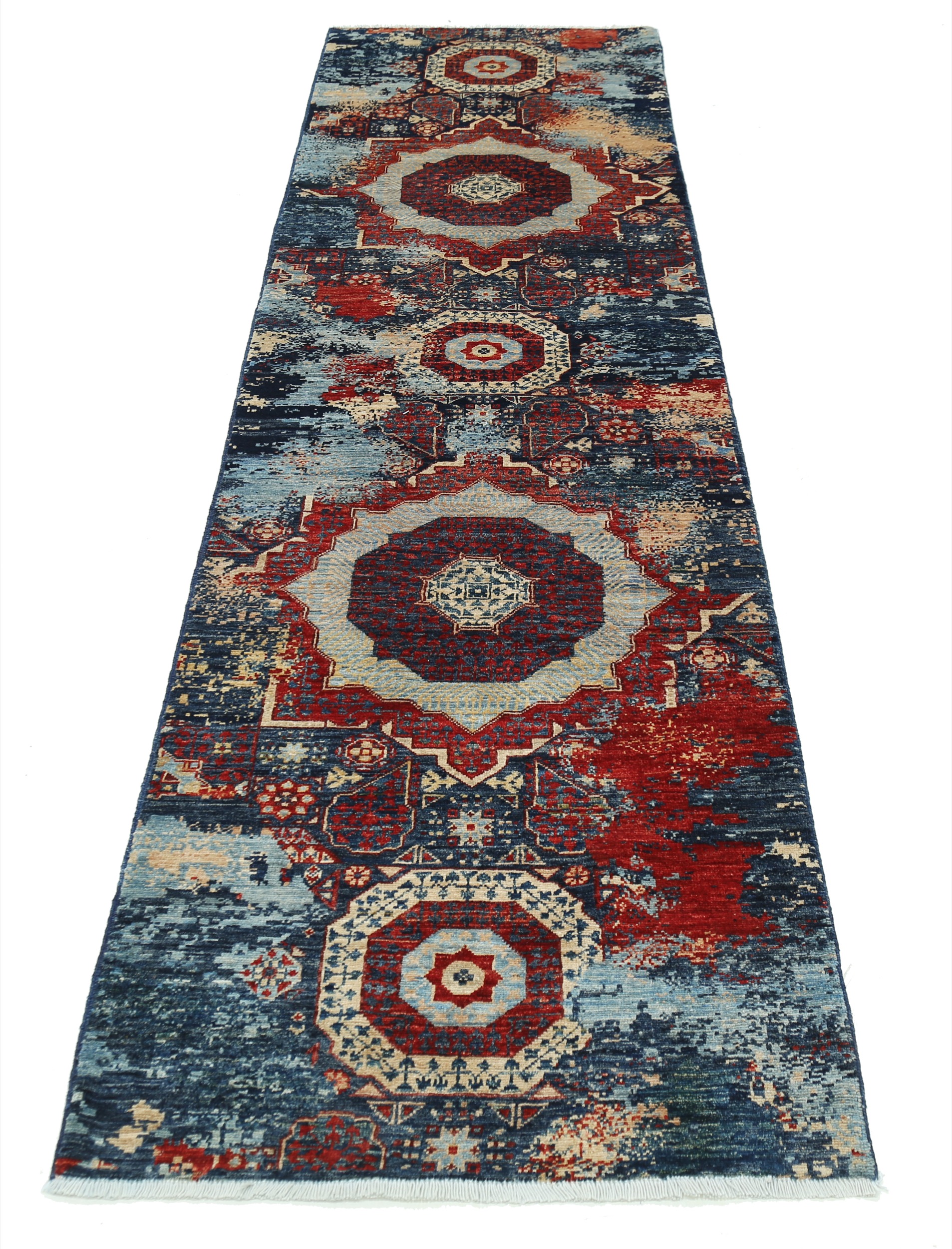 This 2’6″ x 9’7″ Kazak rug, hand-knotted in Afghan / Pakistan, features a geomertical design. It is woven with Approx. 156KPSI, showcasing a field in Red and a Blue border. The rug has a Low Medium Pile and a 100% Wool pile, and is in excellent condition.