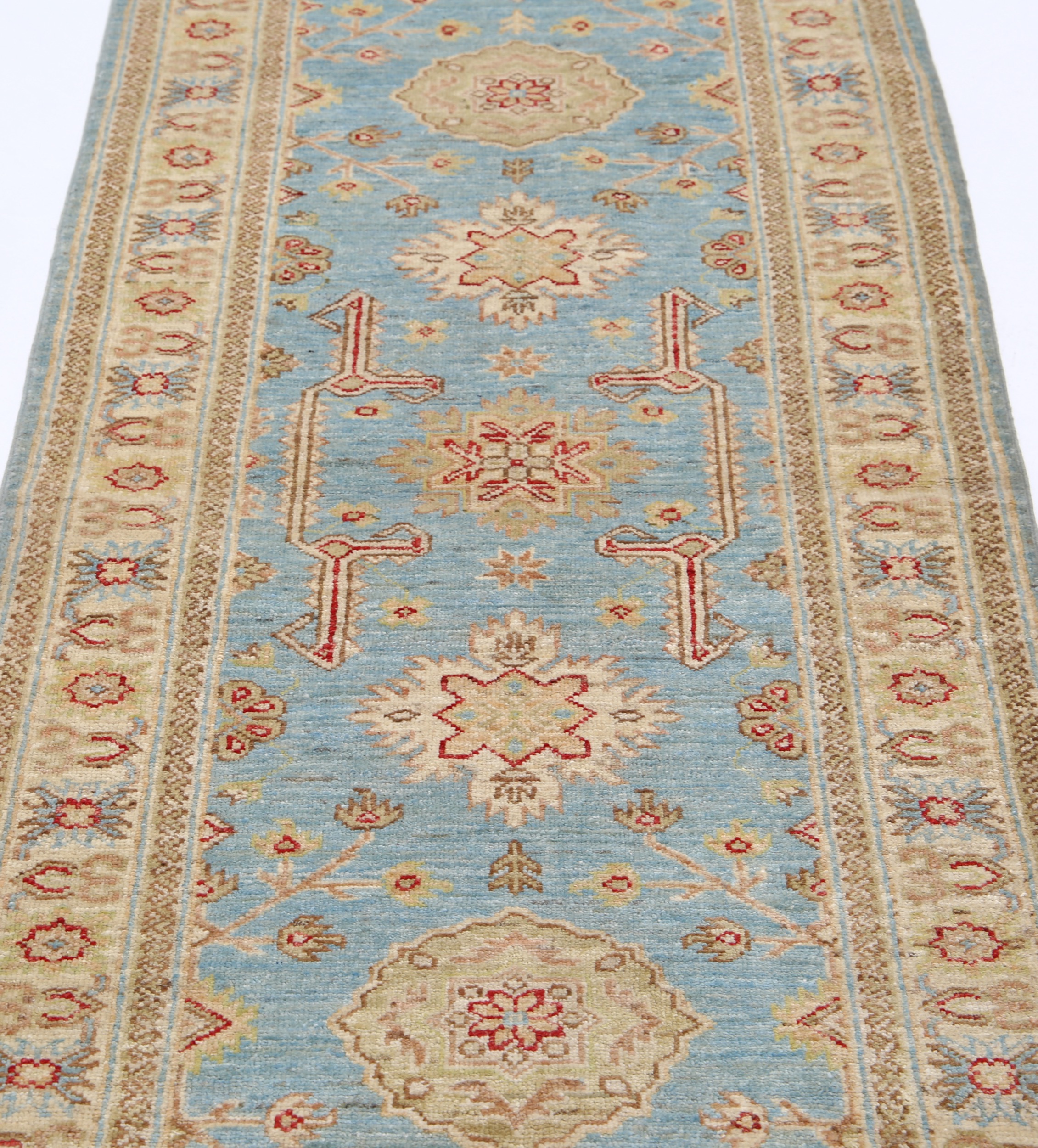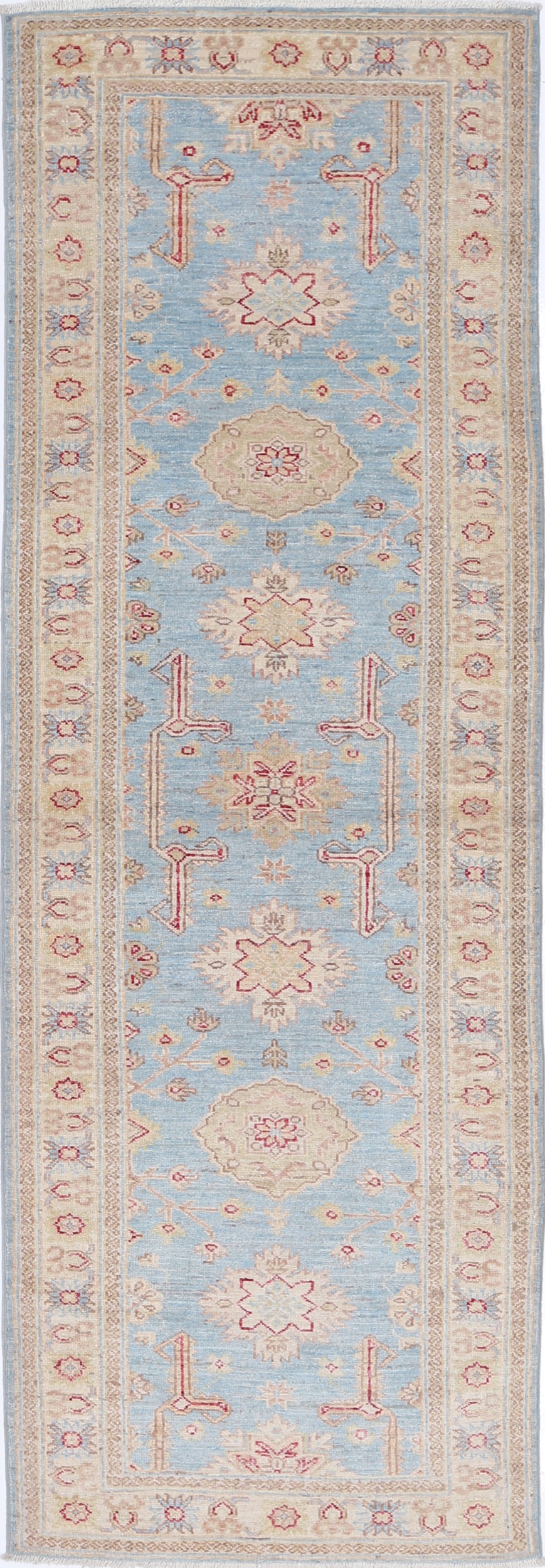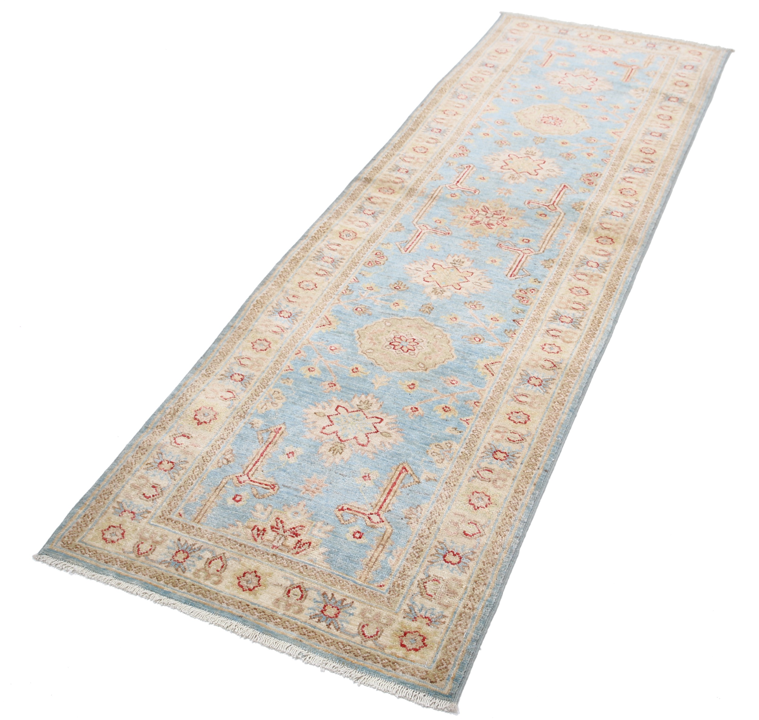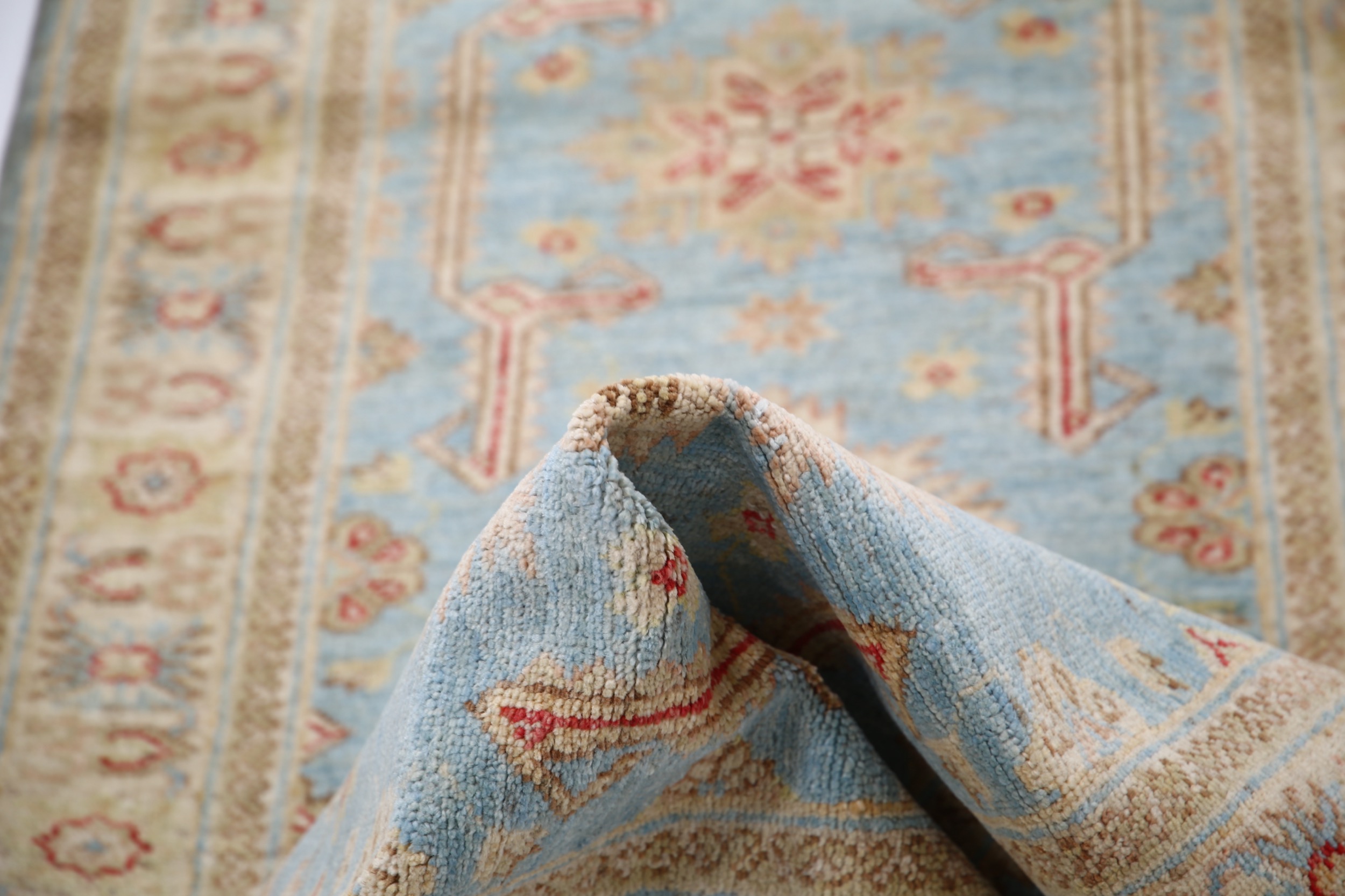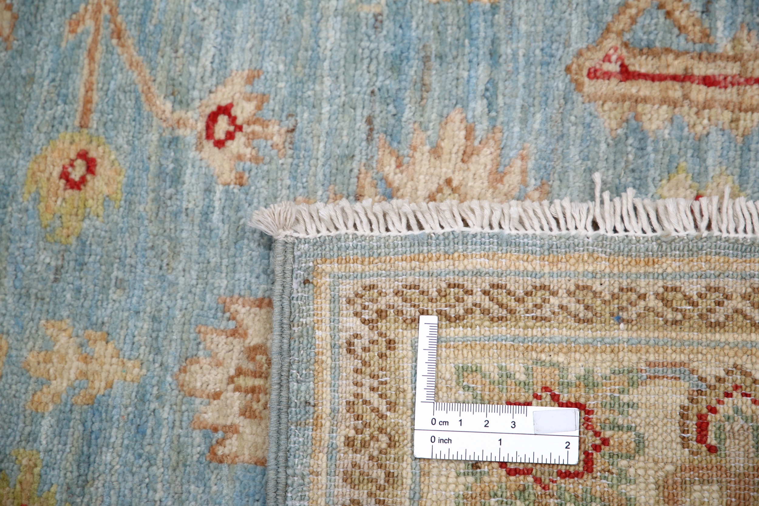 Authentic hand-knotted Oushak rug from Afghanistan/Pakistan. This beautiful 2’7″ x 7’11” (approx. 3×8) rug features a captivating blue and green/yellow/beige allover design. Made of 100% wool with a low-medium pile (1/4″-1/3″), it boasts approximately 156 knots per square inch. A stunning addition to any room.