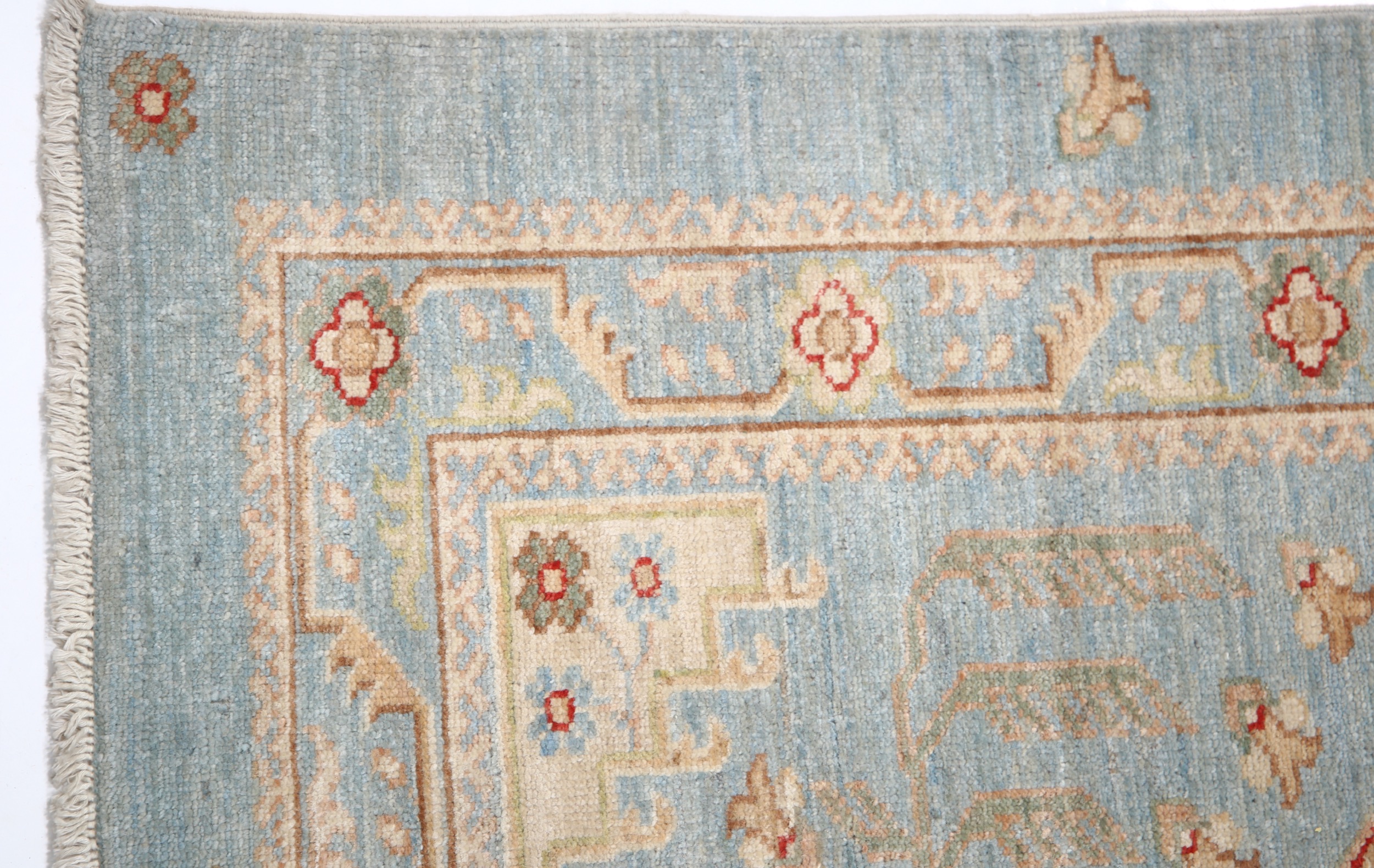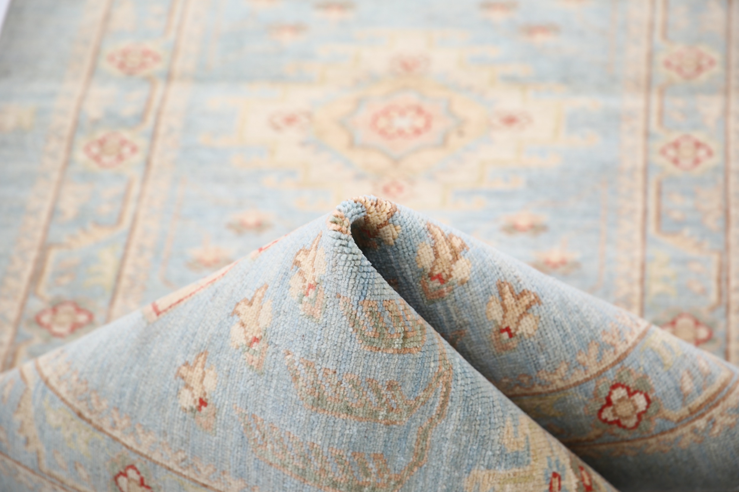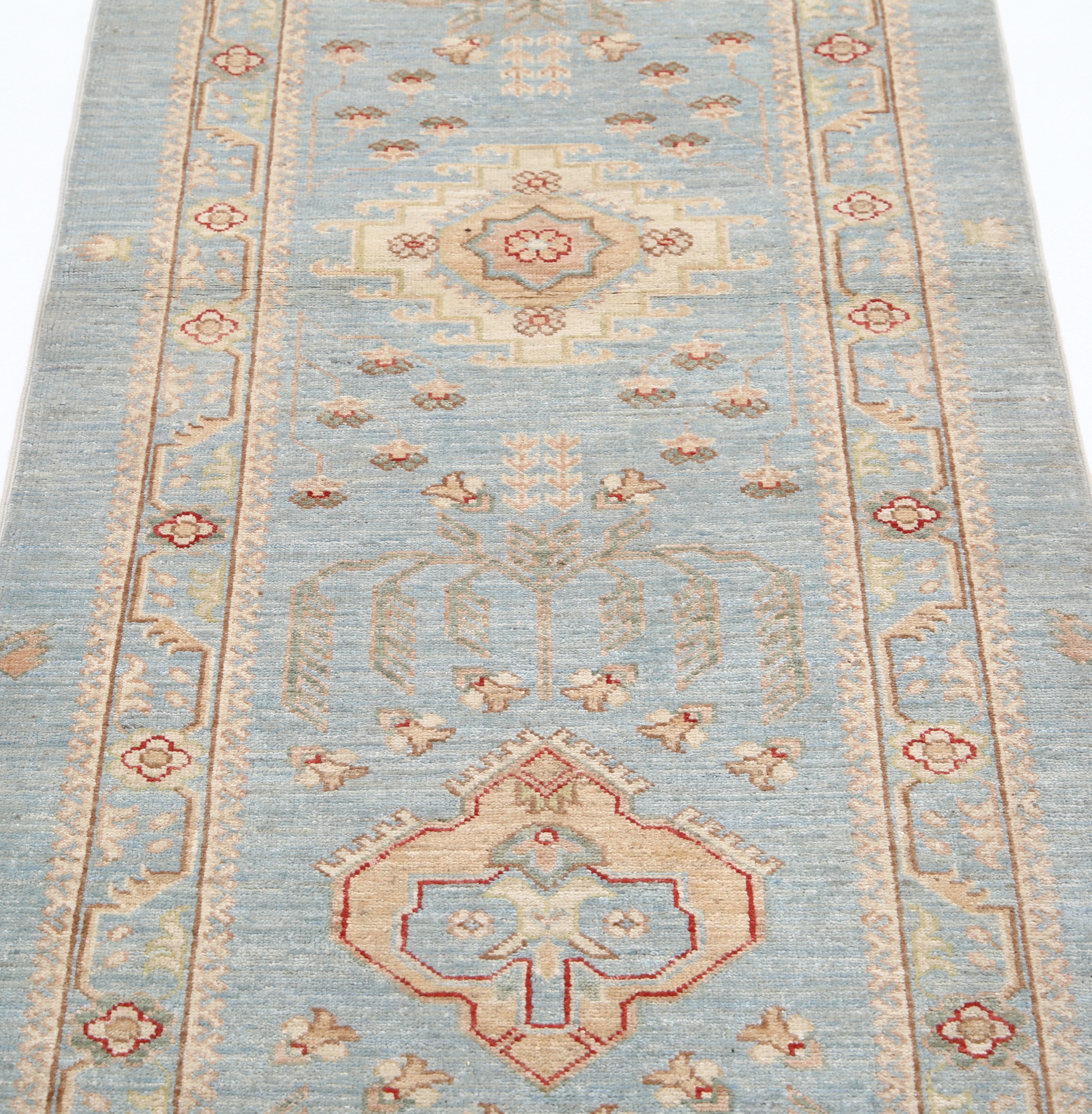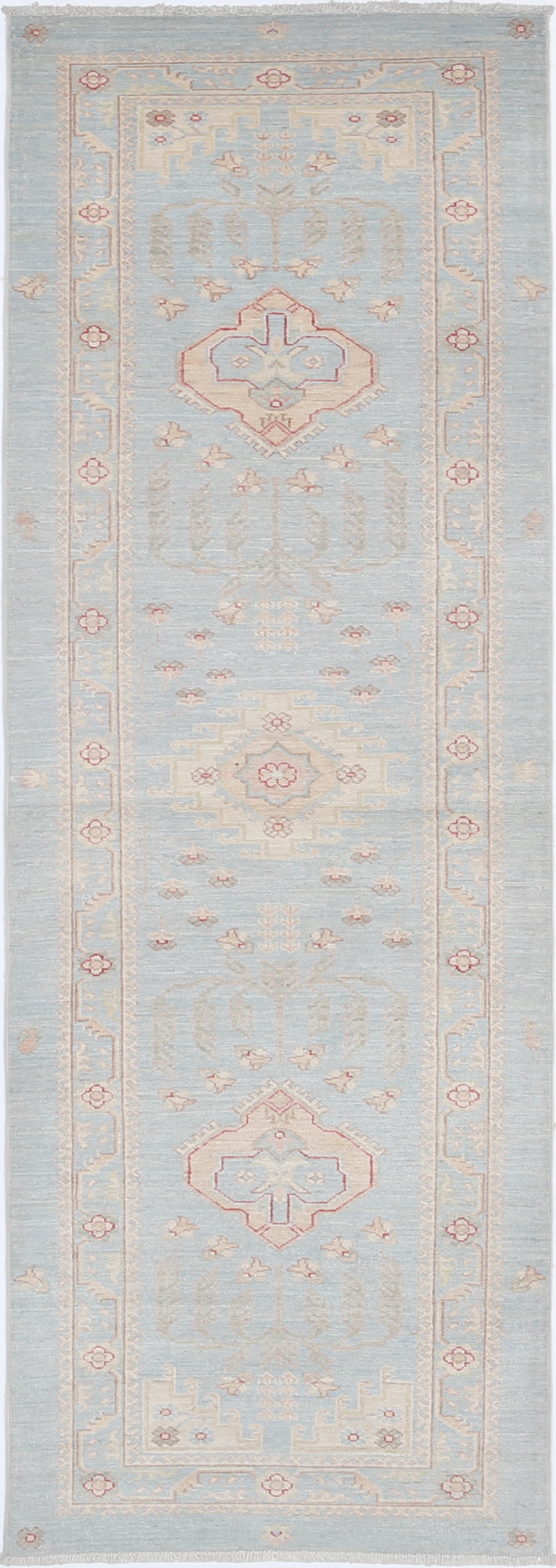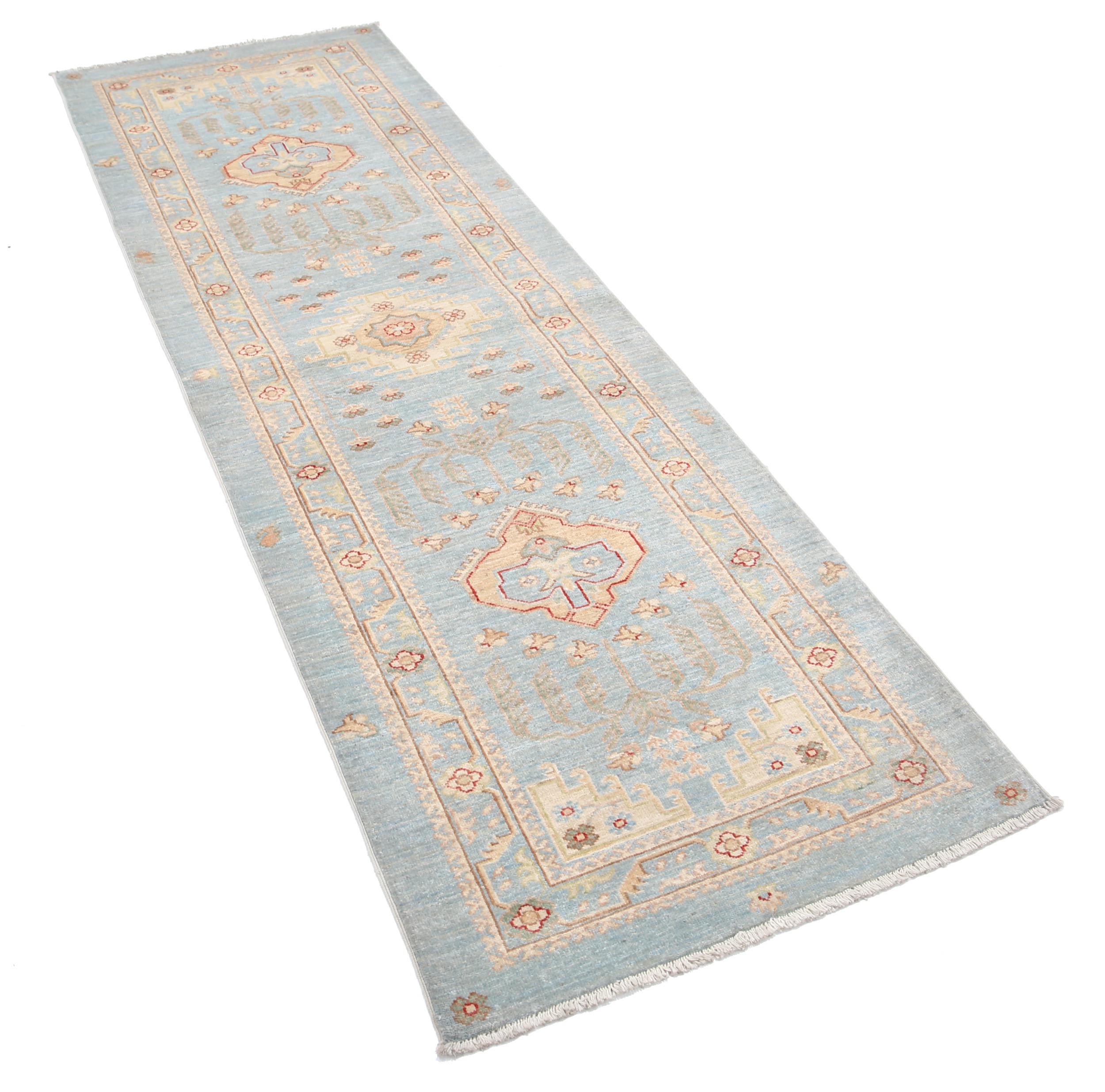 Authentic hand-knotted Oushak rug from Afghanistan/Pakistan. This beautiful 2’7″ x 7’7″ (approx. 3×8) rug features a captivating blue and green/yellow/beige allover design. Made of 100% wool with a low-medium pile (1/4″-1/3″), it boasts approximately 156 knots per square inch. A stunning addition to any room.