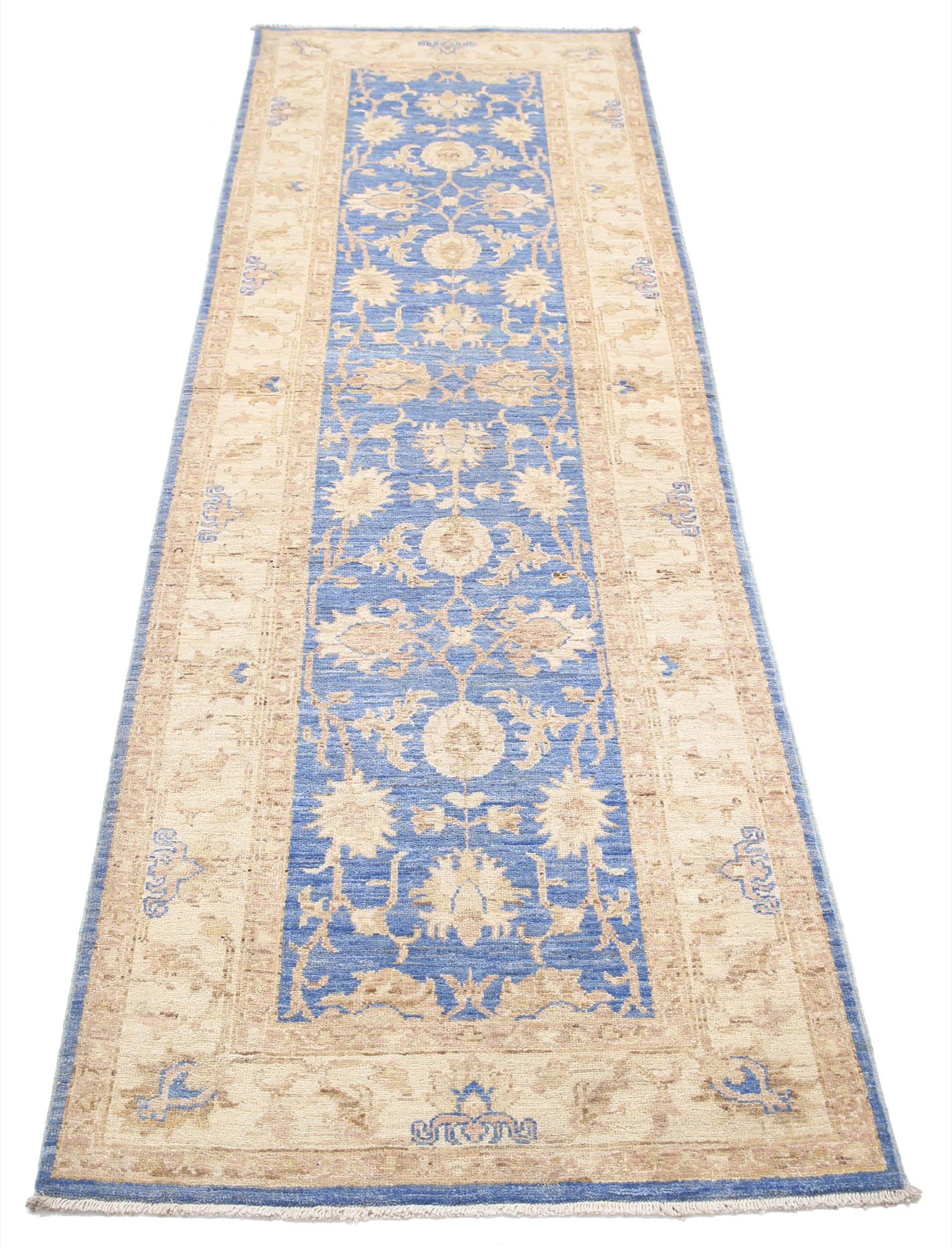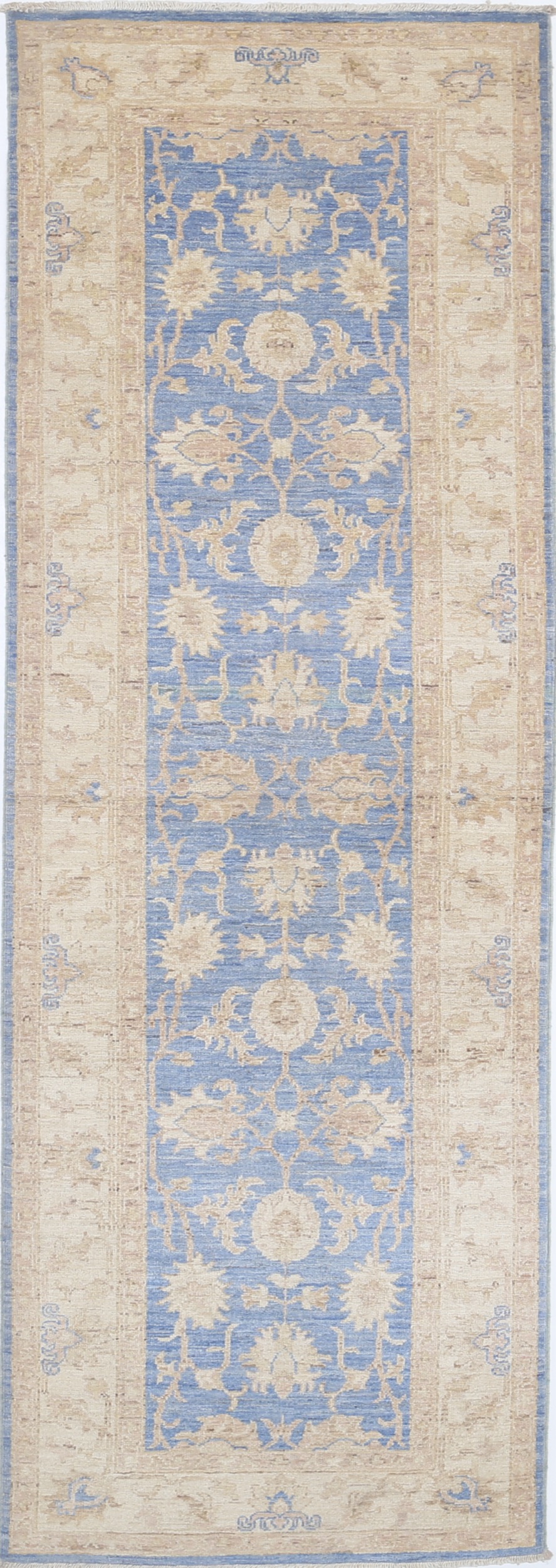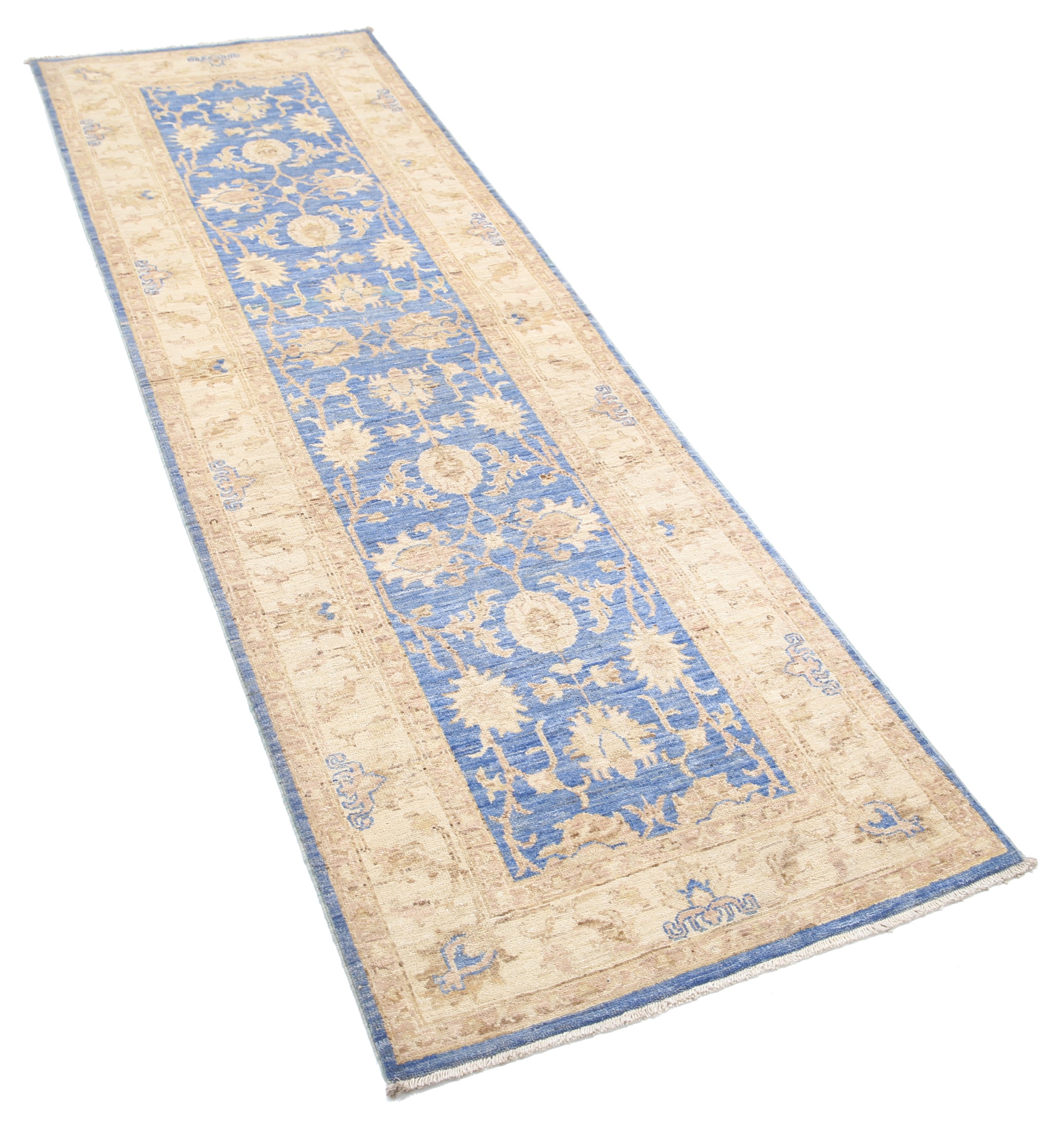 Authentic Oushak hand-knotted rug (2’8″ x 8’1″), crafted in Afghanistan/Pakistan. Features a beautiful floral design in shades of blue, beige, and green/brown on a low-medium pile (1/4″-1/3″). Made from 100% wool with a cotton foundation. Approx. 156 KPSI. New condition.