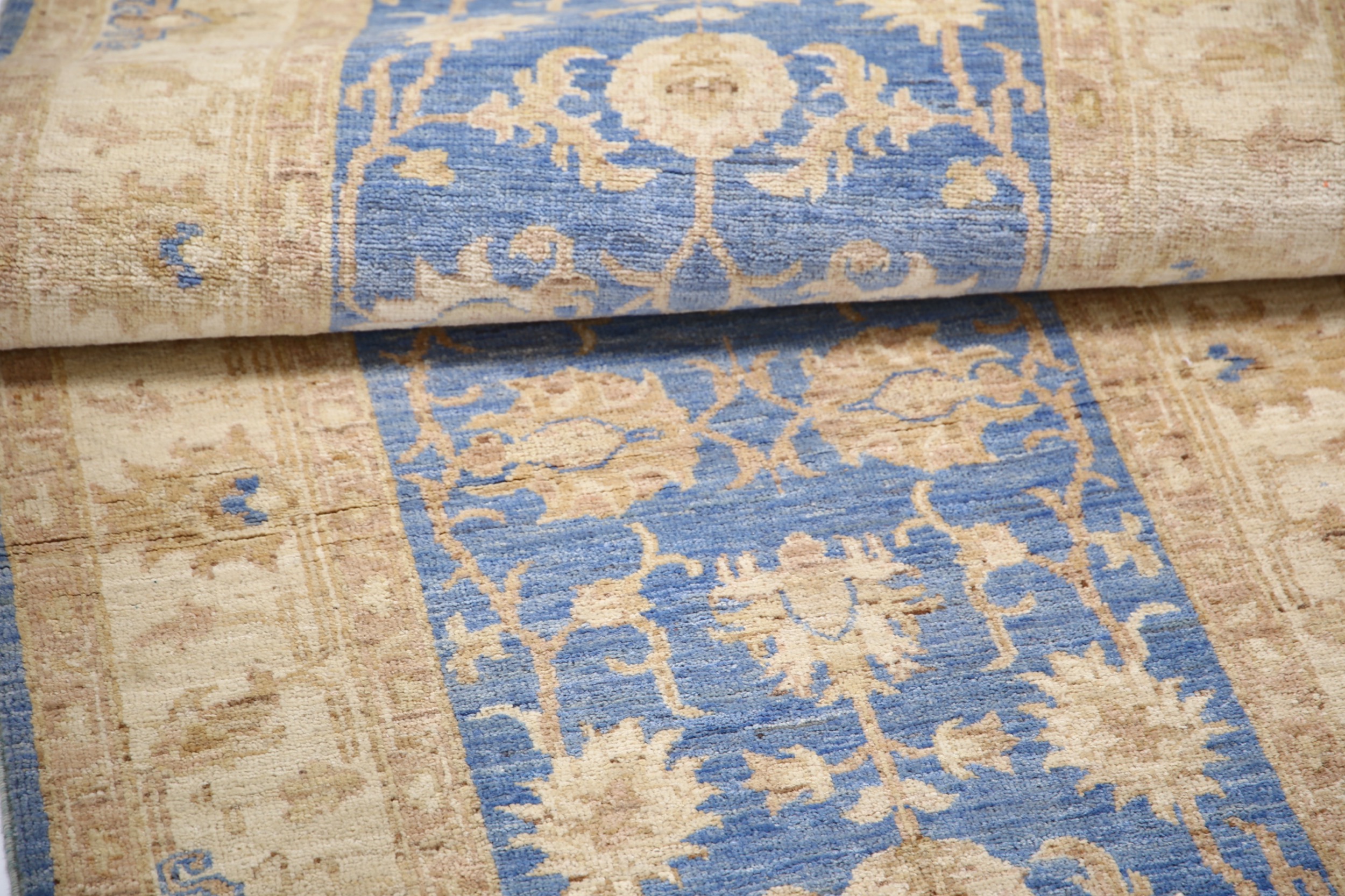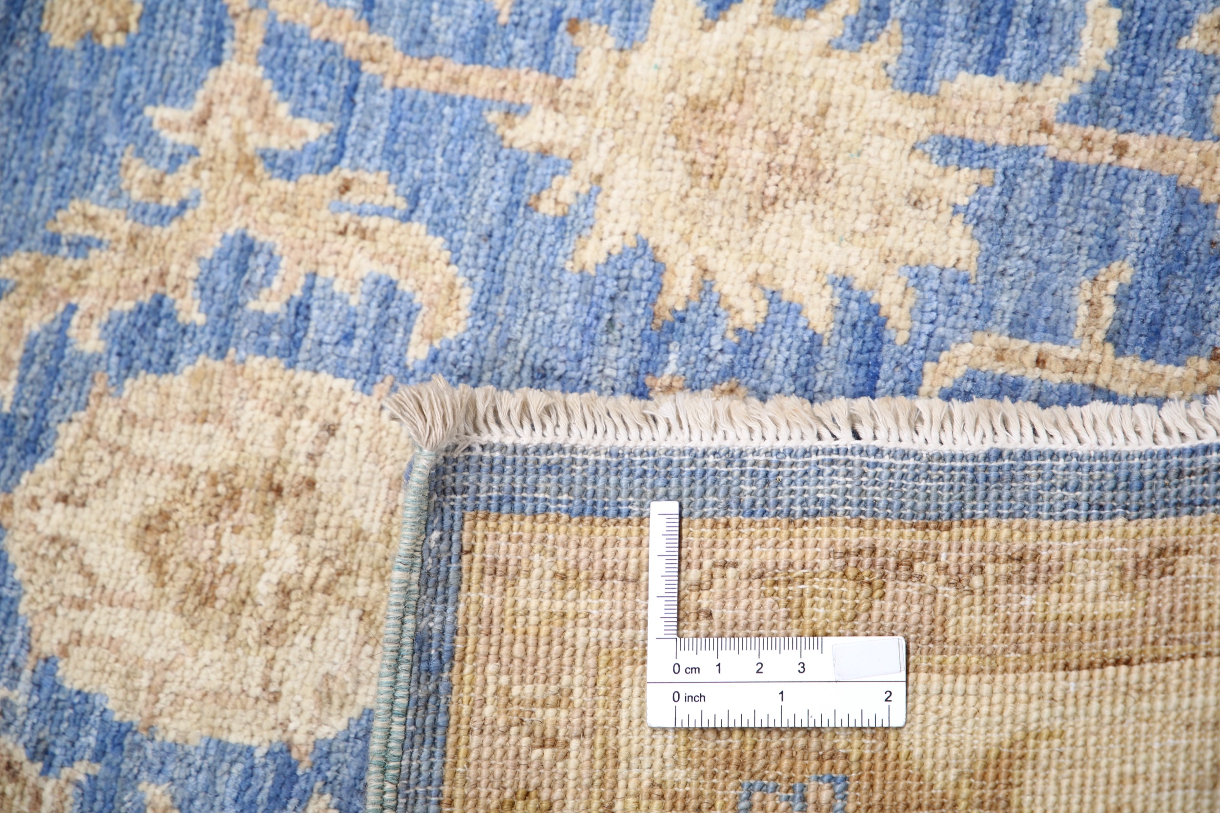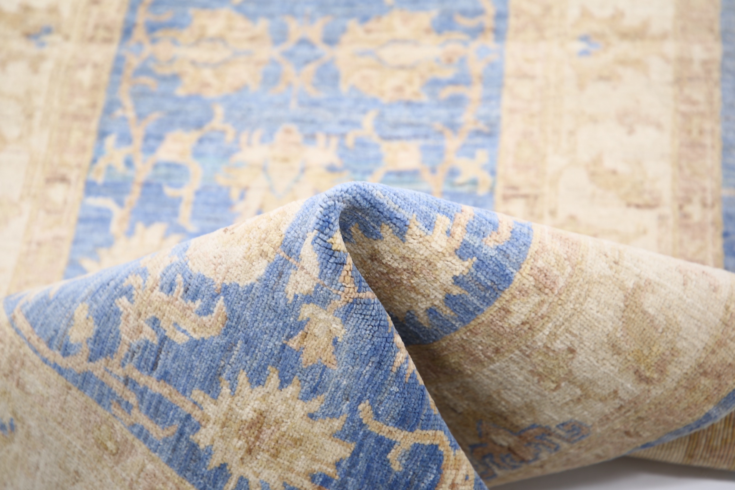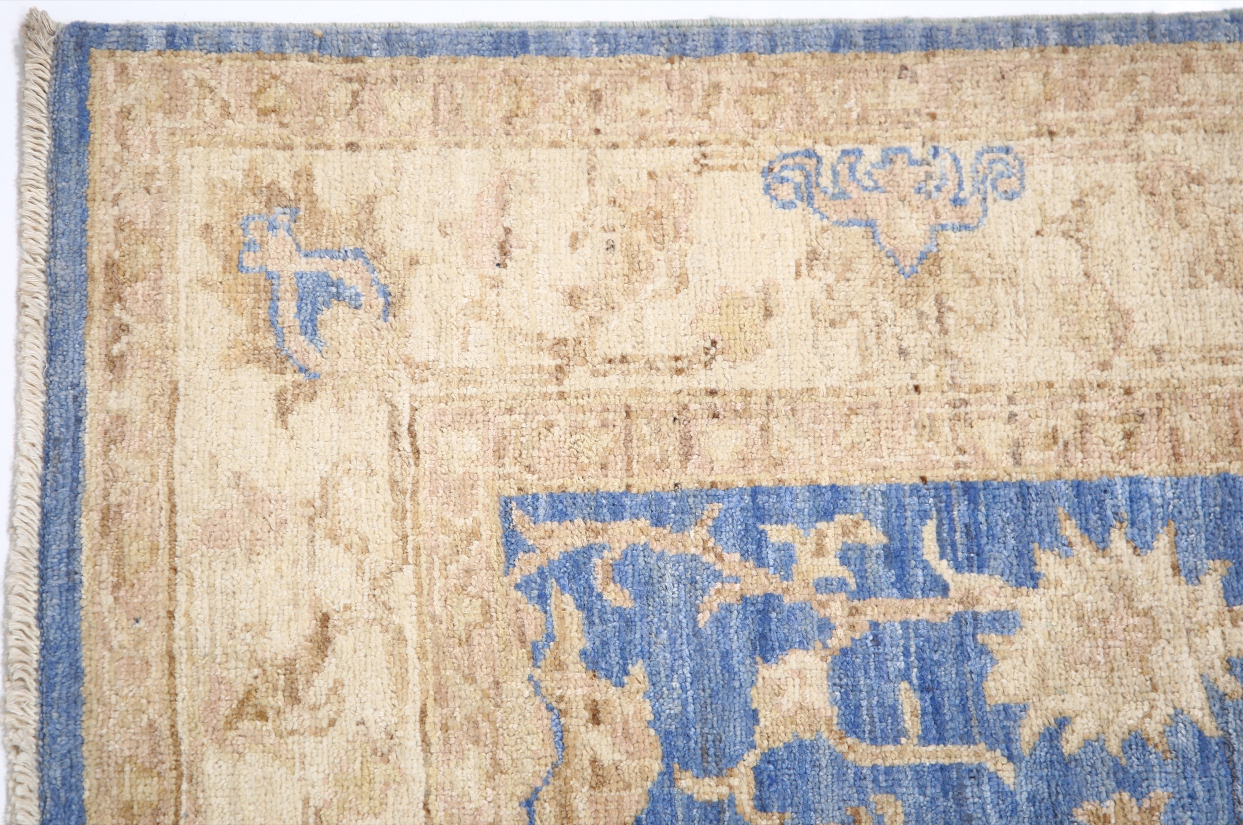 Authentic Oushak hand-knotted rug (2’8″ x 8’1″), crafted in Afghanistan/Pakistan. Features a beautiful floral design in shades of blue, beige, and green/brown on a low-medium pile (1/4″-1/3″). Made from 100% wool with a cotton foundation. Approx. 156 KPSI. New condition.
