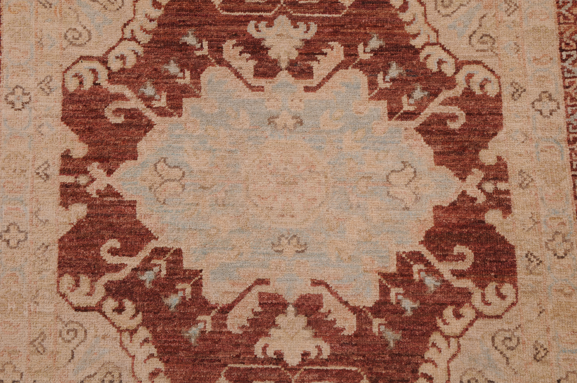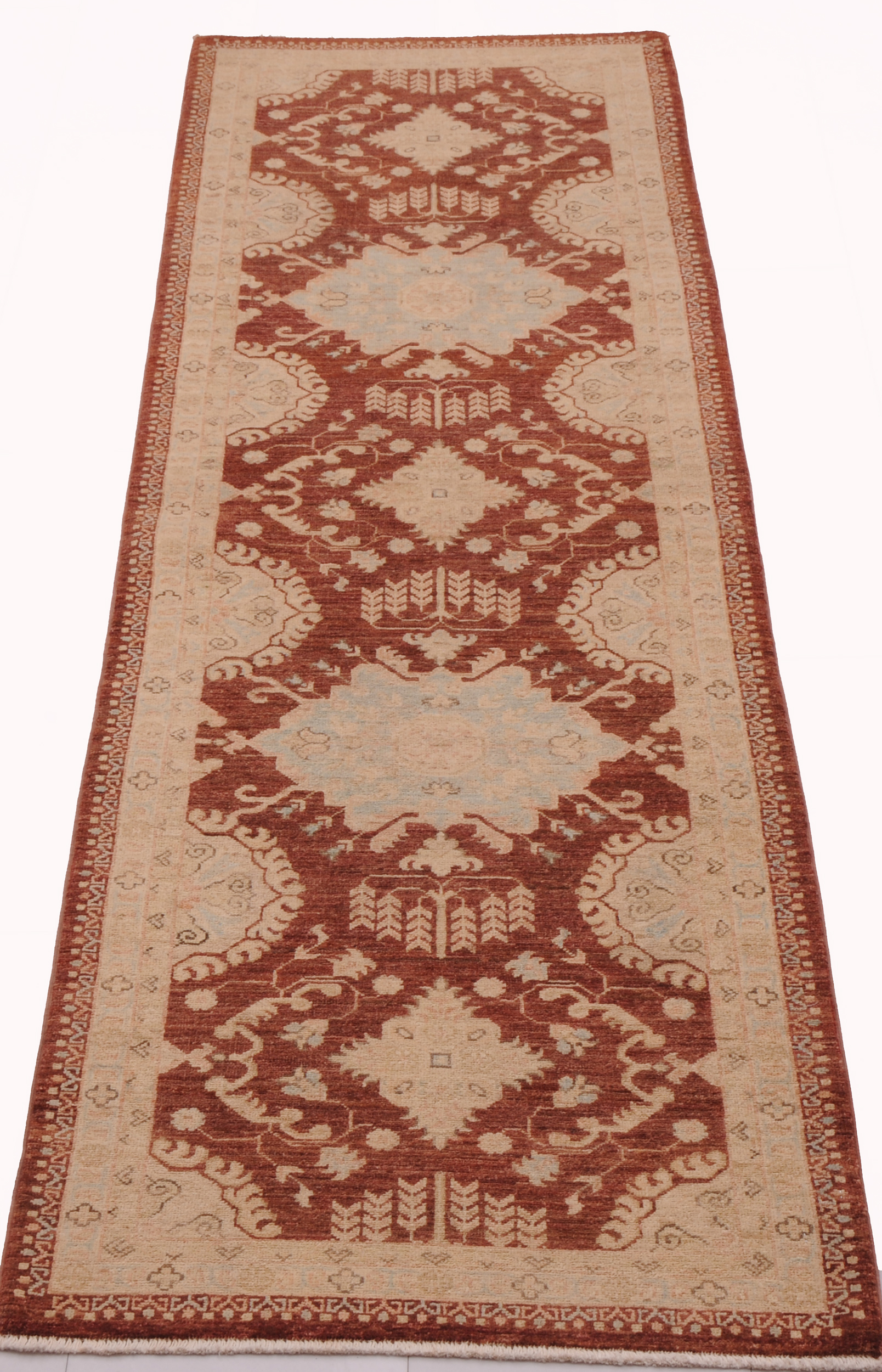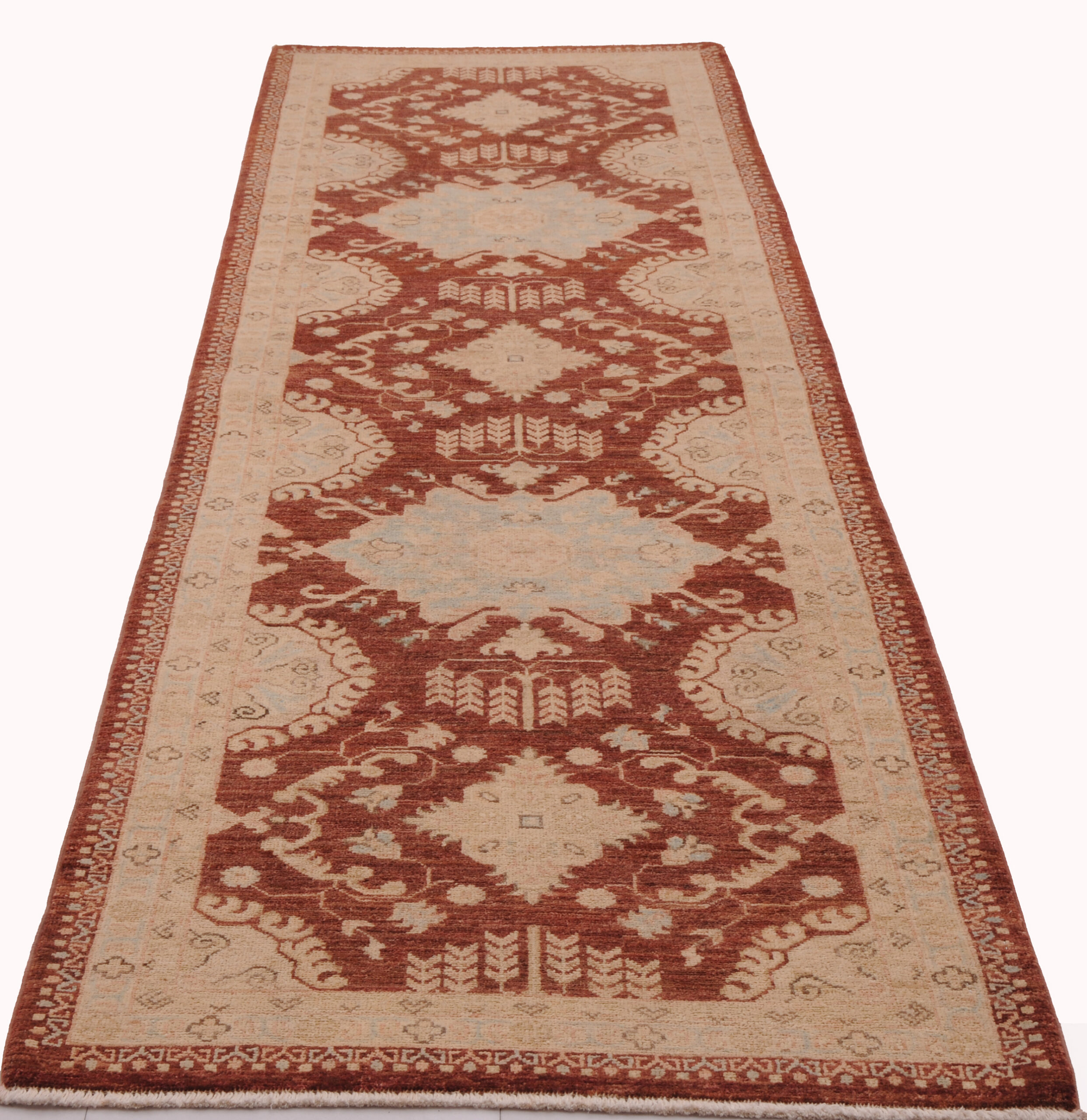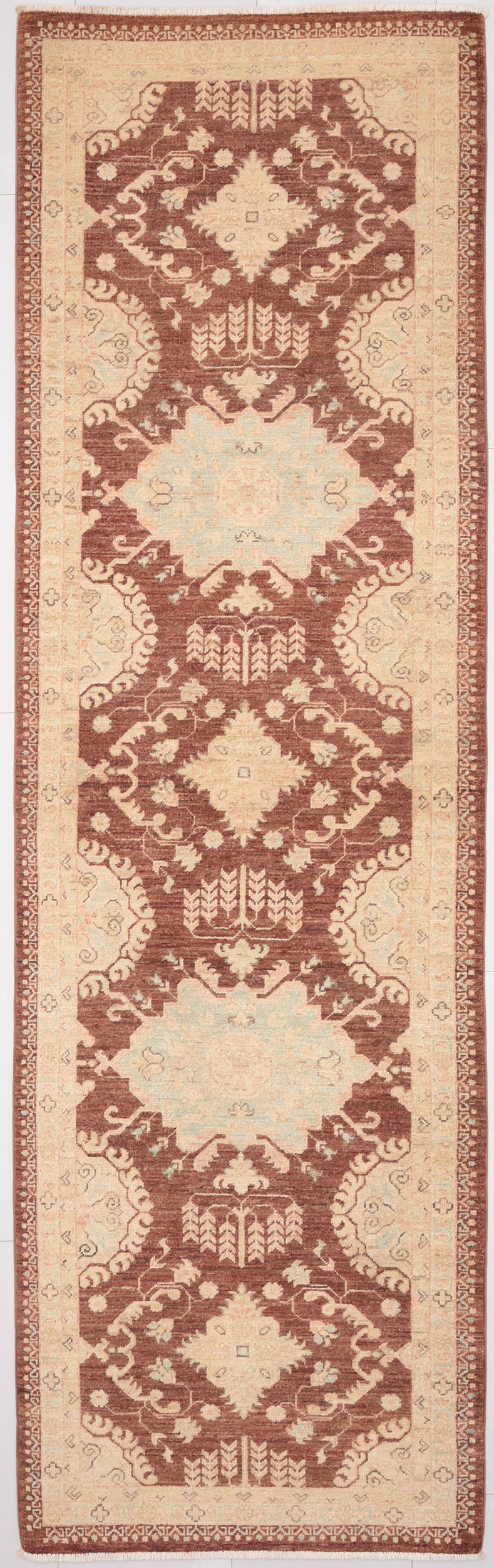 This exquisite 2’8″ x 8’10” Oushak rug from Afghan / Pakistan showcases a timeless allover pattern. Hand-knotted with 100% wool on a cotton foundation, it features a brown field and blue border. The allover design adds an elegant character to any space.