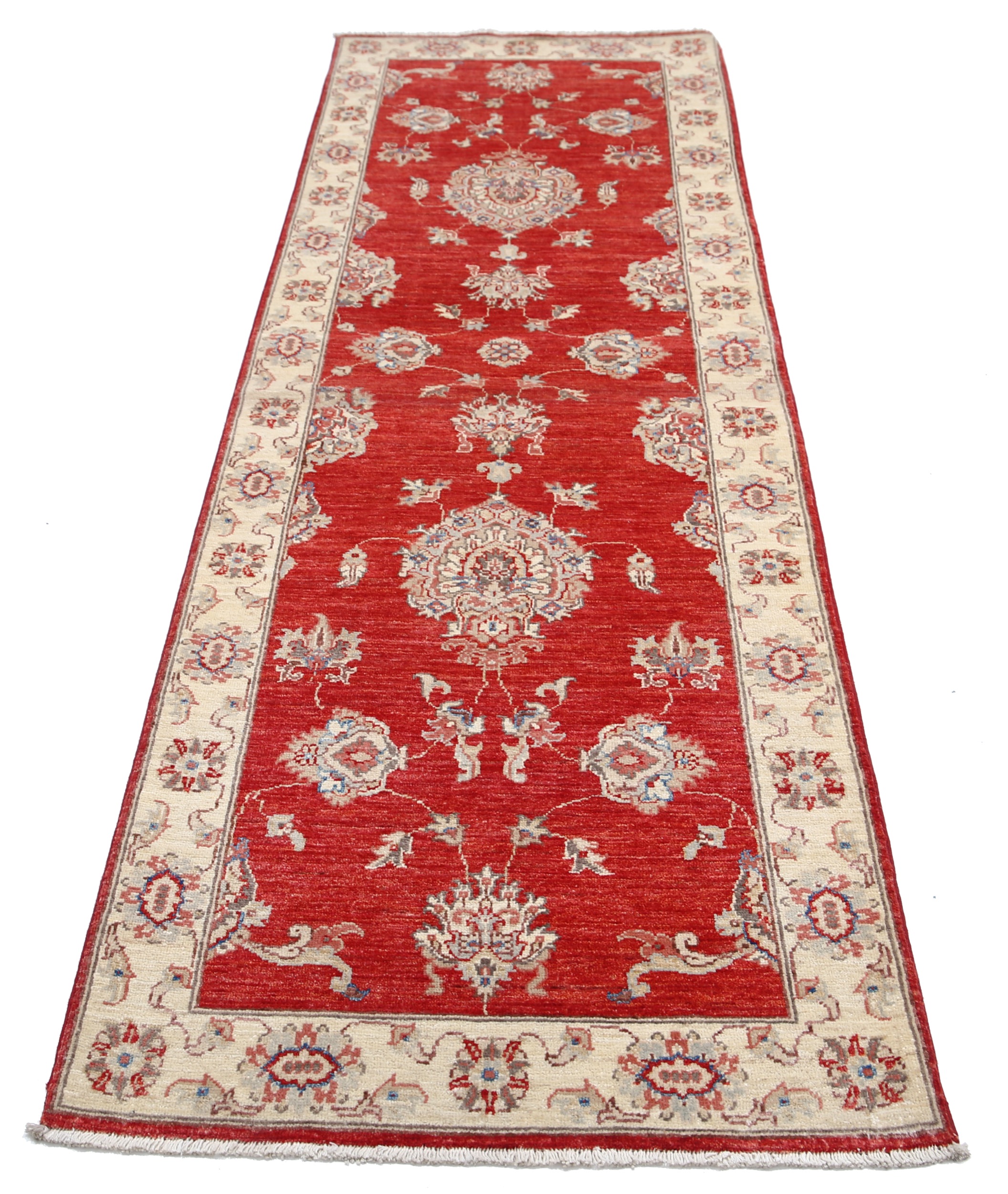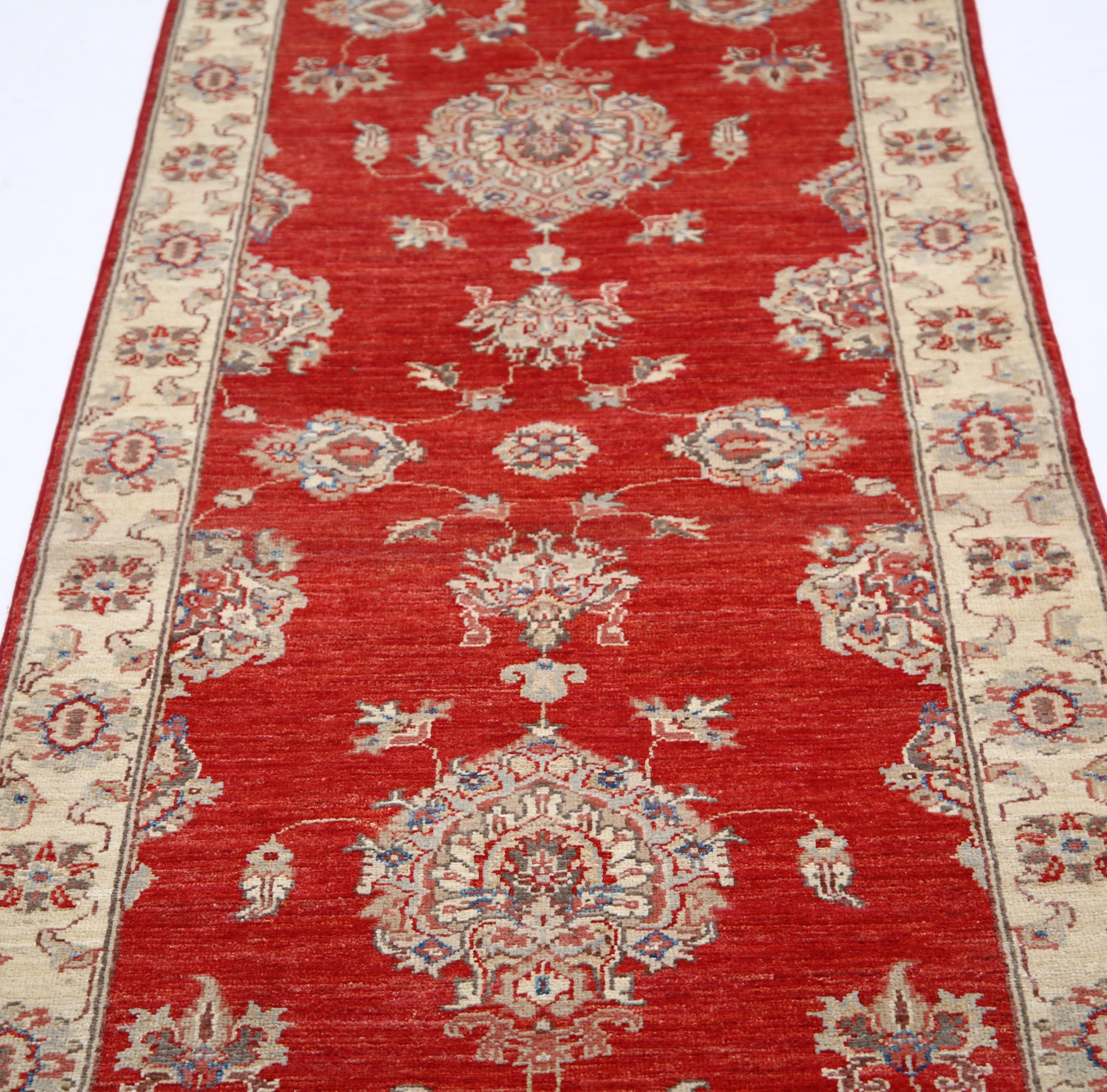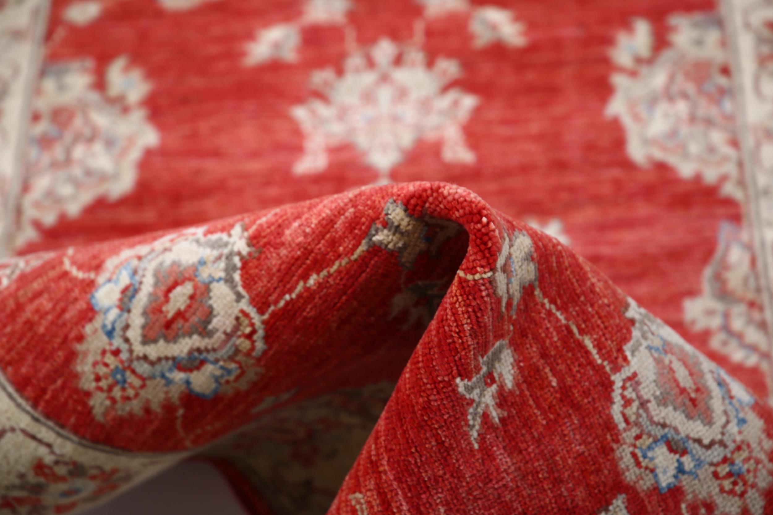 This 2’8″ x 8’6″ Oushak rug, hand-knotted in Afghan / Pakistan, features a floral design. Crafted with approx. 156 kpsi, its field color is Red with a Beige border. The rug has a low medium pile 1/4″-1/3″ and a 100% wool pile, in excellent & washed condition.