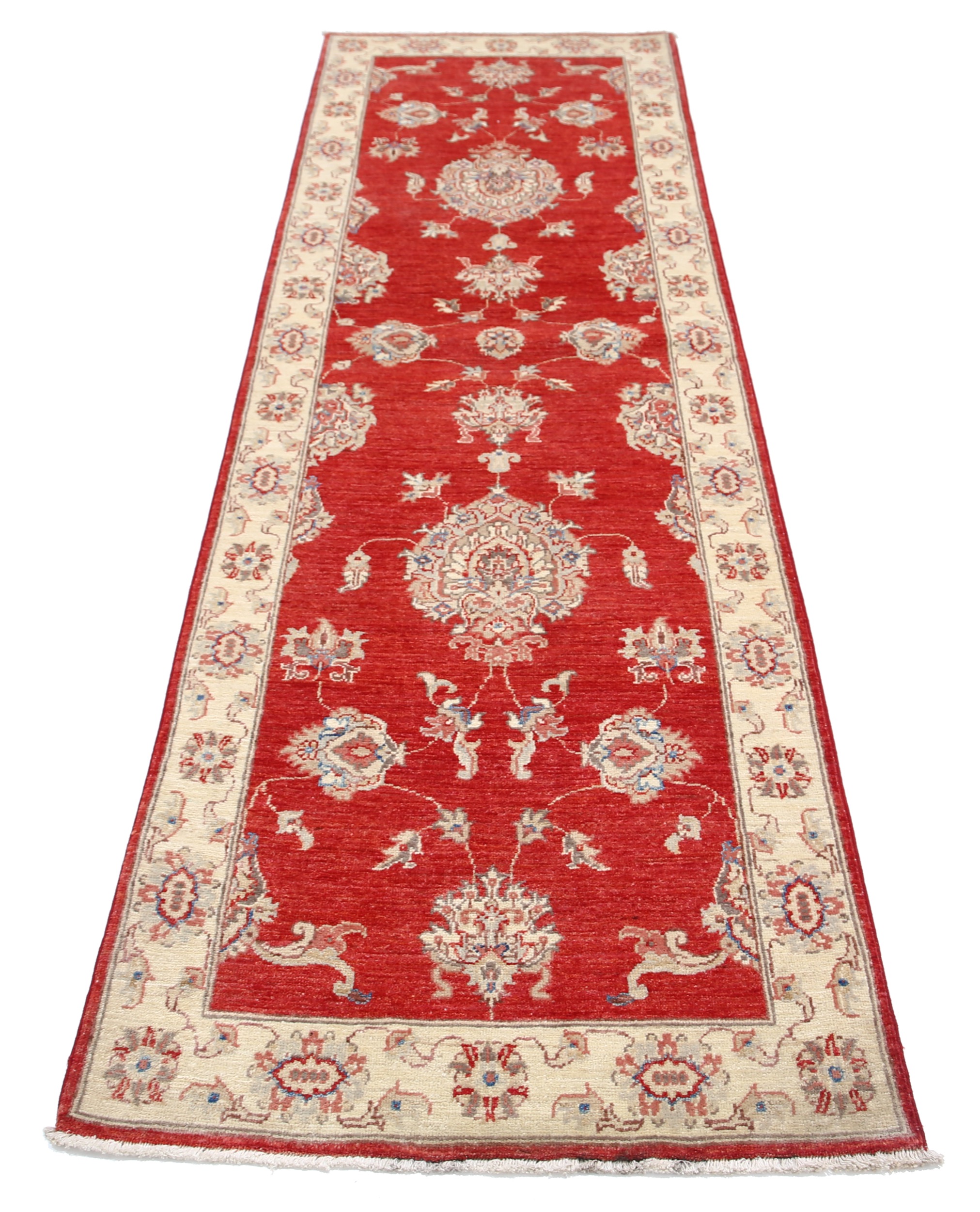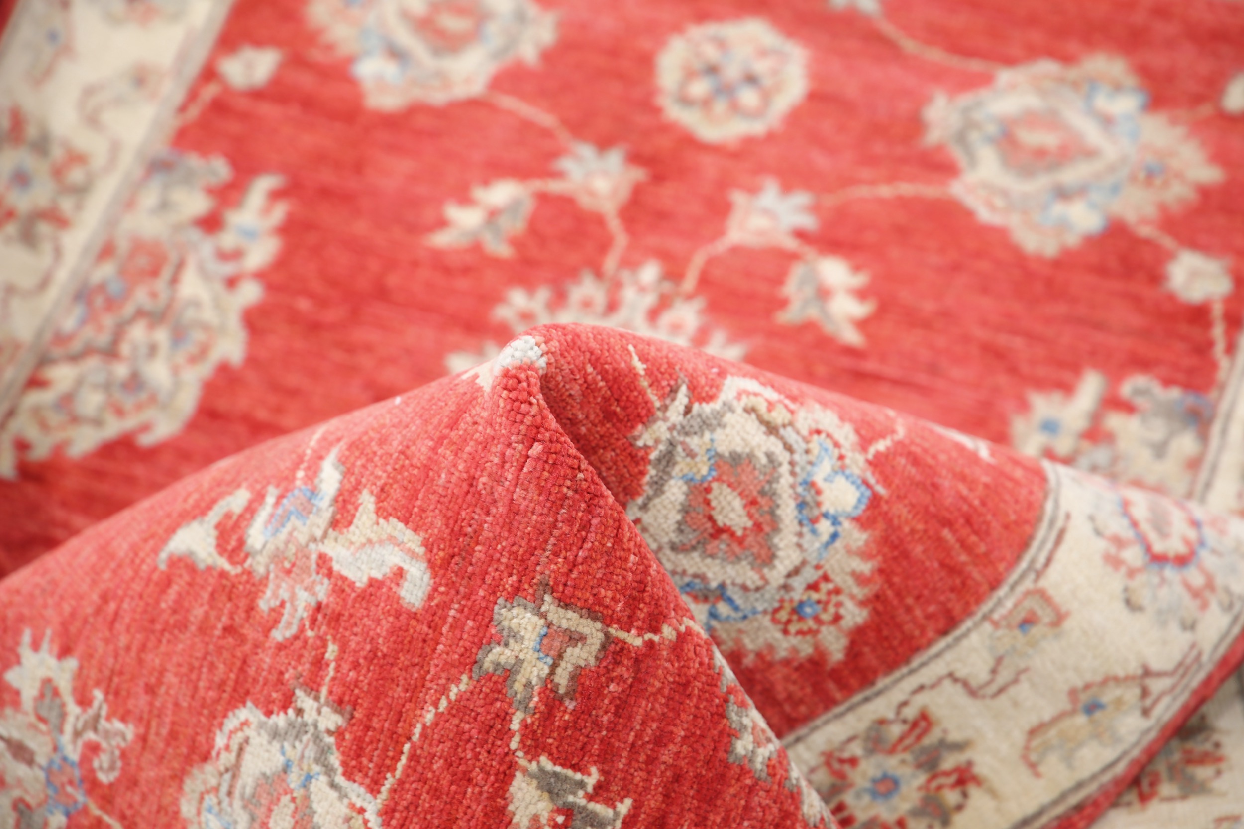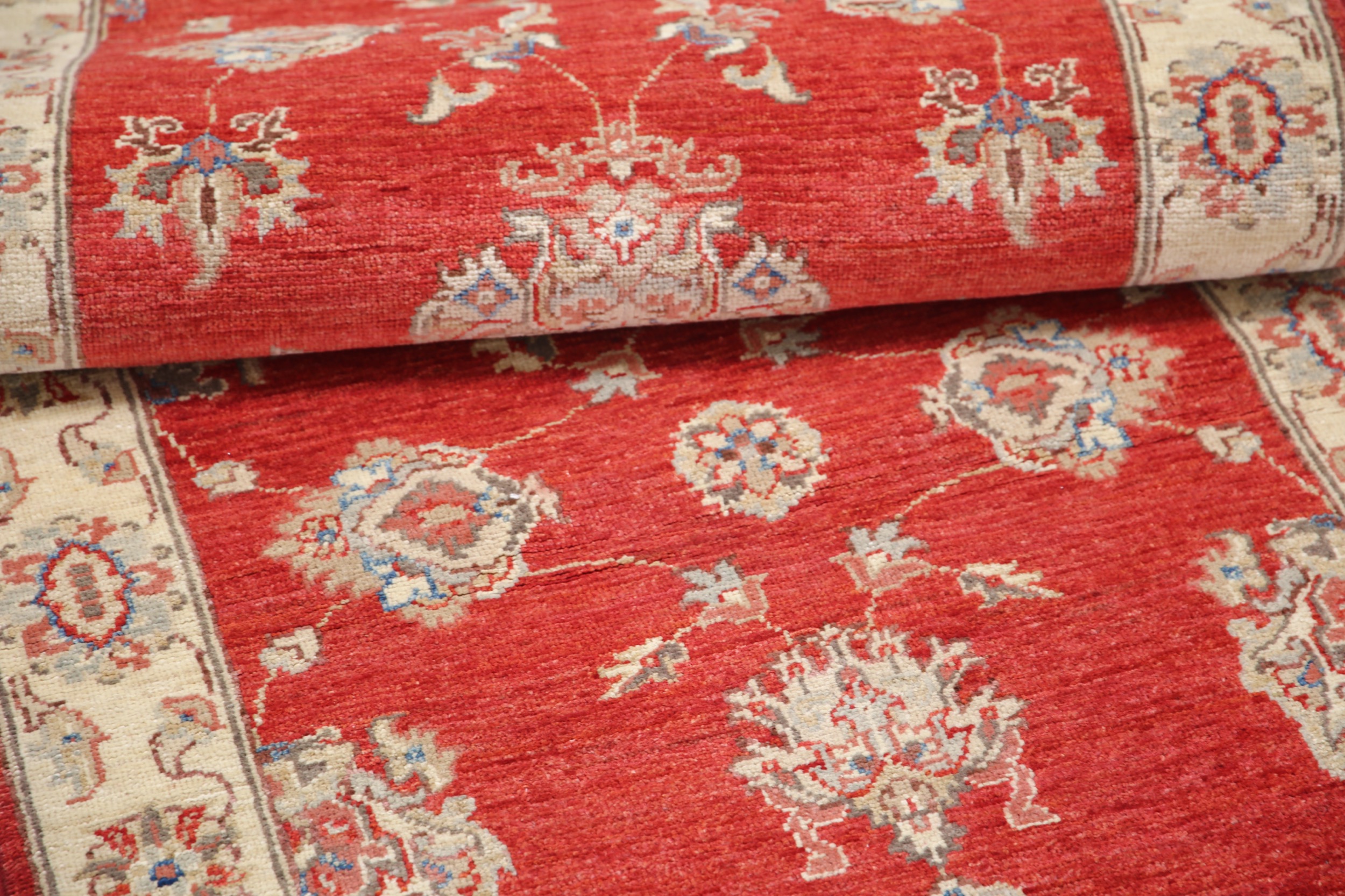 Authentic Oushak hand-knotted rug (2’8″ x 8’7″), crafted in Afghanistan/Pakistan. This 3×9 rug features a stunning floral design in red, beige, peach, blue, and brown, with a low-medium pile (1/4″-1/3″). Approx. 156 KPSI. 100% wool. New condition.