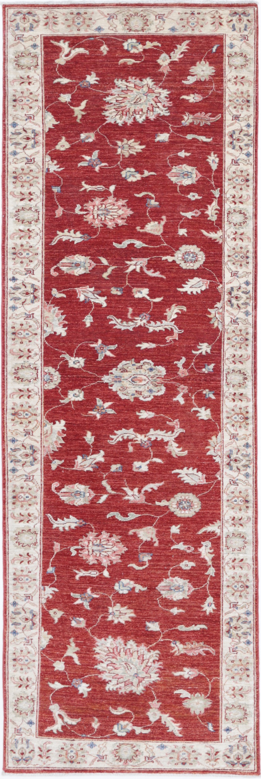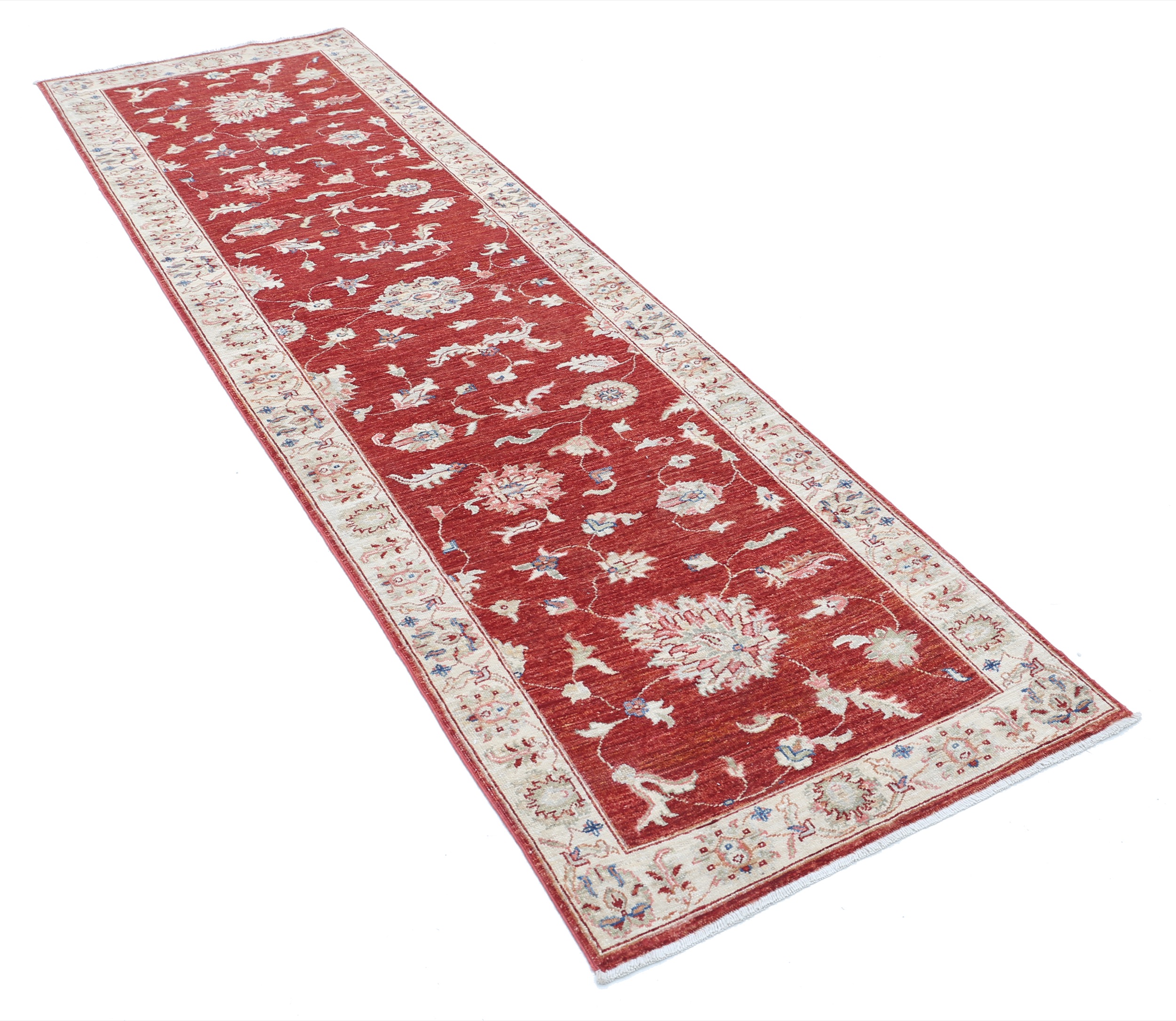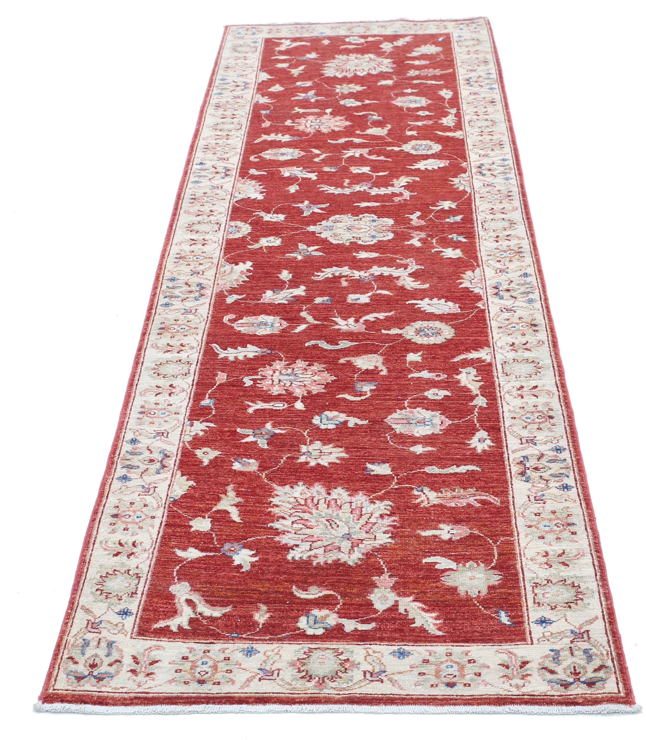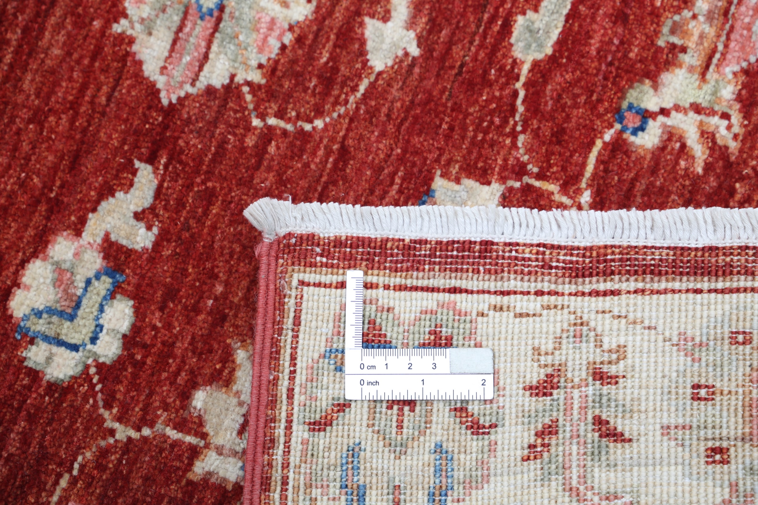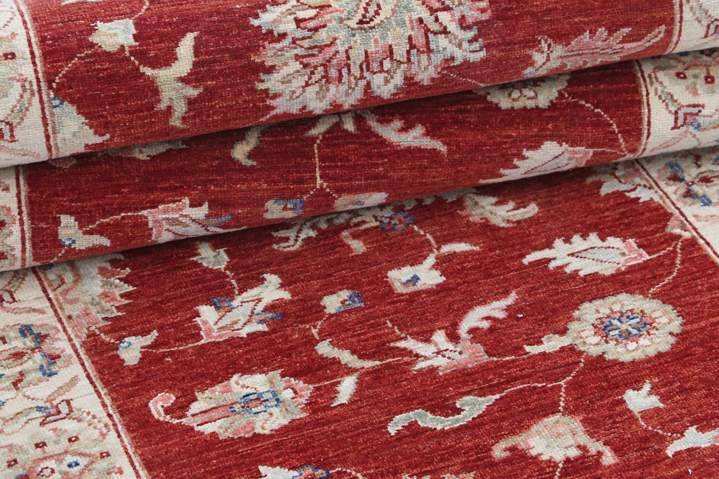 Authentic hand-knotted Oushak rug (Afghan/Pakistan origin) in vibrant red, beige, and peach tones with blue and green accents. This 2’8″ x 9′ rug features a beautiful floral design and boasts approximately 156 knots per square inch. Made from 100% wool with a low-medium pile (1/4″-1/3″). New condition.