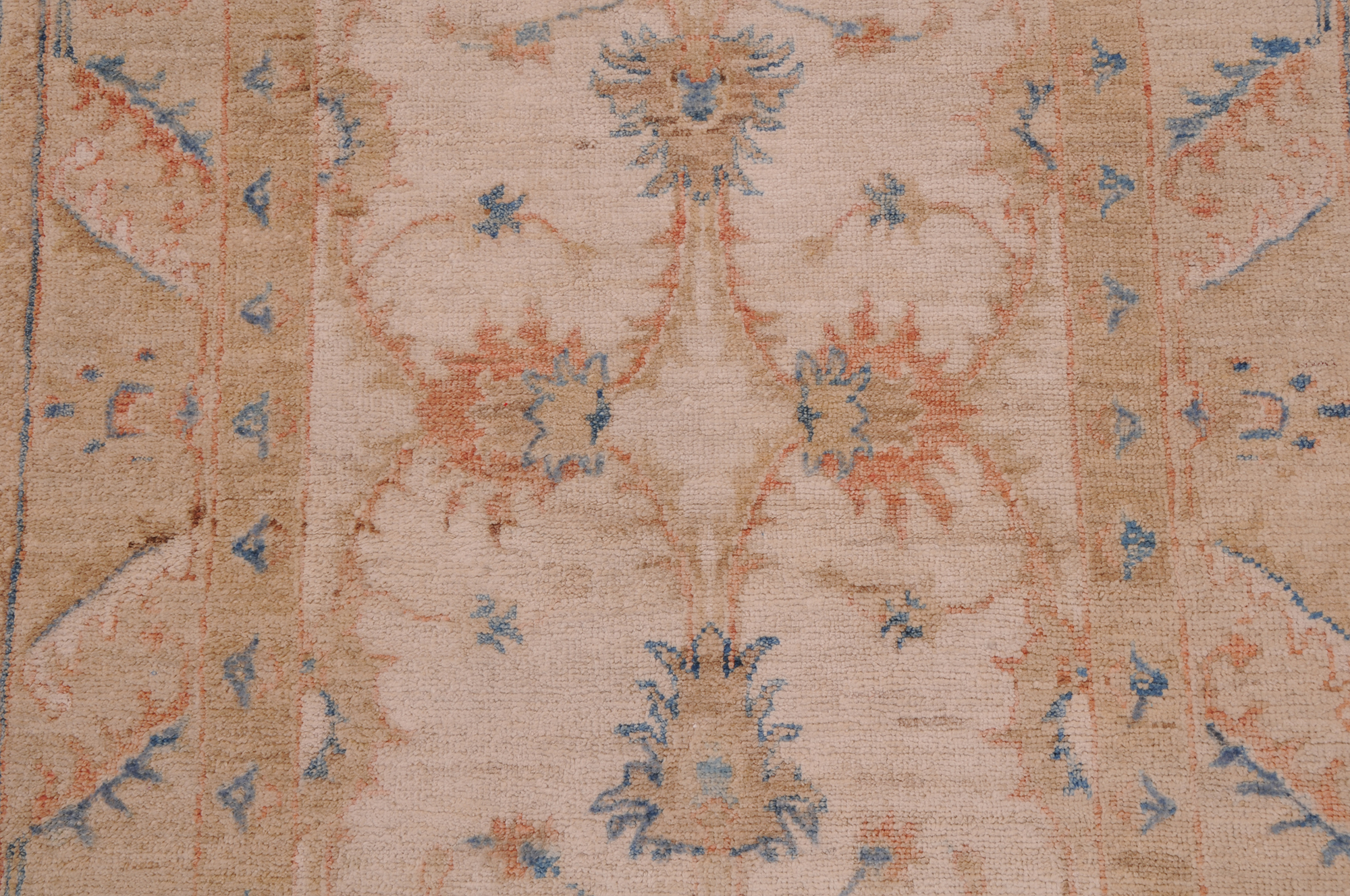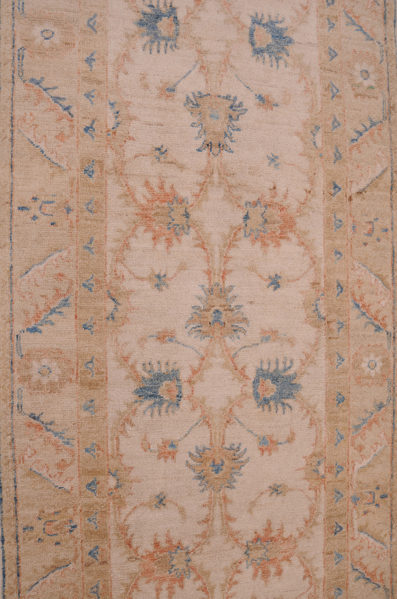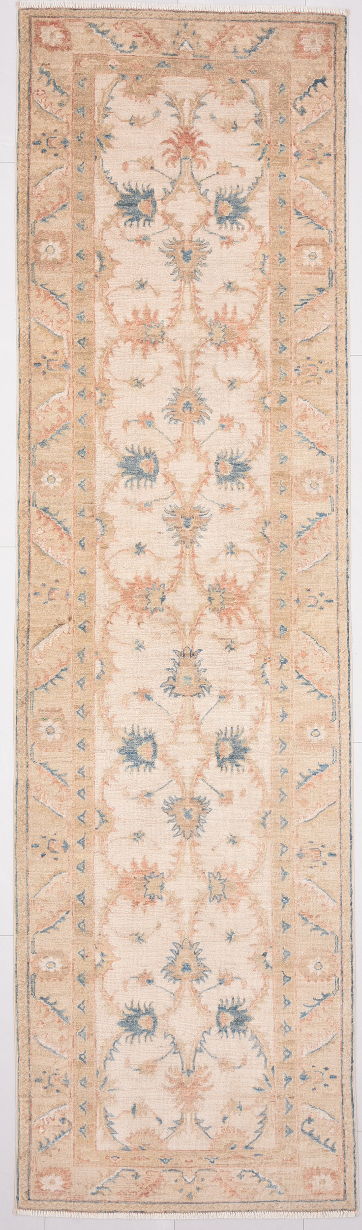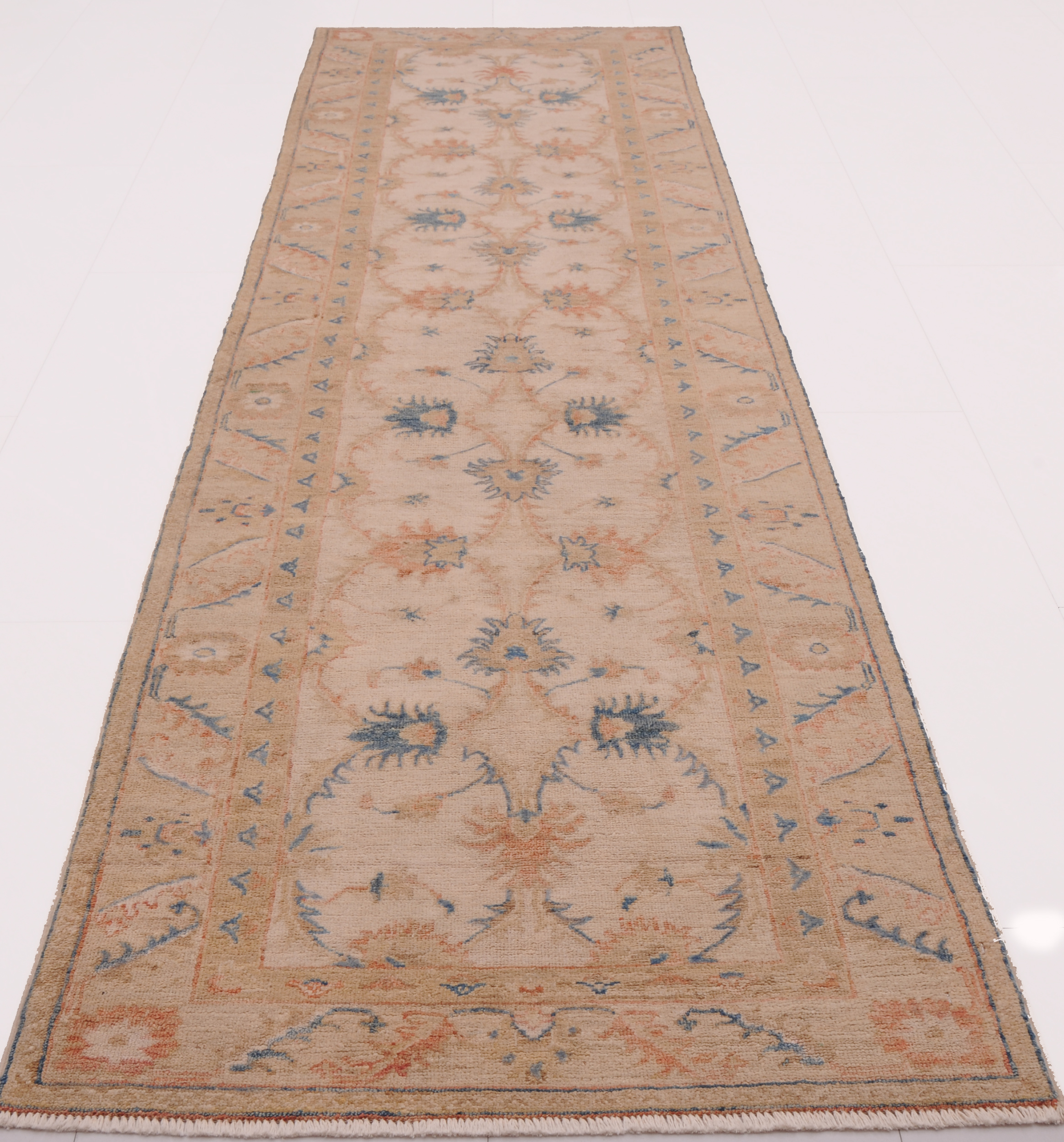 This exquisite 2’8″ x 9’4″ Oushak rug from Afghan / Pakistan showcases a timeless floral pattern. Hand-knotted with 100% wool on a cotton foundation, it features a beige field and beige border. The floral design adds an elegant character to any space.