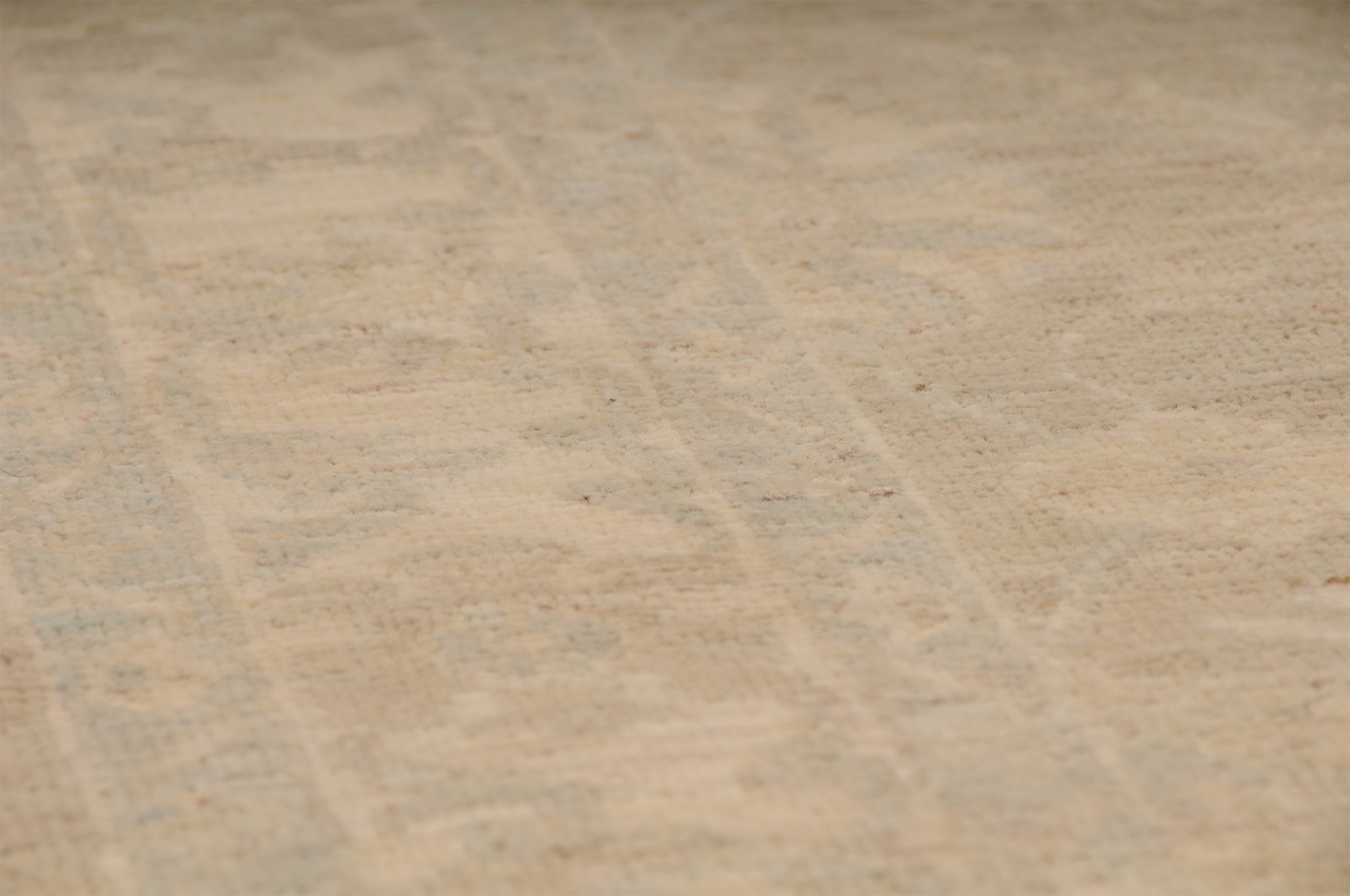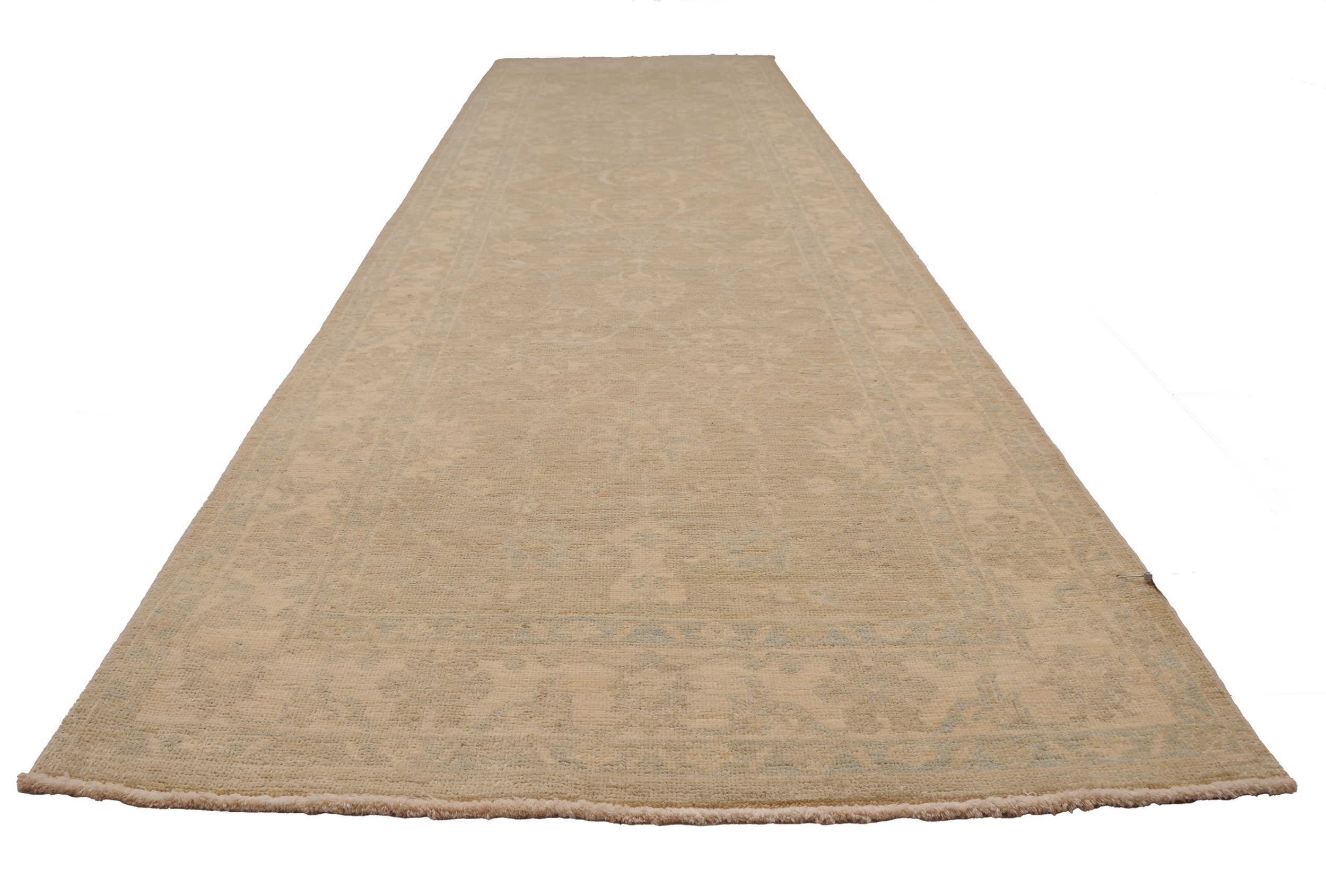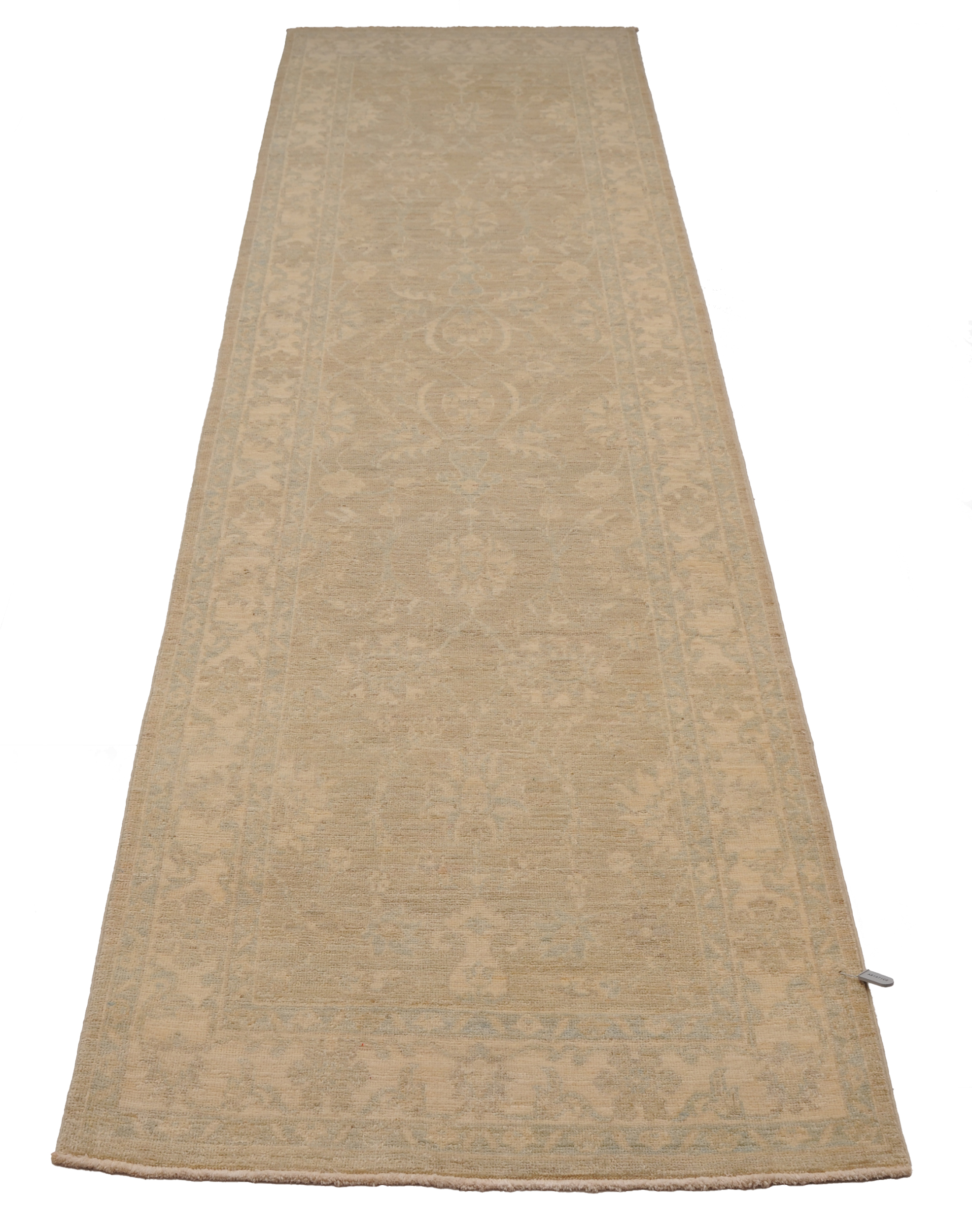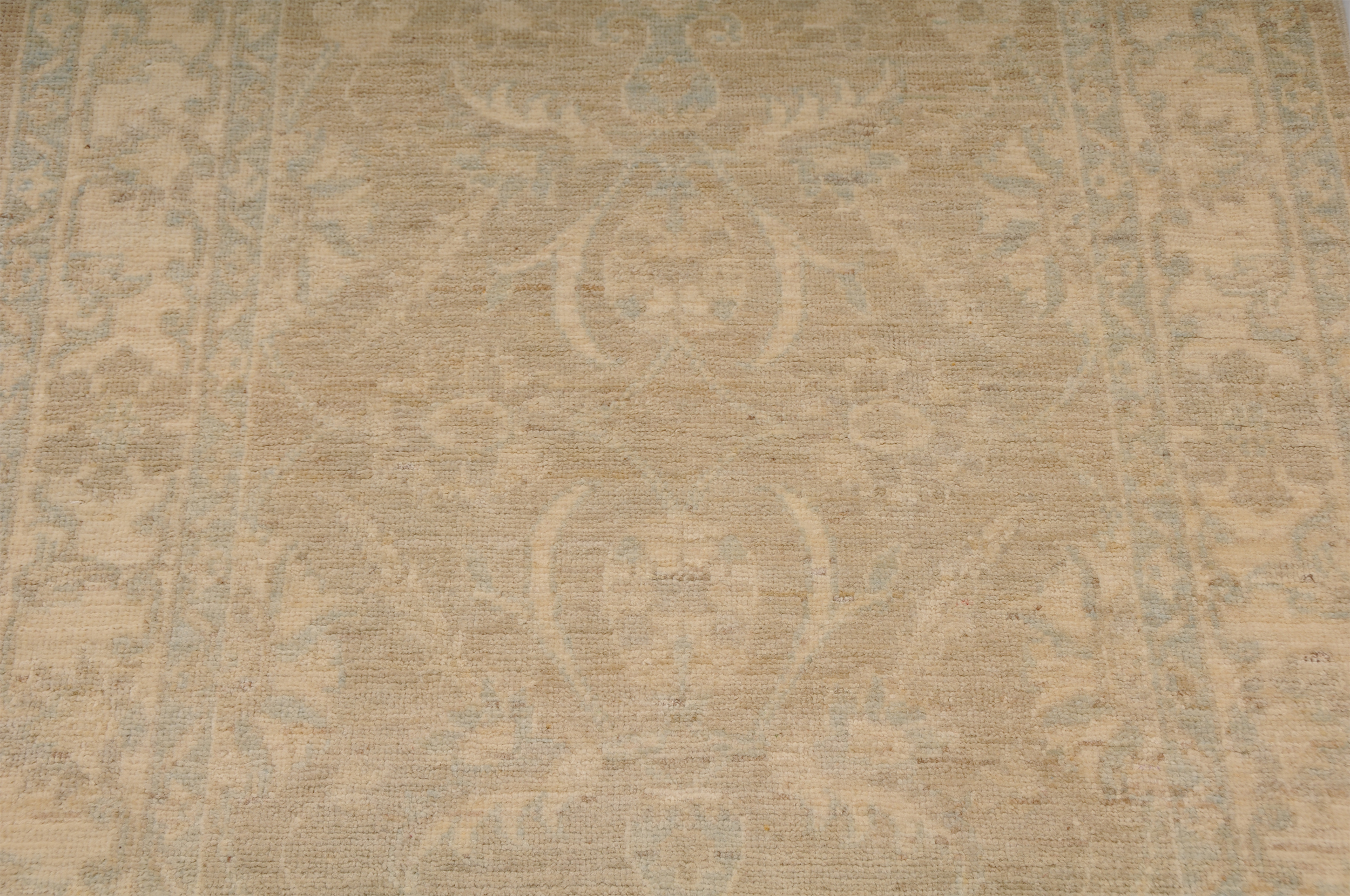 This 2’8″ x 8’9″ Oushak rug, hand-knotted in Afghan / Pakistan, features a allover design. It is woven with Approx. 156KPSI, showcasing a field in Grey and a Beige border. The rug has a Low Medium Pile and a 100% Wool pile, and is in excellent condition.