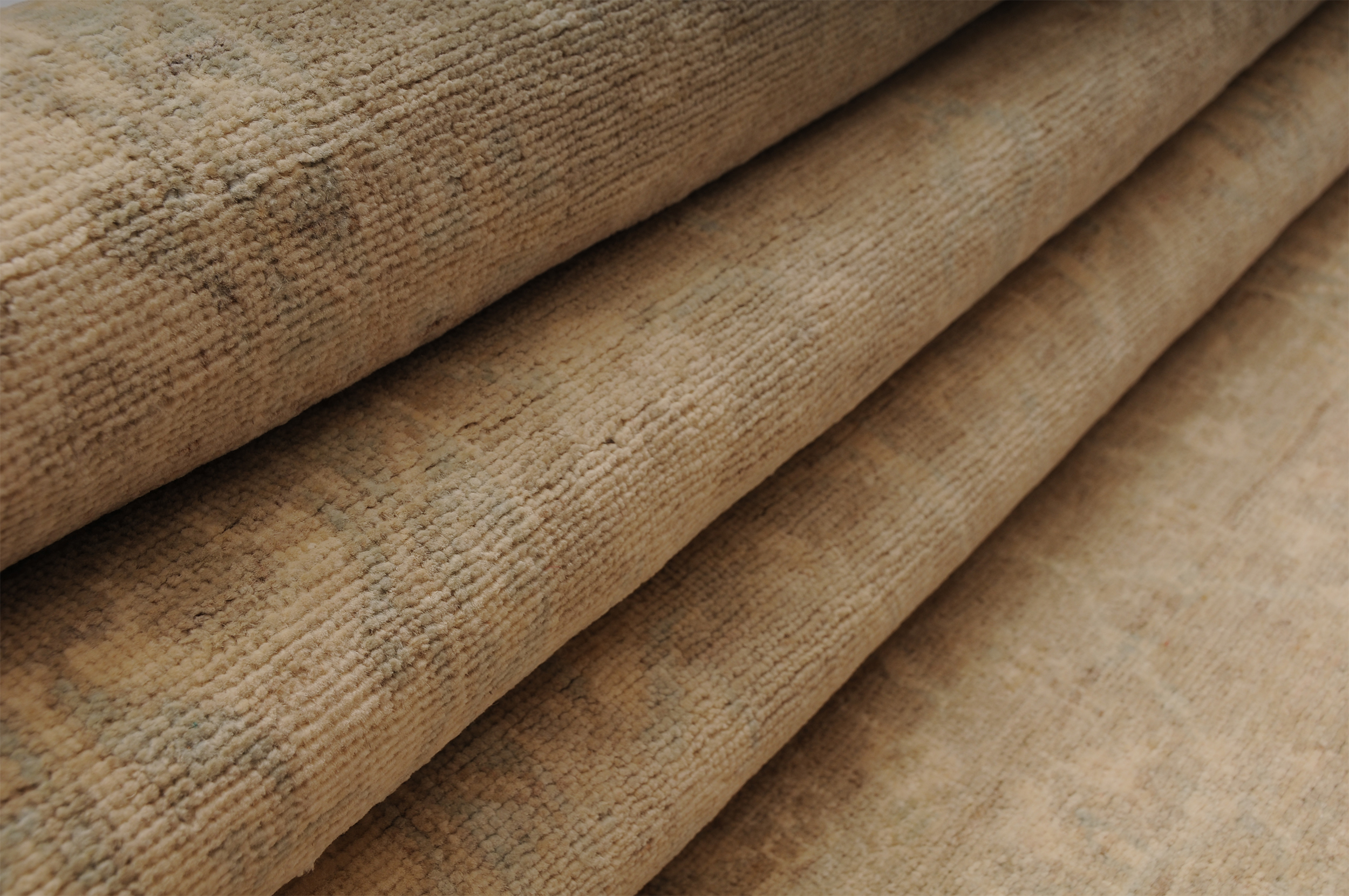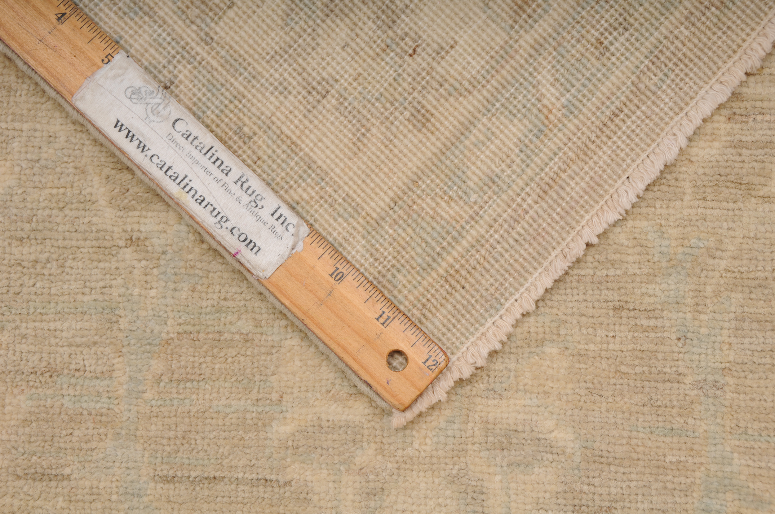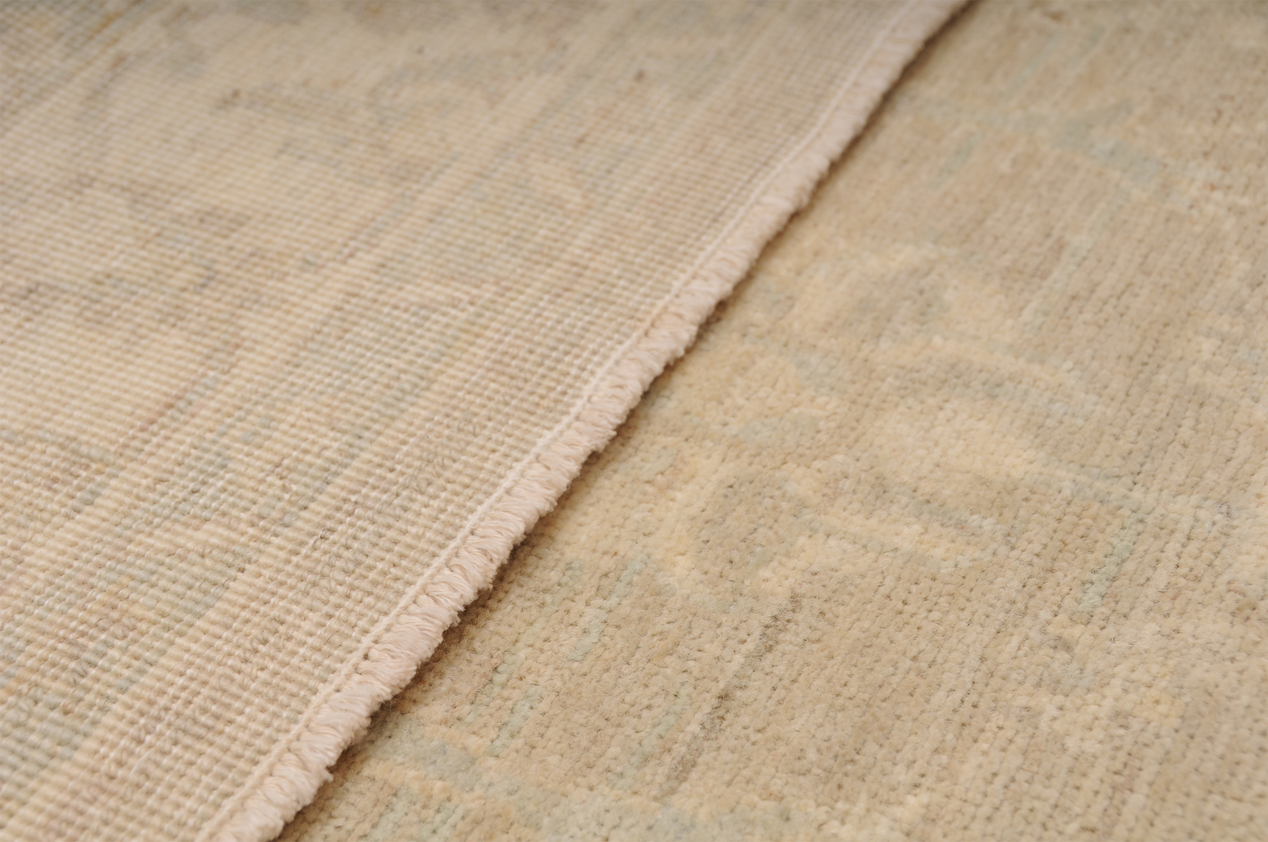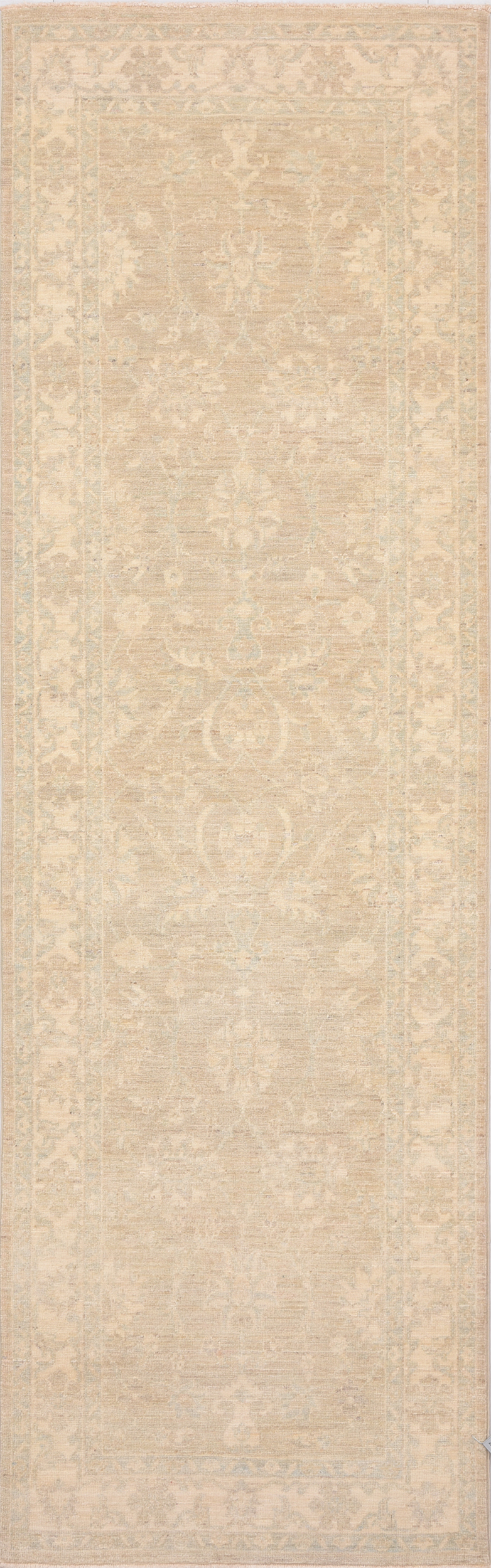 This 2’8″ x 8’9″ Oushak rug, hand-knotted in Afghan / Pakistan, features a allover design. It is woven with Approx. 156KPSI, showcasing a field in Grey and a Beige border. The rug has a Low Medium Pile and a 100% Wool pile, and is in excellent condition.